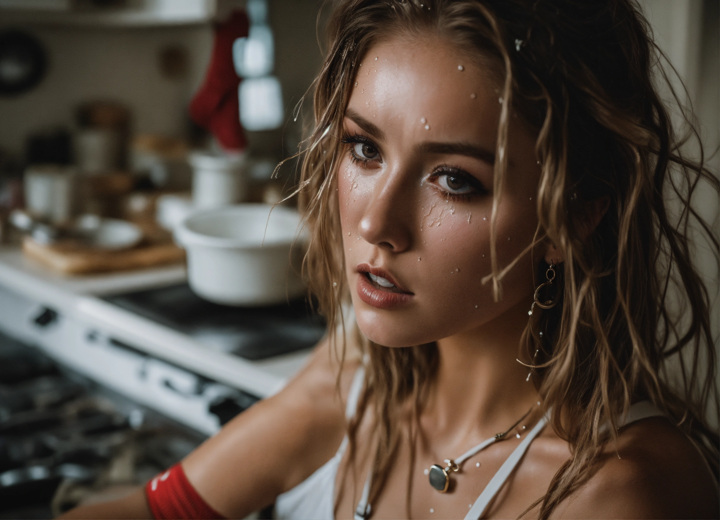 Top down camera angle, run down house, kitchen, full body, flying, lots of jewelry, white swimwear, shiny skin, wet messy long hair, bawling, very many straps, harnesses, crying, distressed, many gorgeous young women, handcuffed, red water everywhere, long socks, brown hair, white woman, pale skin, fitness influencer, highly detailed, dramatic shoot, sharp focus, 4k uhd, cinematic lighting, cut, scratched, messy makeup, white board, long white gloves