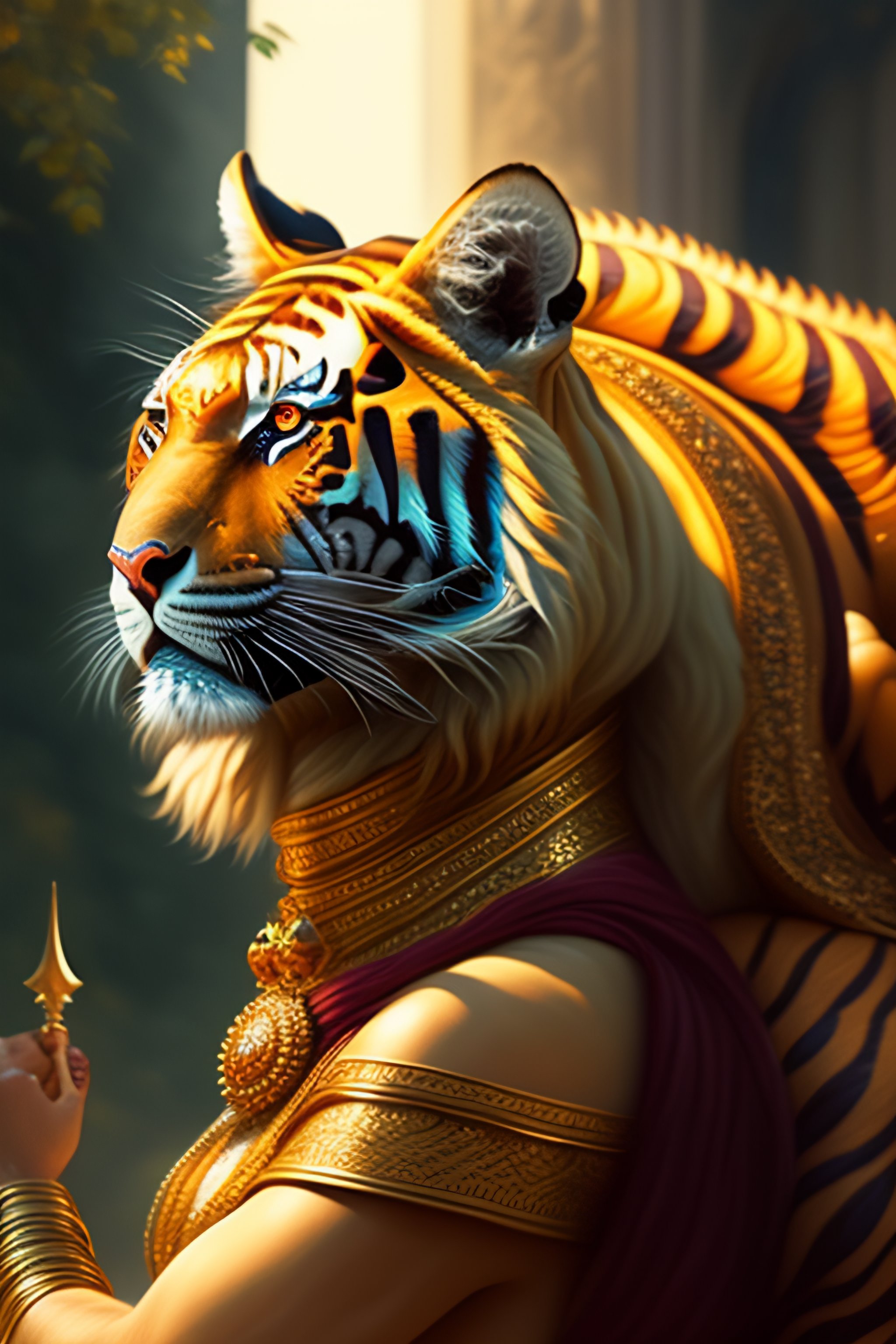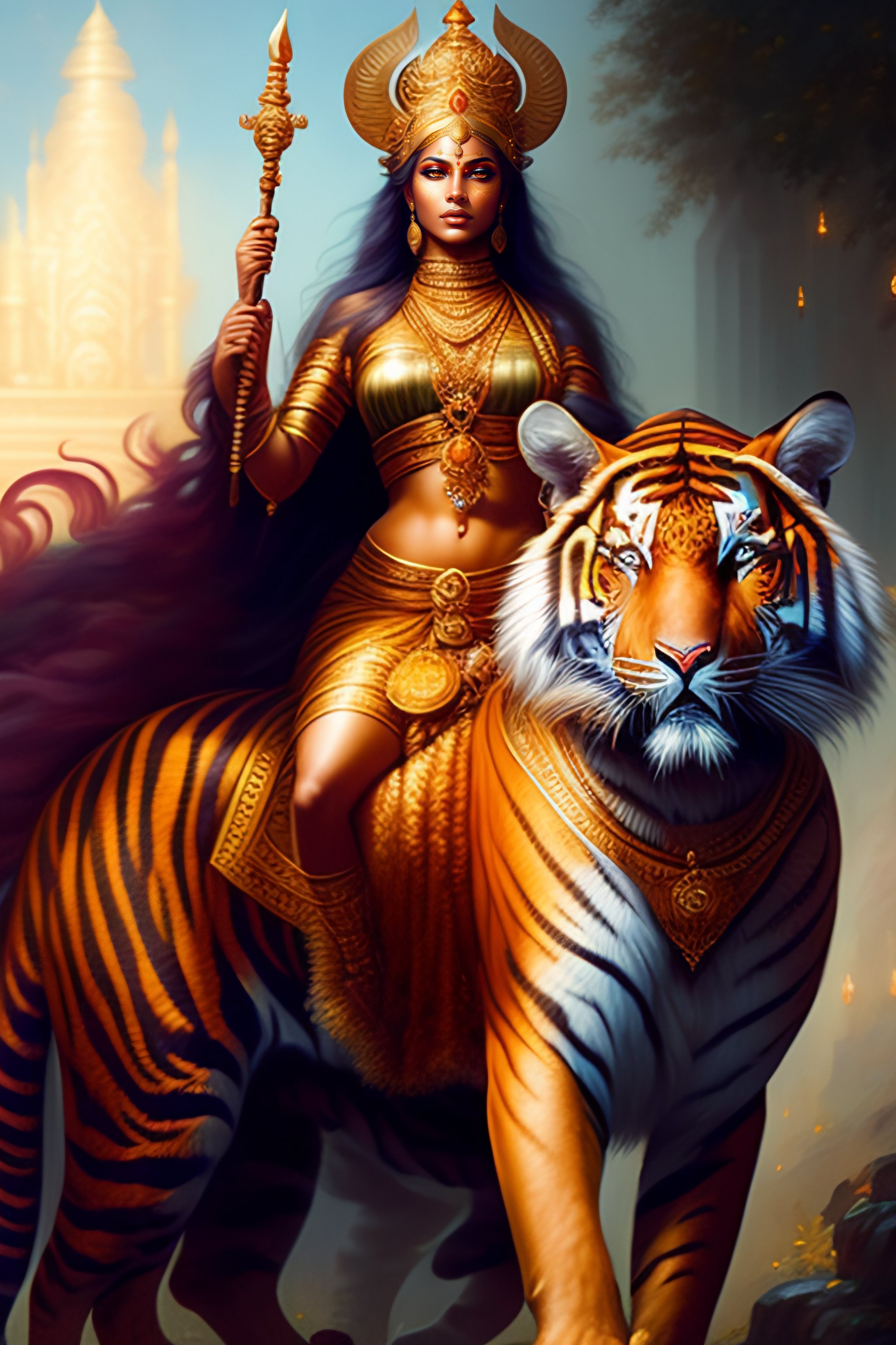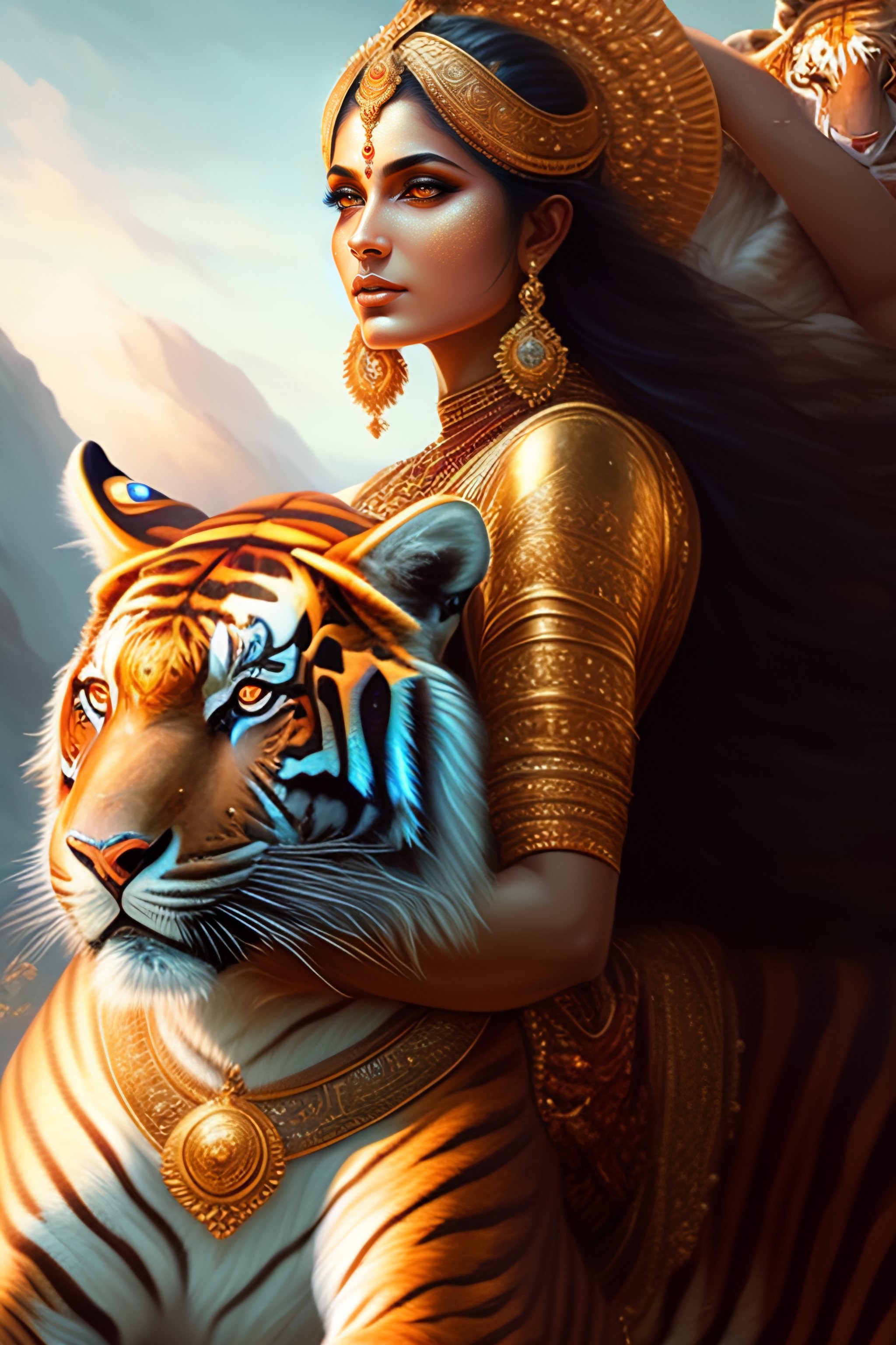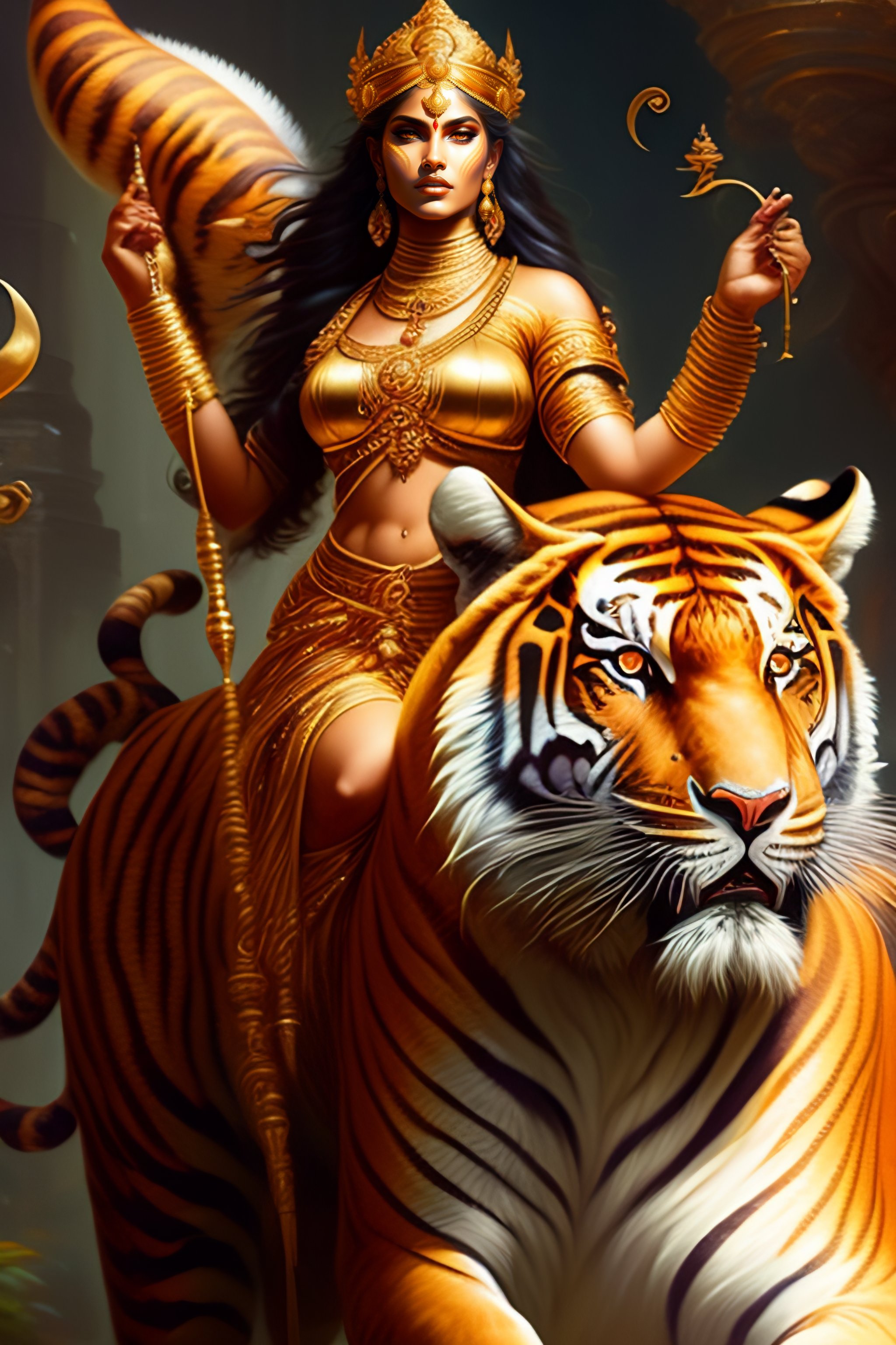 Image of goddess durga riding tiger, d & d, beautiful, renaissance, fantasy, intricate, elegant, hindu, highly detailed, digital painting, artstation, concept art, smooth, sharp focus, illustration, art by artgerm and greg rutkowski and alphonse mucha