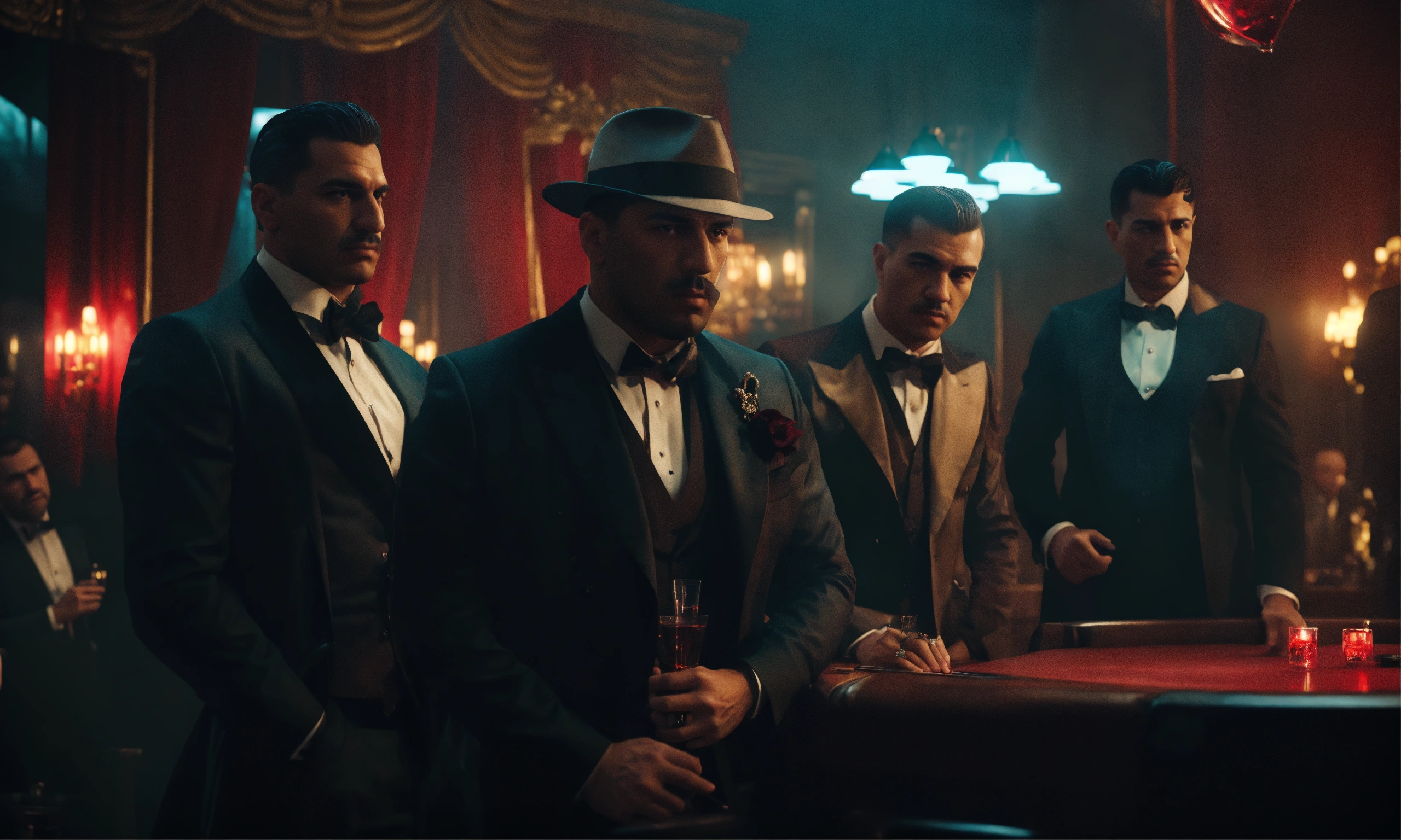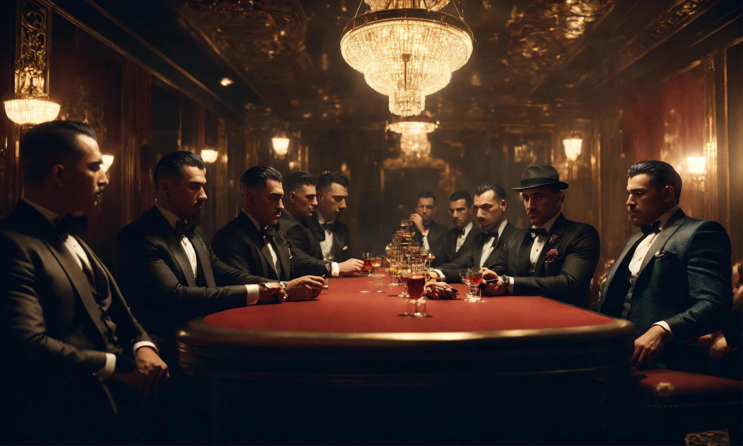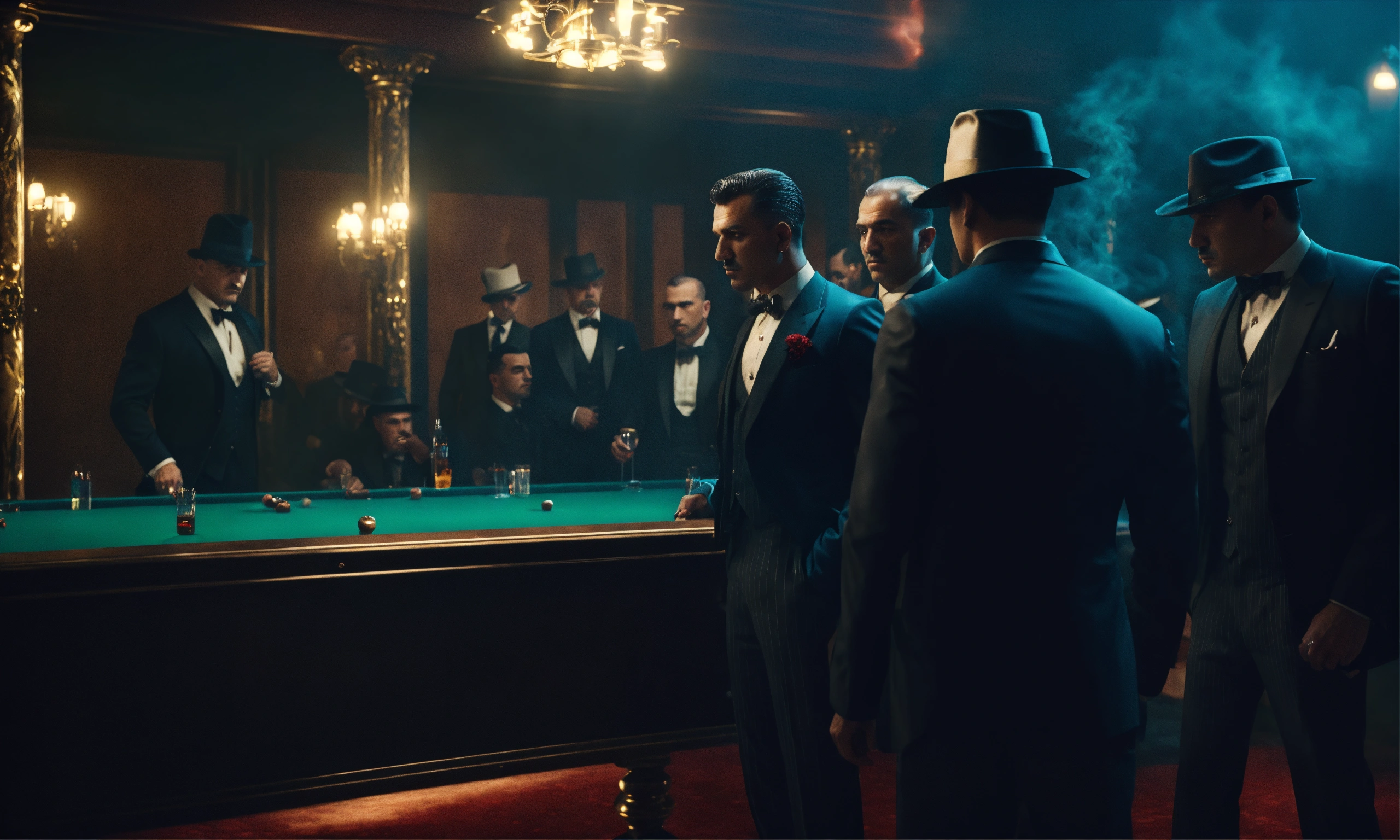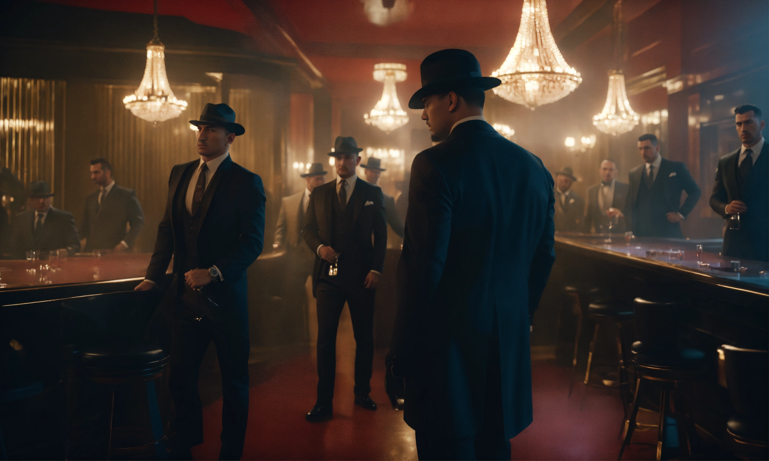 Group of mafia gangster members in gentlemen club, smoky mood lighting, wide front shot, night time, 8k, luxcorerender, earthly colour, cinematic photography, real humans, real images, matte finish, shot on arri anamorphic, extreme wide shot, smooth, sharp focus, ornate, highly dynamic, particulate, hyperreal, wide shot.