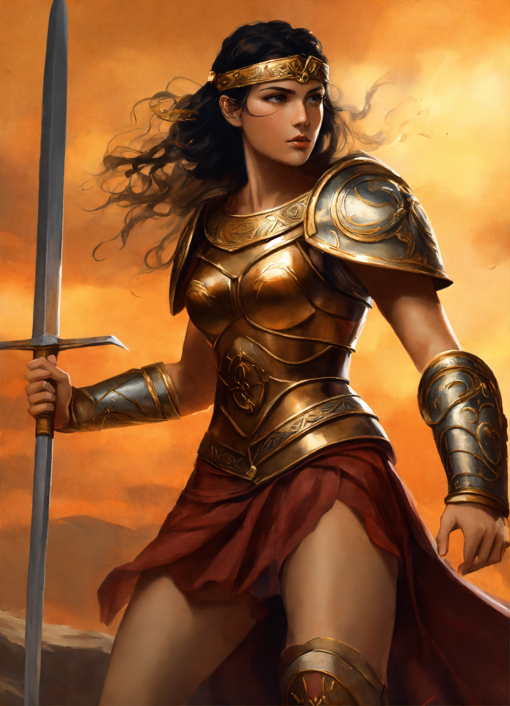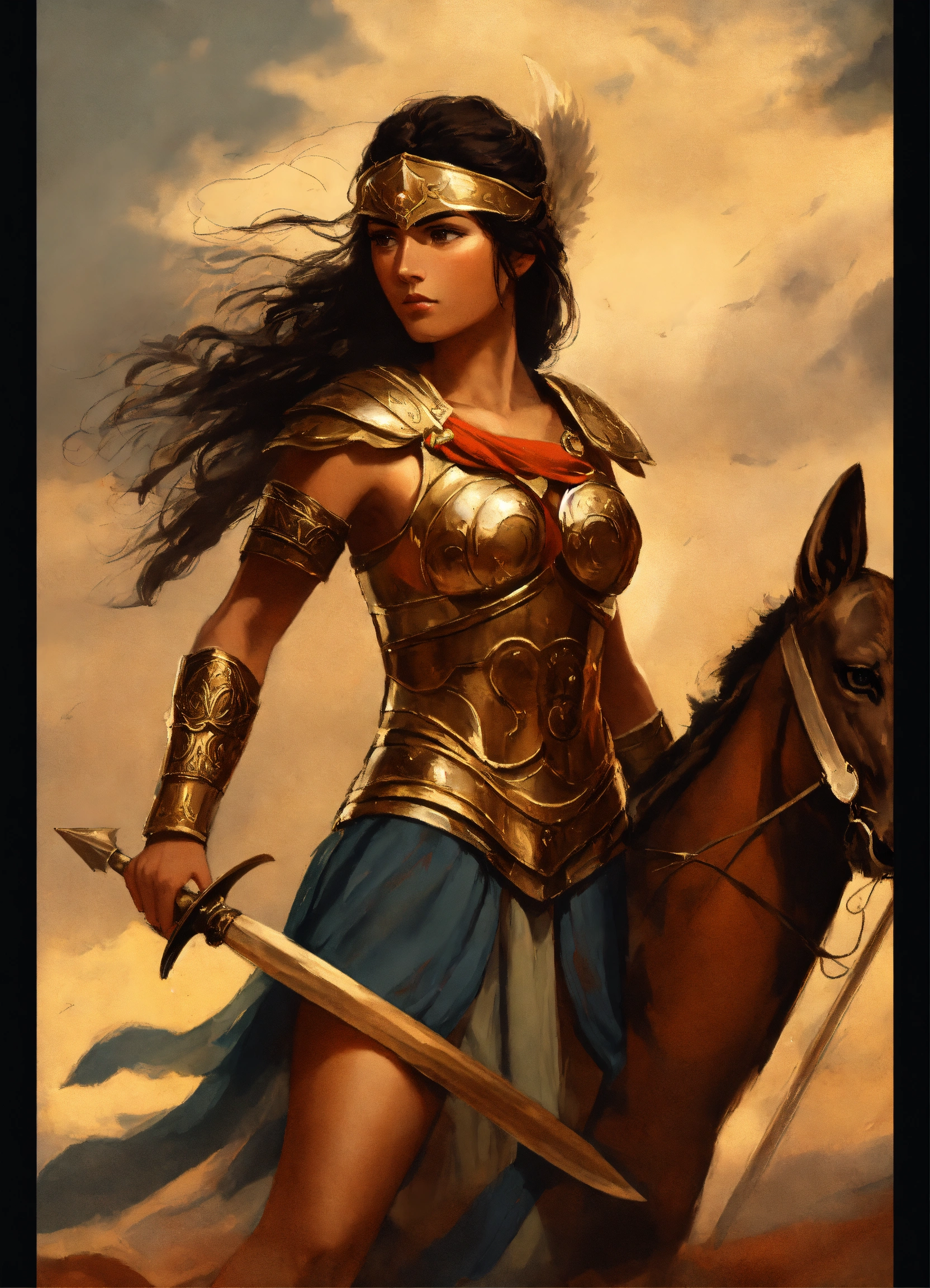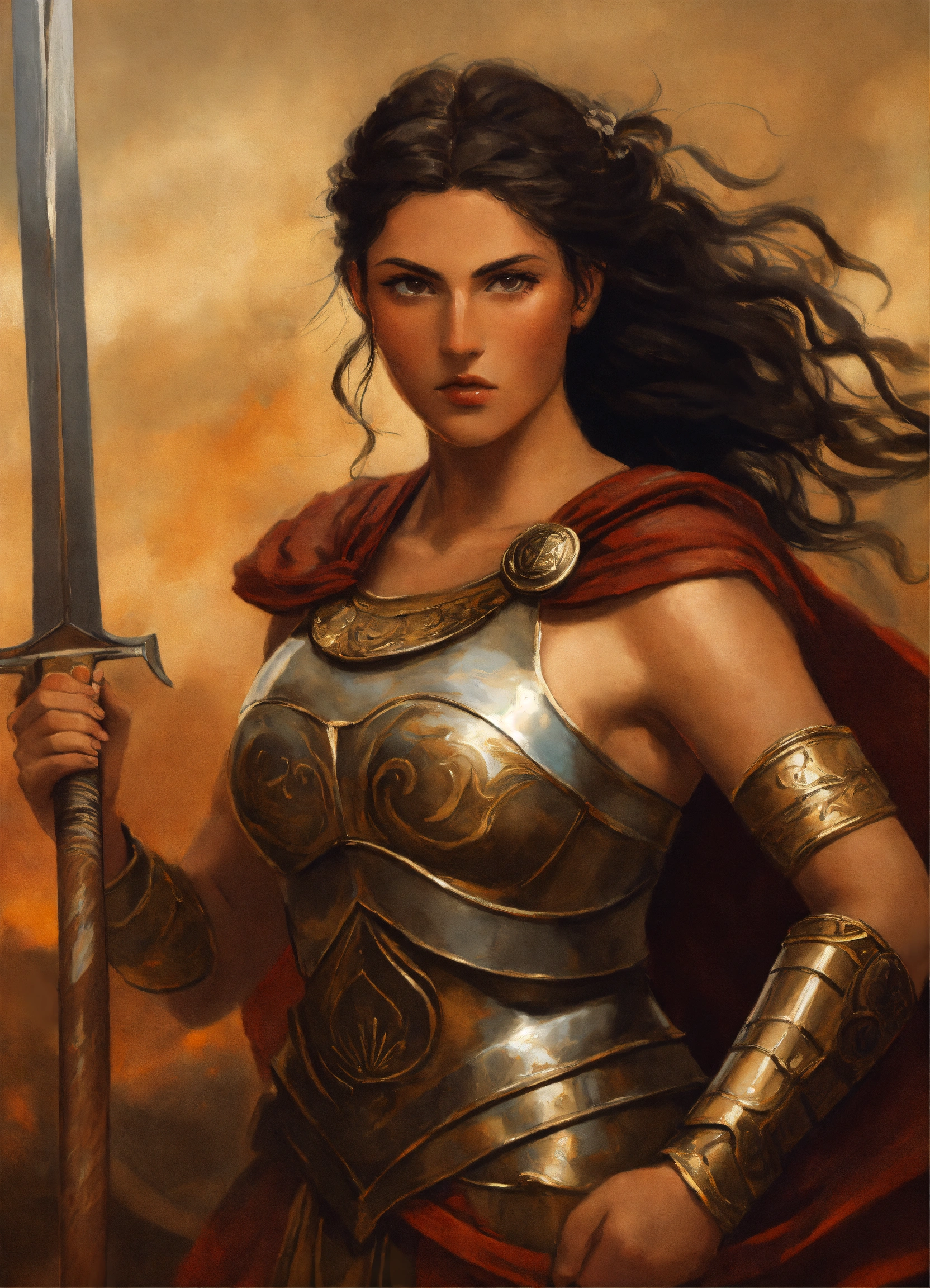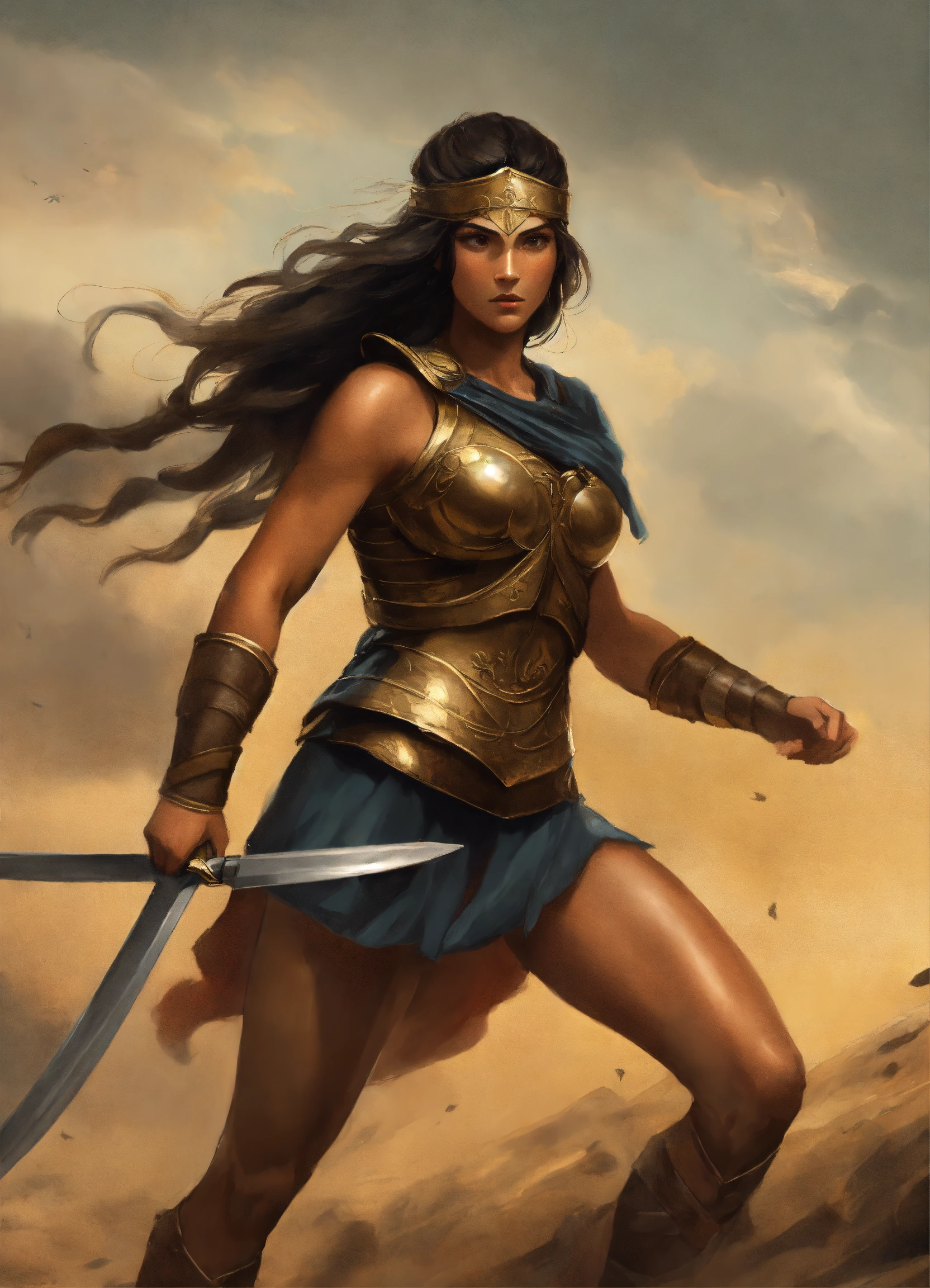 Ancient greek warrior woman in battle with tan skin and dark hair, with her head facing the left, depicted in the style of a classical mythology painting