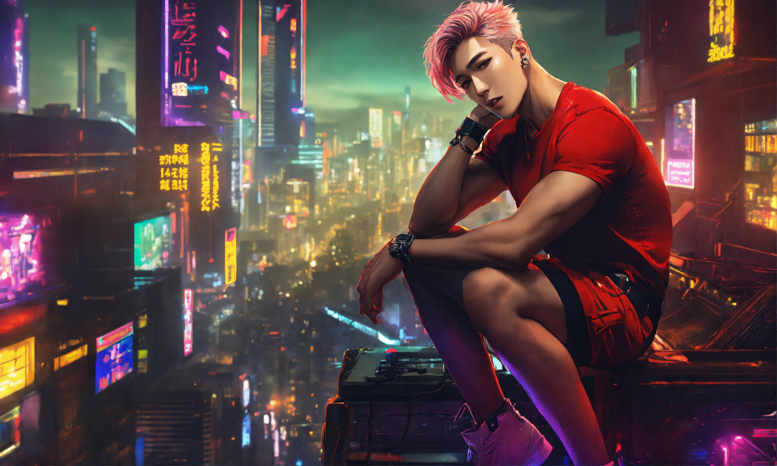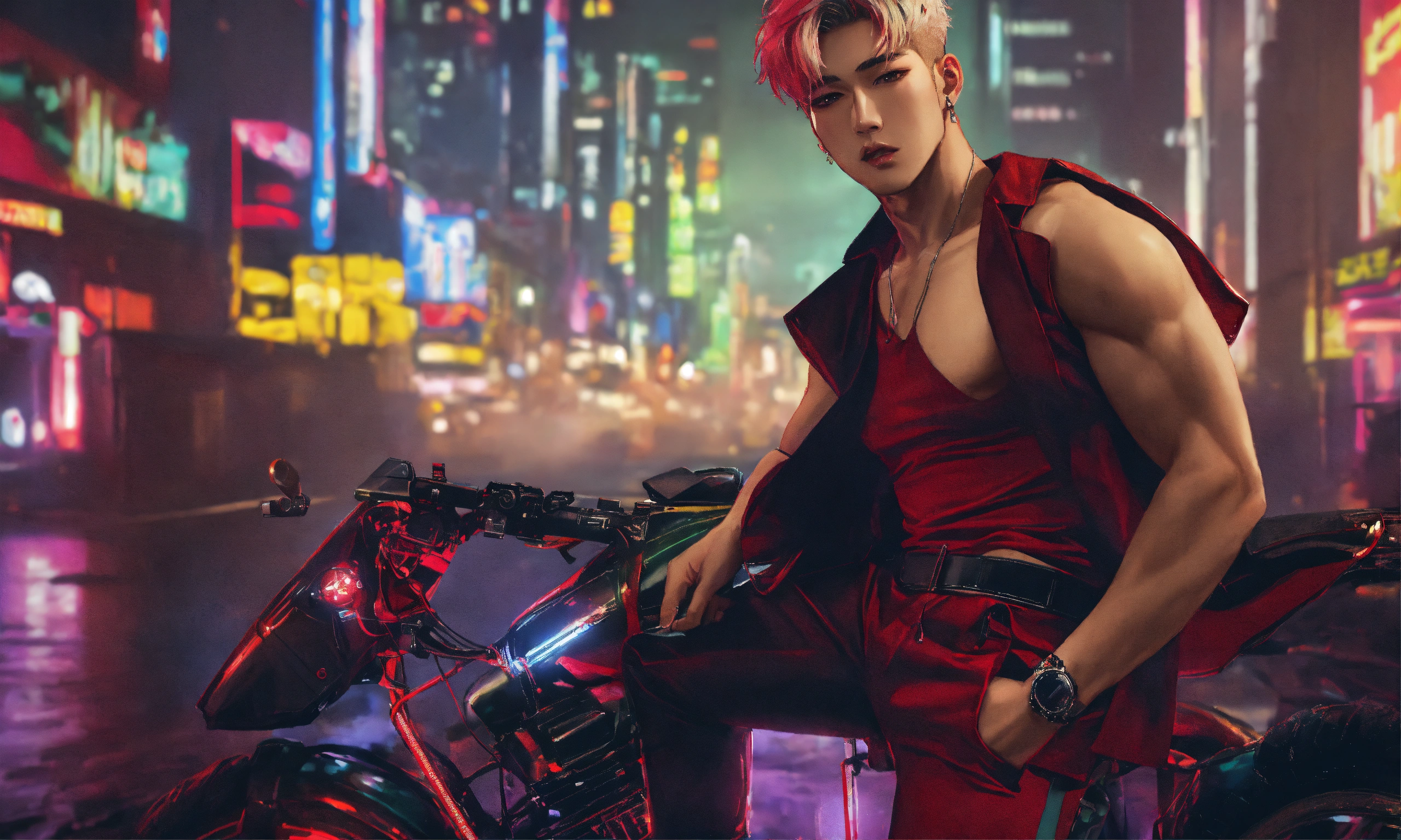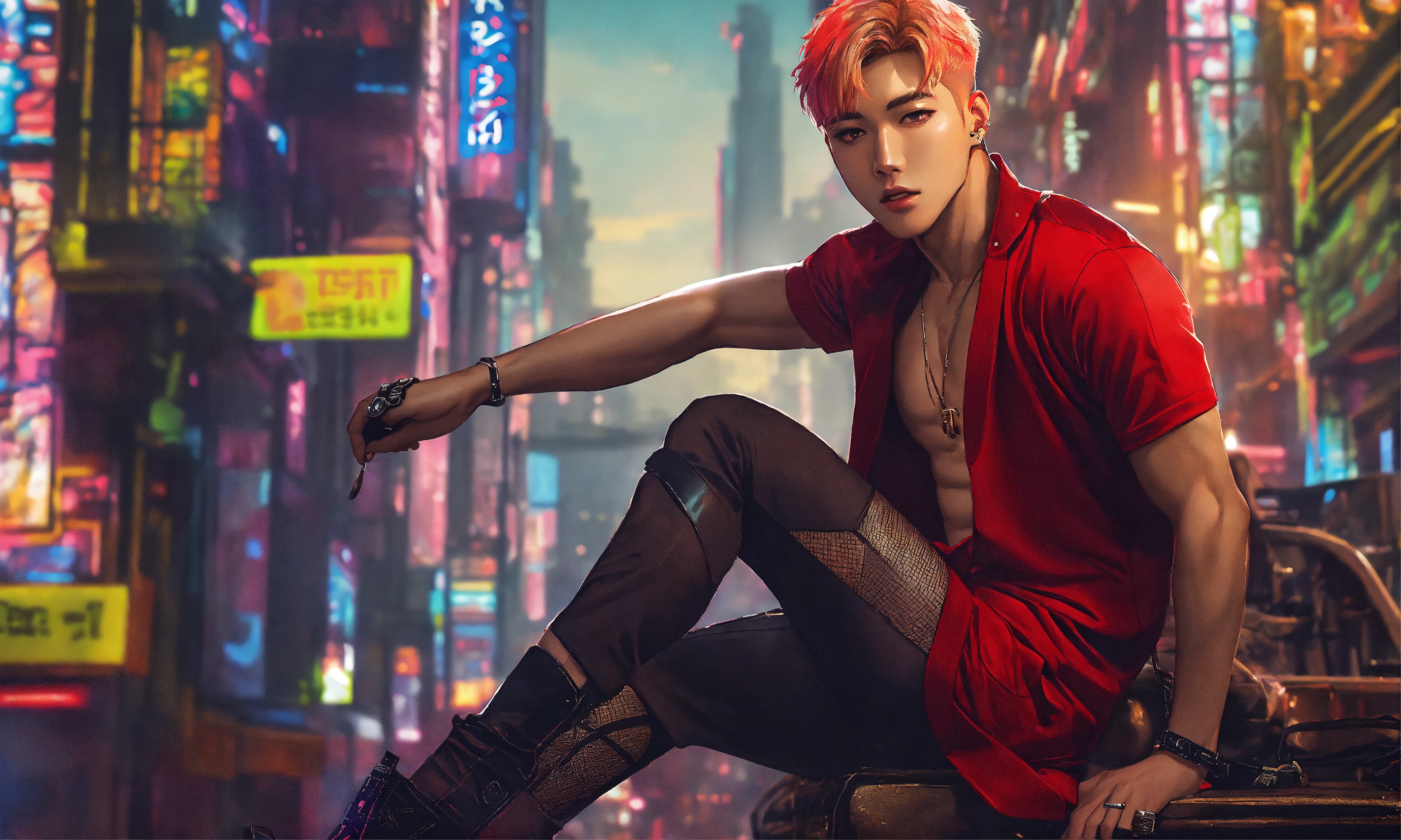 Pin-up poster of fit south korean male idol wonho wearing a blank red t-shirt in a cyberpunk cityscape, dark fantasy steamy atmosphere, dramatic lighting, colorful neon