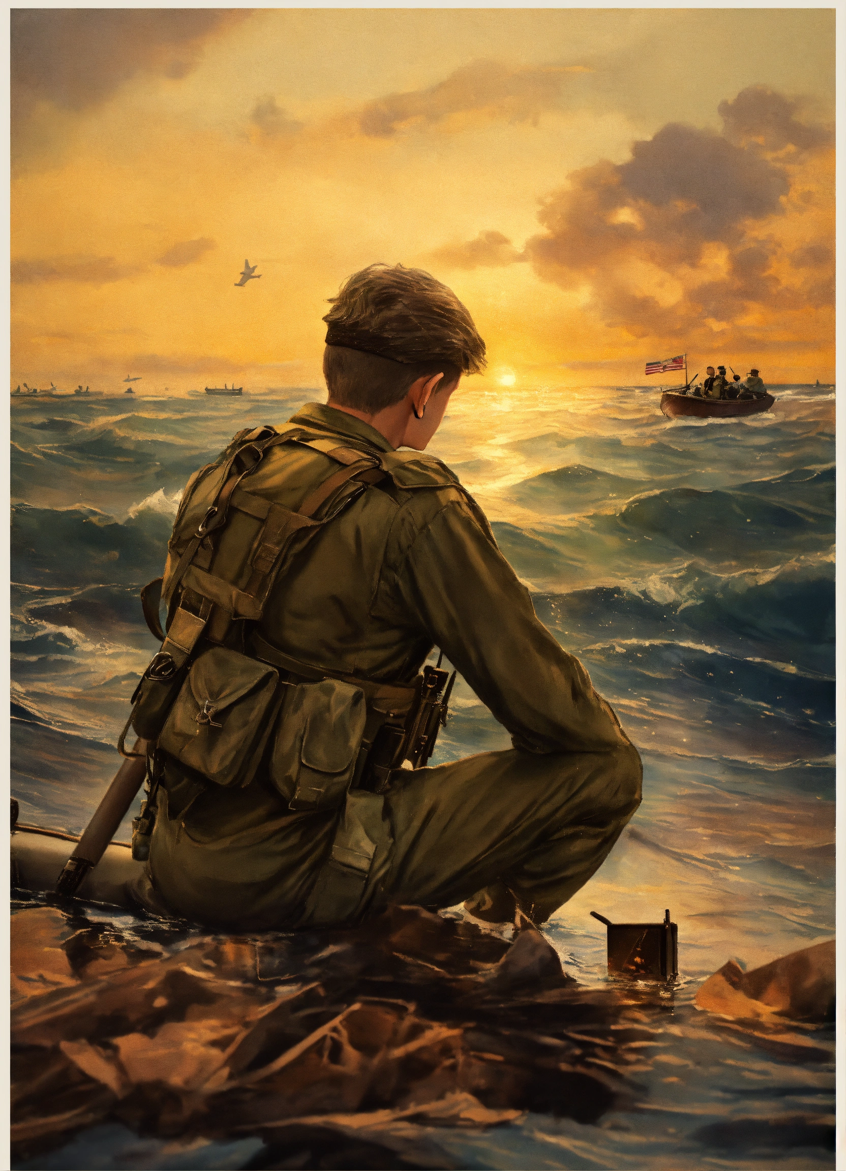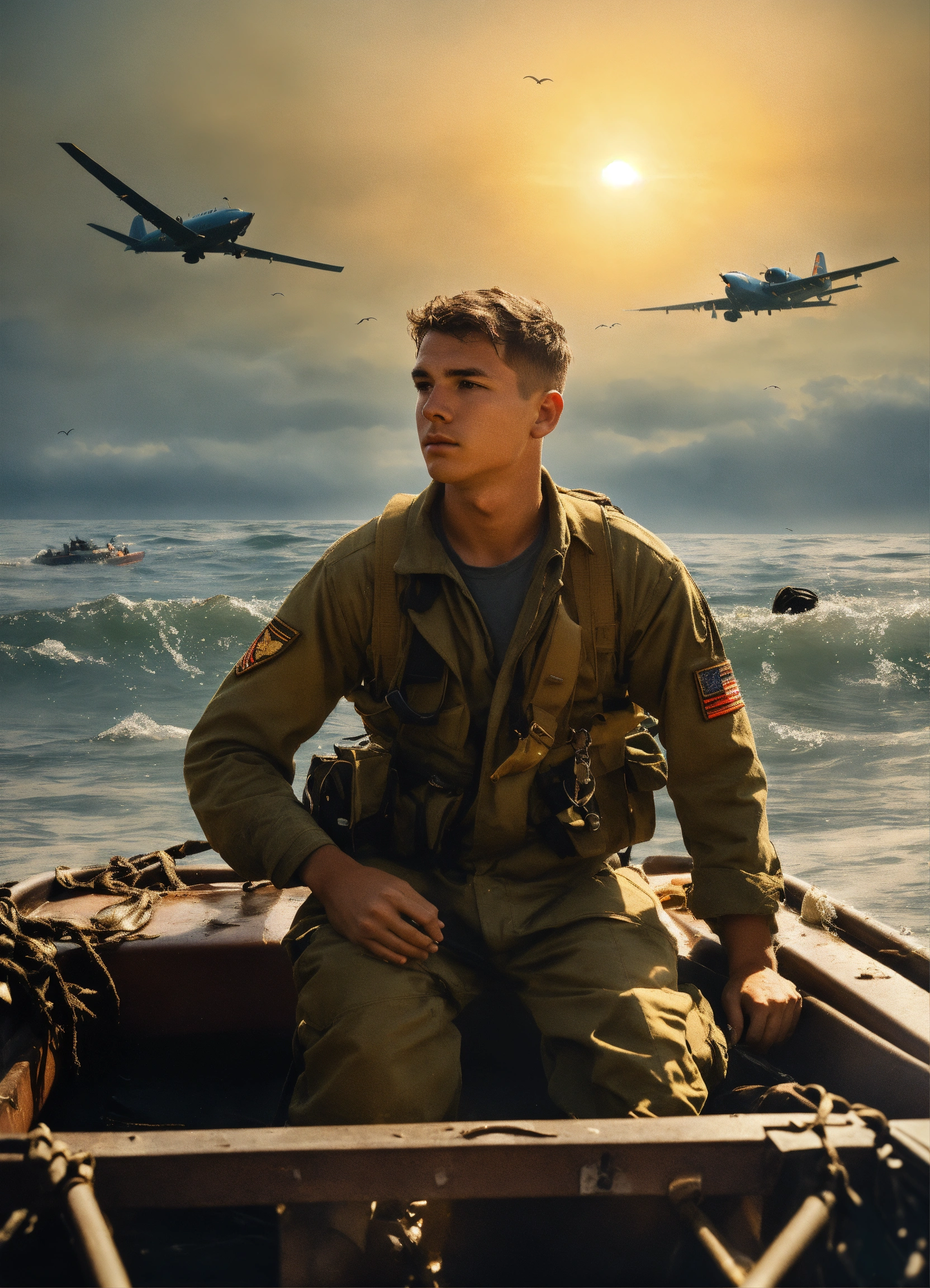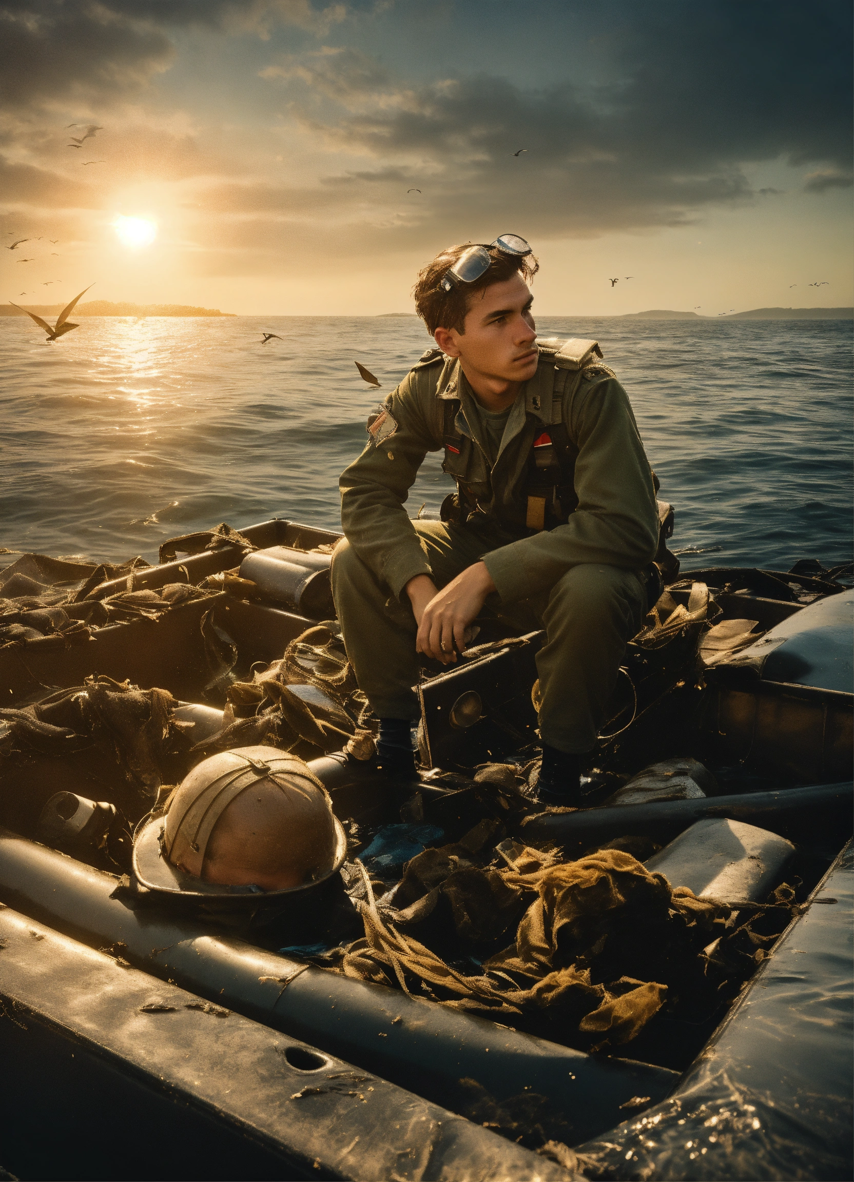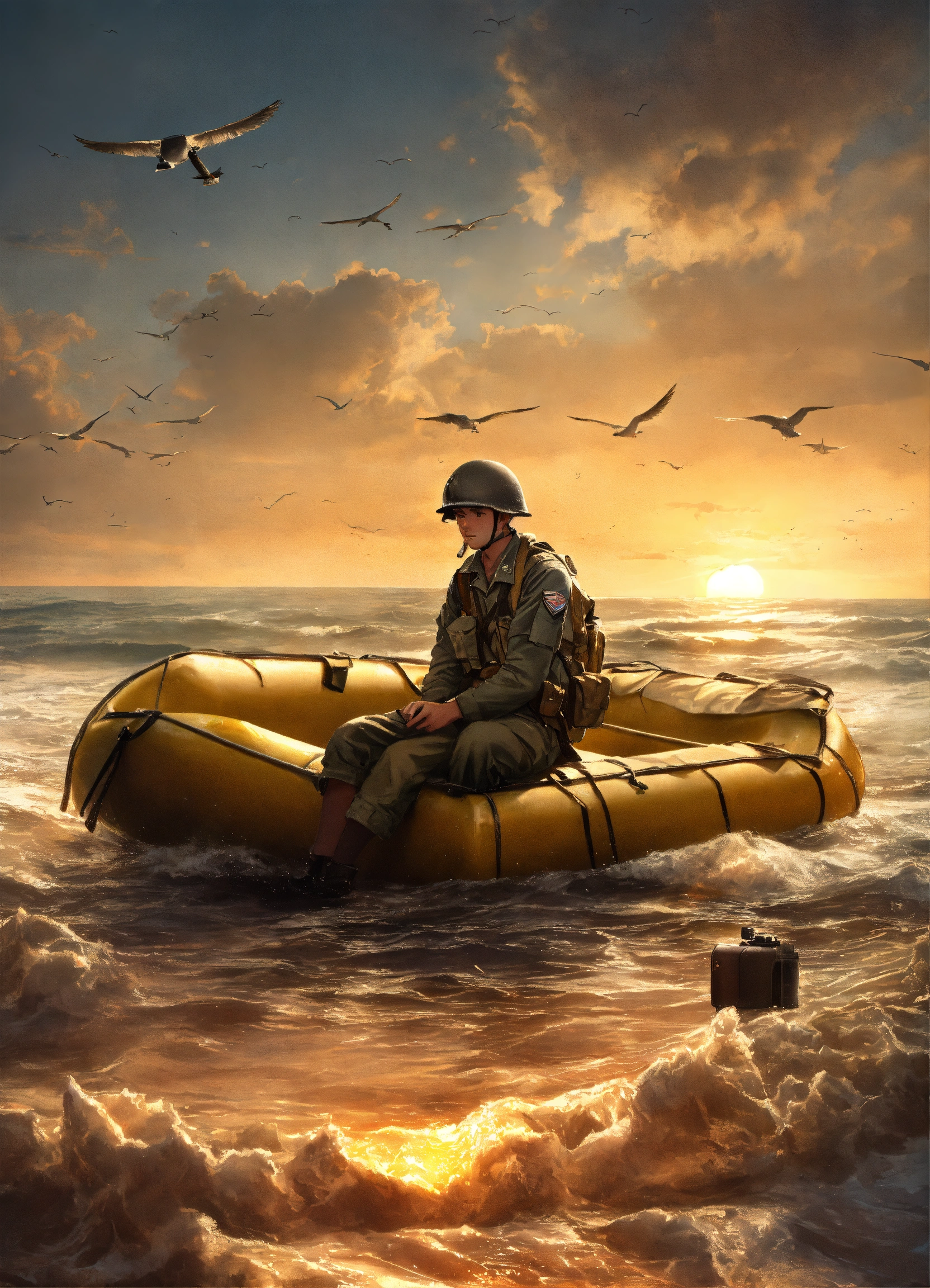 "young wwii usa soldier, lost at sea, sitting distressed in a small raft. he appears thin and sunburned, surrounded by the vastness of the open ocean. floating debris can be seen, hinting at a recent plane crash. overhead, the sun is beating down intensely casting reflections on the water, and a few distant seabirds circle above him, type of image photograph, art styles realism, camera ee 70mm, shot long shot, render related information 4k, highly detailed, uhd, sun light, nostalgic lighting, cinematic, sharp focus, front view"