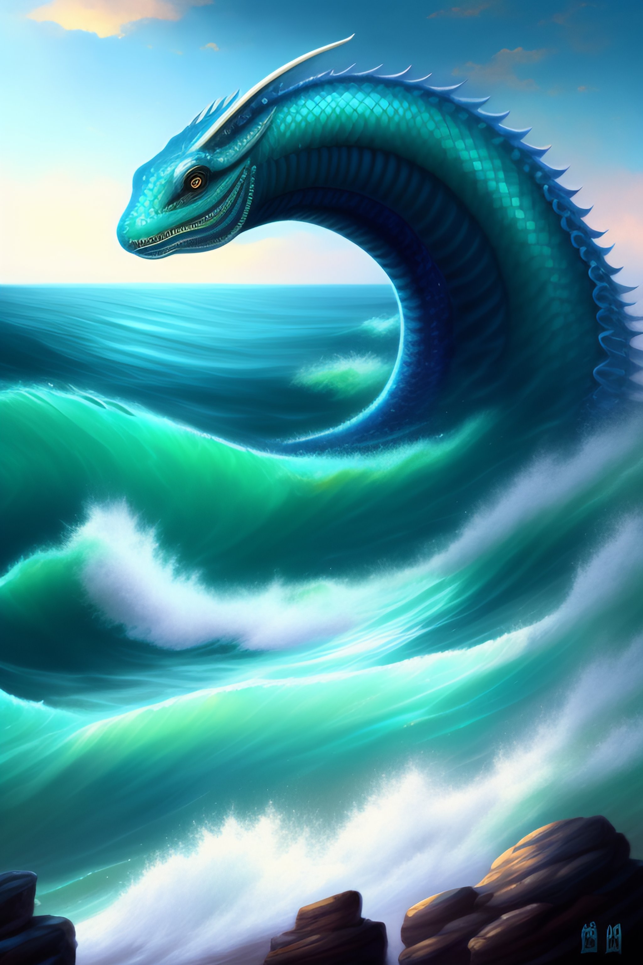A huge sea serpent with adorable eyes in the art style of magic the gathering with an ocean background