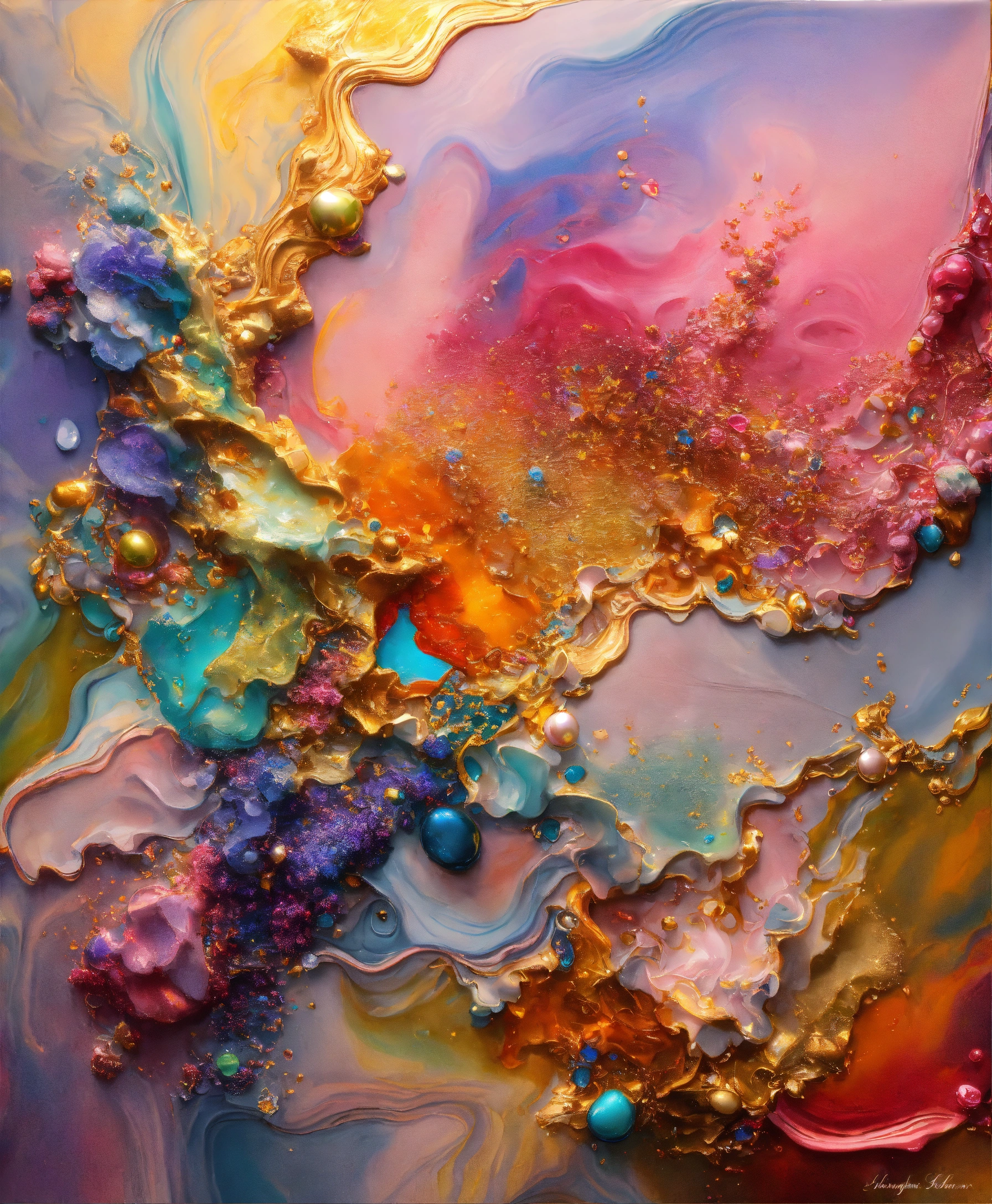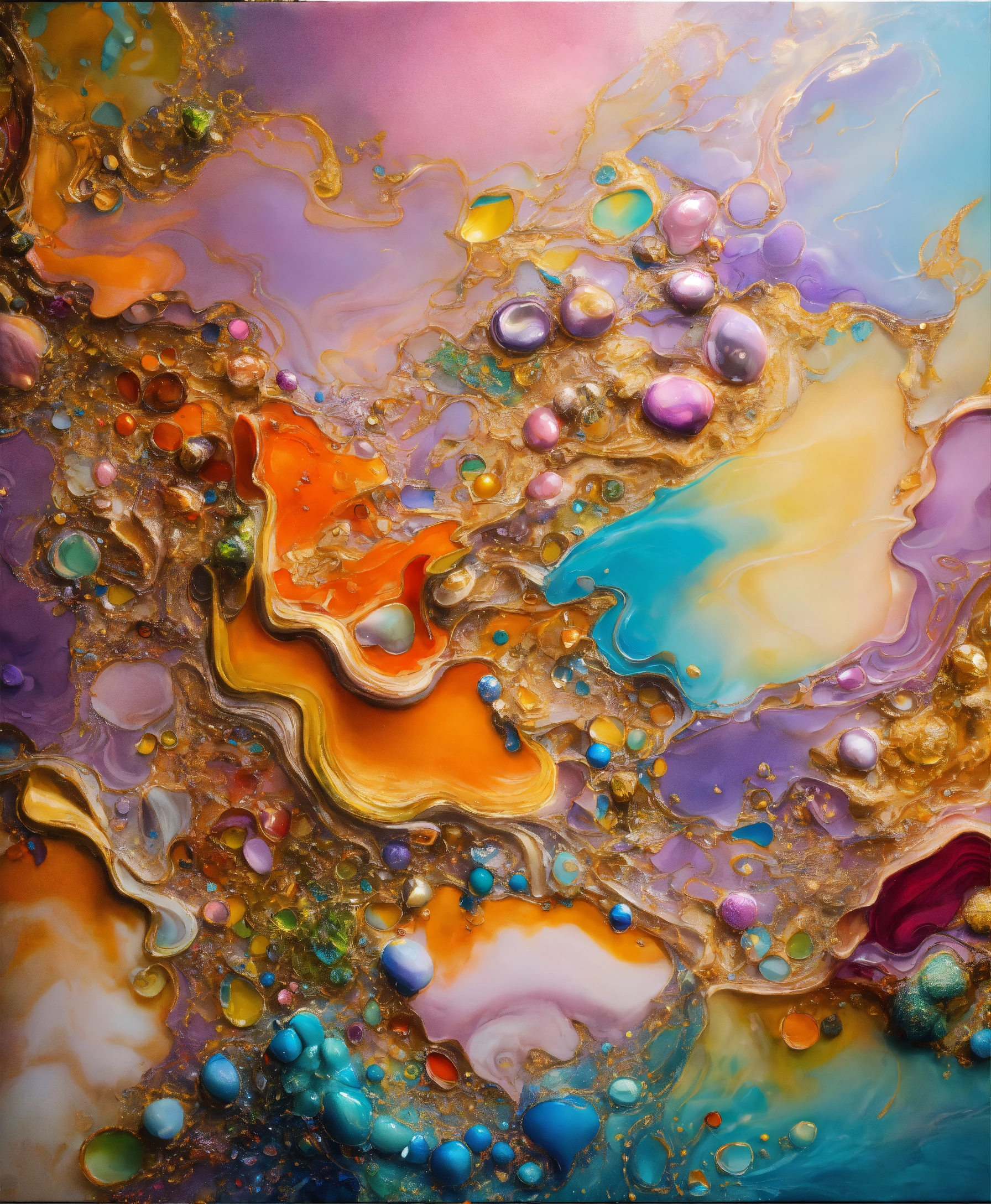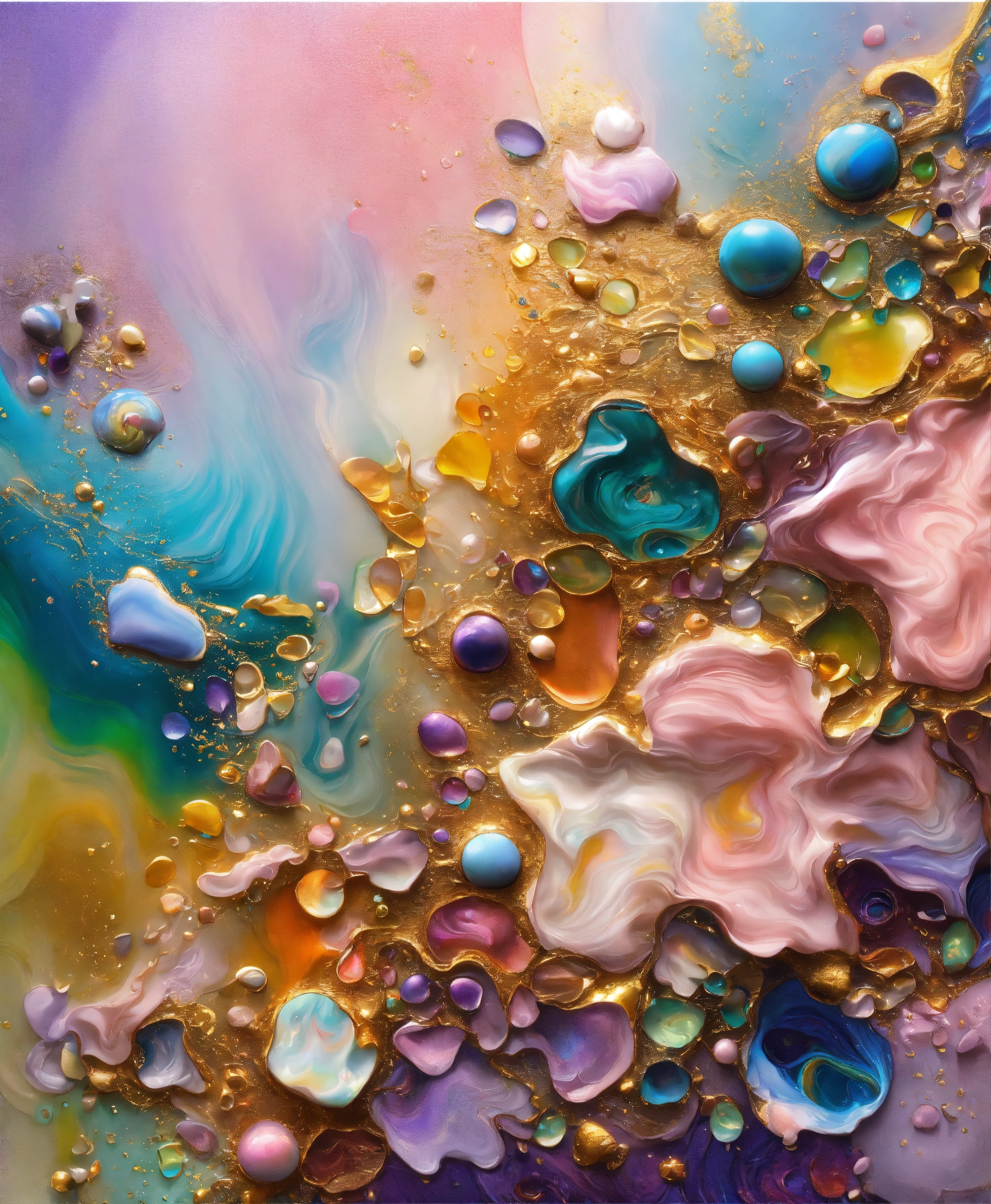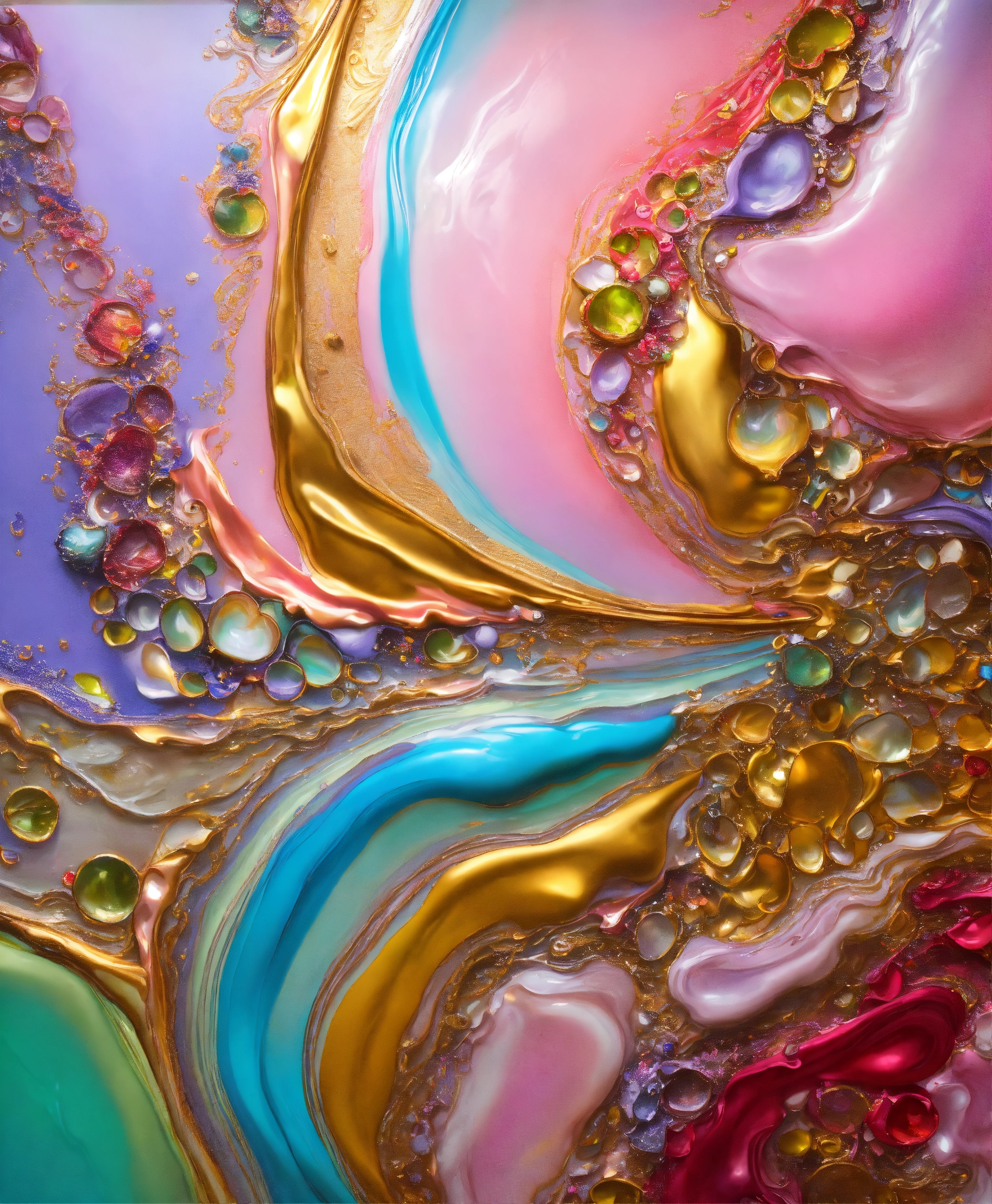 Colorful abstract painting oil and water complex complicated bright vivid colors beautiful opulent heavenly amazing wealthy intricate pink peridot sky blue gray lilac yellow violet green red blue sublime delicate hyperdetailed masterpiece metallic sheen mother of pearl elaborate inspiring ethereal amazing awesome 24k bright gold trims throughout oil and water 8k extremely sharp image throughout 3d