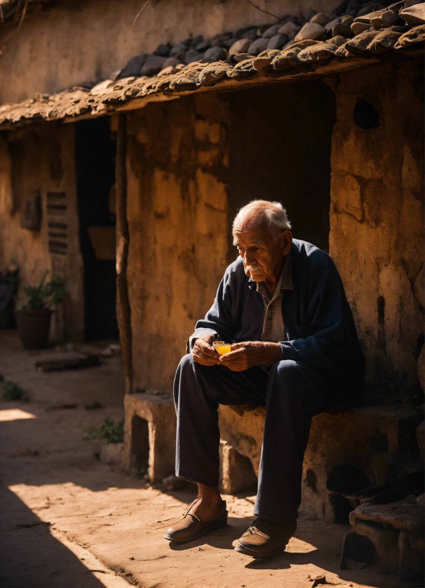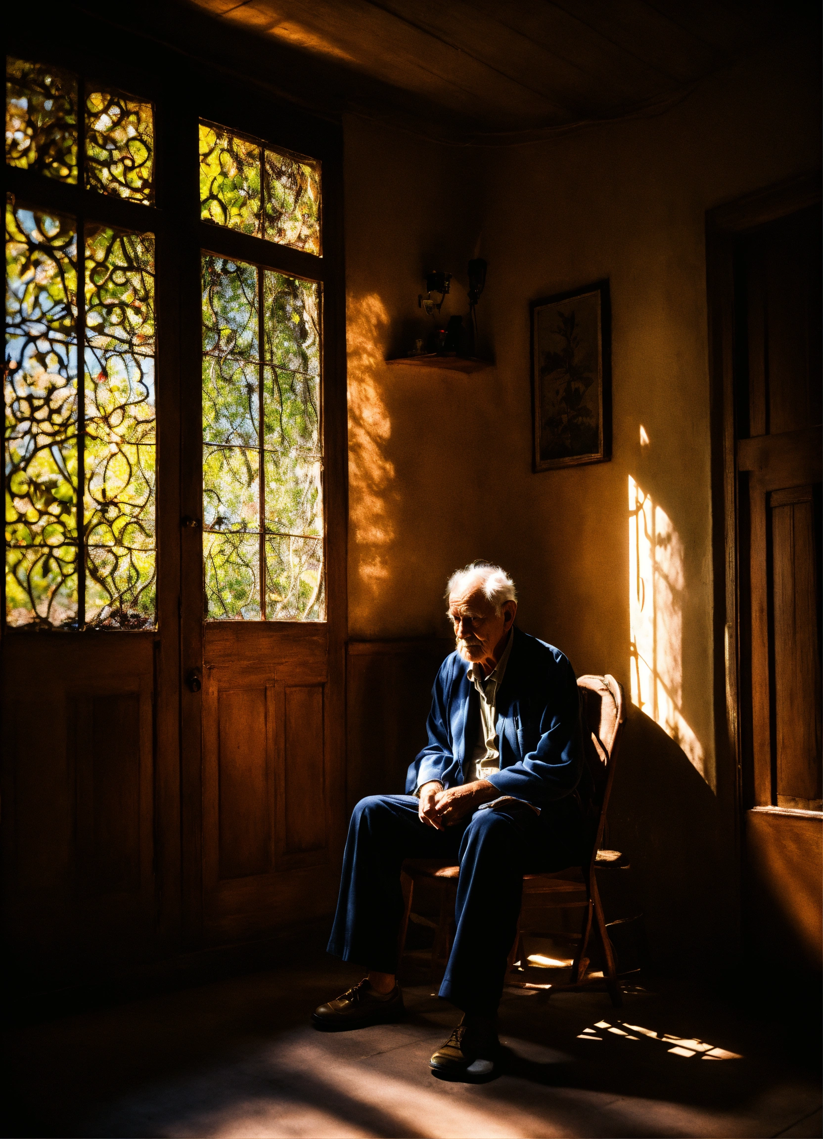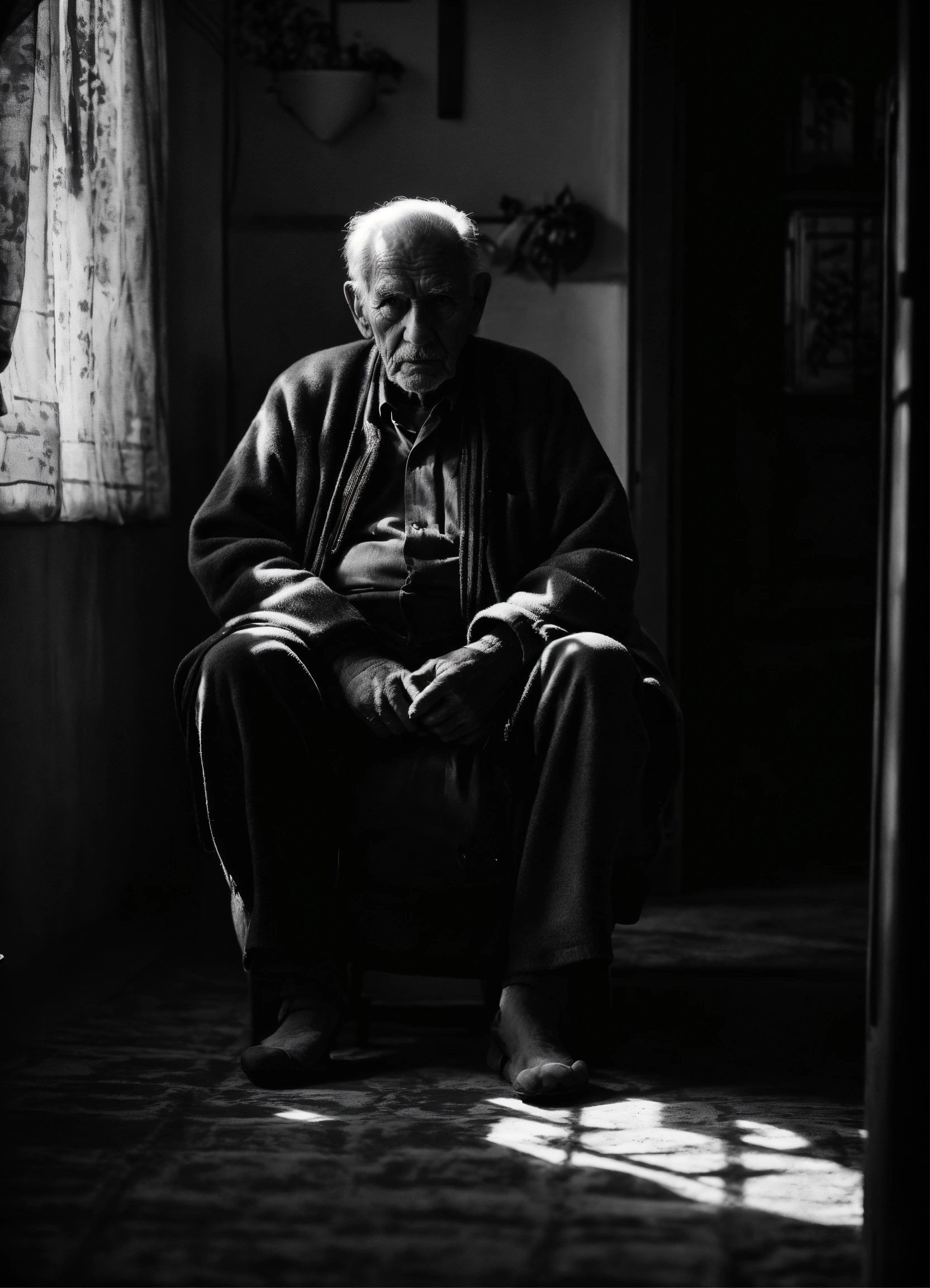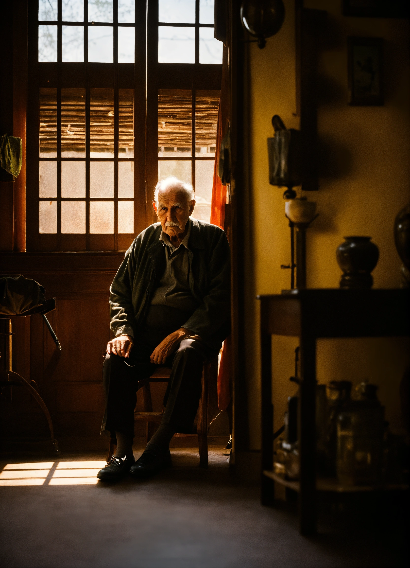 Old man sitting in his shadowy residence,