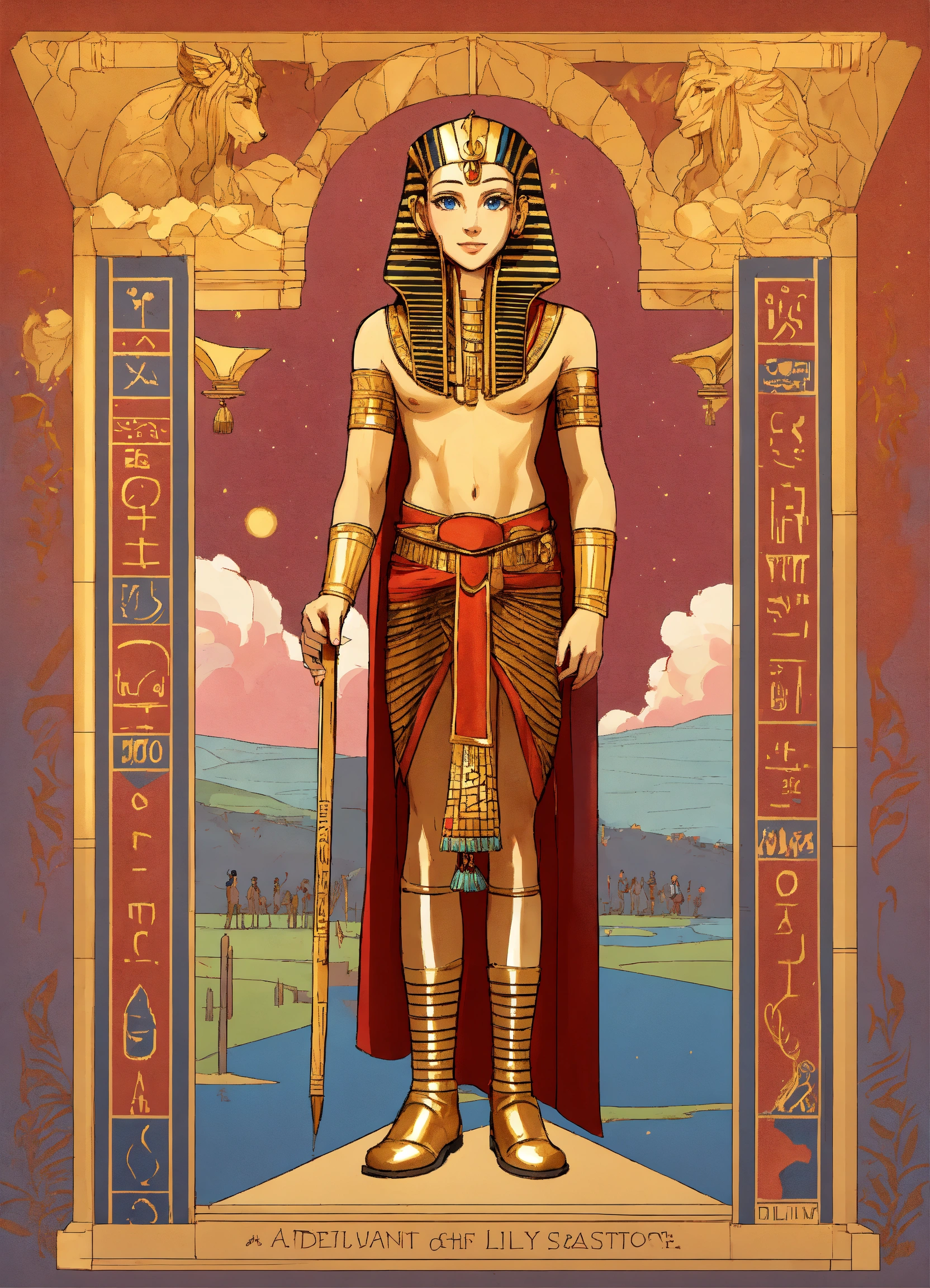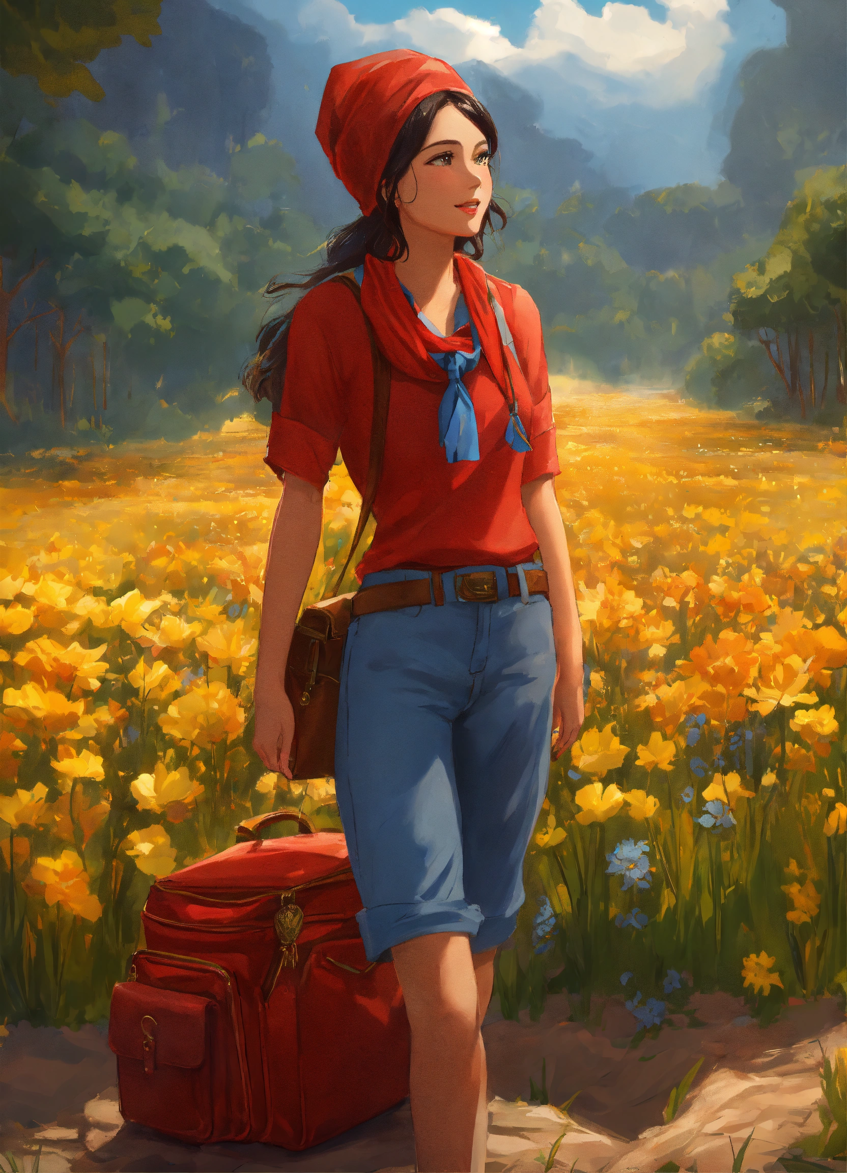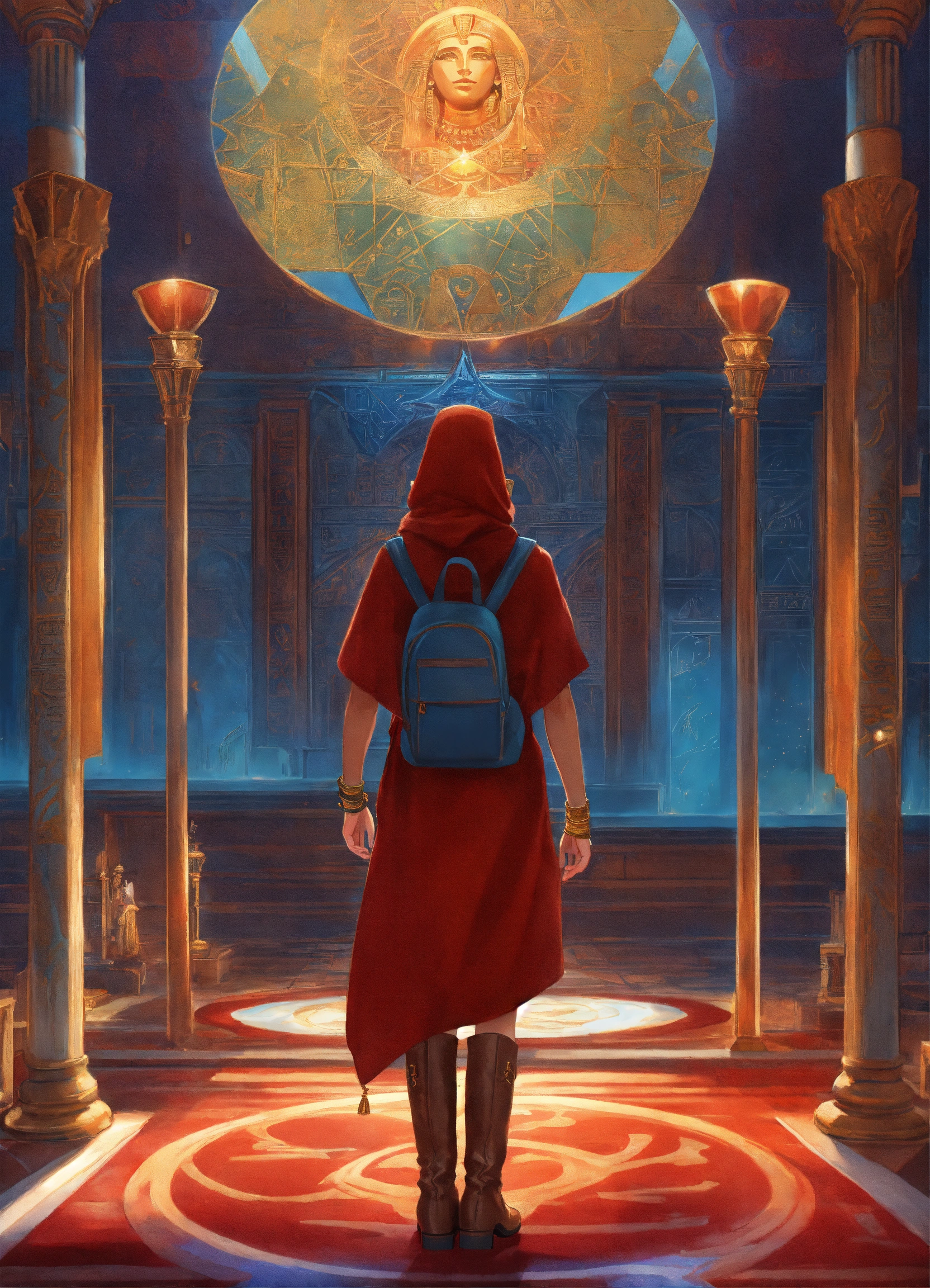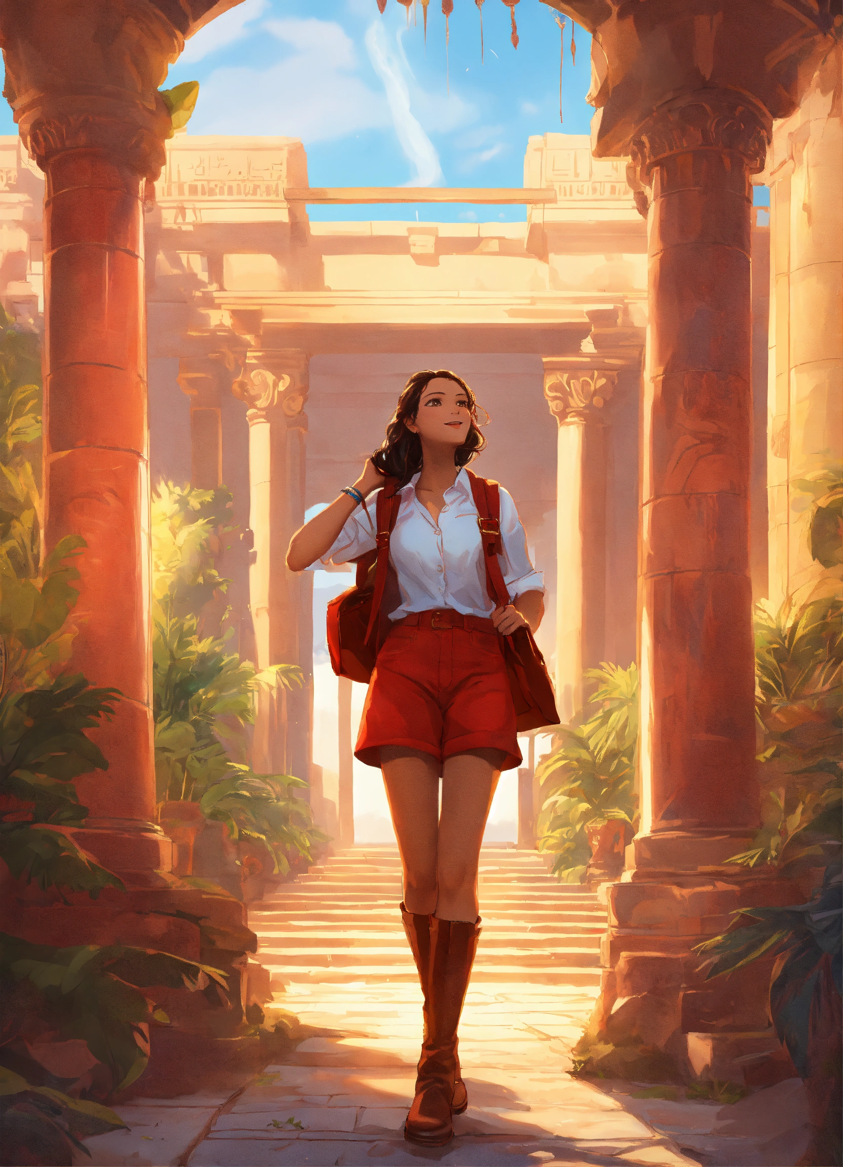 Chapter 9 thoth's wisdom unveiled adjectives scholarly, profound, ancient verbs depict a grand hall dedicated to thoth, the god of wisdom, with his cosmic-like statue carved from starlight. the lesson of the chapter is that wisdom and truth are inseparable, taught as lily, silver, and max delve into the goddess maat's importance in egyptian beliefs. view of gorgeous meadow with happy girl in red, animation pixar style, pendleton ward, magali villeneuve, art germ, rob rey and kentaro miura style, golden ratio, behance, trending on art station cartoon style, wearing a red scarf tied around her neck, a white shirt, and a pair of blue shorts. she also wore a pair of brown boots and a red backpack, which she filled with all her essentials tying her hair, wearing a red scarf, wearing a white shirt, wearing blue shorts, and wearing brown boots. she was on an adventure