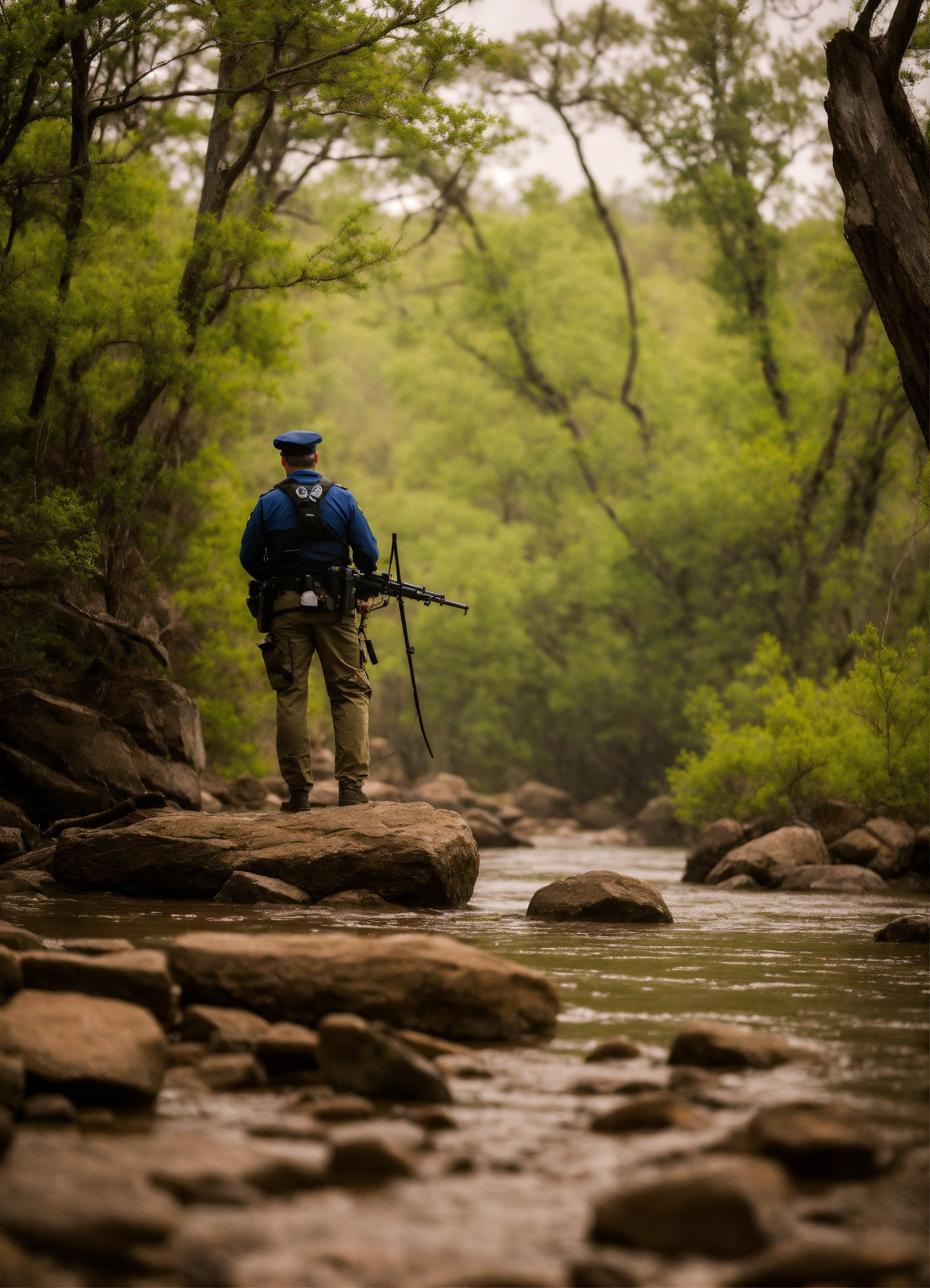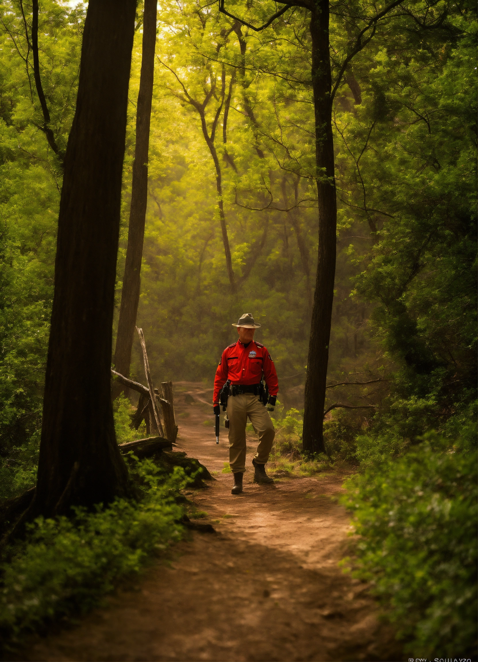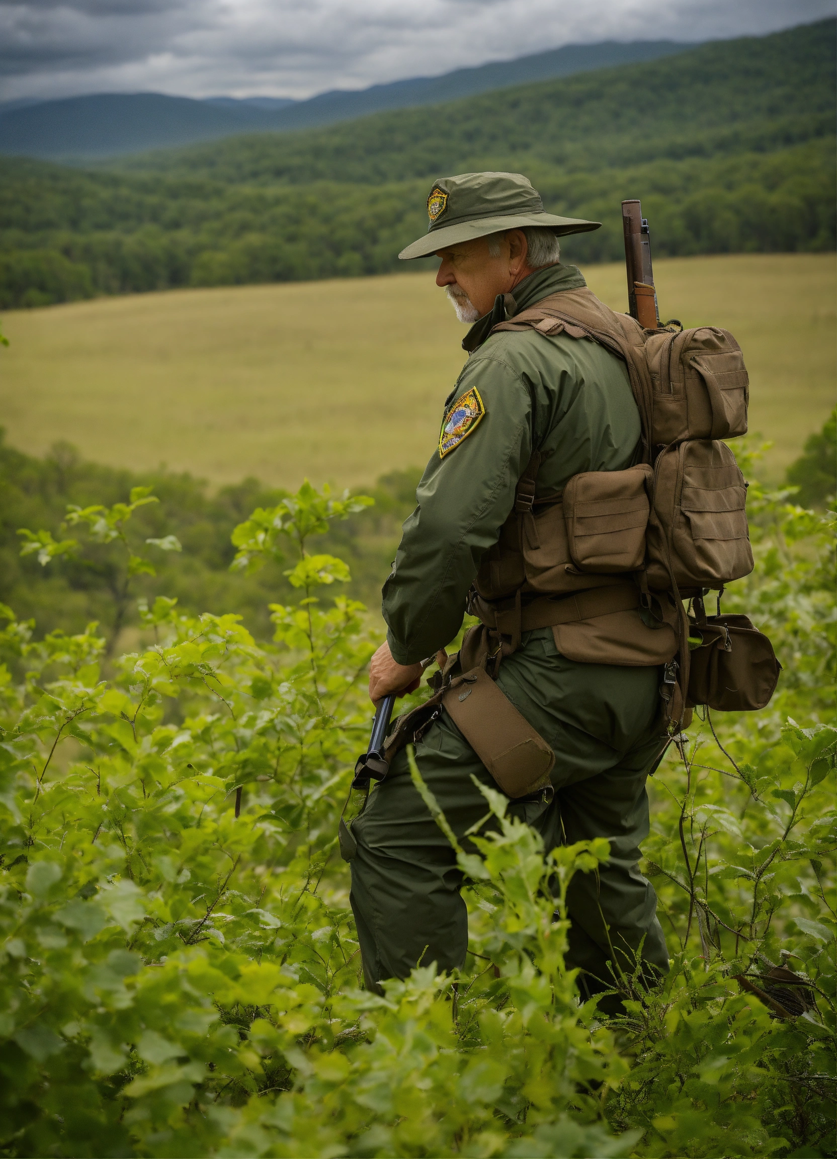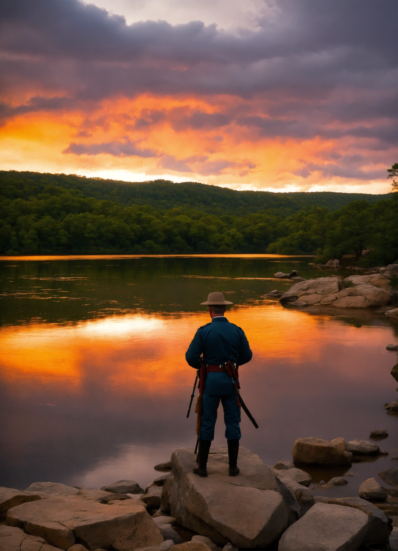 Una escena en el parque nacional shenandoah. roy sullivan, con su uniforme de guardabosques, está sentado en una banca mirando fijamente hacia mí. en el horizonte, una tormenta se avecina, y un rayo es visible. roy sostiene un pararrayos, con una expresión de desafío.