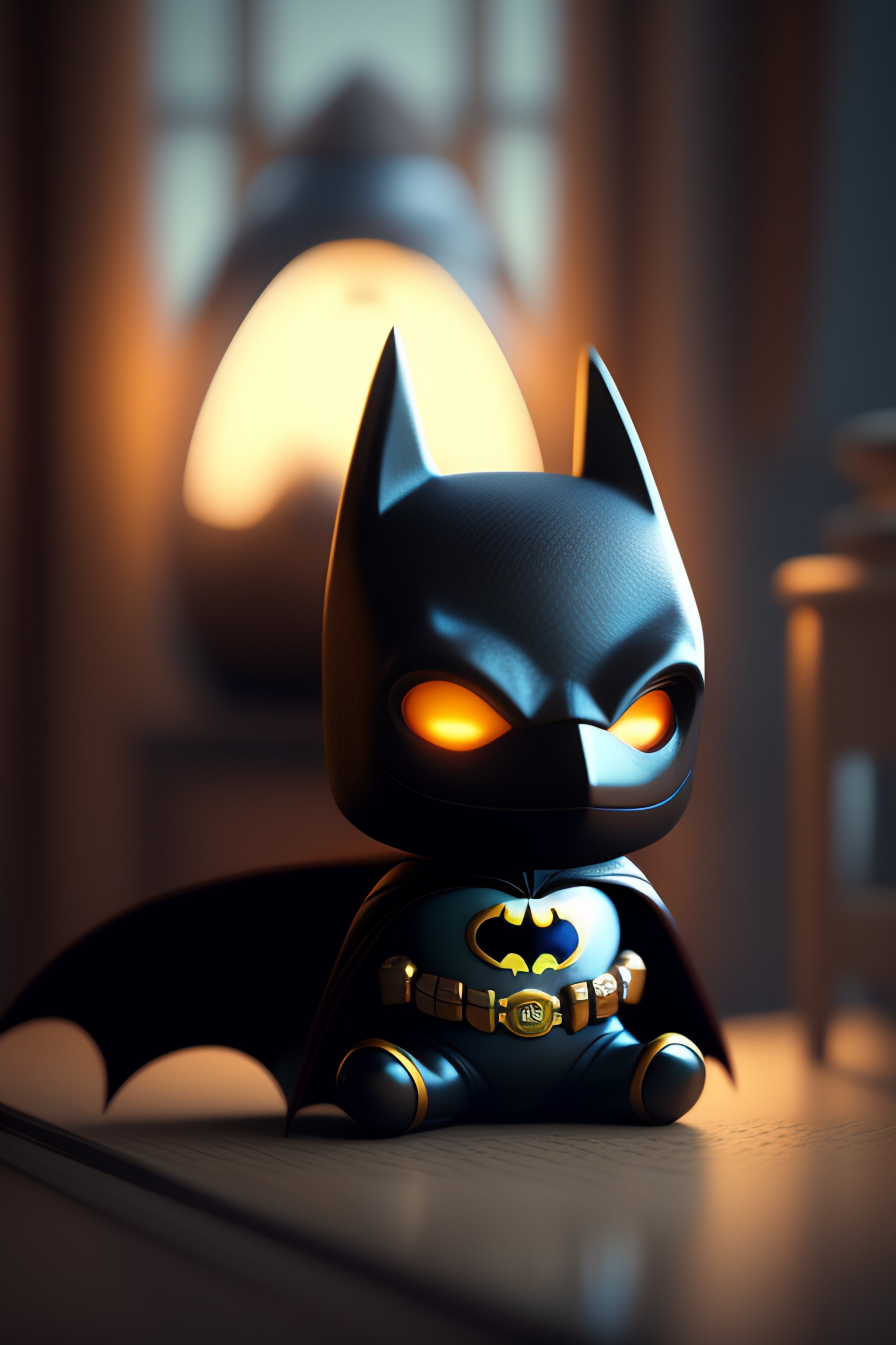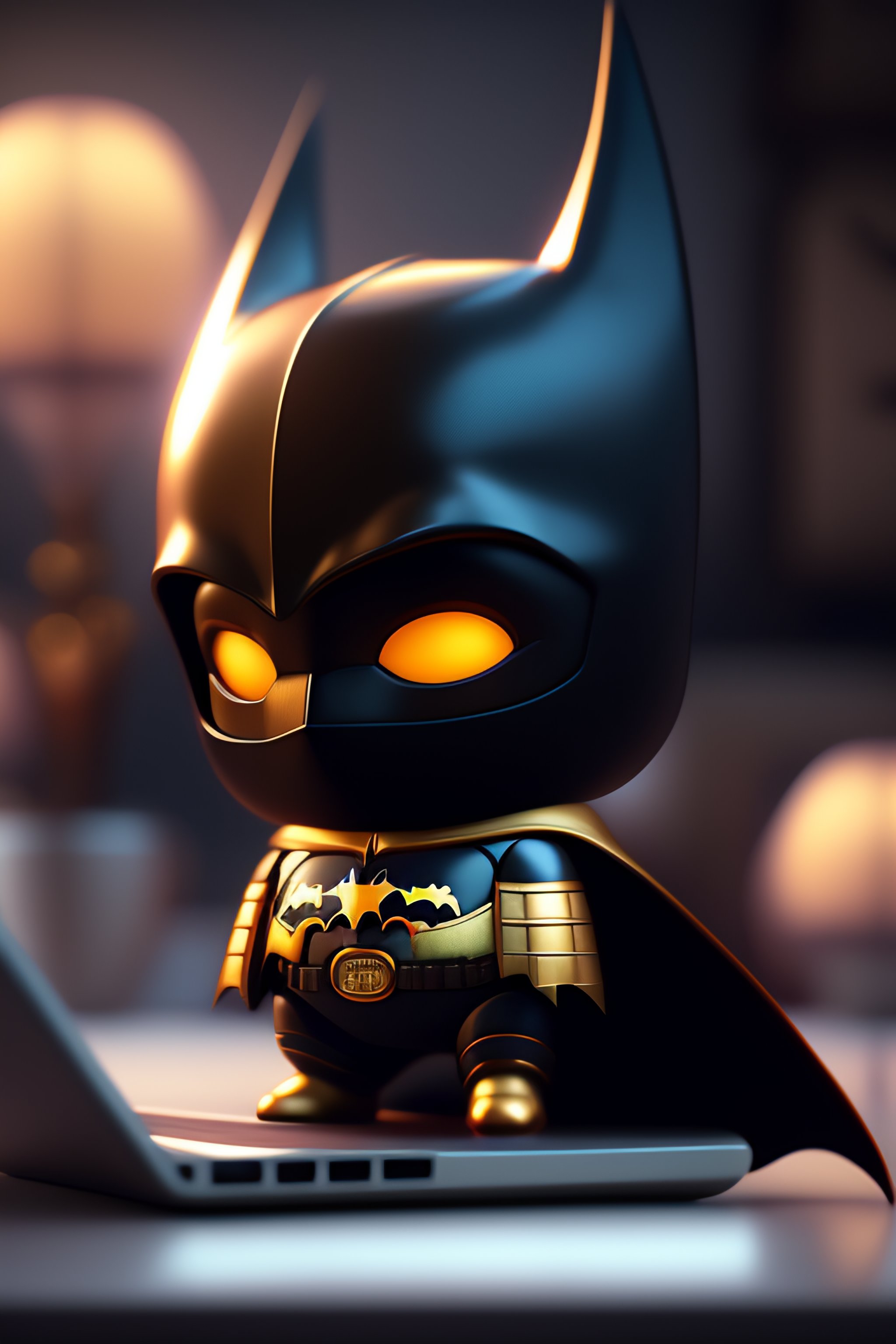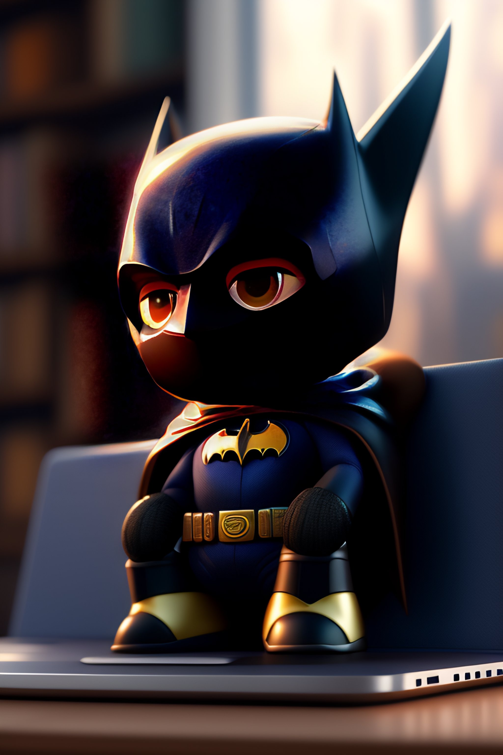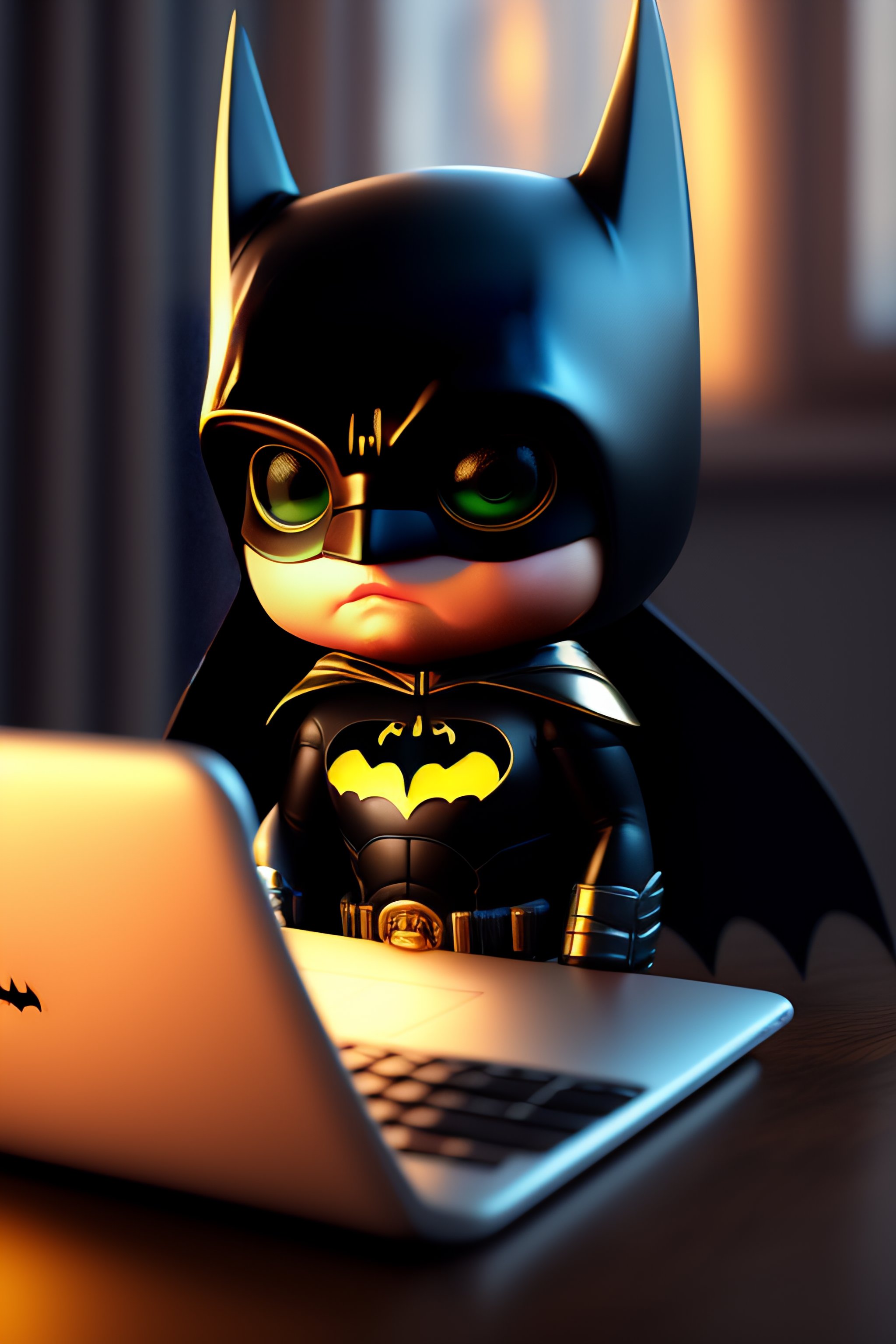 Cute small humanoid batman sitting in front of laptop, unreal engine, cozy indoor lighting, artstation, detailed, digital painting, cinematic, character design by mark ryden and pixar and hayao miyazaki, unreal 5, daz, hyperrealistic, octane render