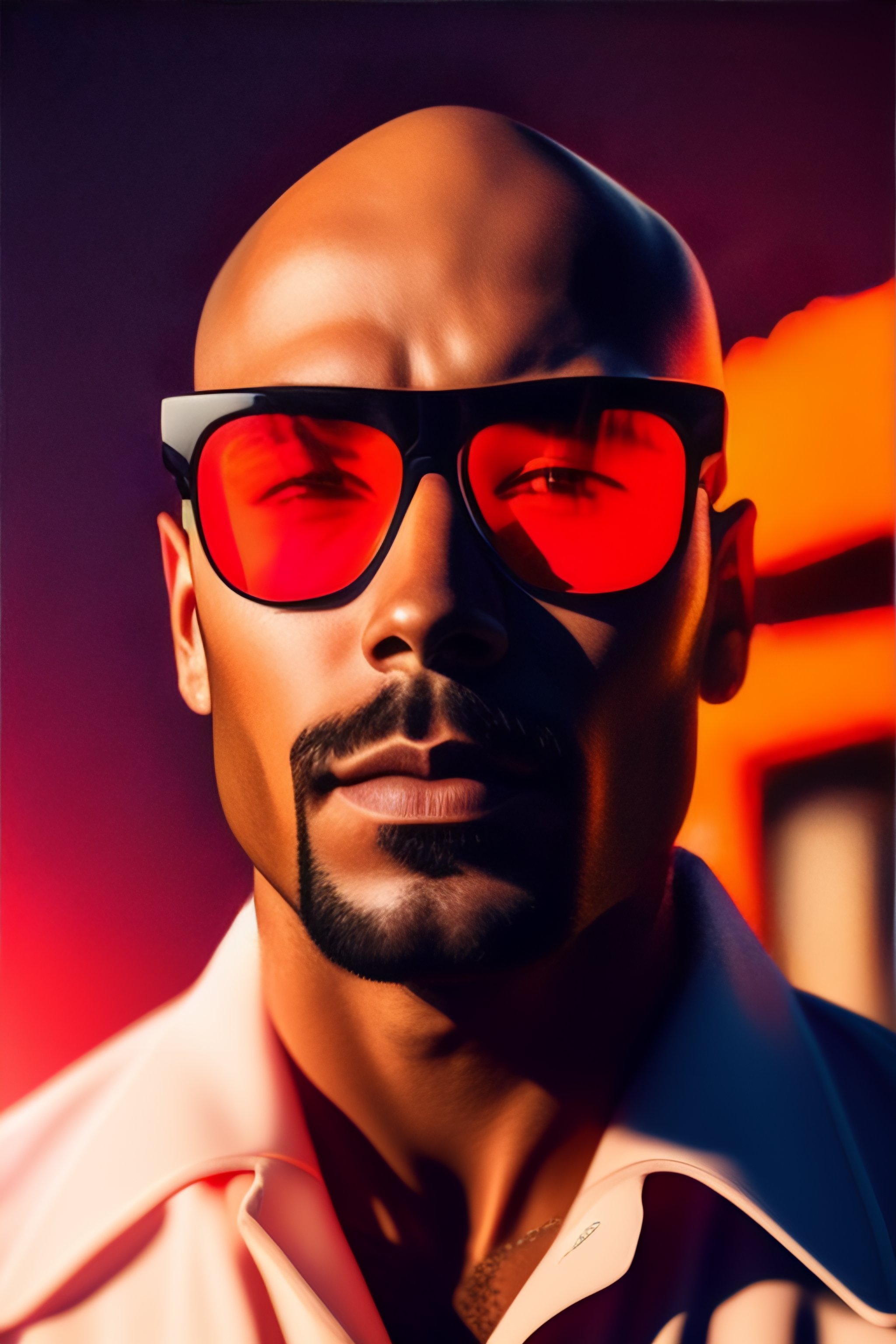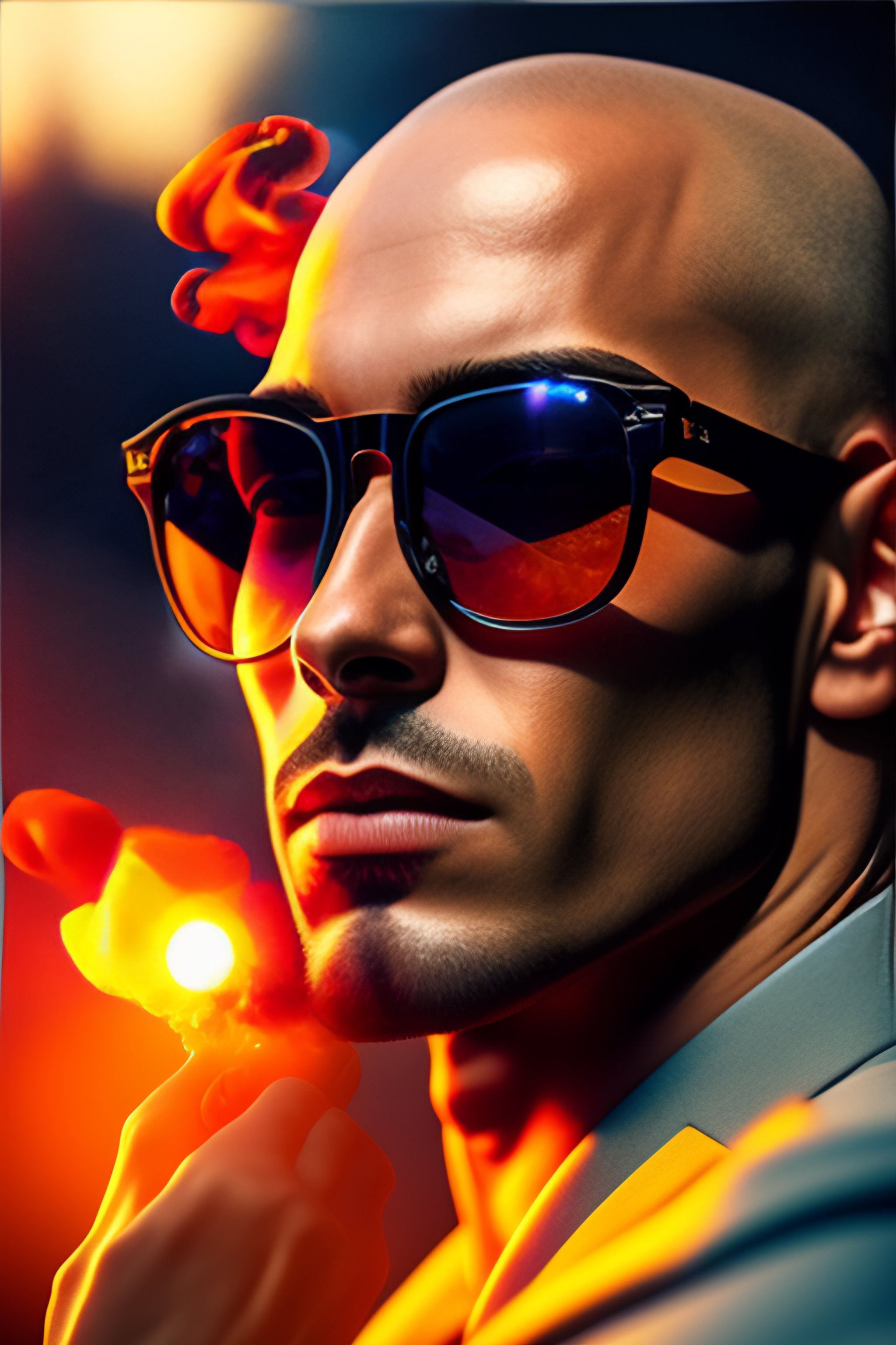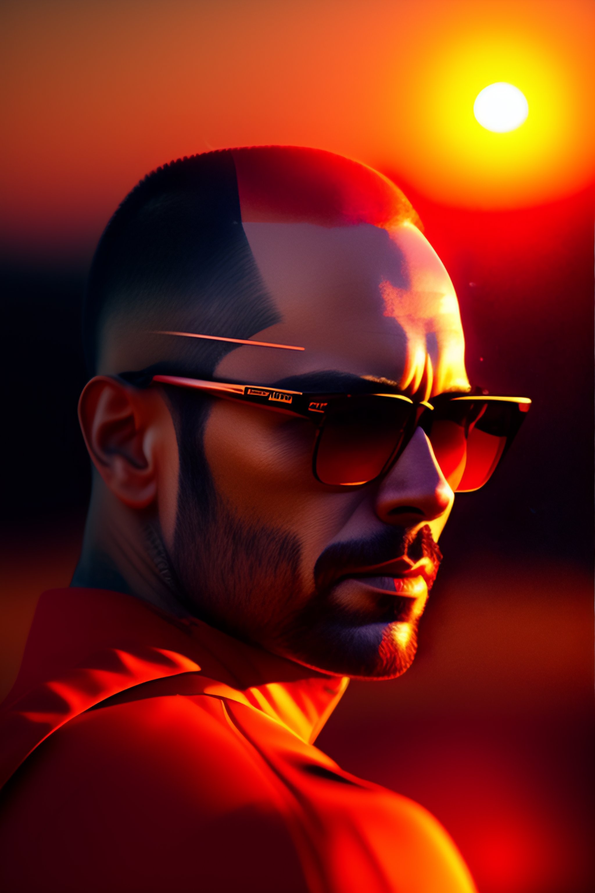 Bald andrew tate wearing sunglasses and smoking cigar, red sun-set sky, photorealistic, realism, trending on artstation, art by midjourney, 8k, octane render, unreal engine, volumetric vibrant bright and warm lighting