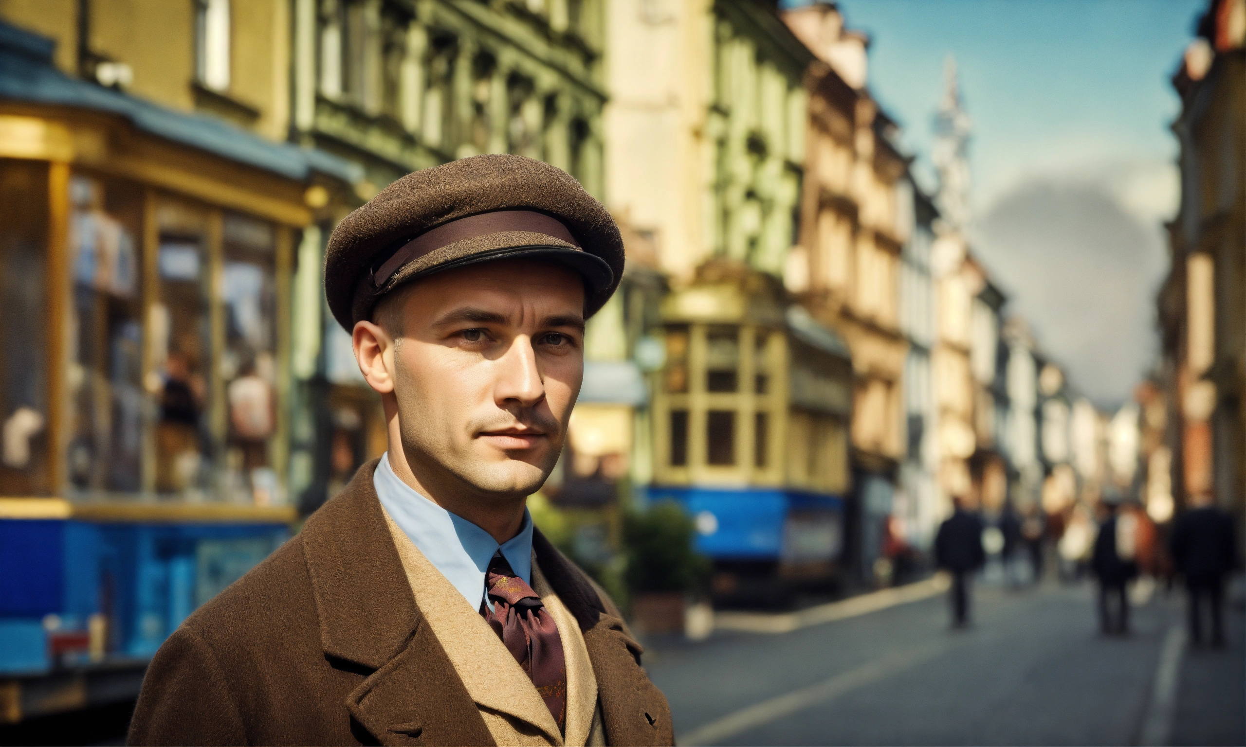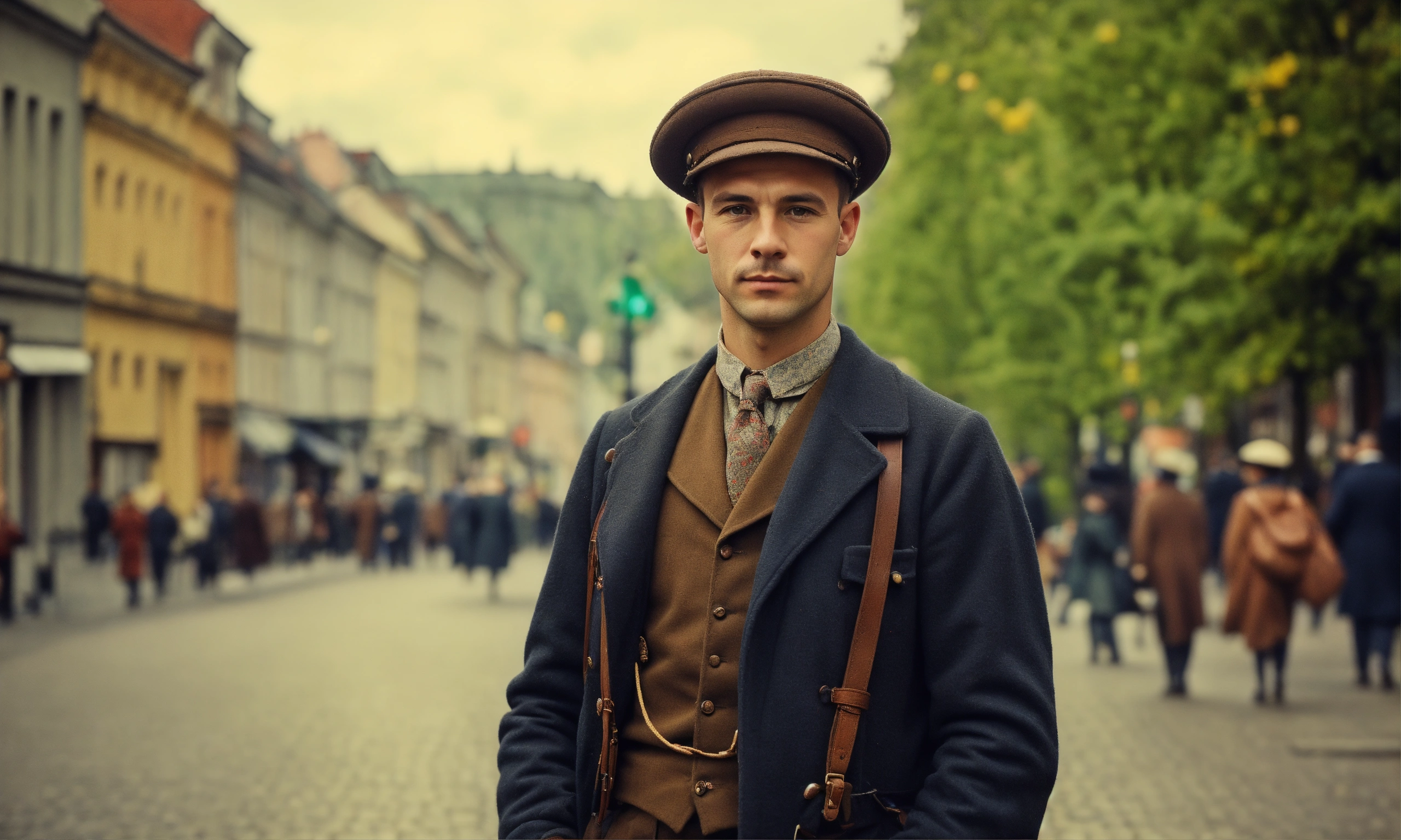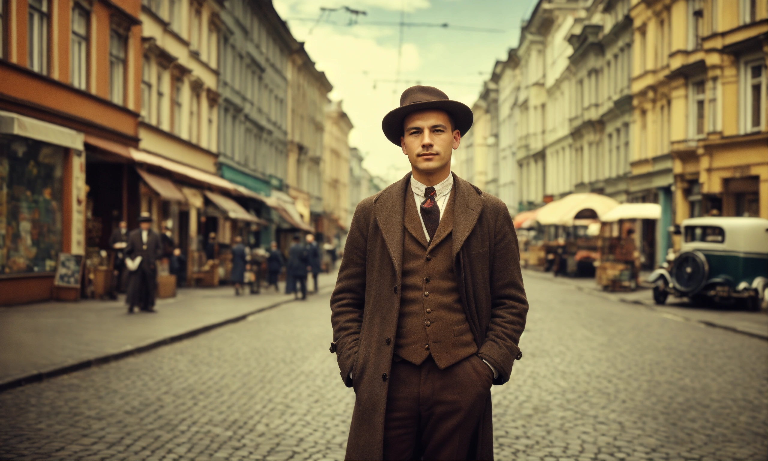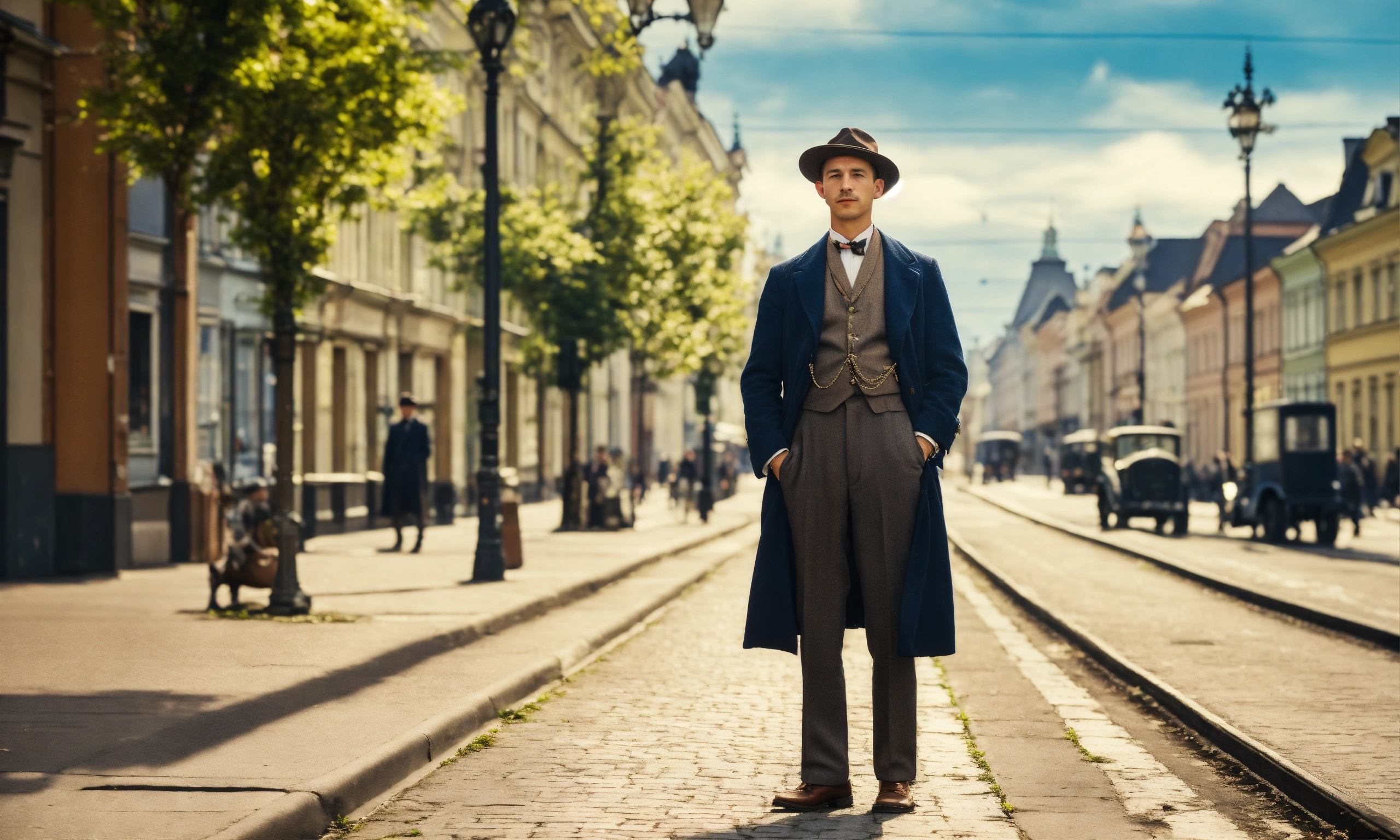 Cute poland man in full haight 1920-1930 on streen in warshaw, retro style photo full height, without people