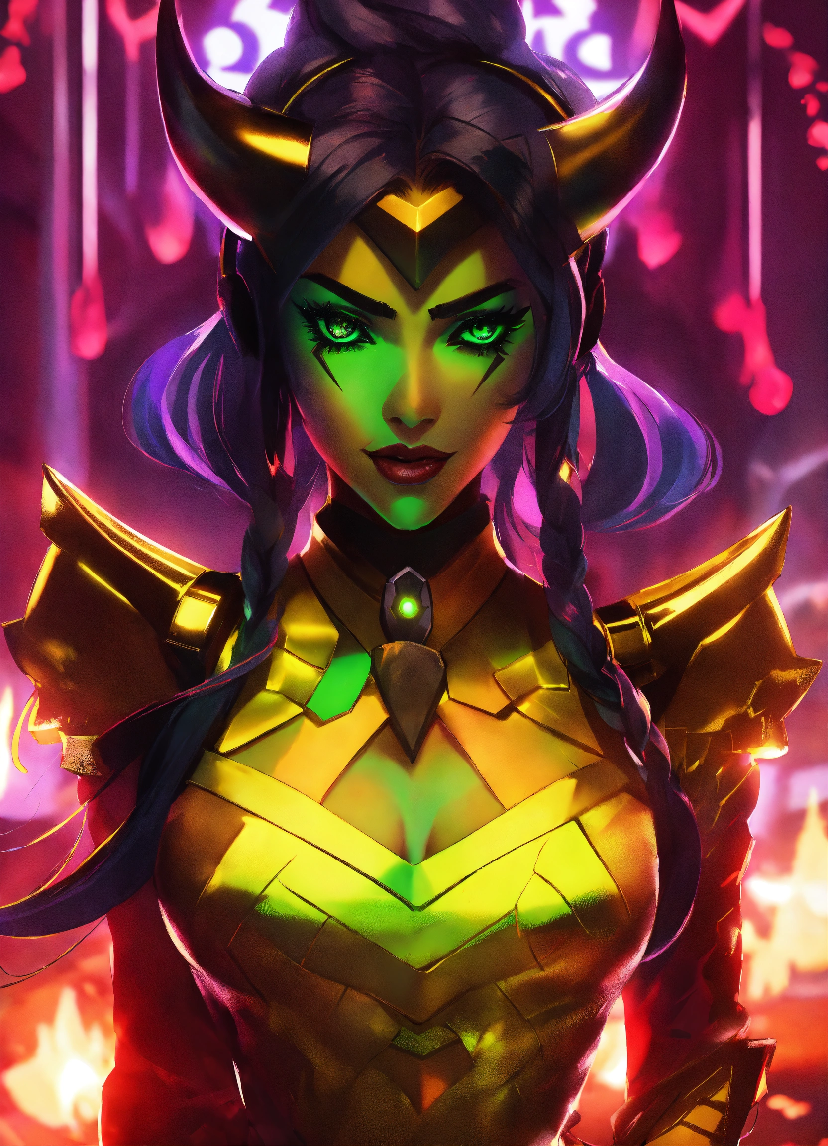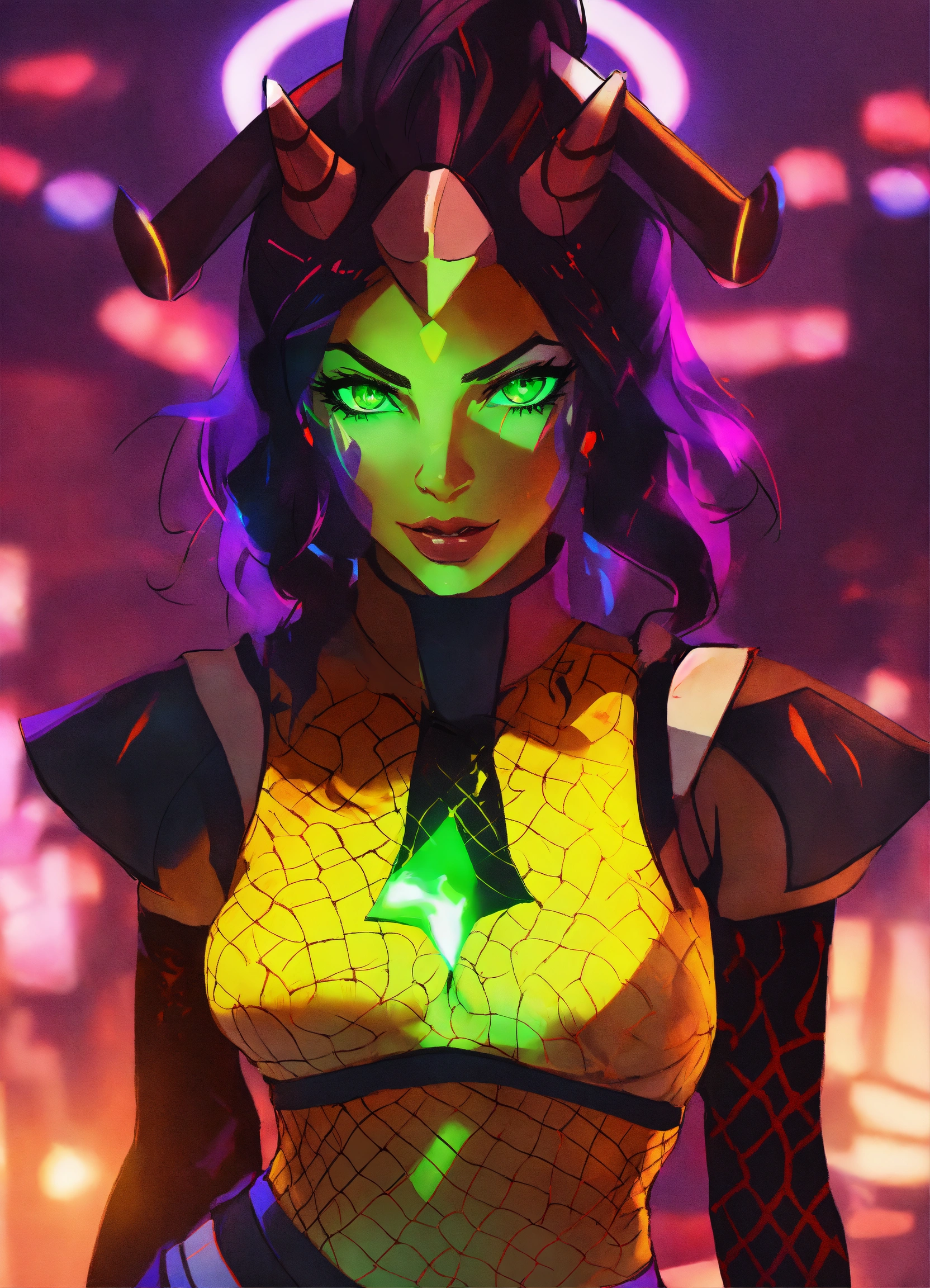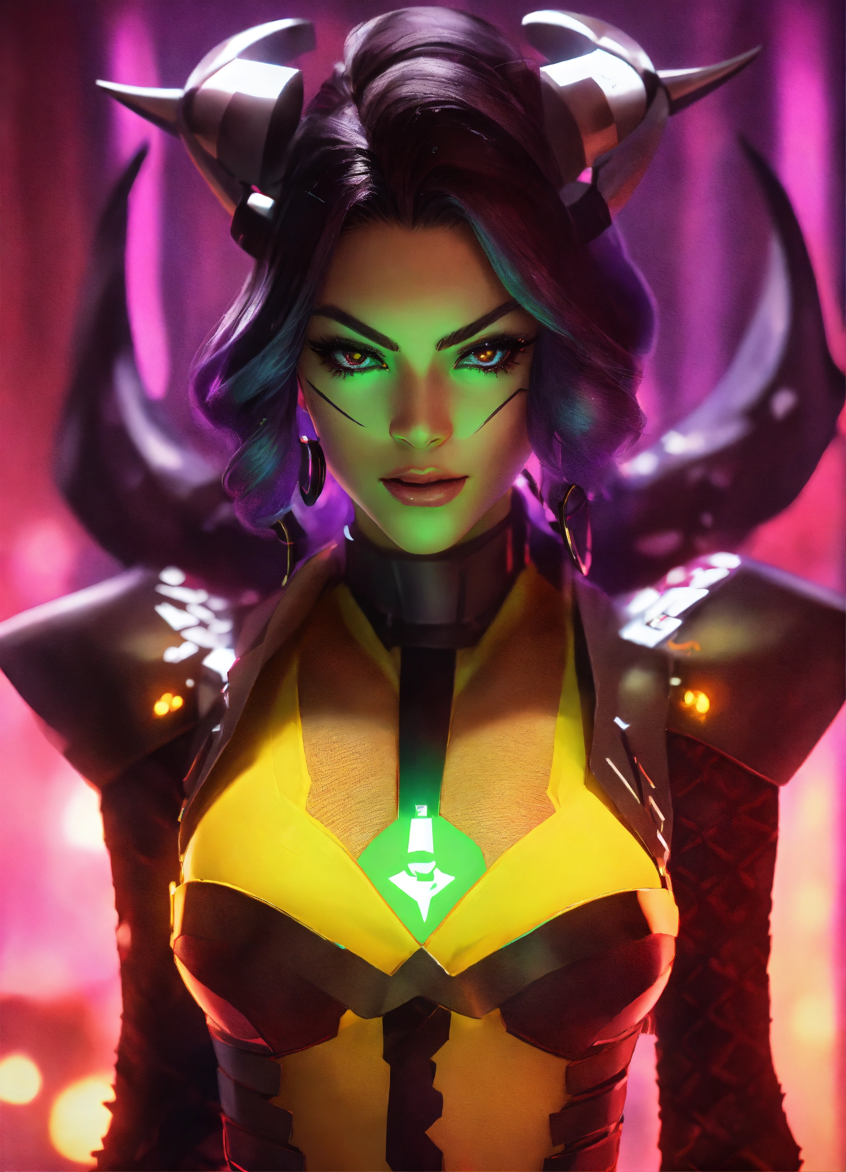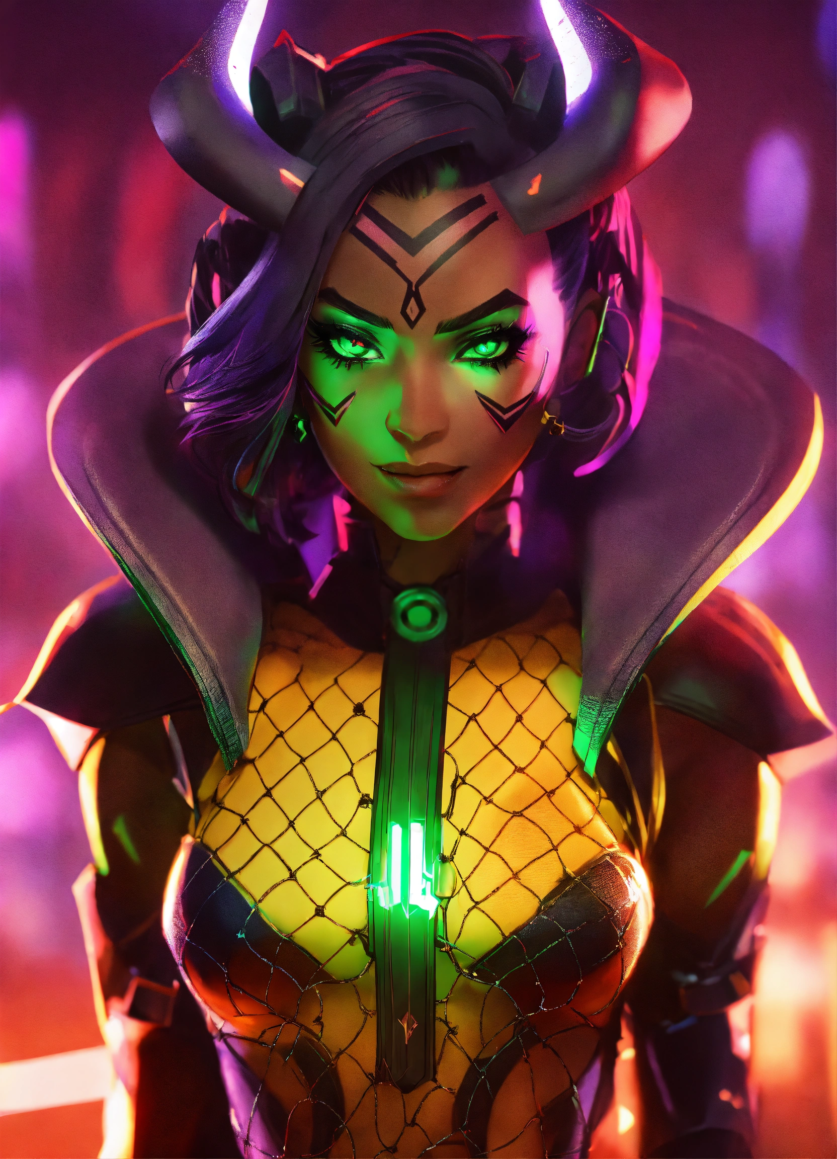 Sombra from overwatch, fishnets, crop top, evil, demon horns, satan, glowing eyes, goddess, elegant, ascended, wide shot.