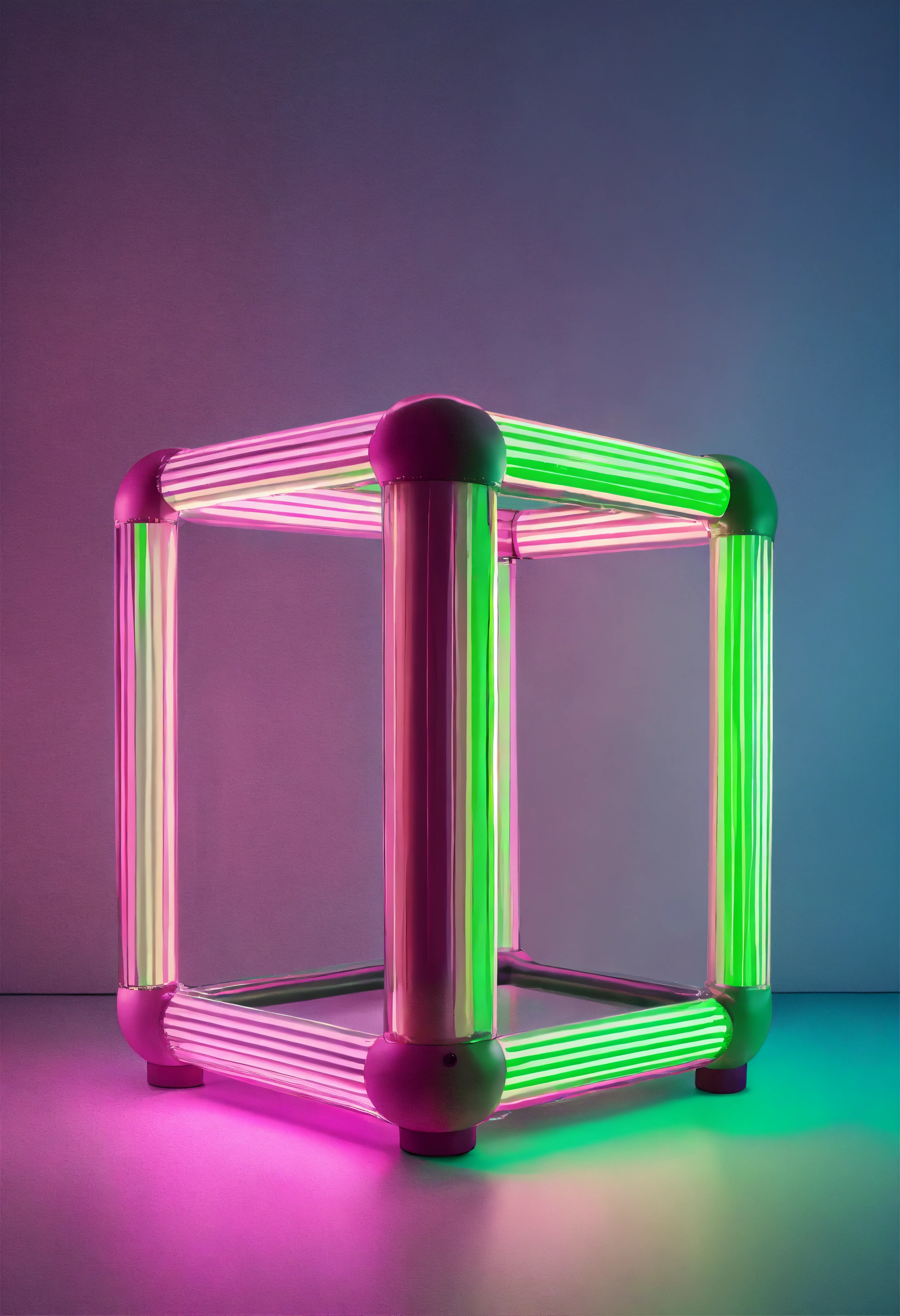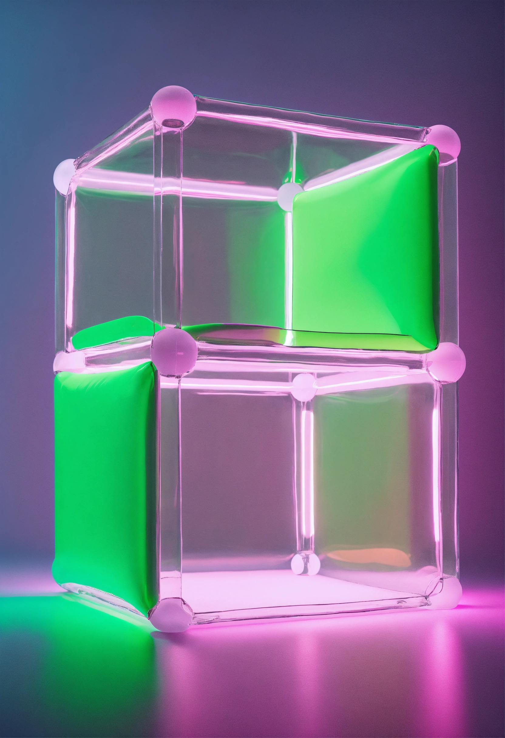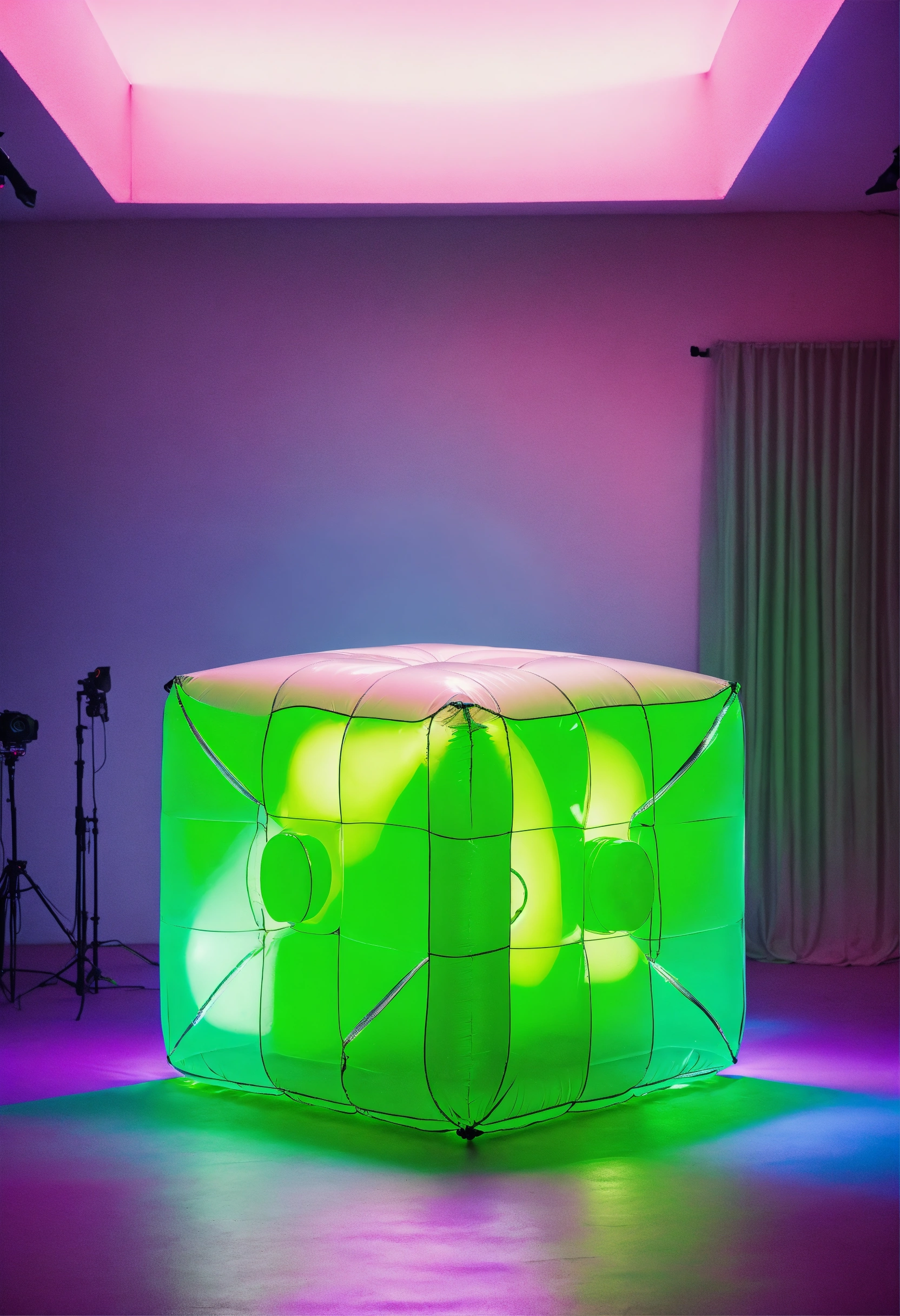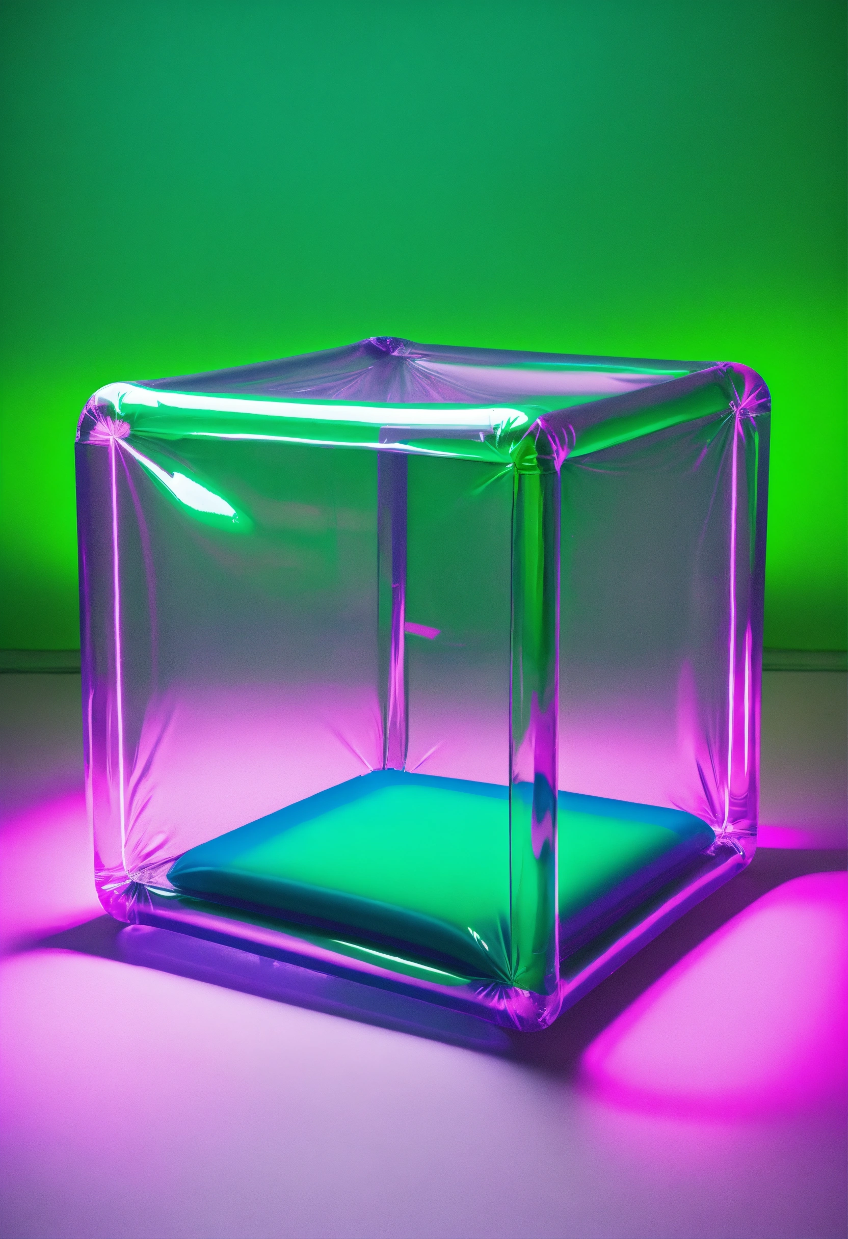 Inflatable clear cube, studio photography, some neon green accent color, 4k, muted color background! realistic!