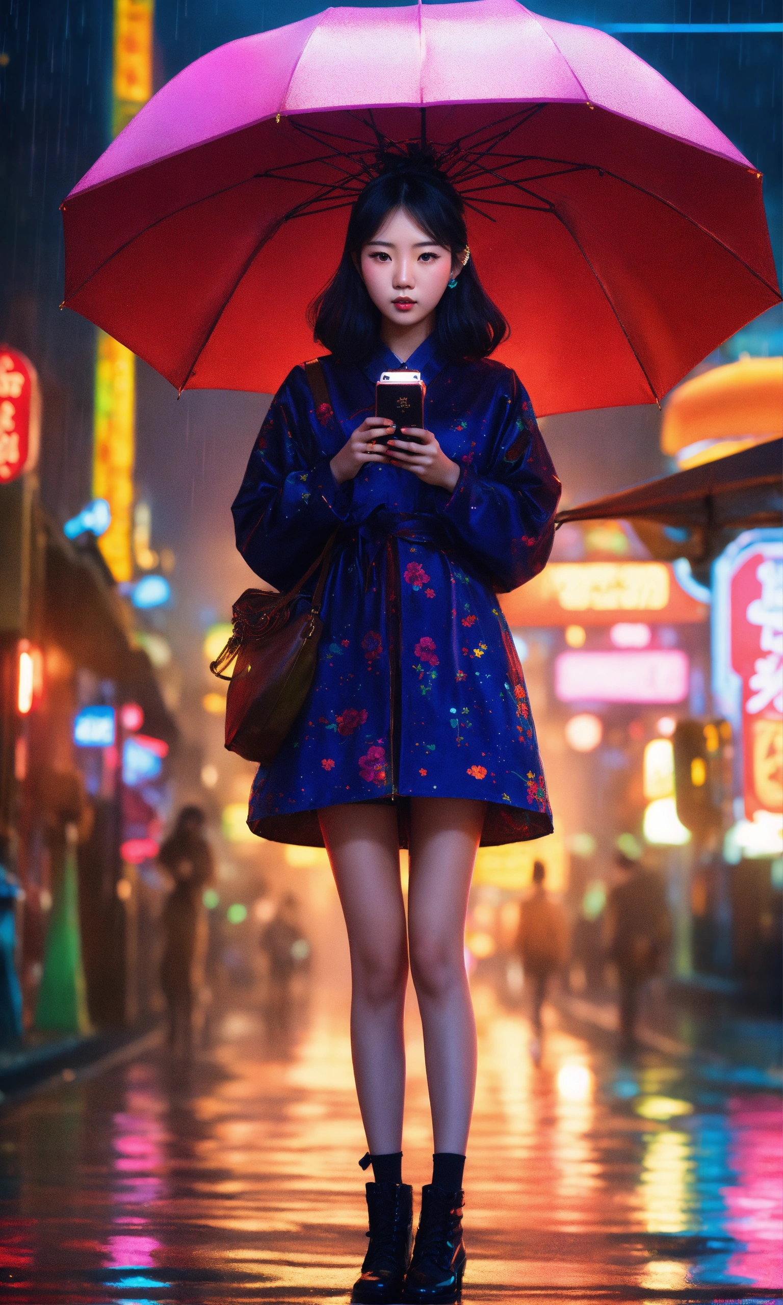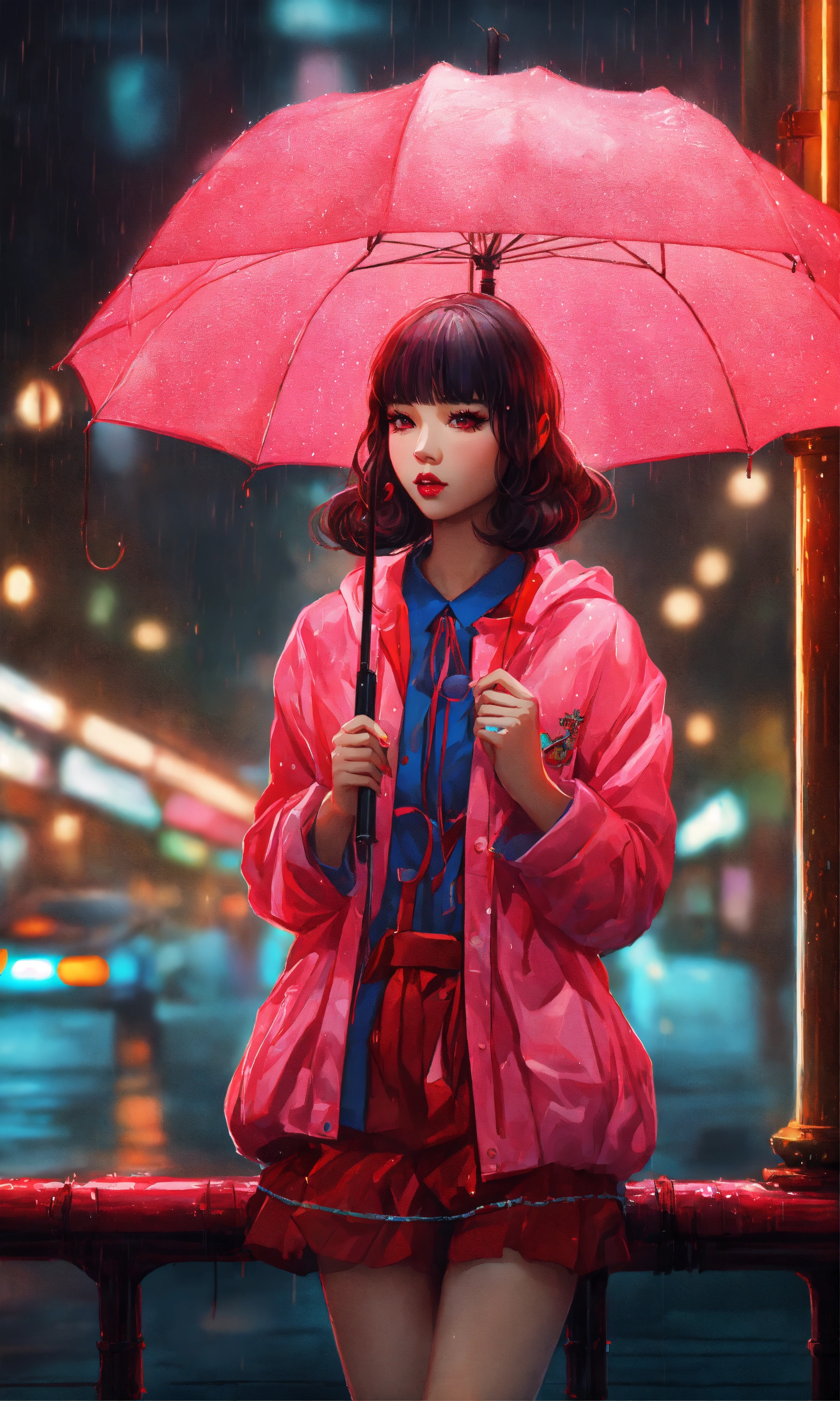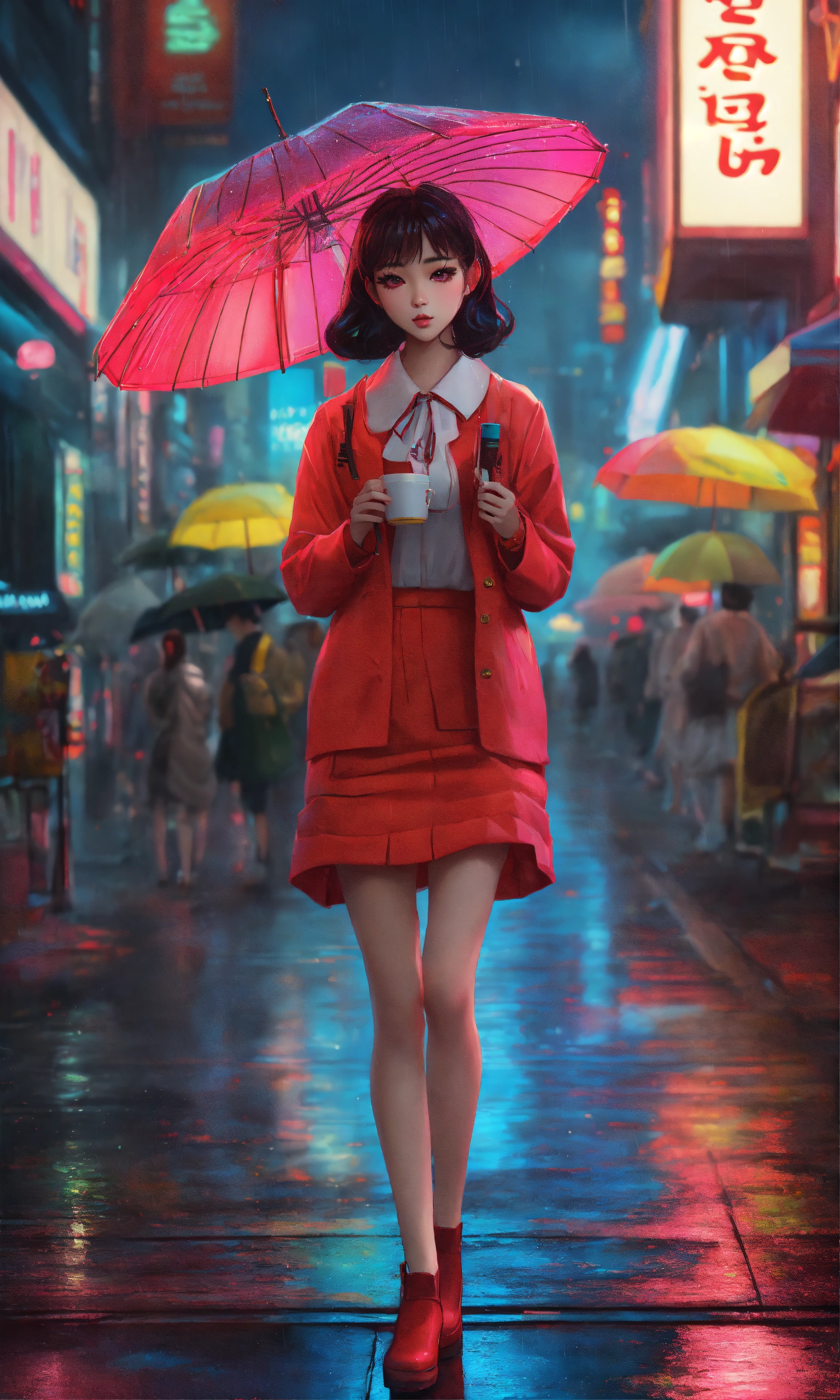 Beautiful korean young woman, stylish, trending on artstation, neon lights, rainy night, stunning full body anime art by mark ryden