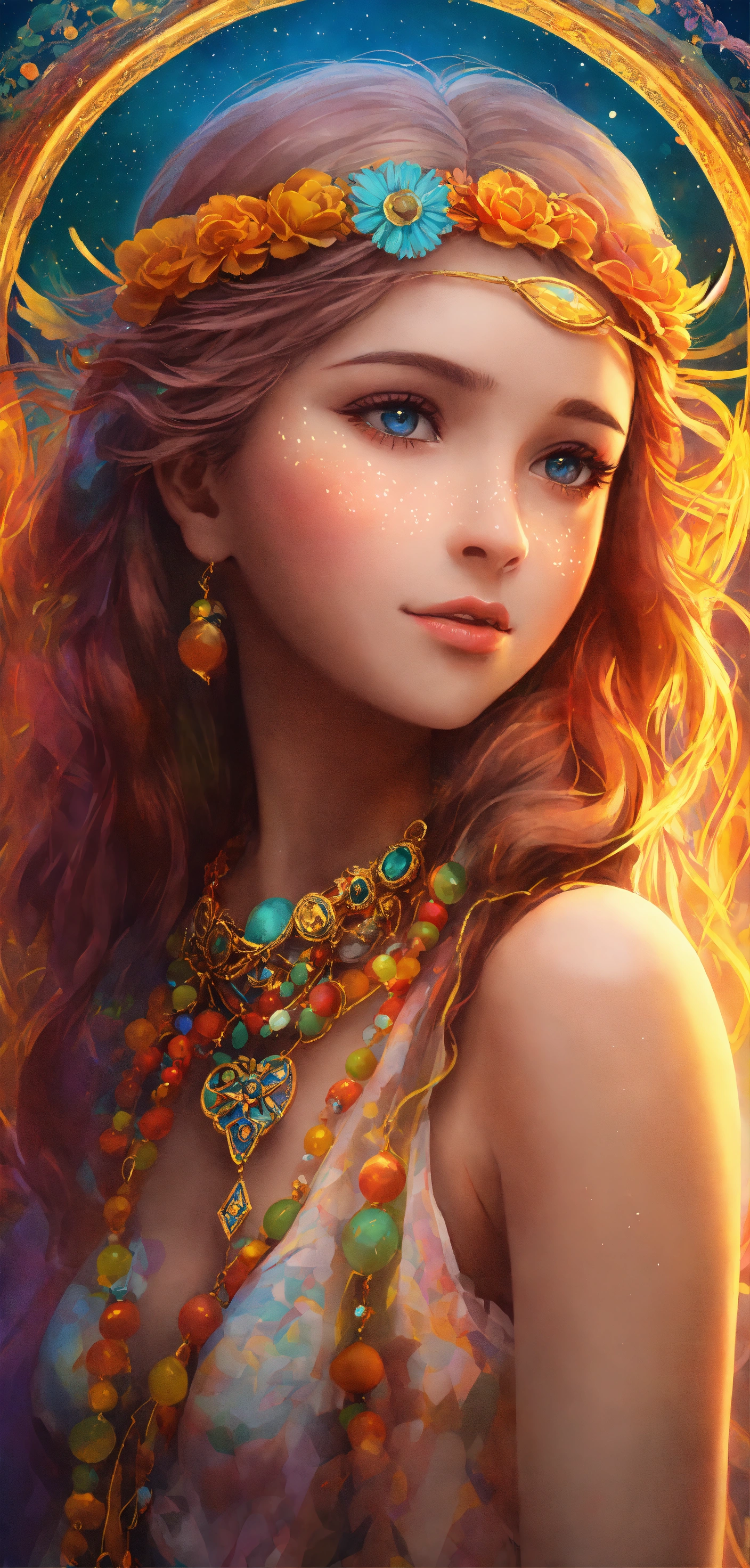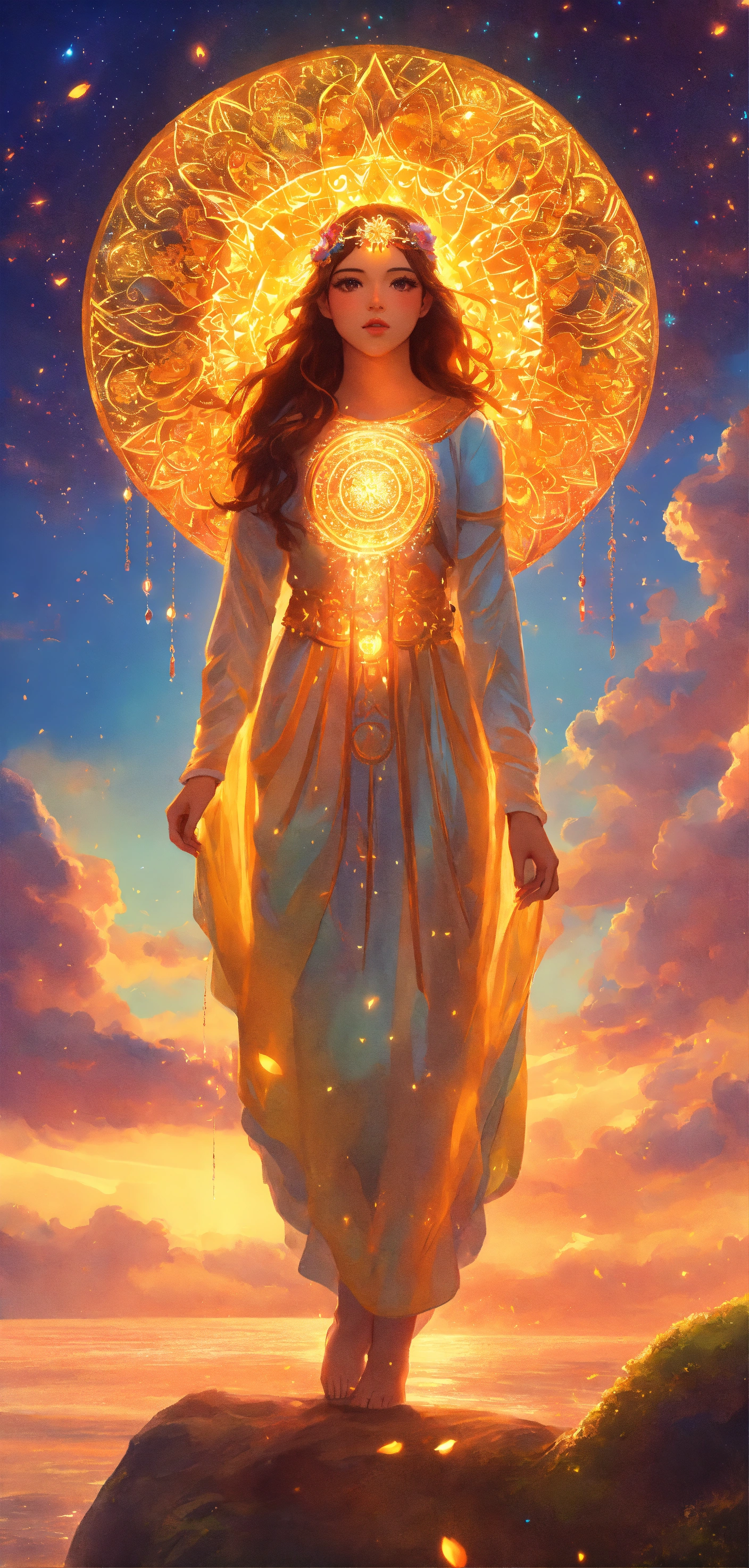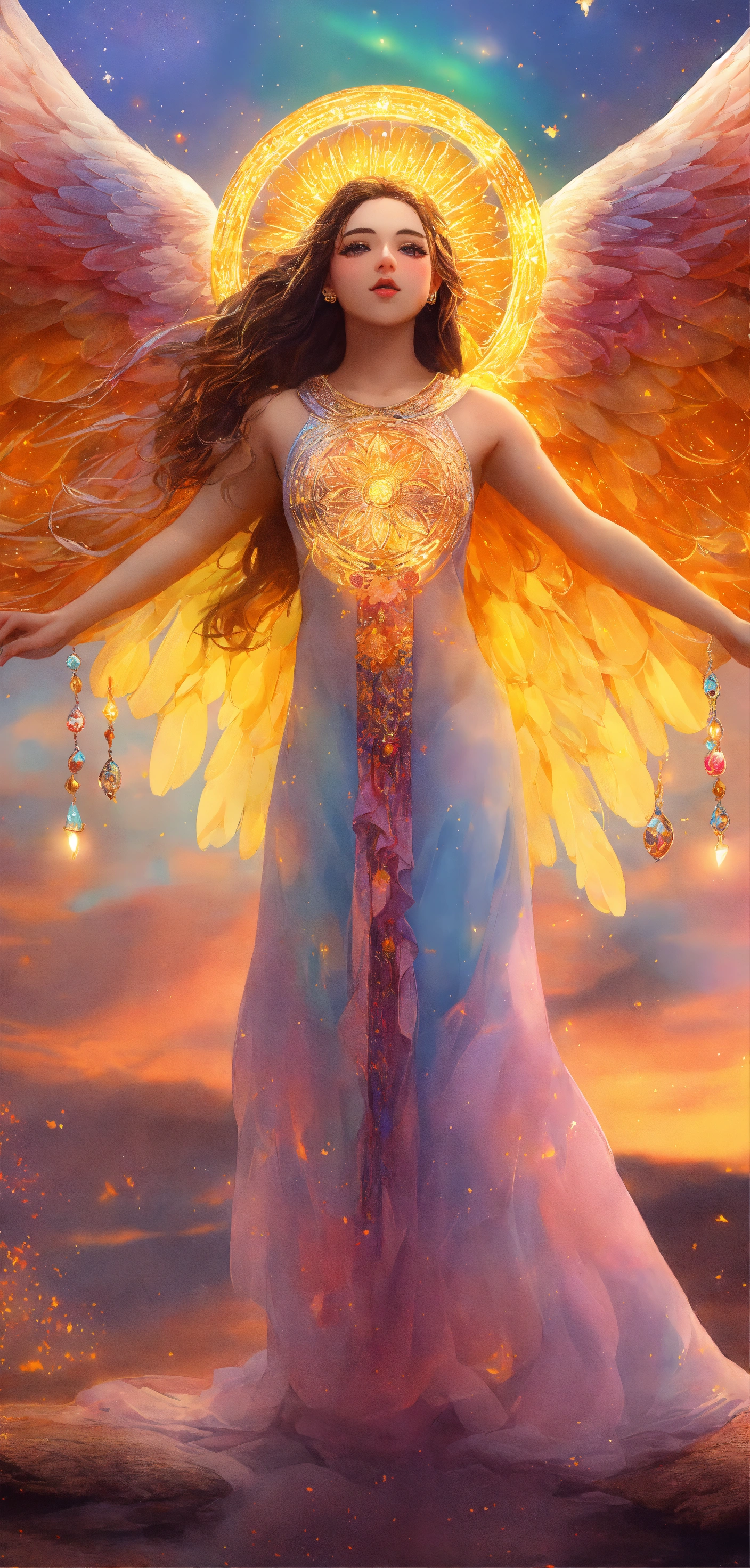 1 ilustracion hiperrealista y hiperdetallado. 7 aros con un borde luminoso en colores arcoíris vibrante sumergidas y flotando en un cielo despejado con nubes de colores. en cada aro hay un angelita niña hermosa y perfecta diferente en cada esfera. son siete aros y siete angelitos detallados y definidos. 7 angelitas niñas hermosas y perfectas con alas de angel muy luminosas de color amarillo y dorado detalladas, alas definidas y uniformes y completas. rostros perfectos y detallados. ojos claros con mirada profunda y penetrante. el firmamento es hermoso y hay tonalidades tornasoladas neon vibrante muy hermoso. alrededor de ellas hay mandalas hermosos en inmersion de color dorados con geometria sagrada . el cielo tiene pequellas estrellas doradas con destellos de luz. hay secuencias de angeles muy hermosas y muy detalladas. no hay animales. no hay personas. no hay más ángeles. hd. obra maestra. alta resolución. alta calidad. obra de arte. arte digital. realismo. 8k
