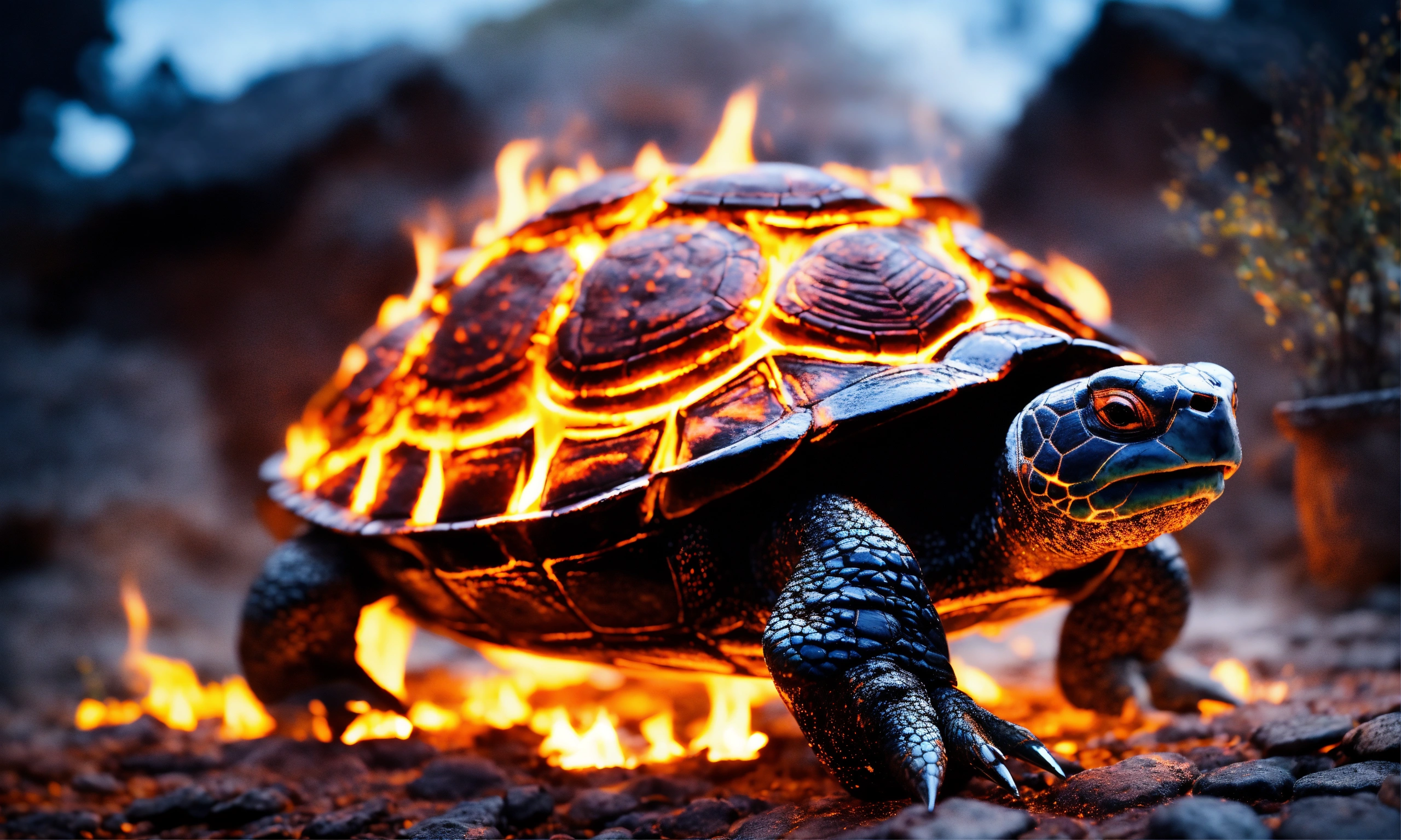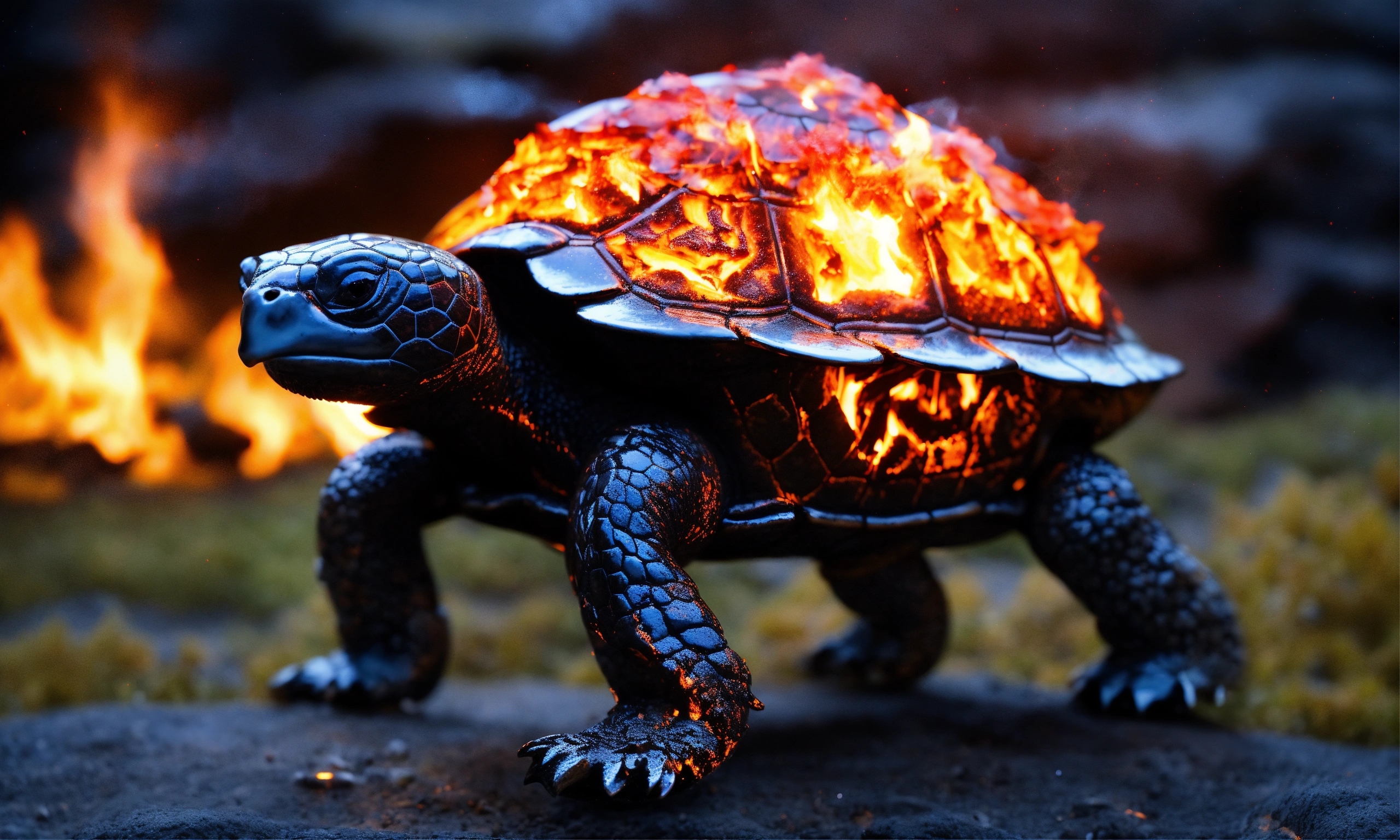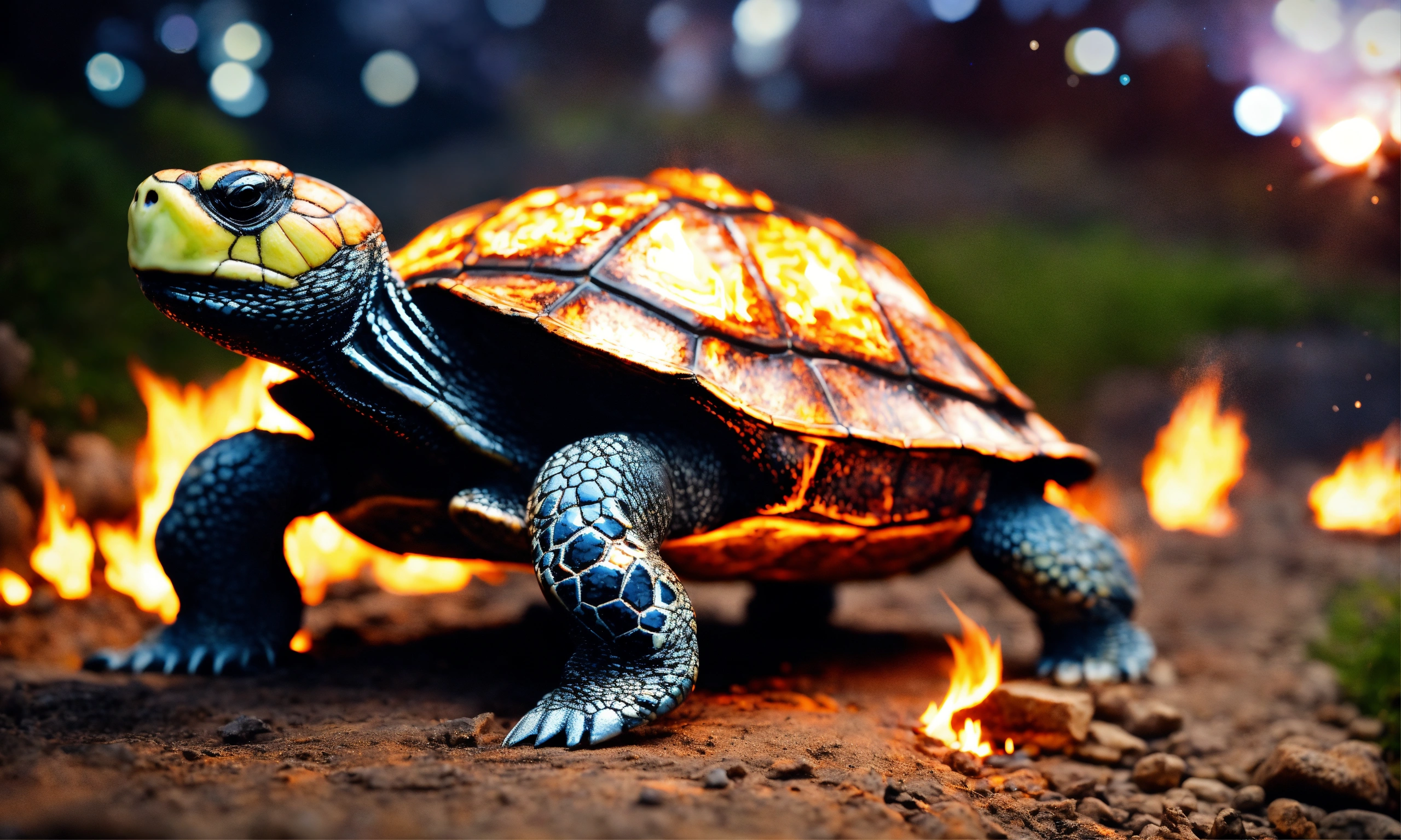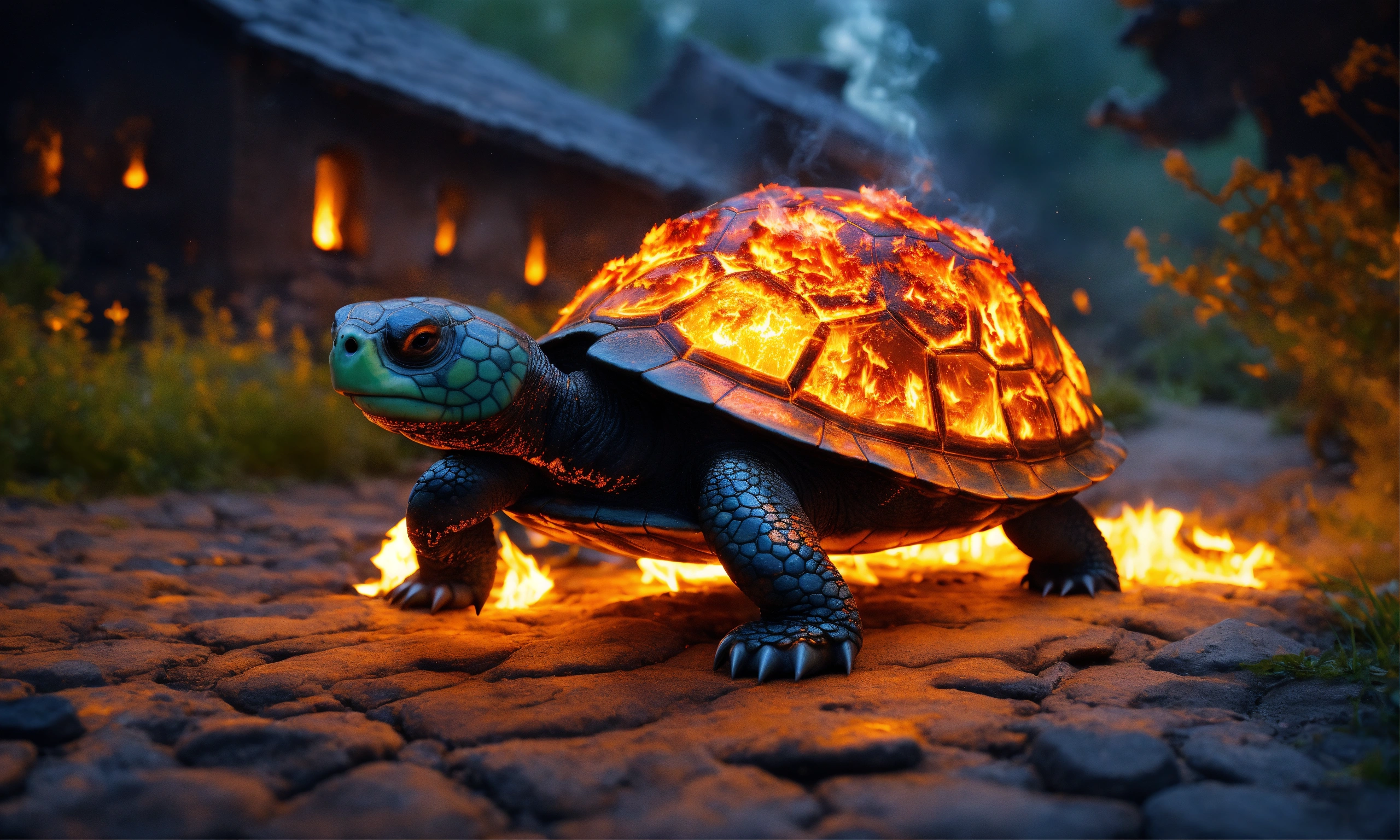 Fire elemental turtle, a turtle made entirely of flames and embers and lava, walking along a stone path in a medieval village leaving a trail of fire. it is night and the stars are visible. above all flames instead of smoke, bubbles made from molten glass float