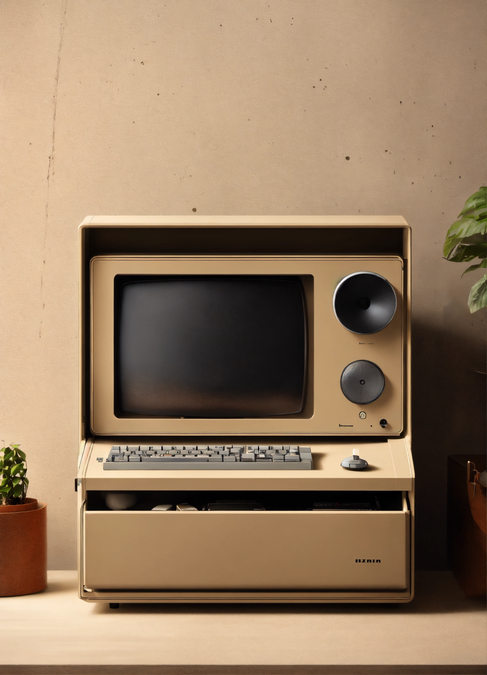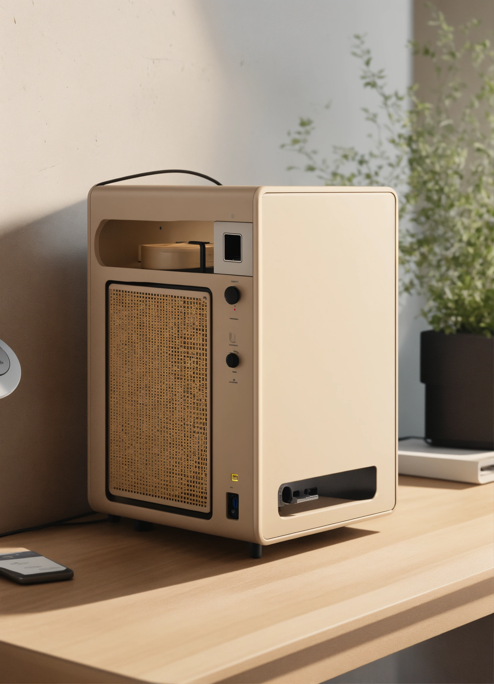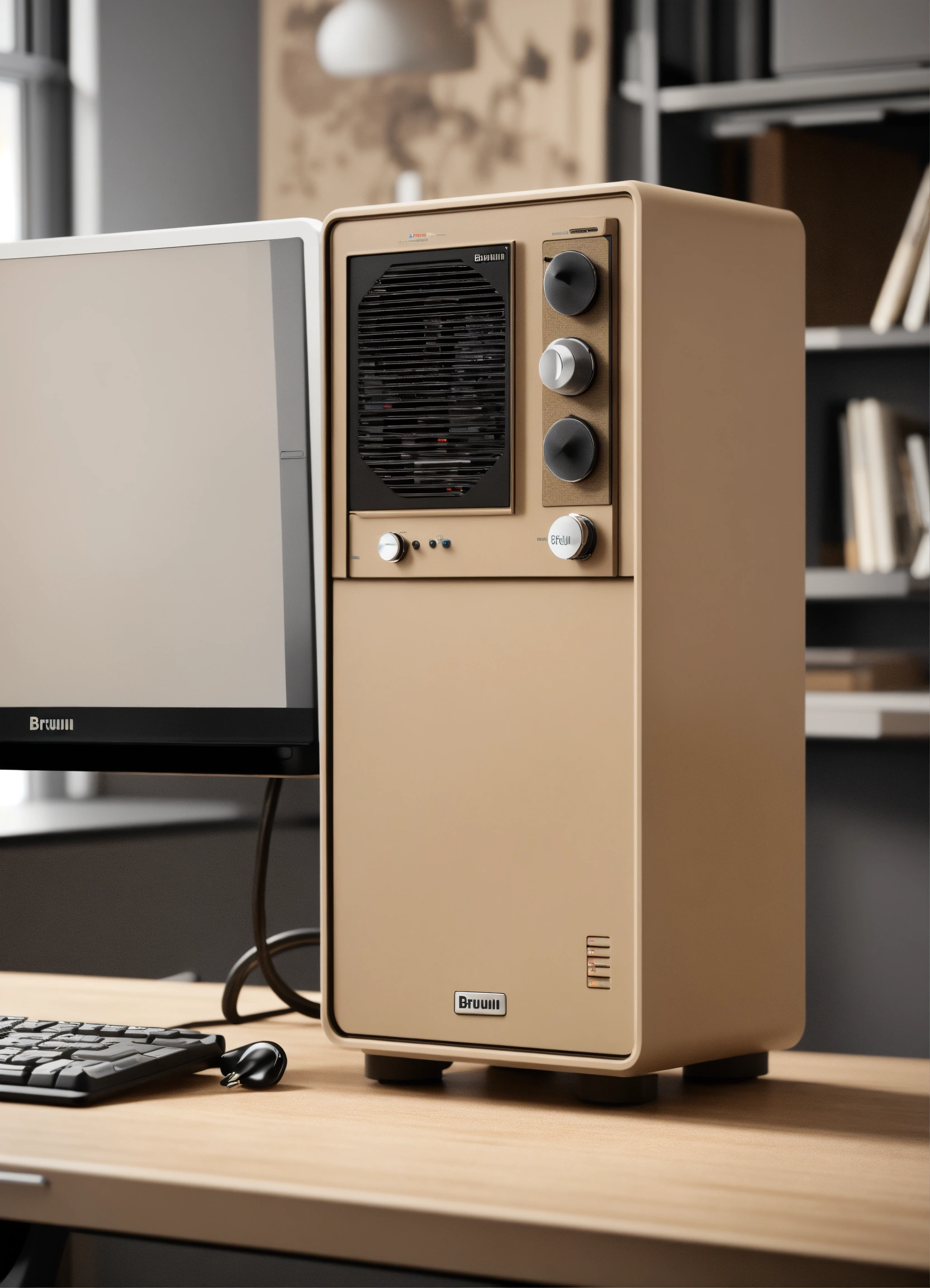 A stunning beige pc case designed by dieter rams, braun. product ad retro. industrial design inspiration. unreal engine render, natural lighting, on desk