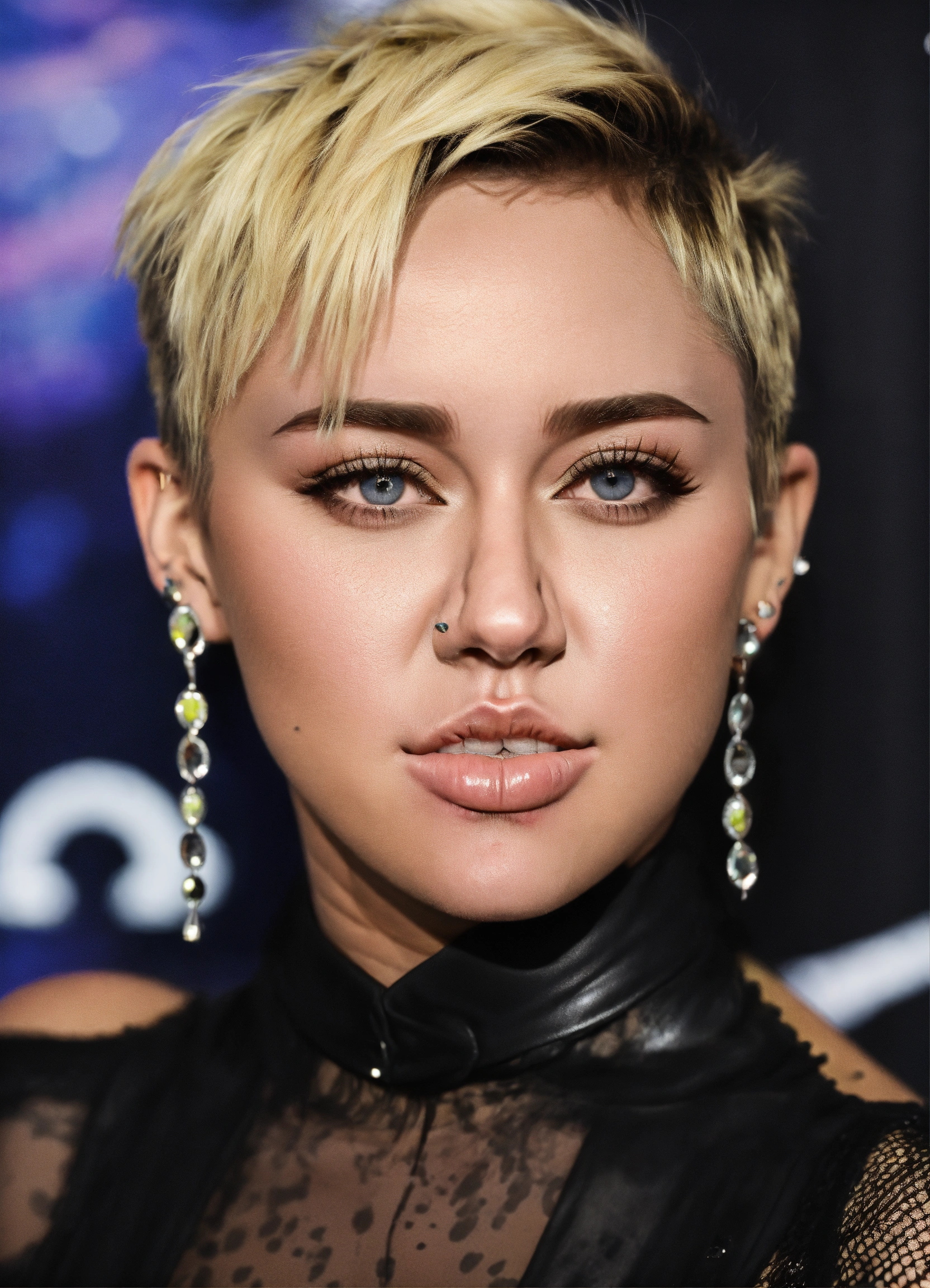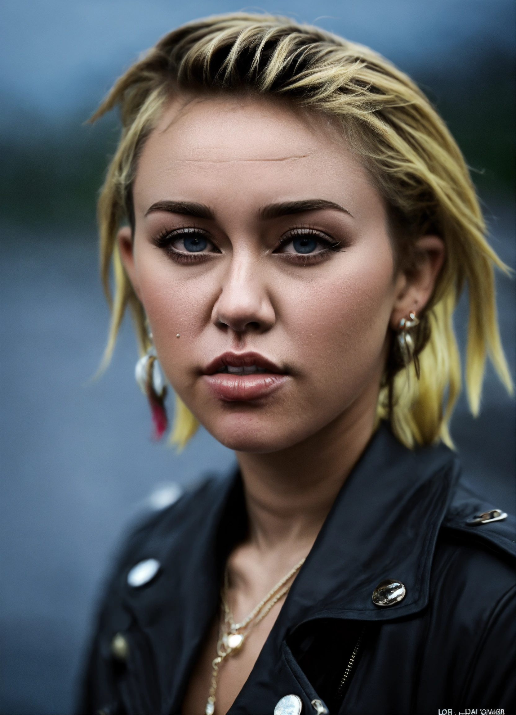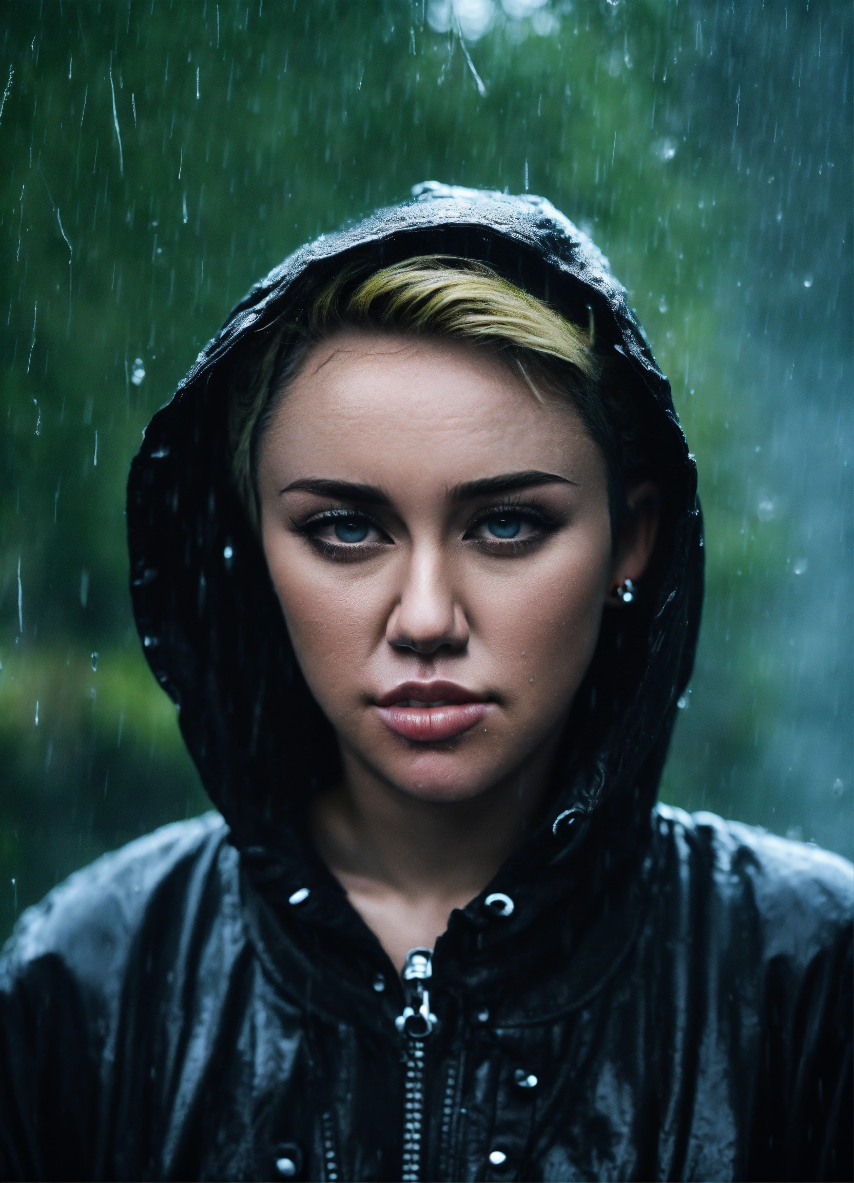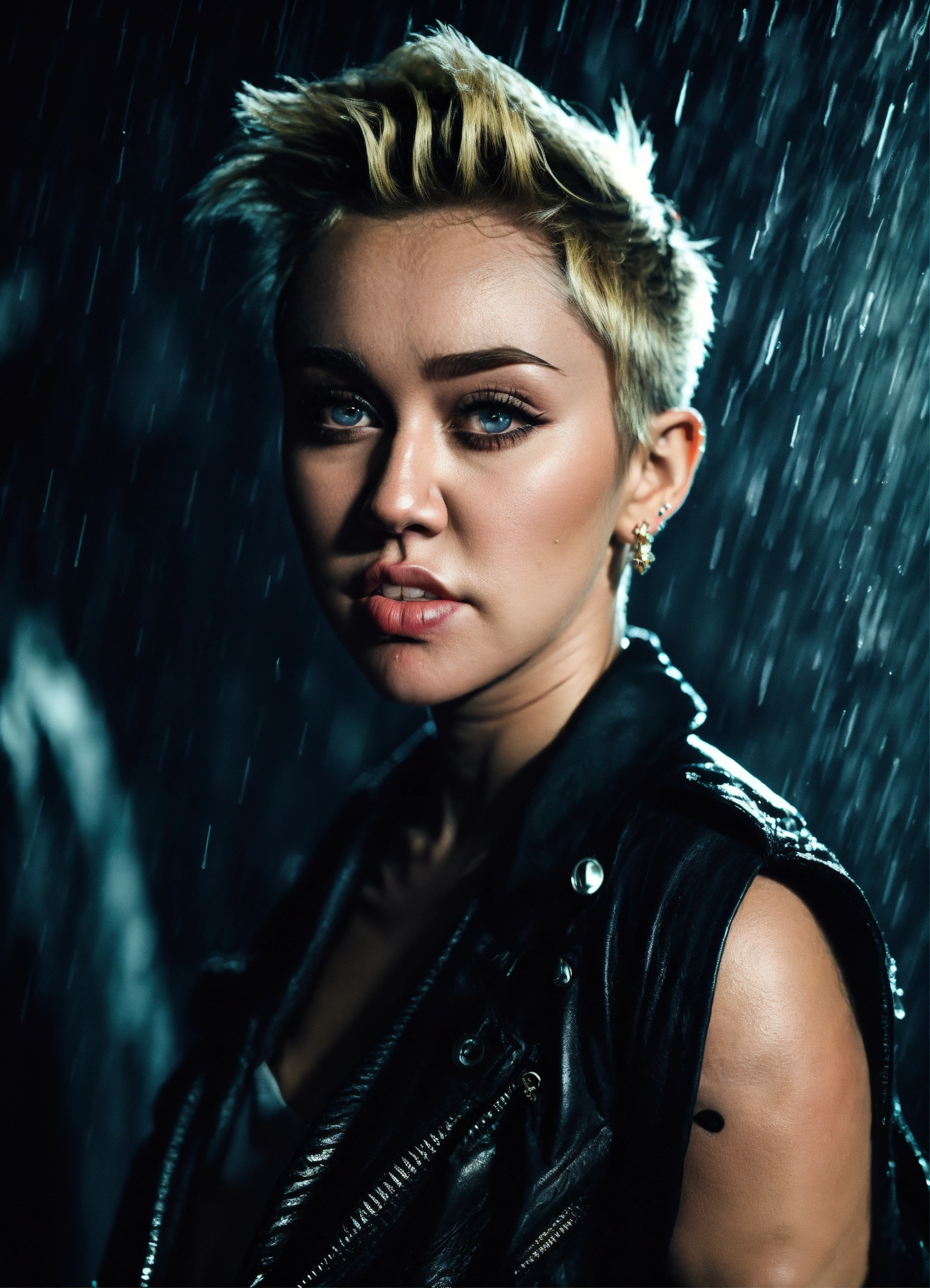 La inquietante miley cyrus con ojos negros en su hombro se encuentra en un oscuro lago, niebla, lluvia