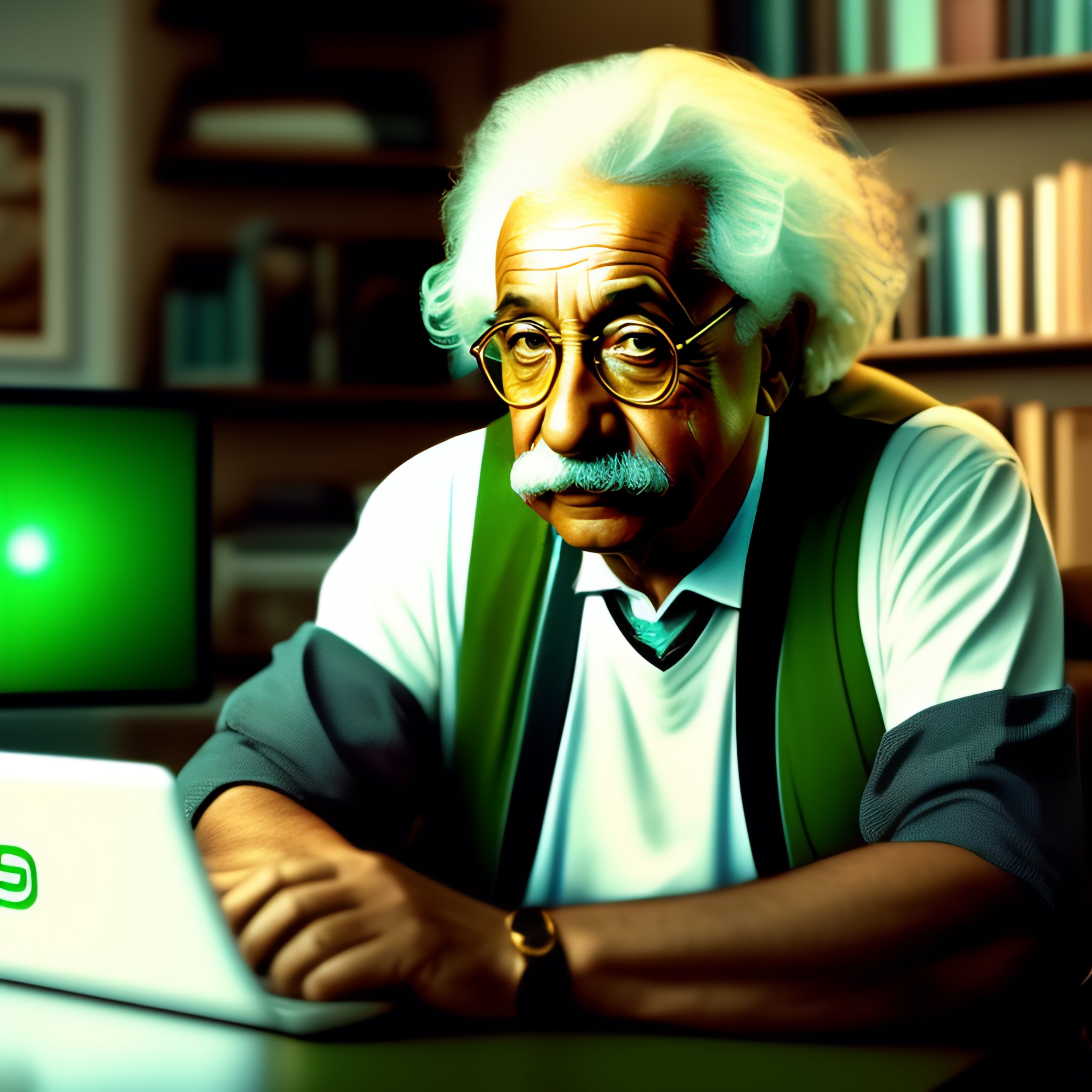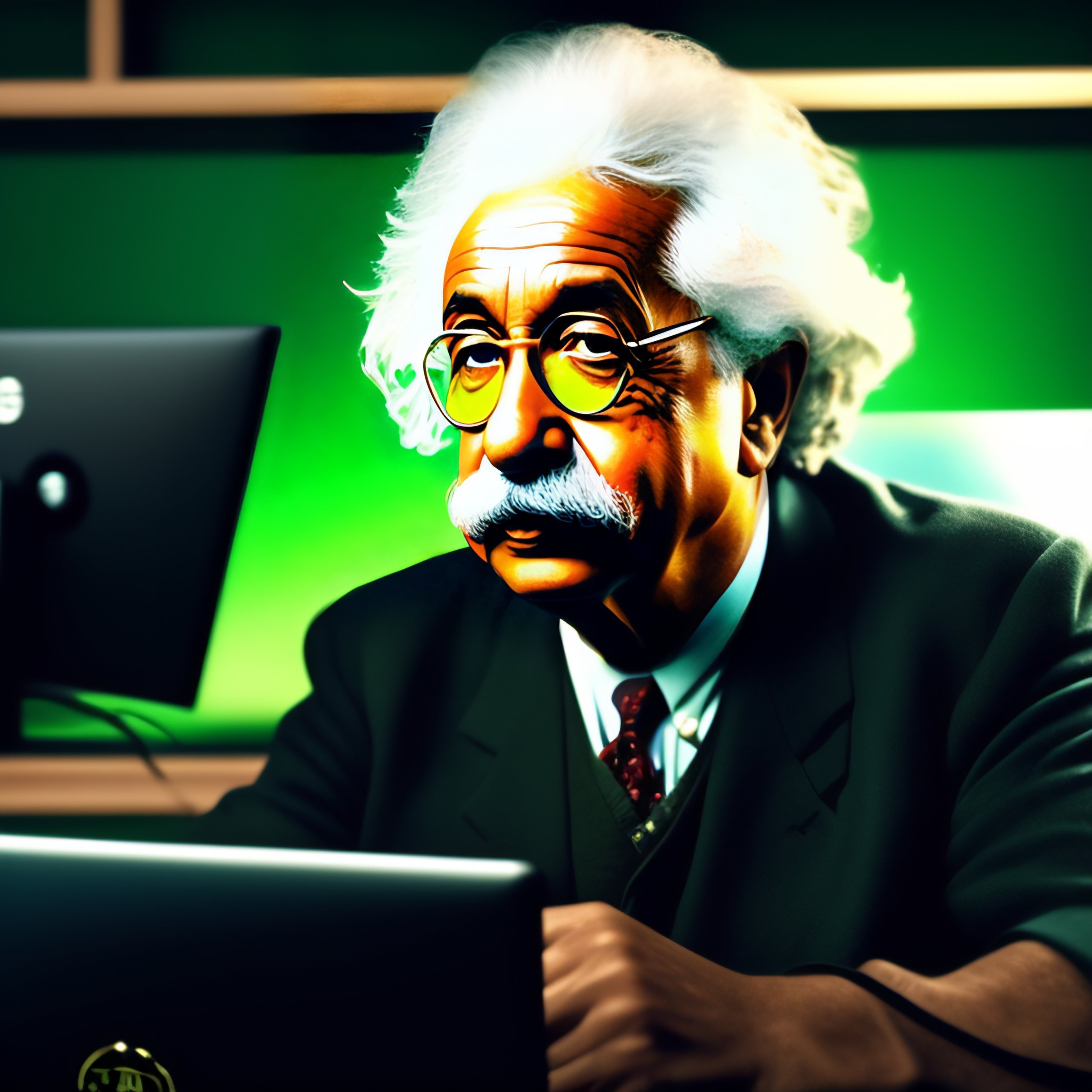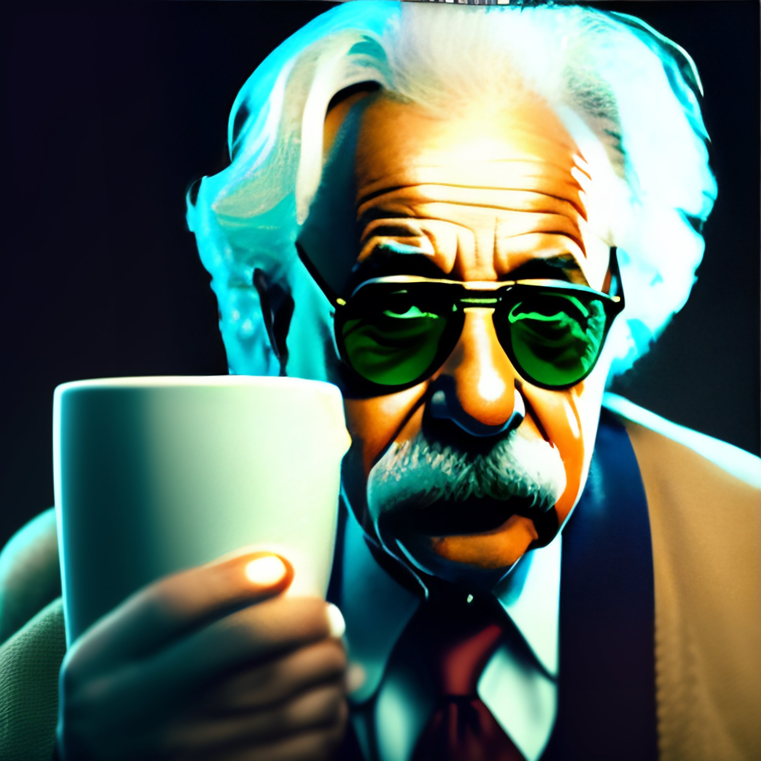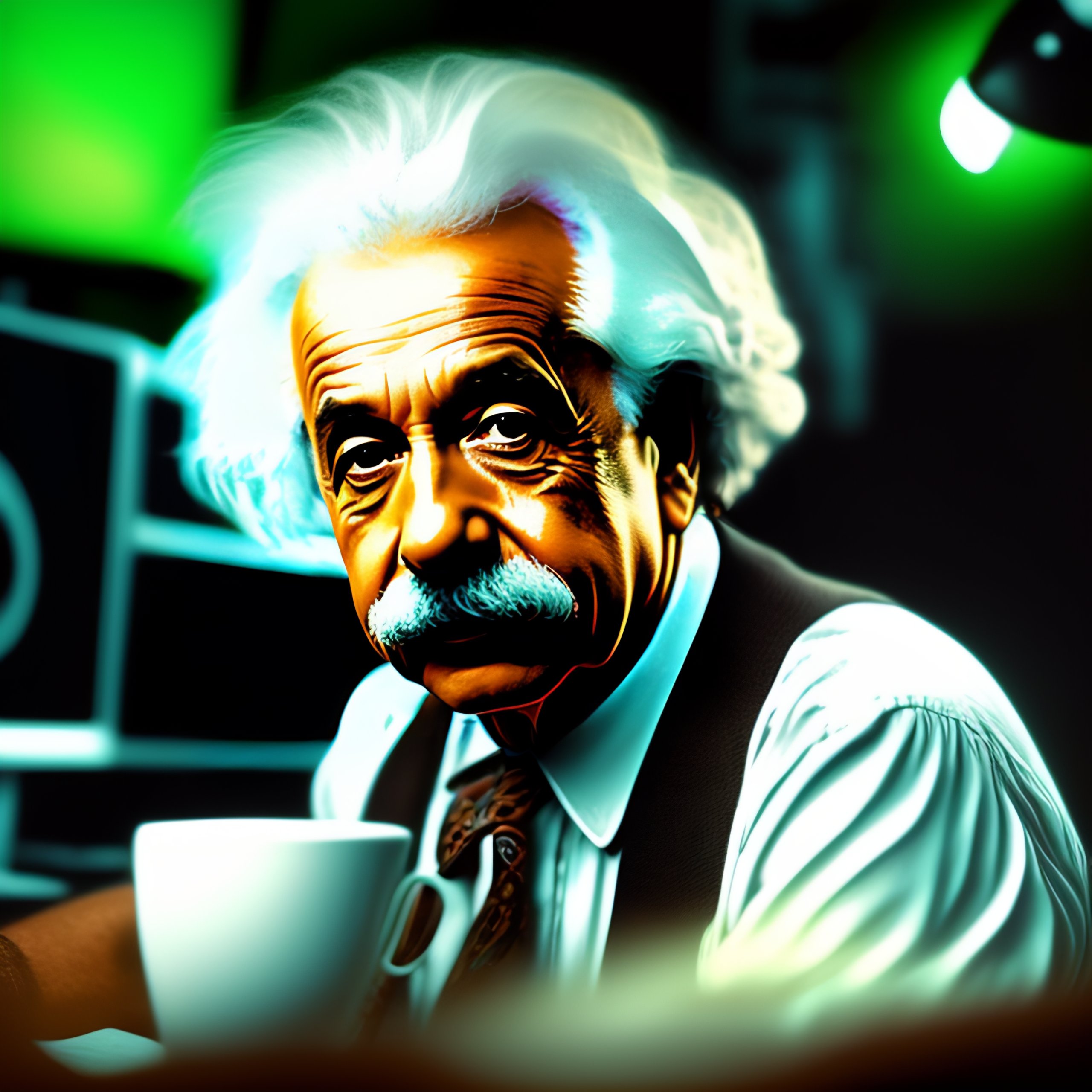 Albert einstein is sitting down in front of his gamer pc, drinking coffee and looking back at the camera. he's wearing t-shirt, suspenders, and sunglasses, and on his screen is 100% green