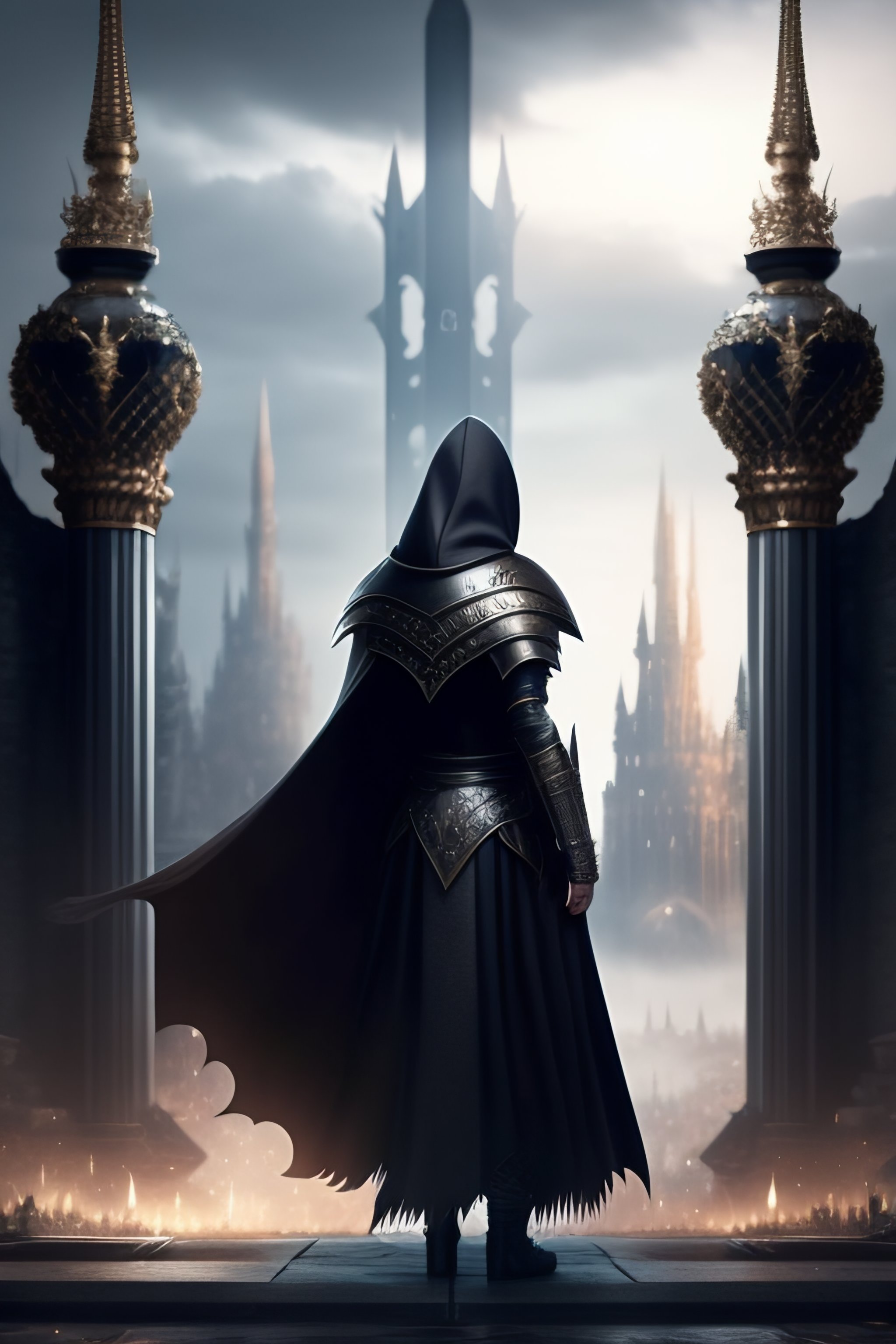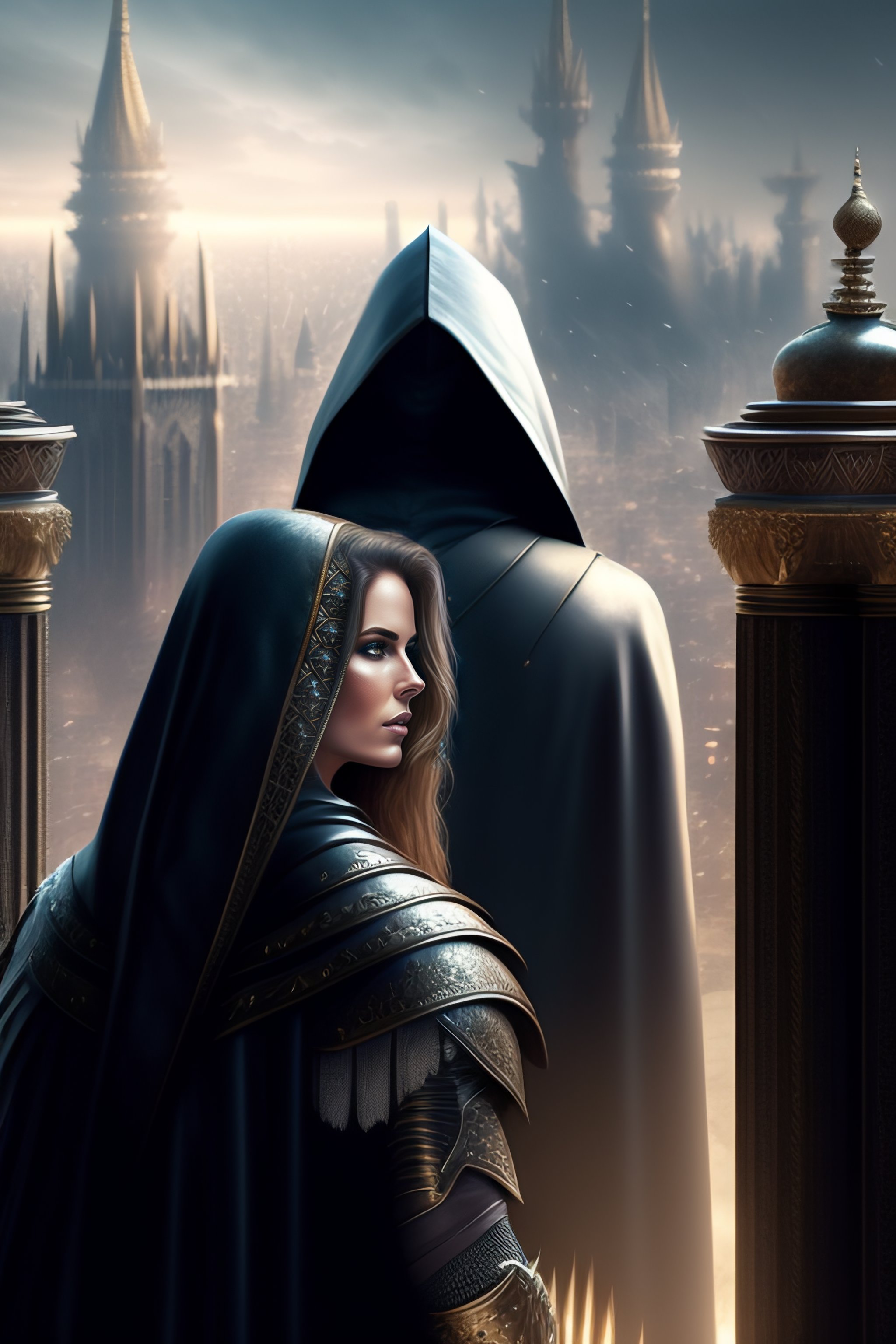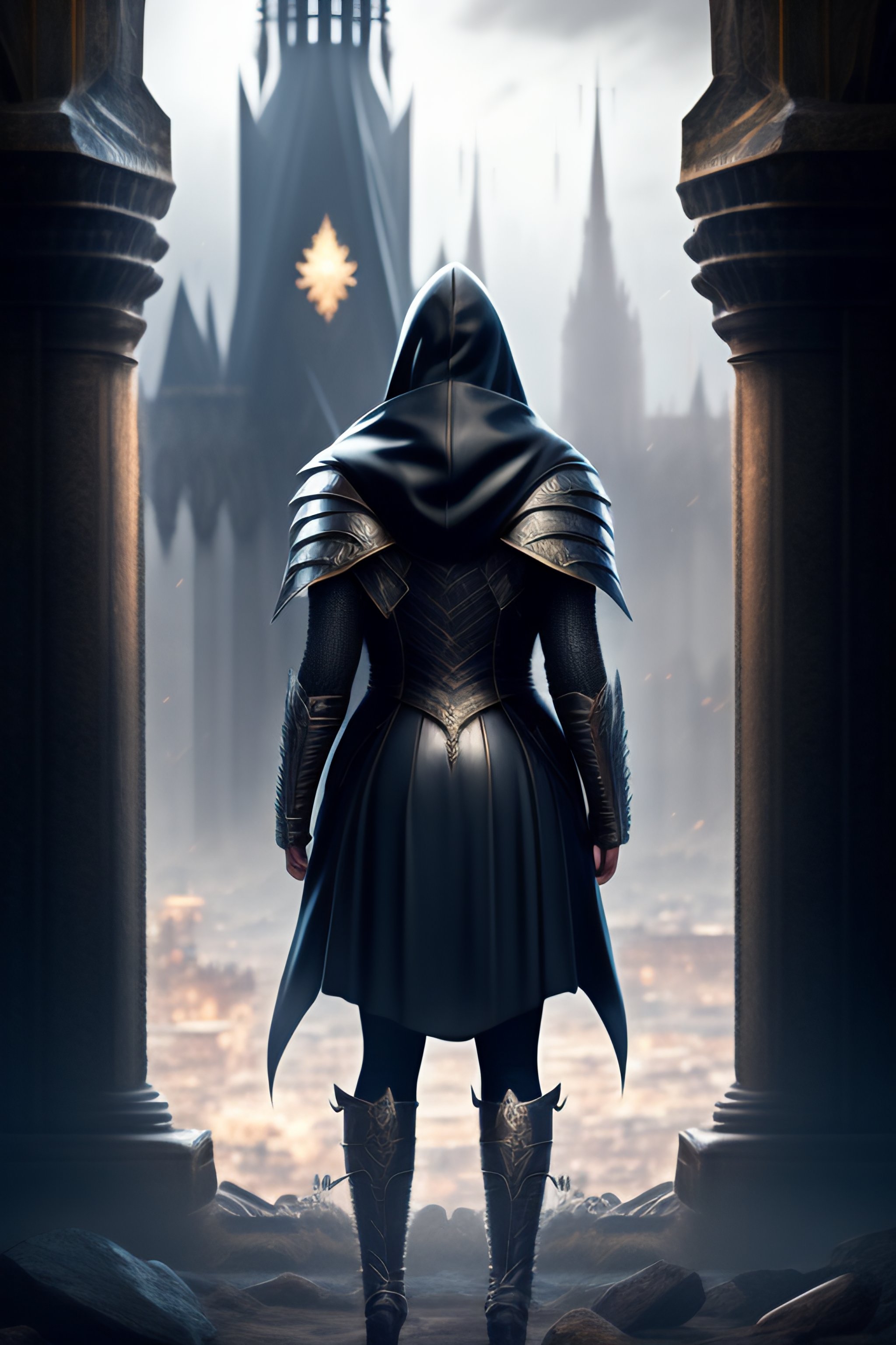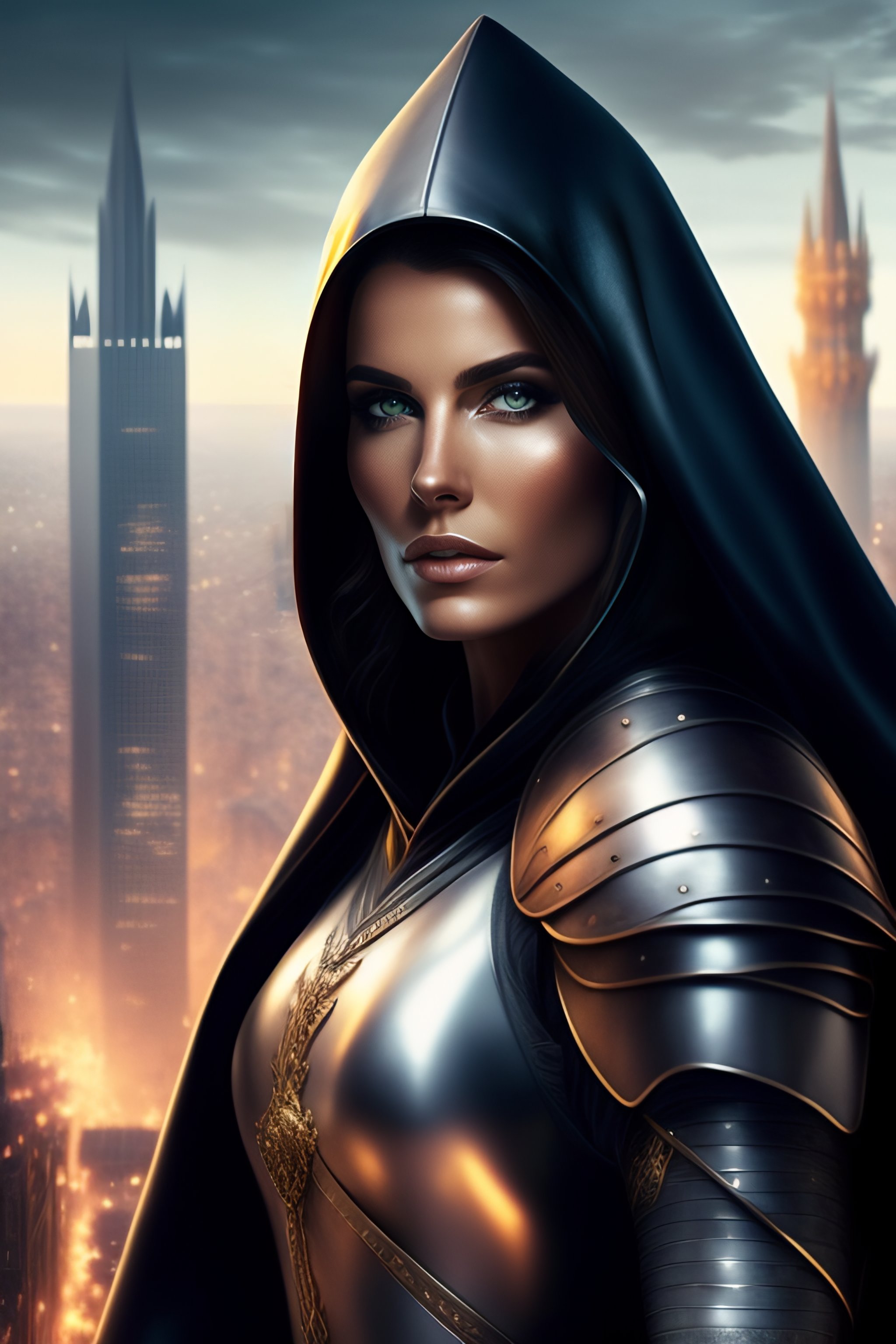 White female warrior brunette hair with metal full body armour and a hooded cloak, overlooking a gothic massive city