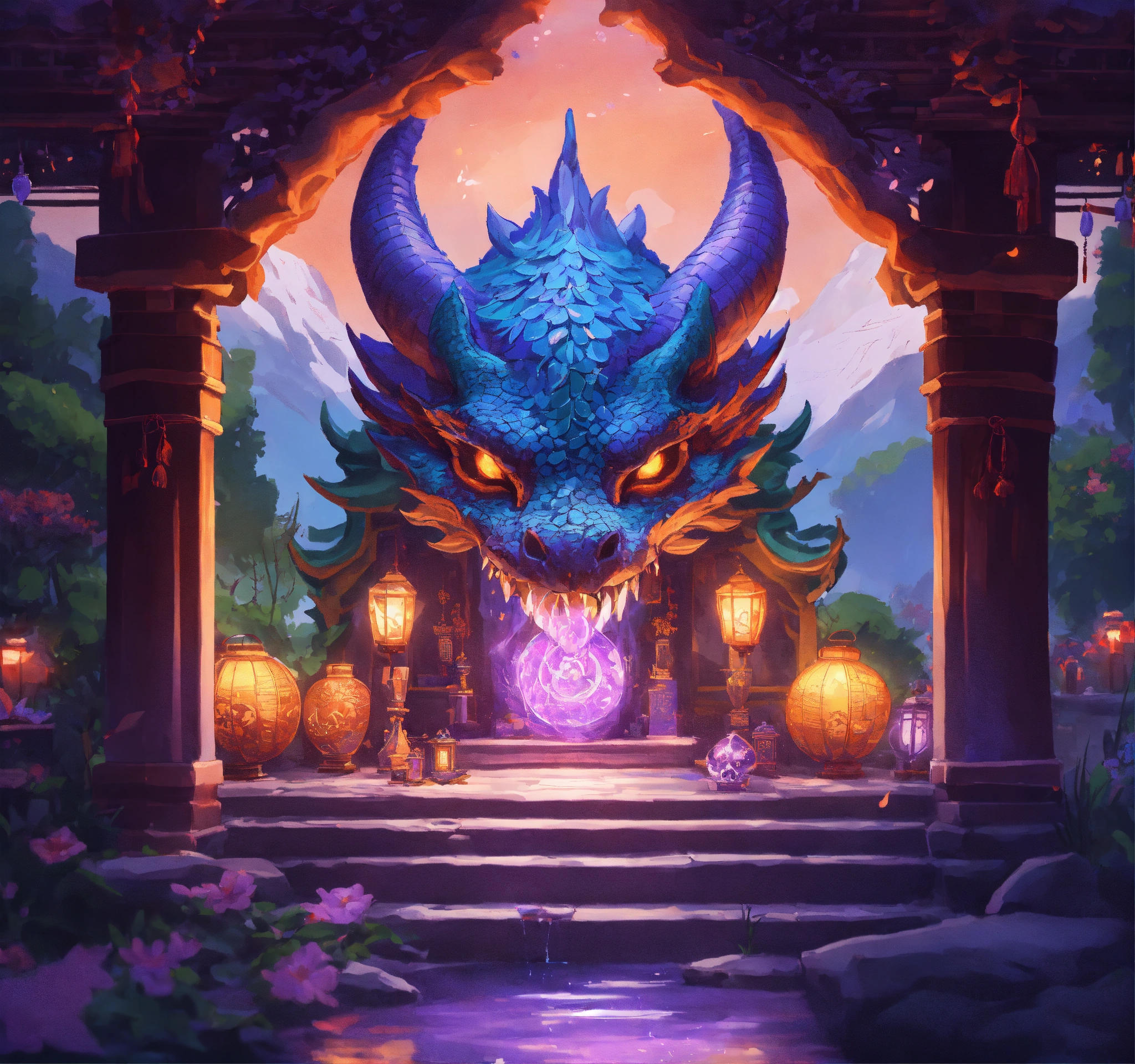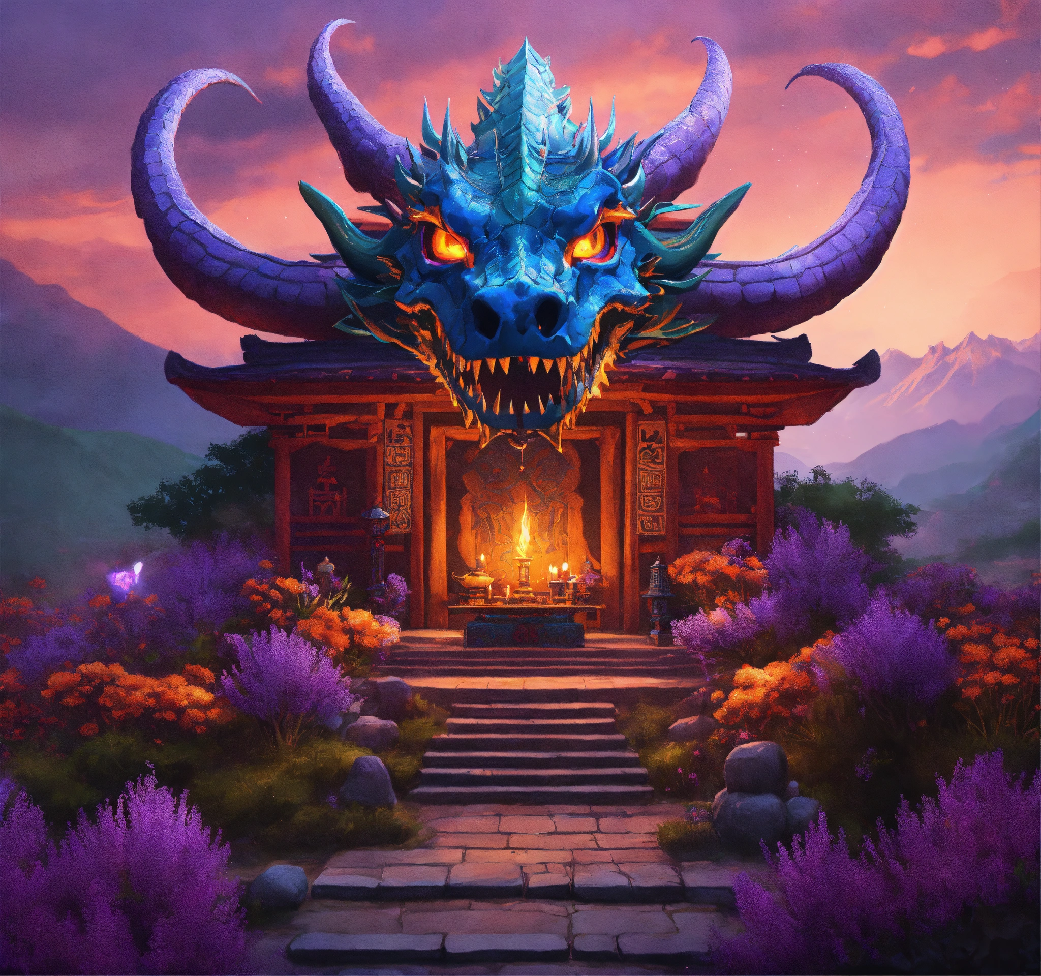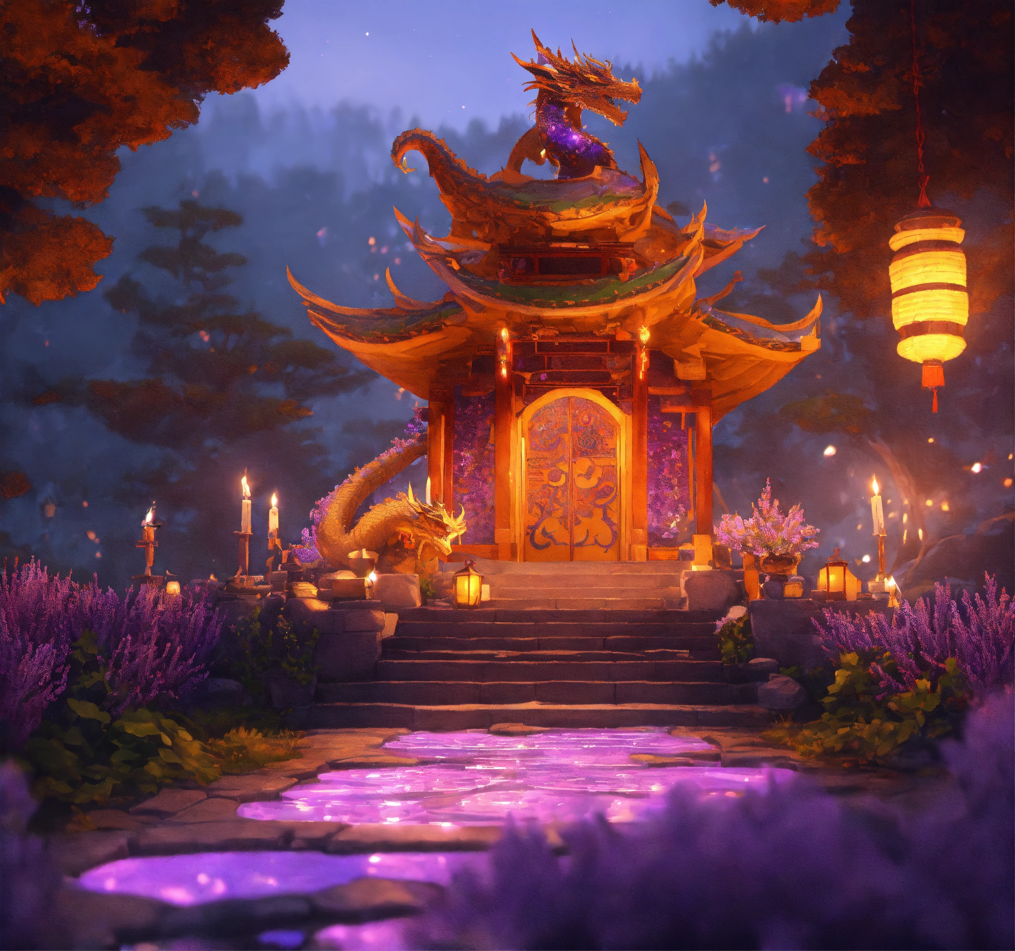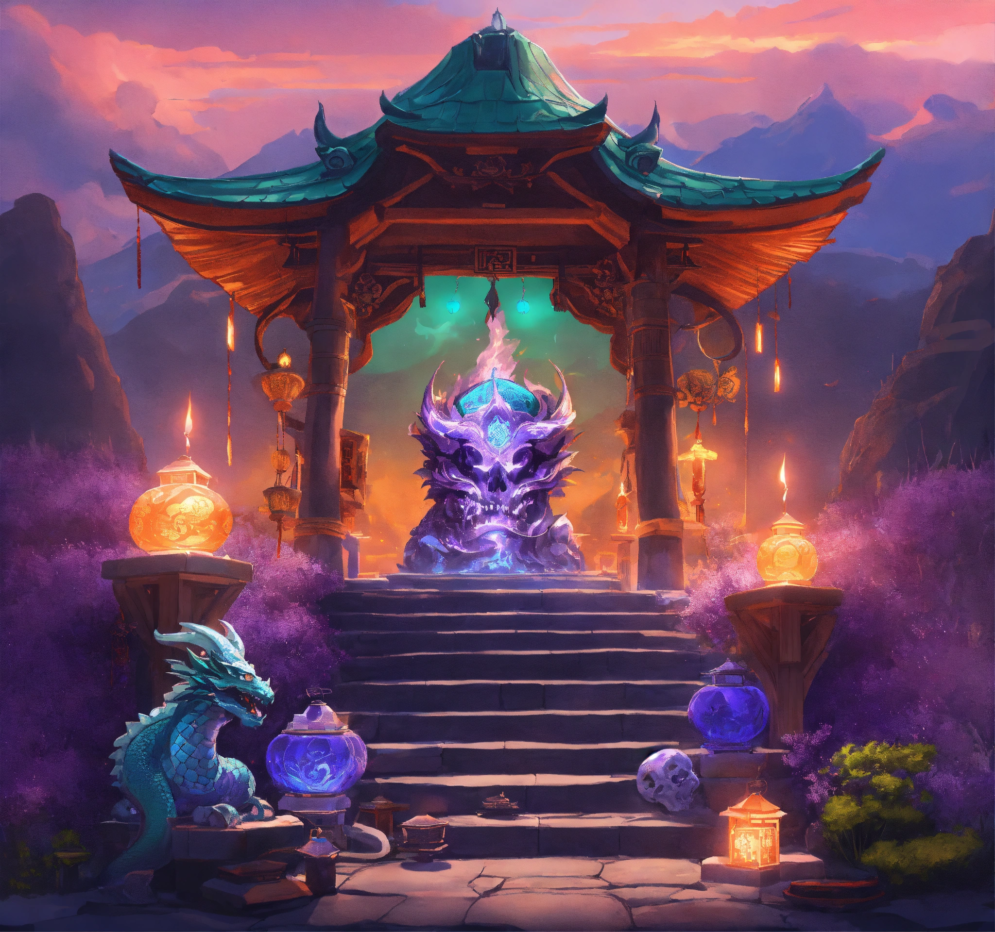 A shrine worshipping a giant dragon skull, shrine placed on the center of the image, you can see various round shaped jewels on the left front of dragon's skull, there's a glass cup with purple liquid emitting blue-ish purple smoke on the right front of dragon's skull, around the shrine you can see asian candle lanterns shining in green fire hanging and the lanterns have mythical floral shape designed on them, purple and orange colored lavender field, the road to the shrine is visible a little bit and it is of clear white tile with aether green and orange sparkling star art here and there, beside the road there are gentle stream of sky blue colored water, dragon skull must be within the shrine, dusk, realistic