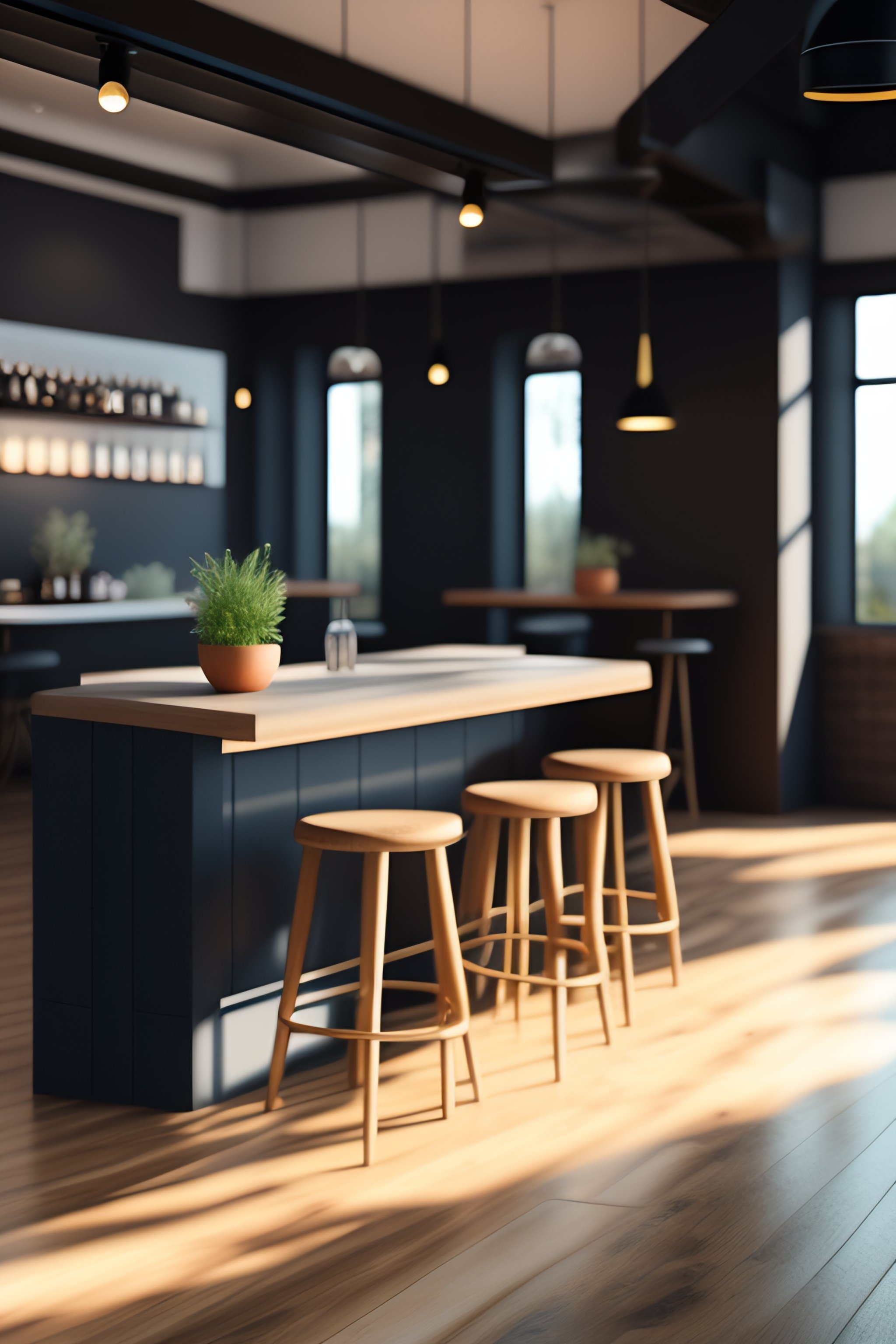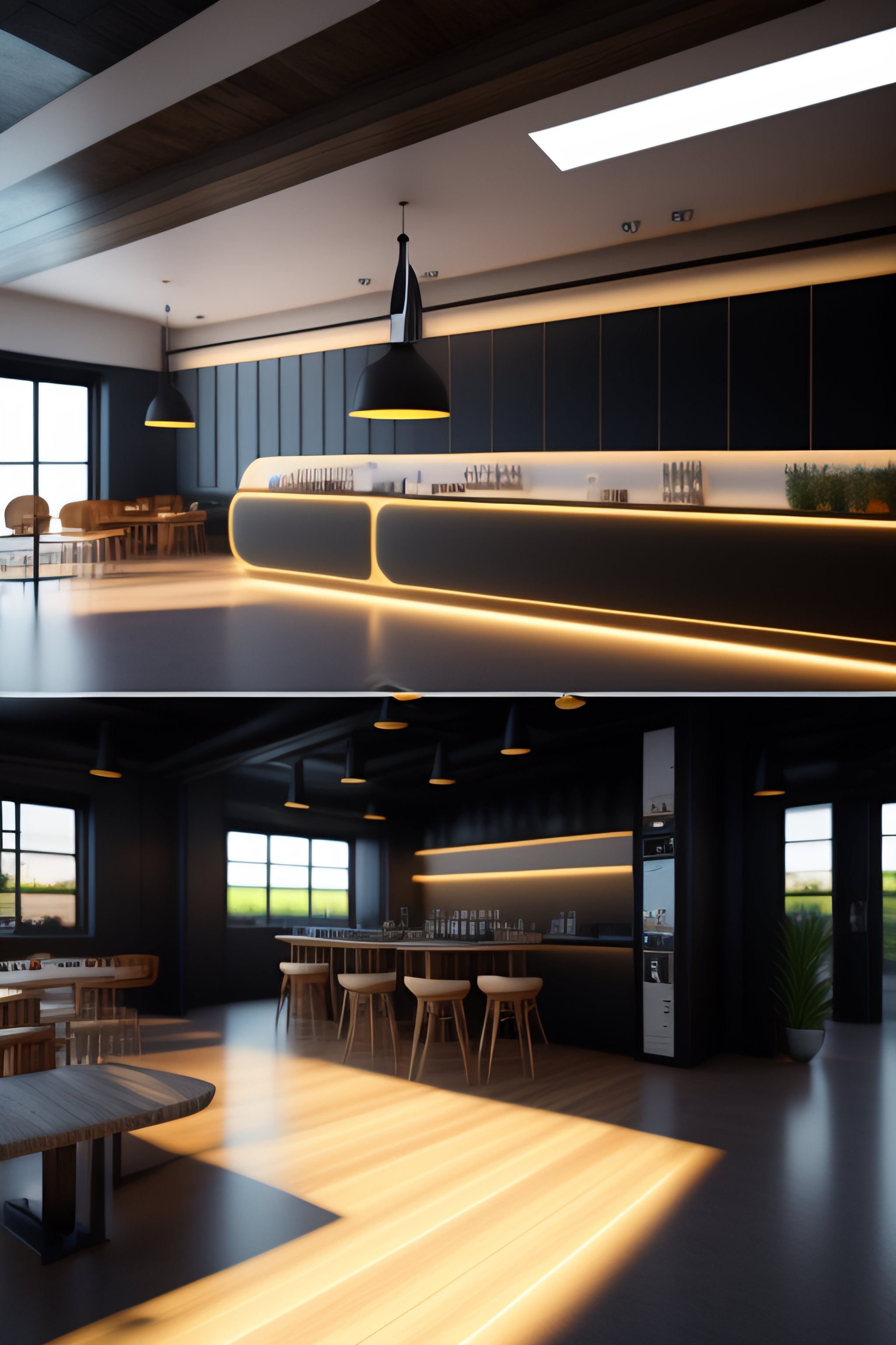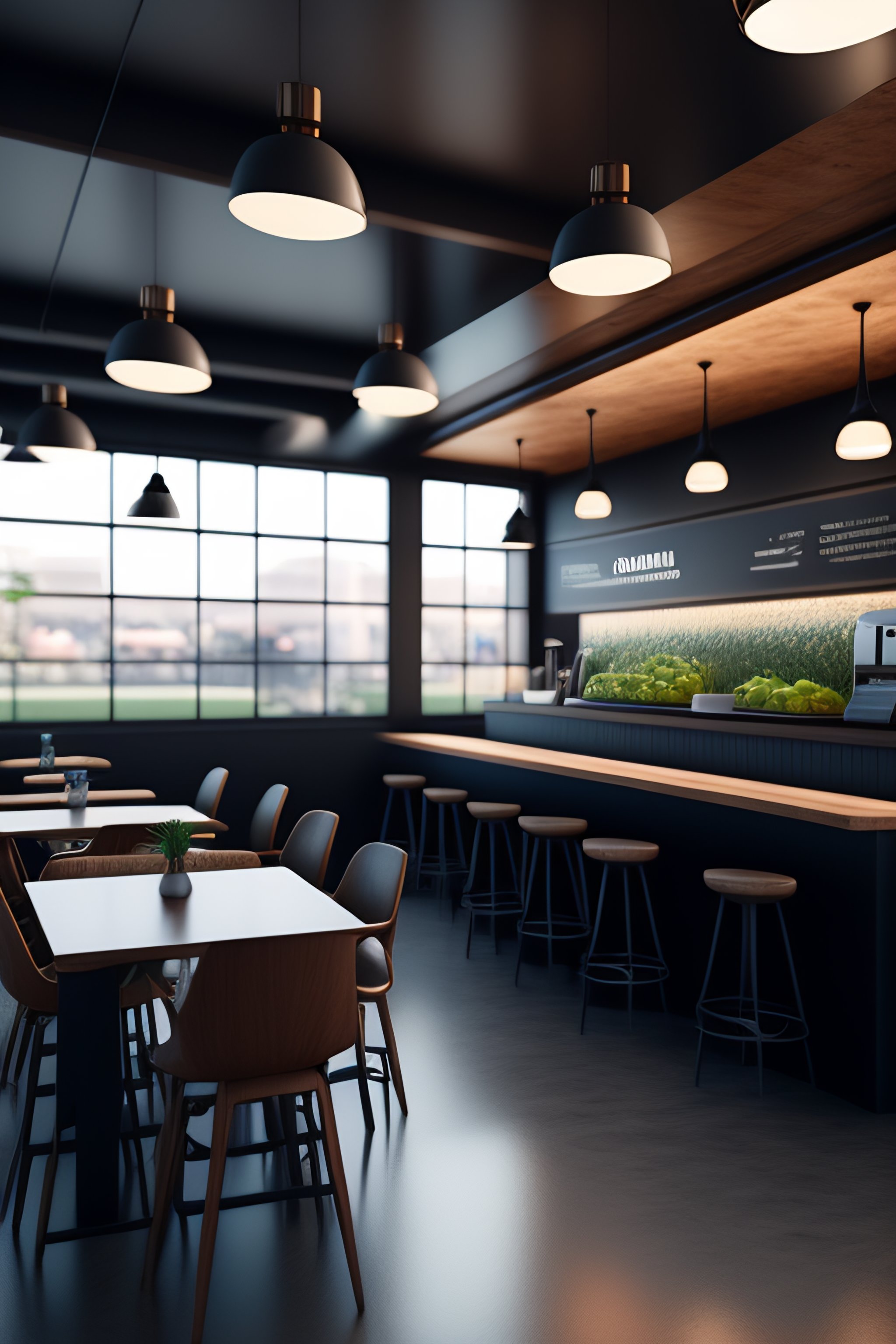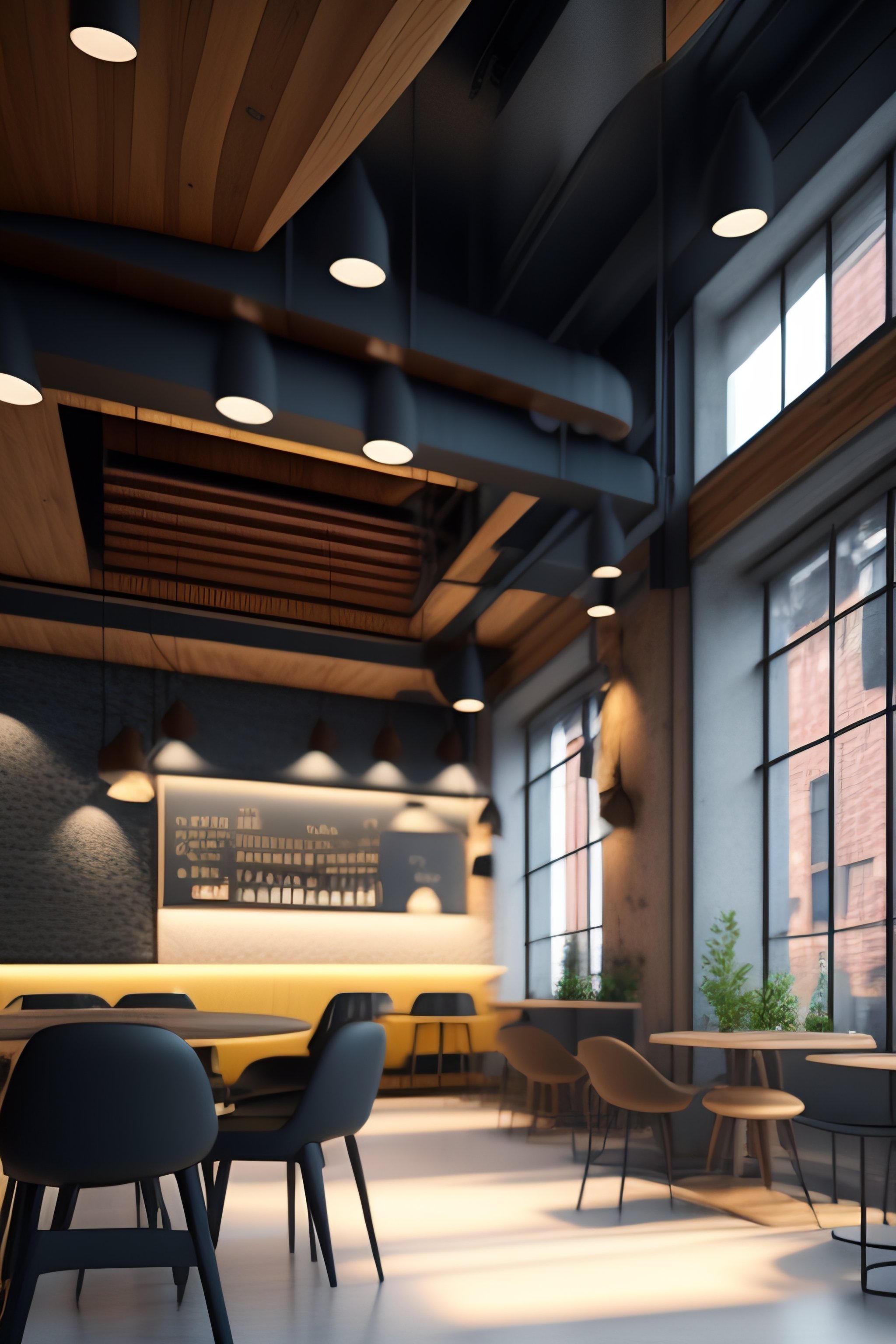 Cafe interior, industrial effect, ultra-realistic, octane render. modern design, low cost materials, area around 140m2, dimensions are 18 m x 9 m, show that celling will be concrete