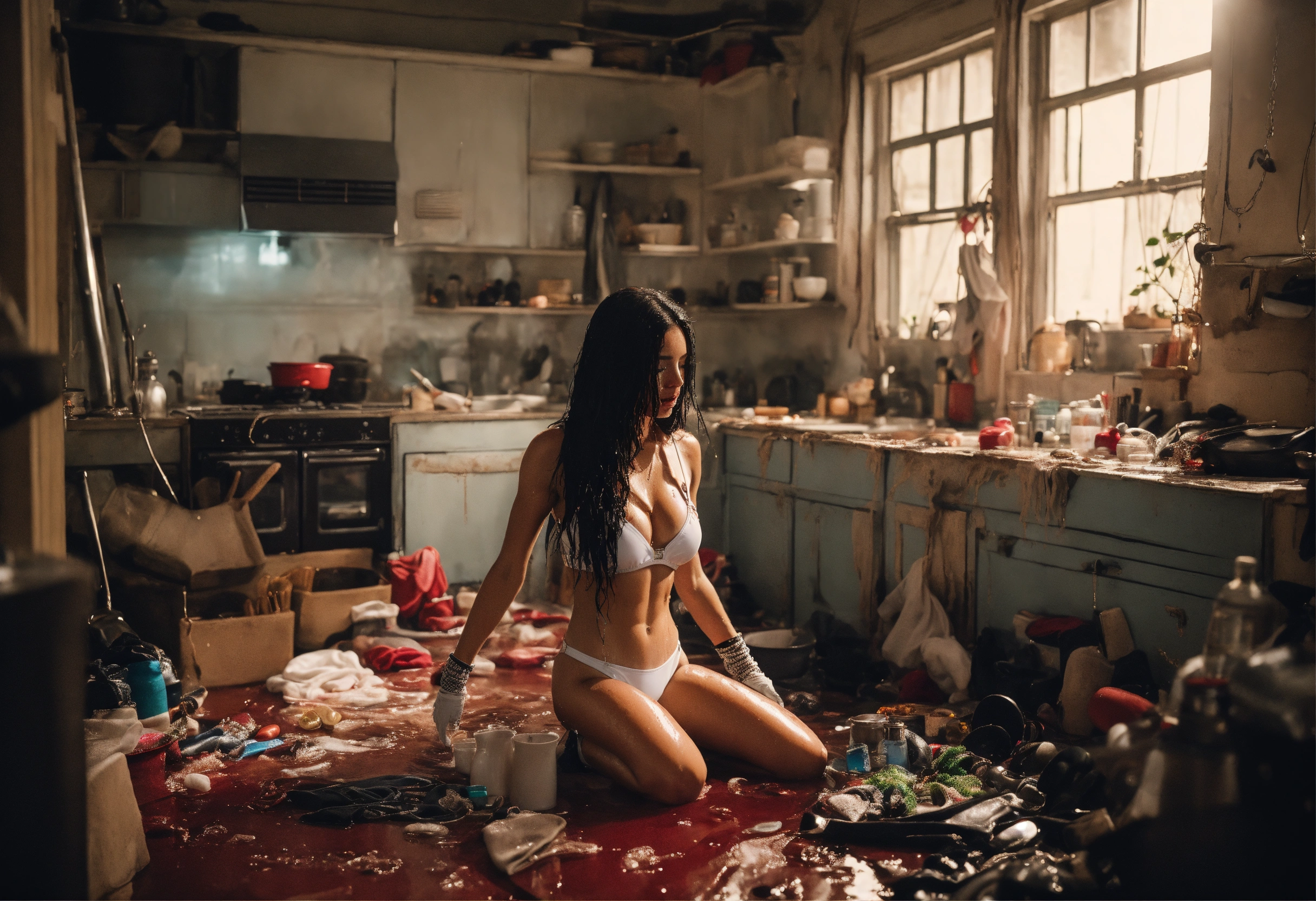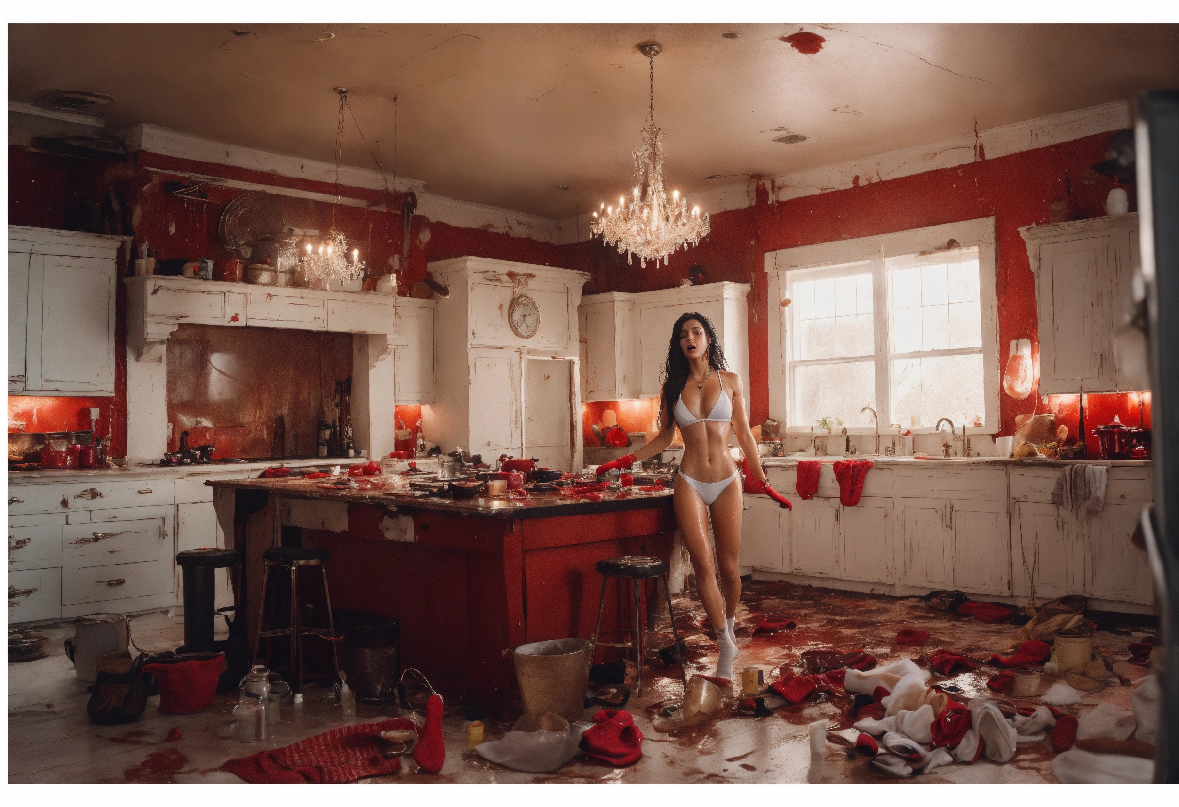 Top down camera angle, run down house, kitchen, full body, flying, lots of jewelry, white swimwear, shiny skin, wet messy long hair, bawling, very many straps, harnesses, crying, distressed, many gorgeous young women in the background, handcuffed, red water everywhere, long socks, black hair, three white women, pale skin, fitness influencer, highly detailed, dramatic shoot, sharp focus, 4k uhd, cinematic lighting, cut, scratched, messy makeup, white board, long white gloves