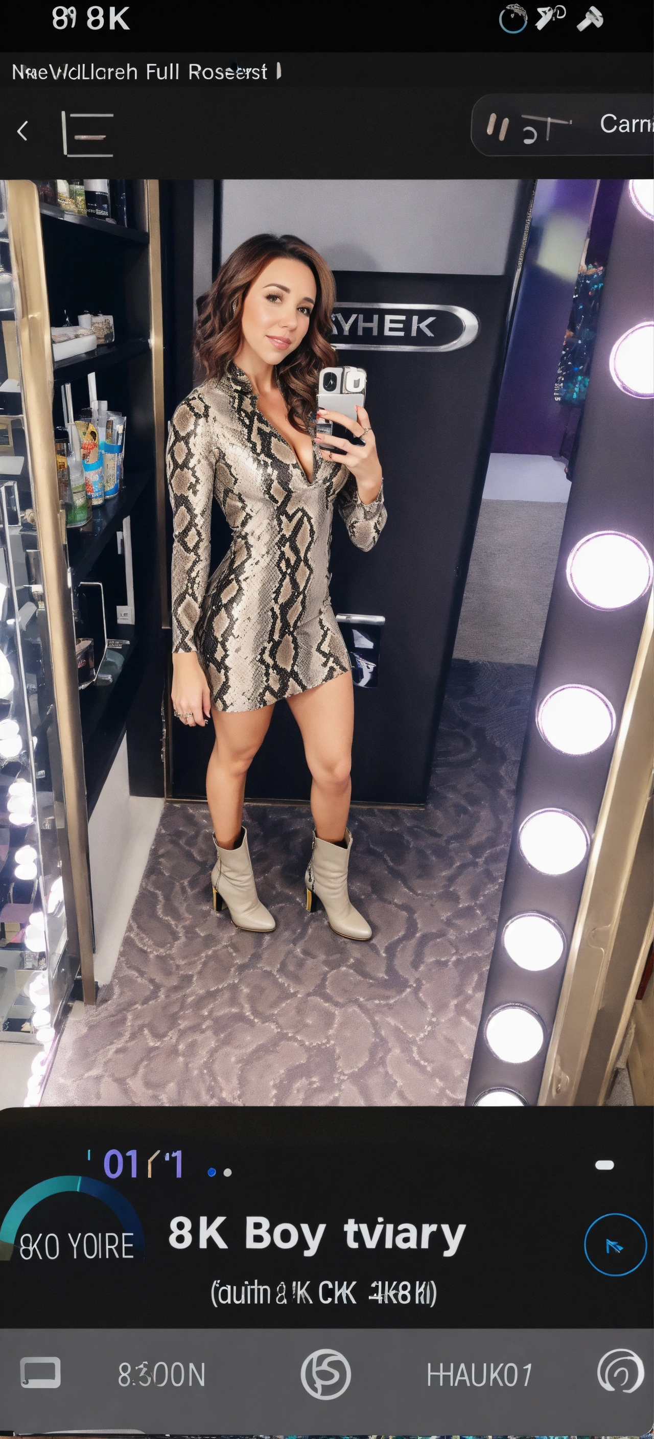 Full body 8k lacey chabert wearing a tight snake skin print dress, taking a selfie, top view picture, boots, taking a selfie, feeling herself