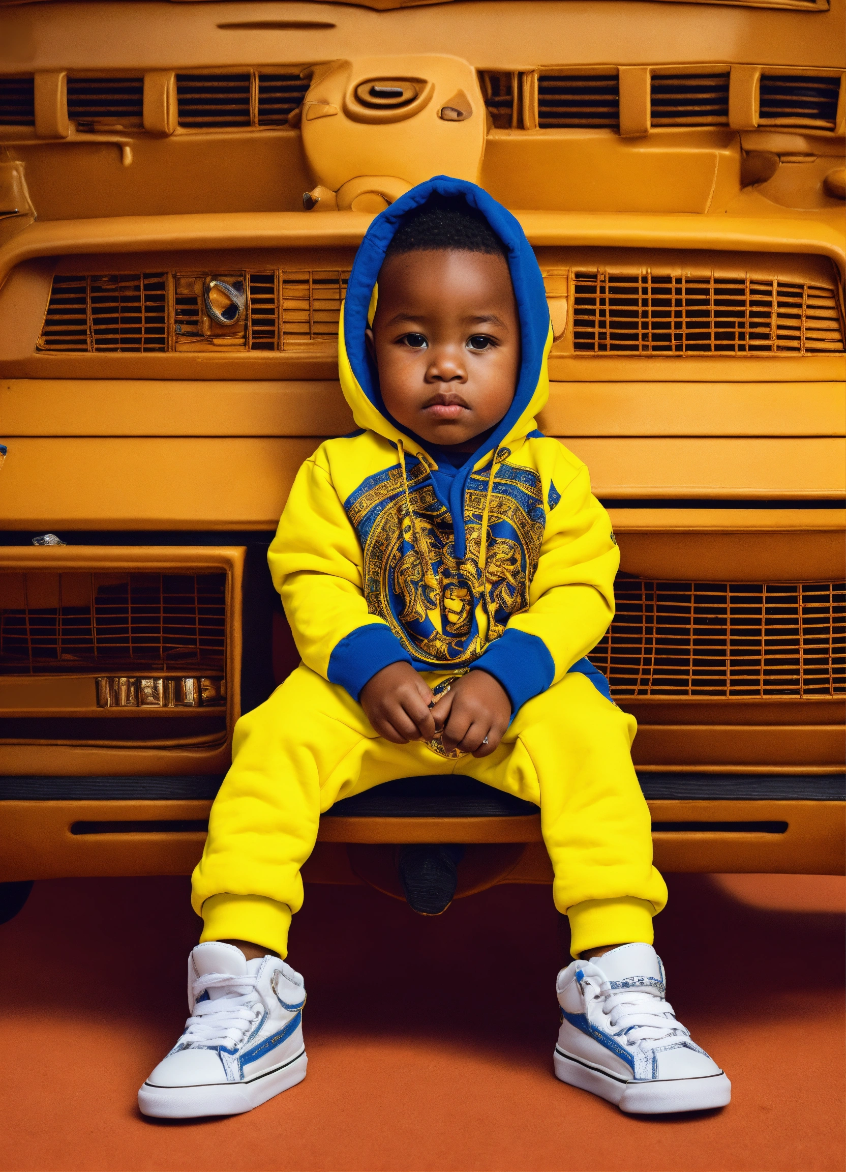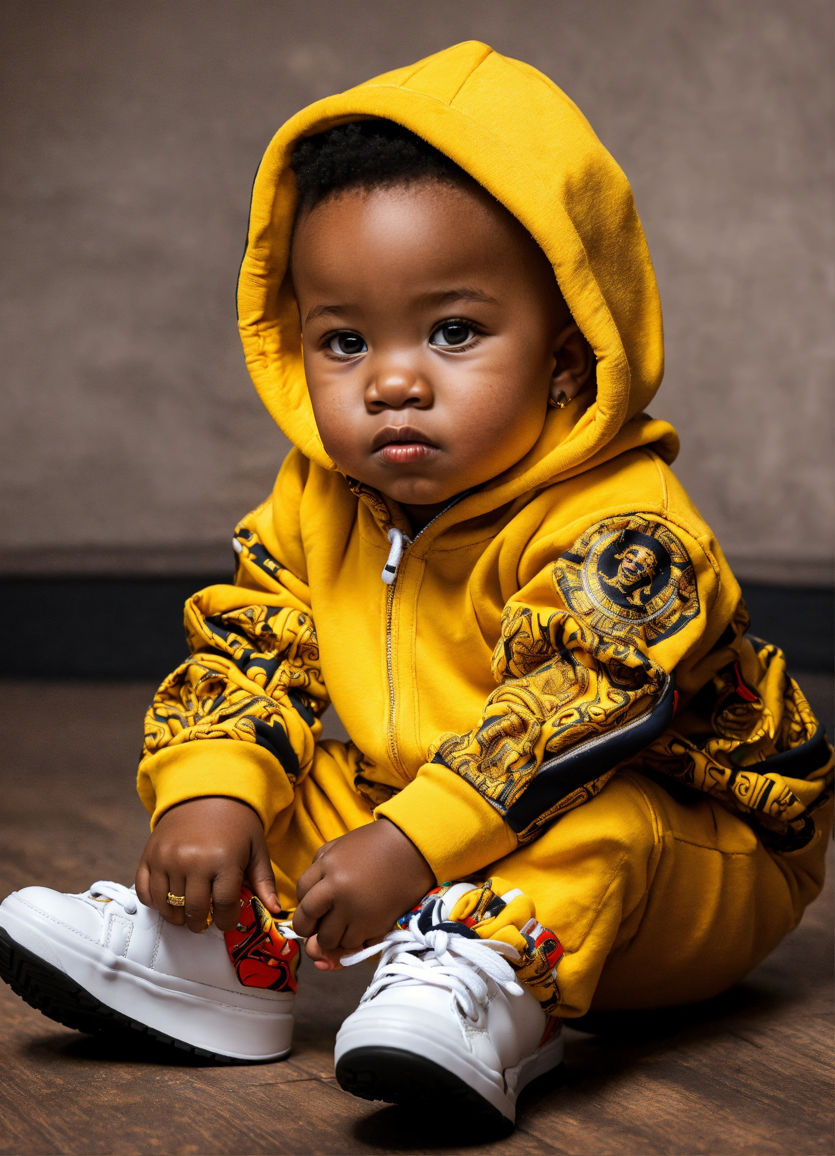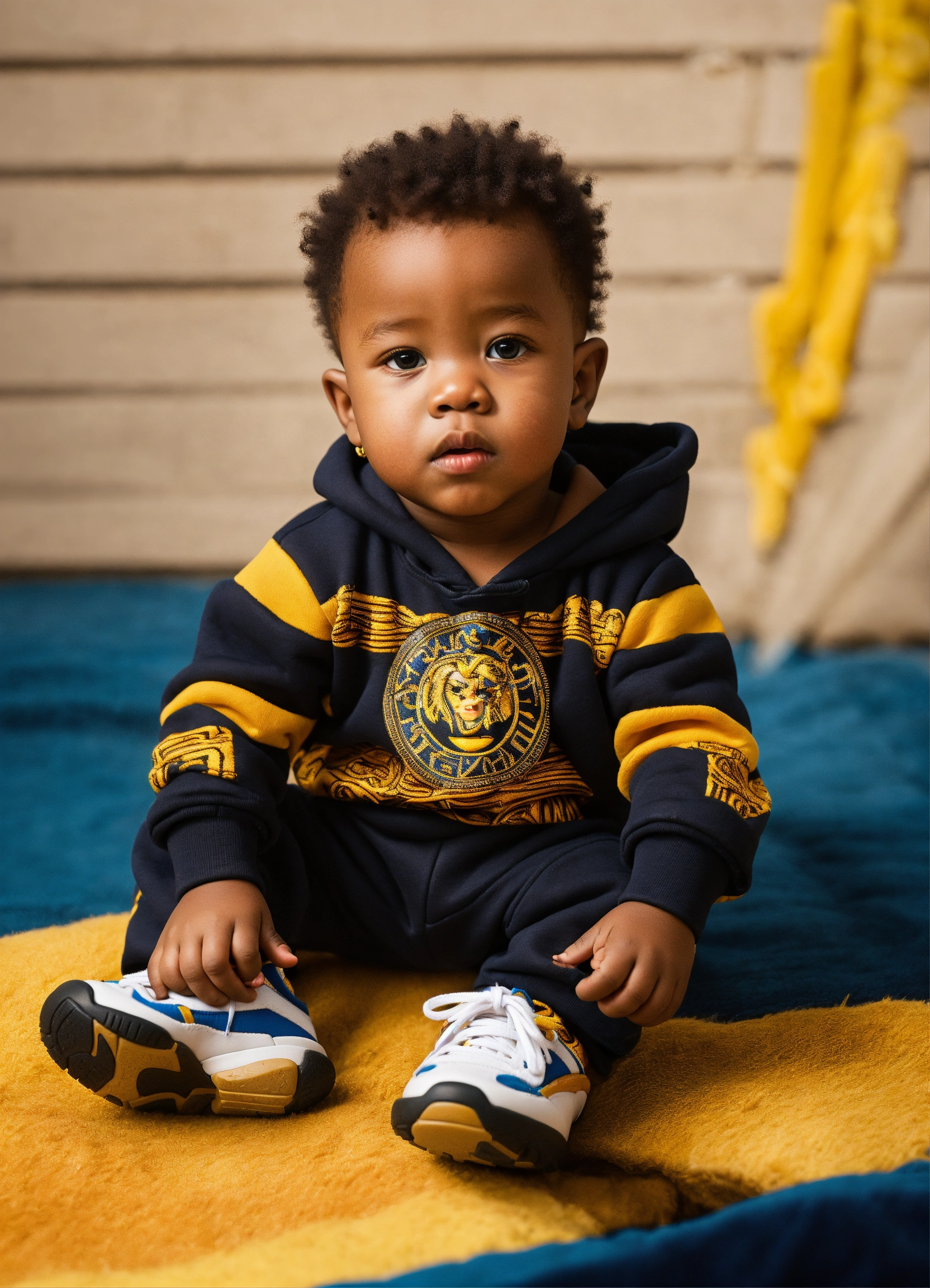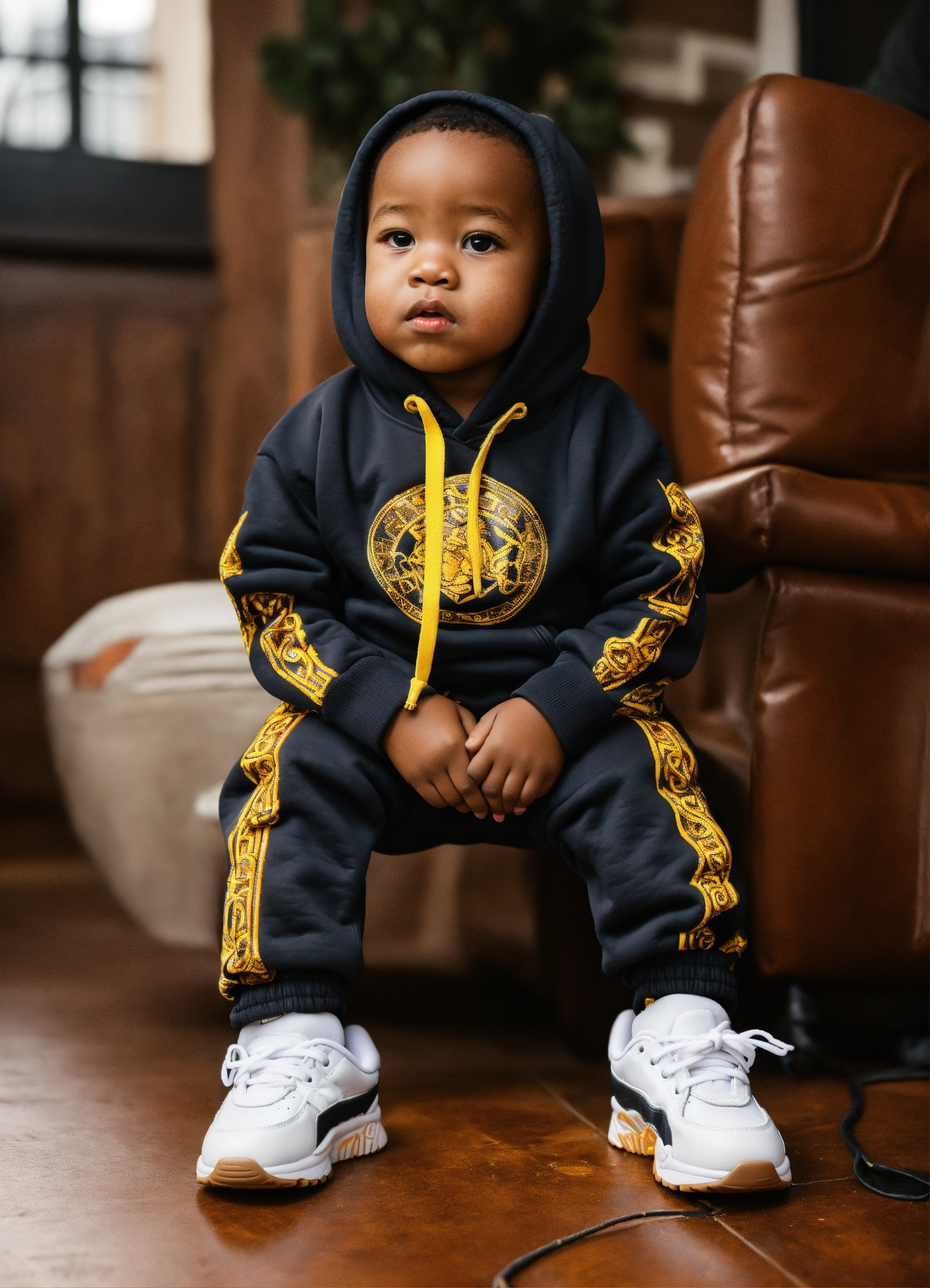 A handsome african american toddler sitting, full body, wearing a versace hoodie and track pants with sneakers on his feet --v 5.0