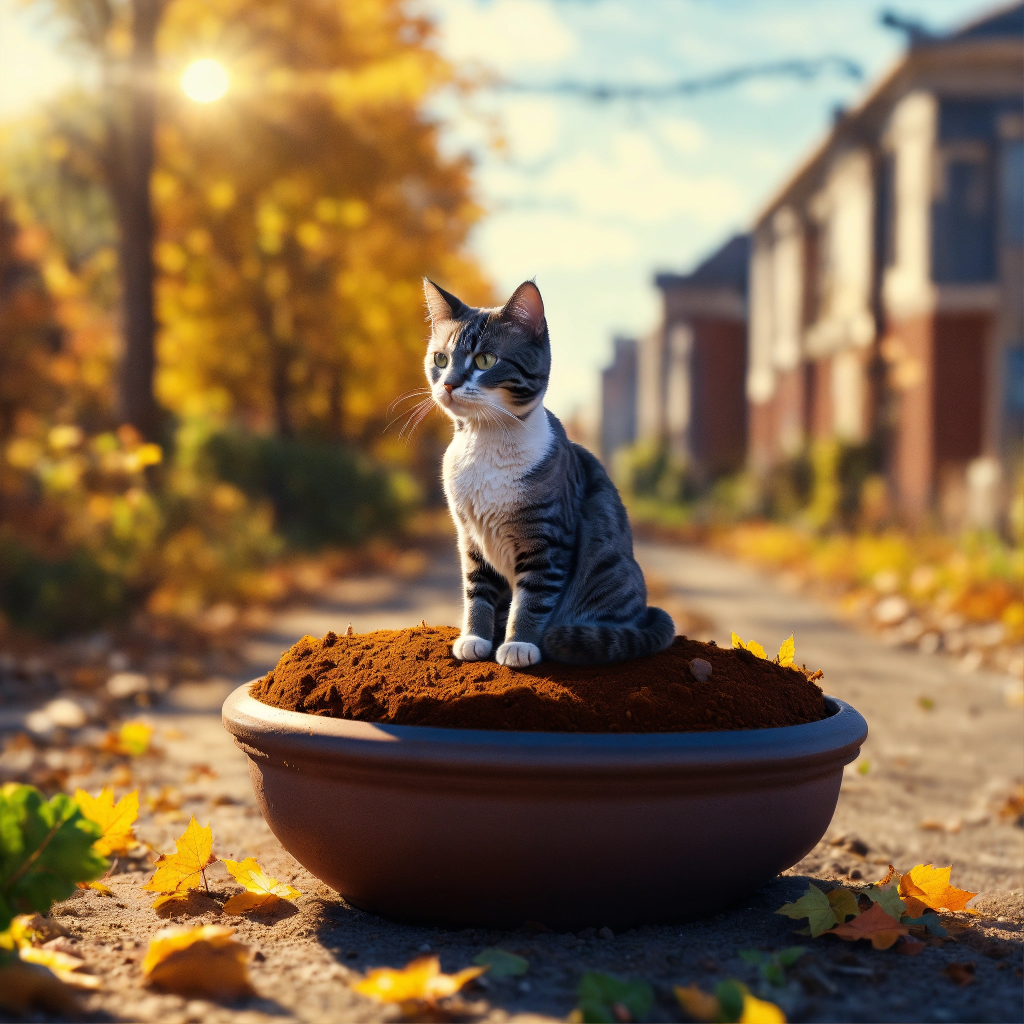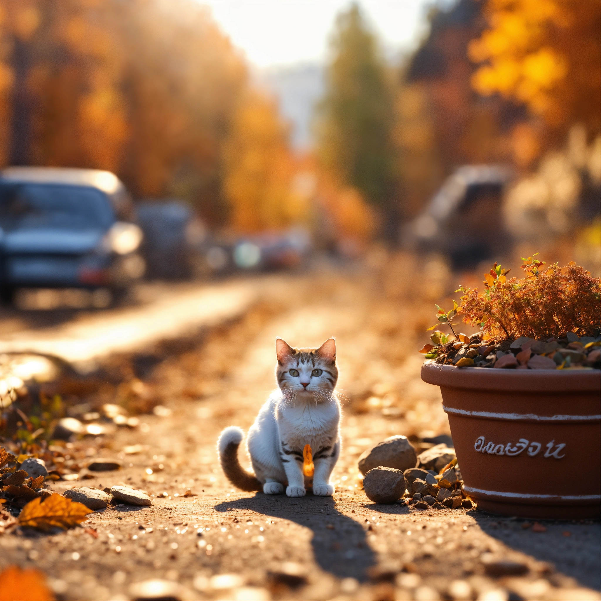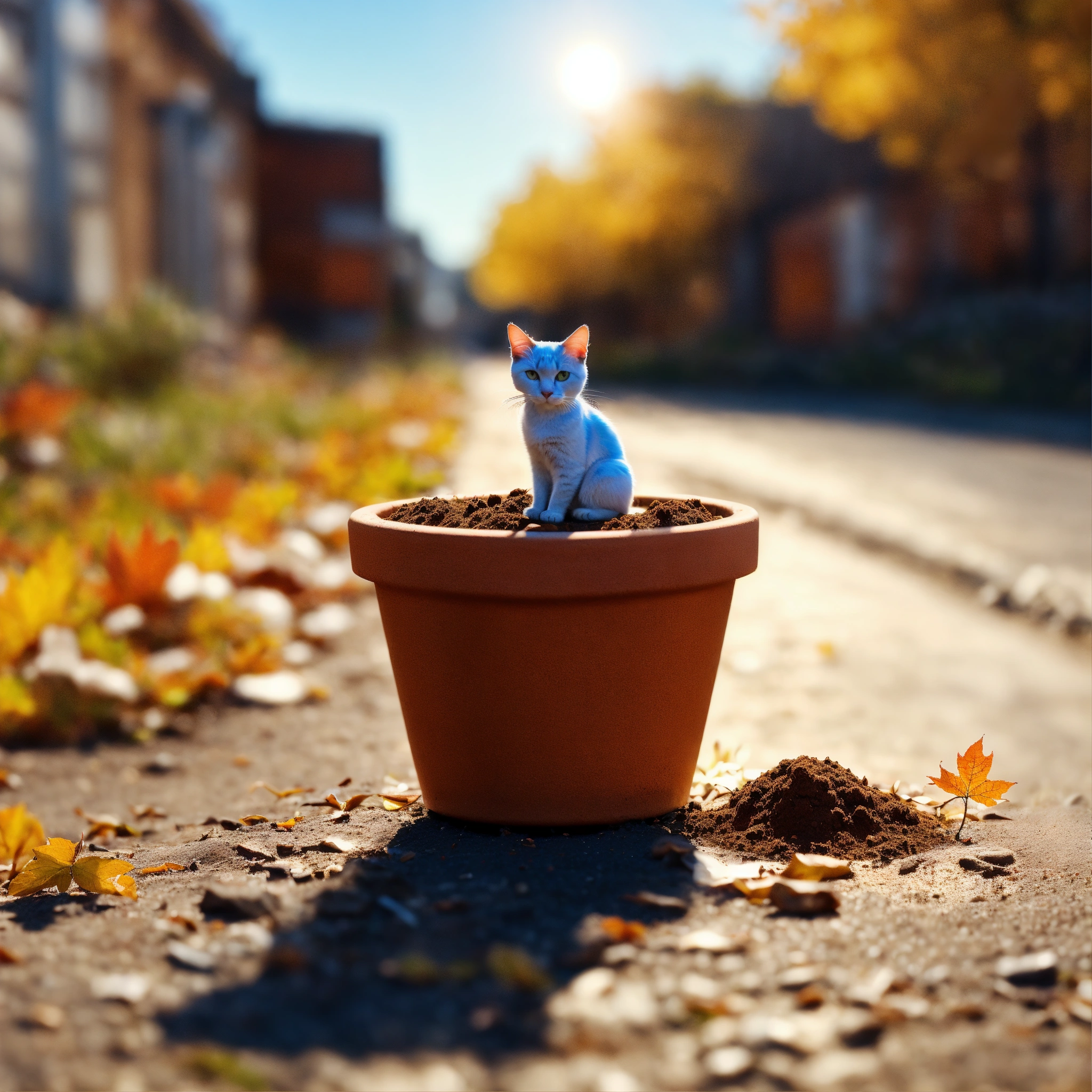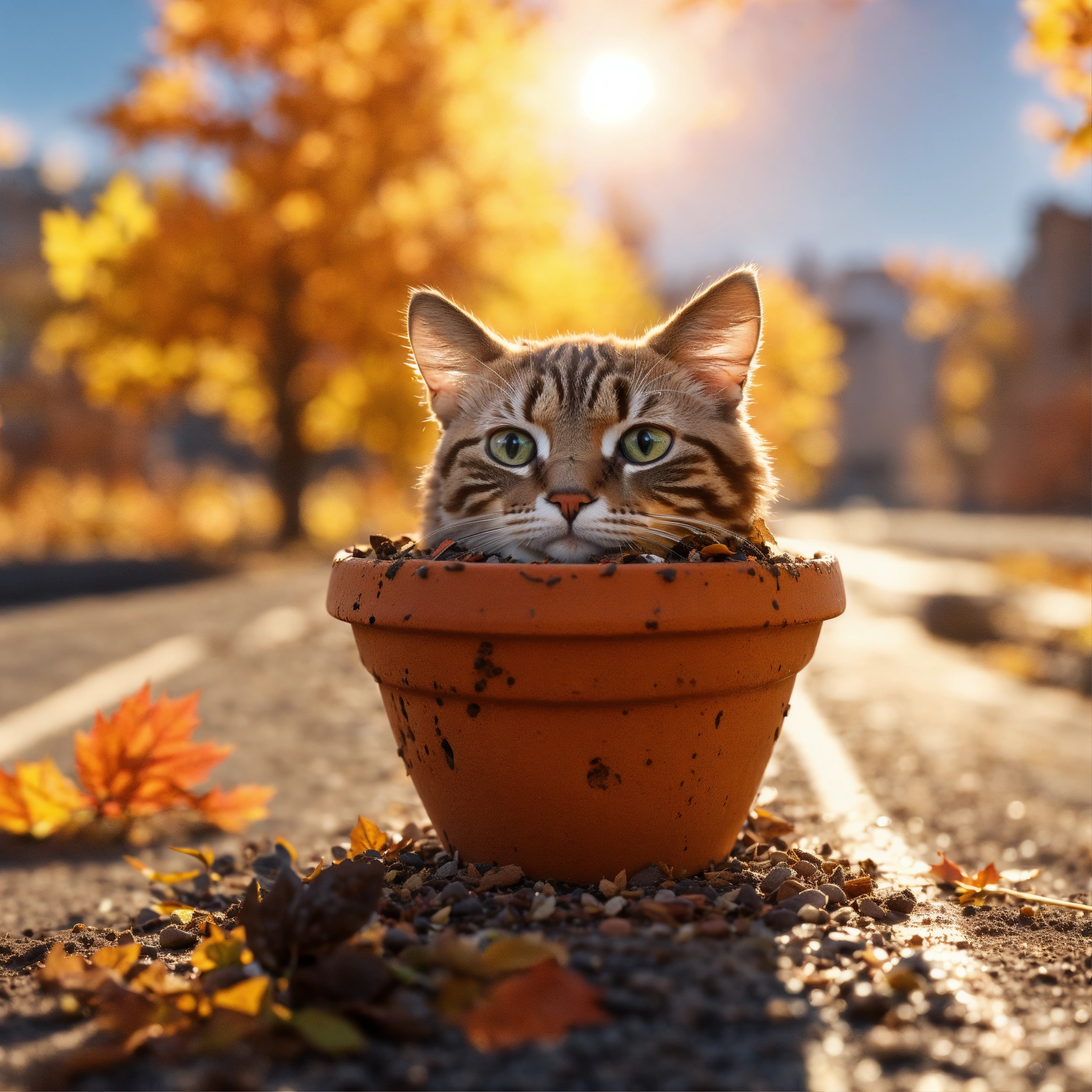 A micro-tiny clay pot full of dirt with a beautiful cat planted in it, shining in the autumn sun on a road in an abandoned city, 8k, extremely detailed, realistic photo, 4k realistic photo.