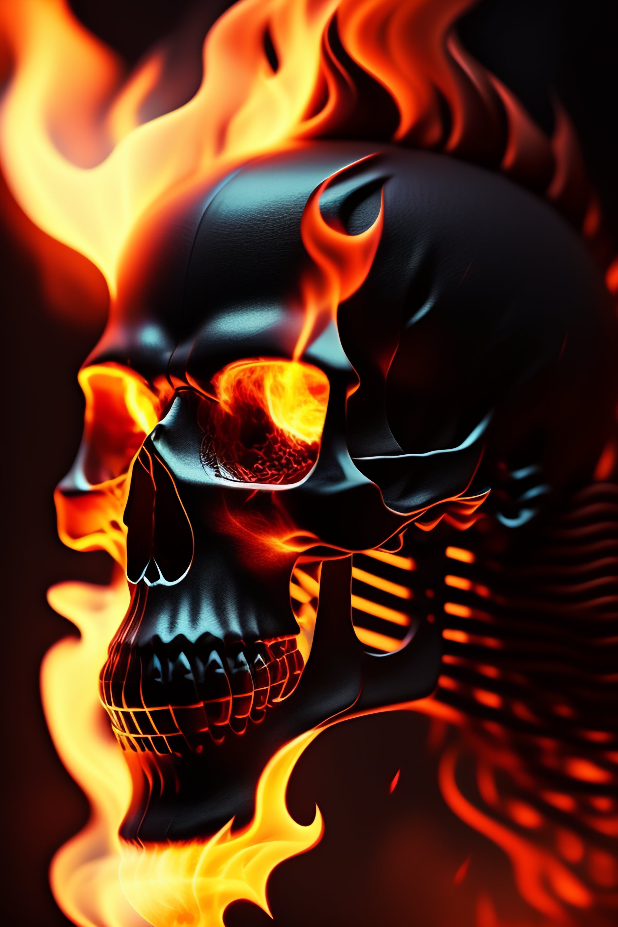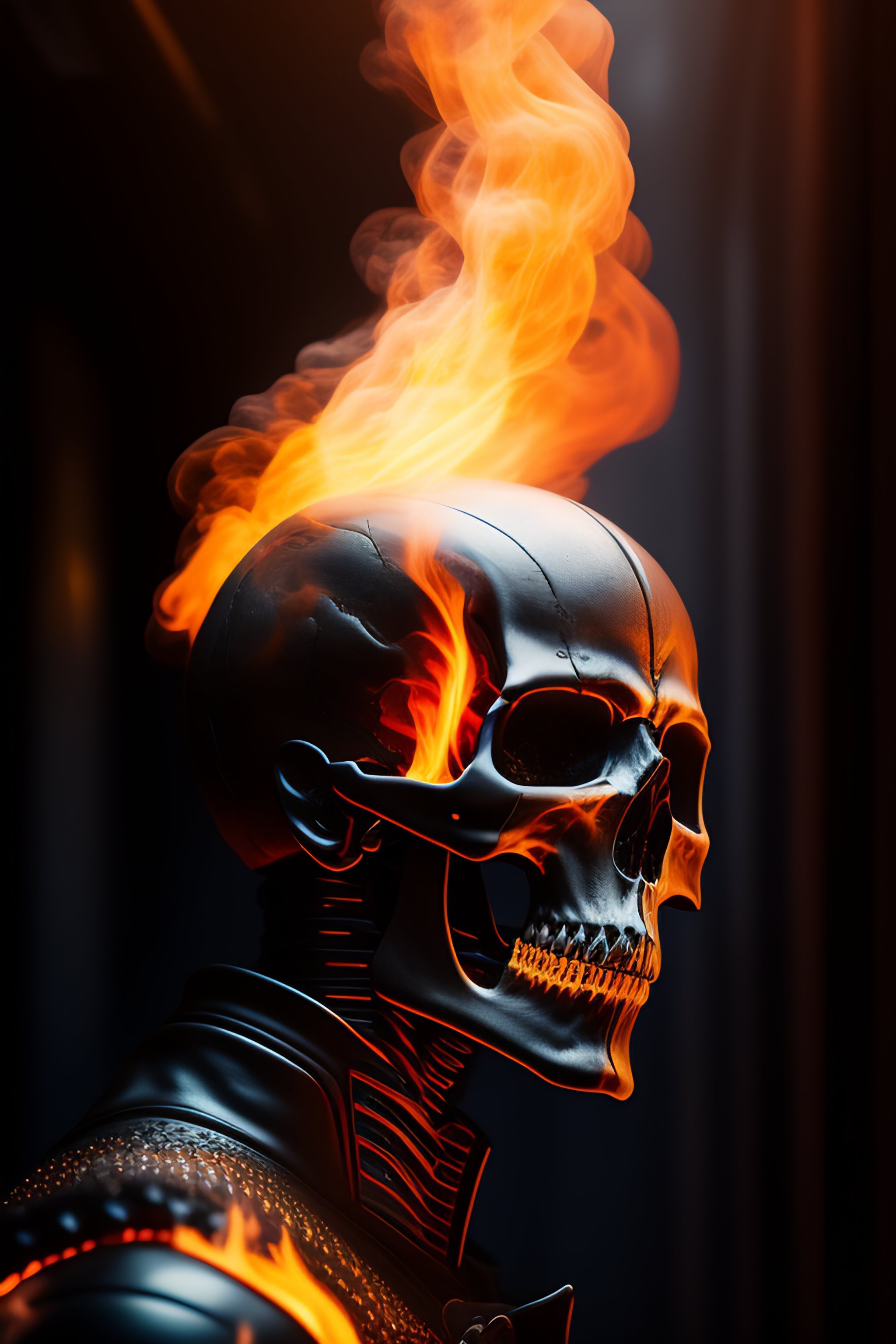 Ghost rider in a dark alley, cinematic lighting, digital art, award winning, realistic fire effects, realistic skull, realistic bone textures