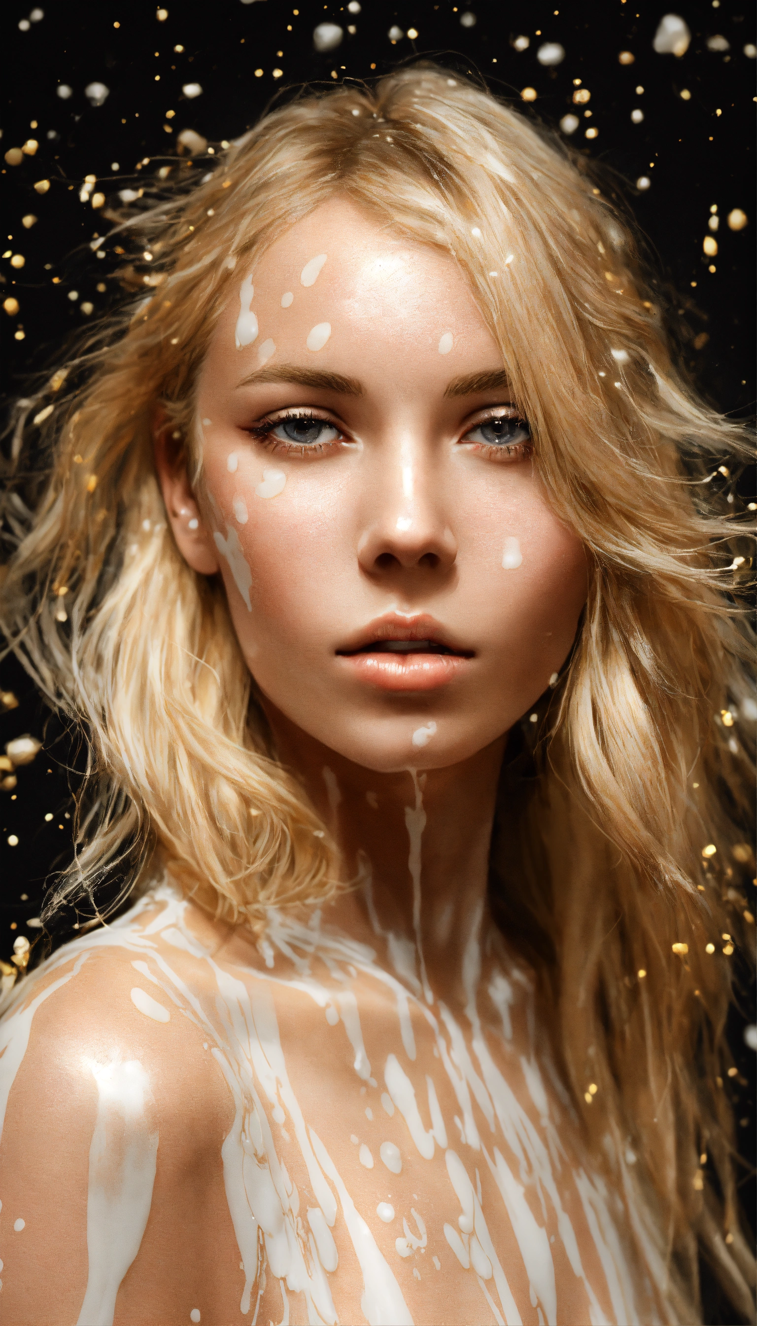 Beautiful blonde woman, off white semi translucent liquid wallpaper paste splattered across her face, portrait, plain background
