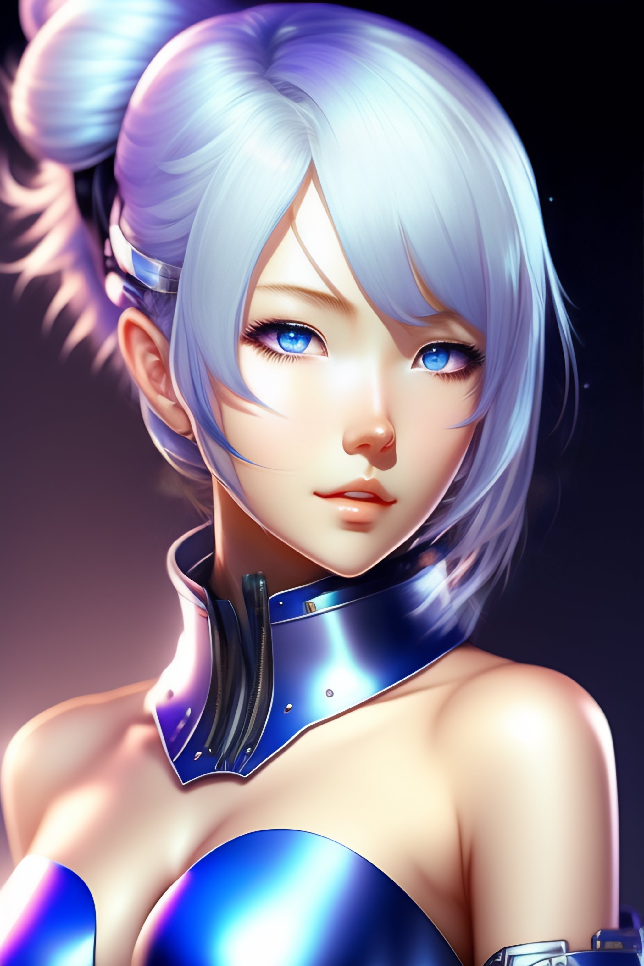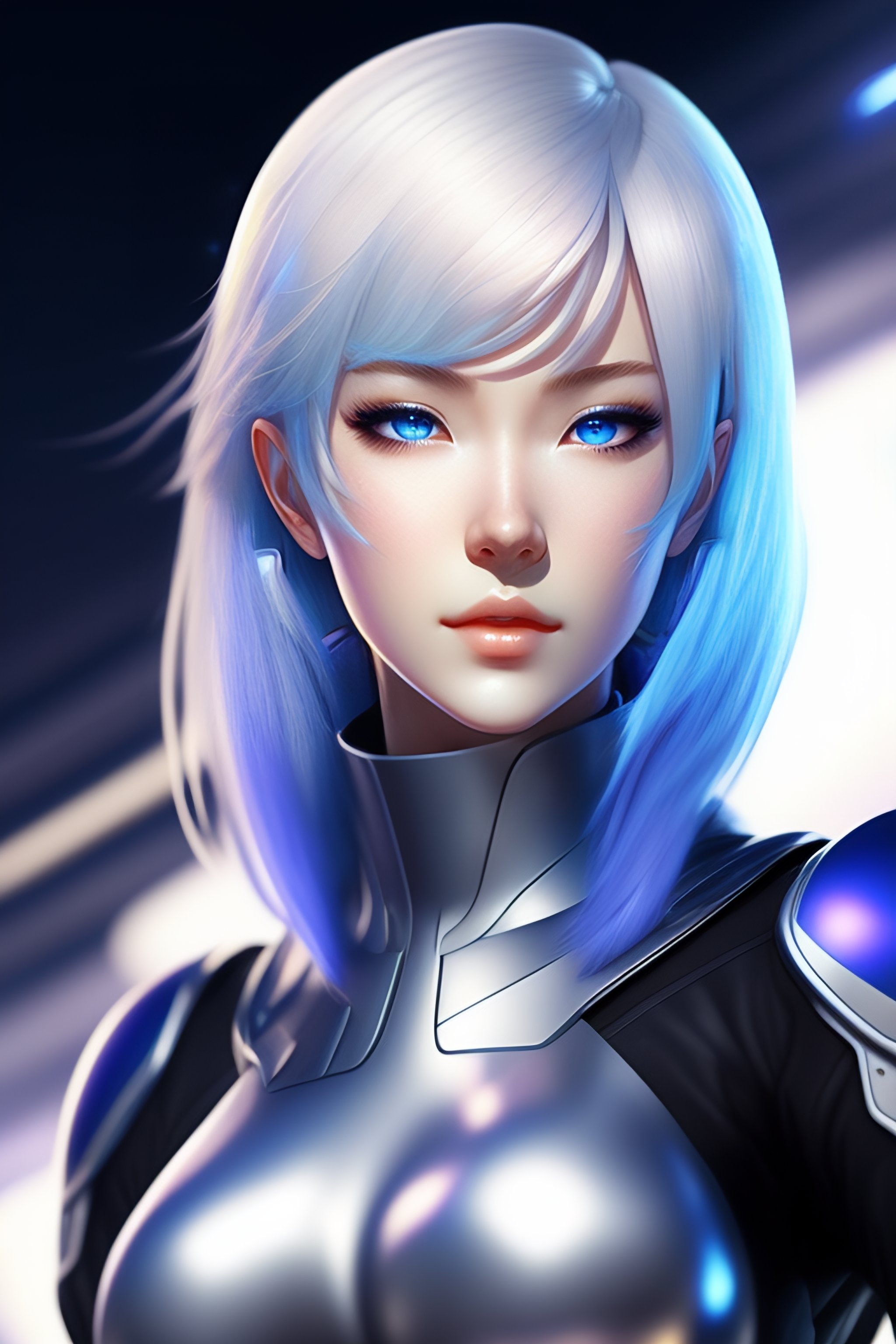 Young adult anime android girl with silver hair, blue eyes, robotic seam lines on face, katsuhiro otomo artsyle, realistic lighting, realistic shaded, full body portrait