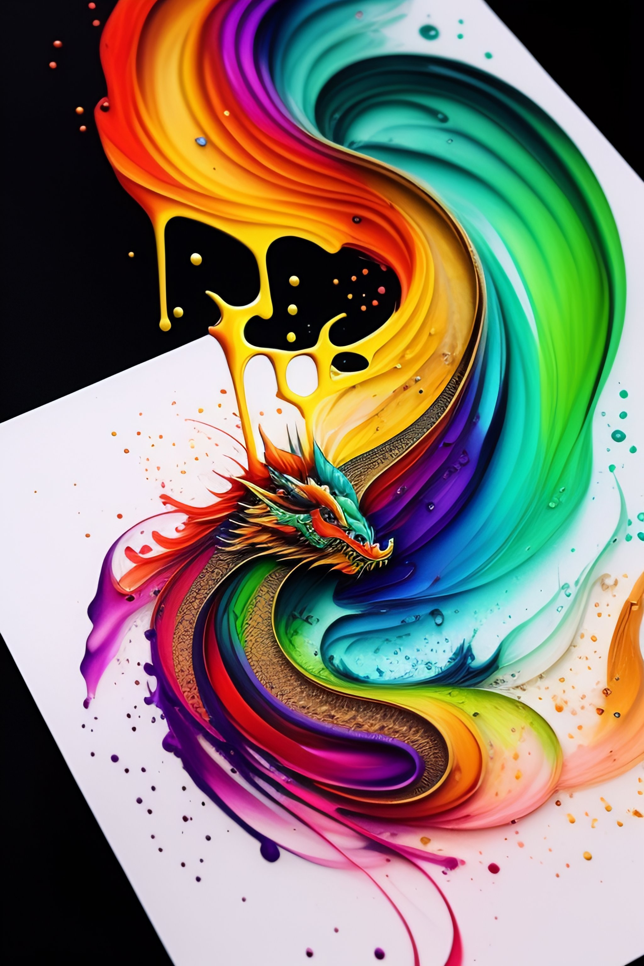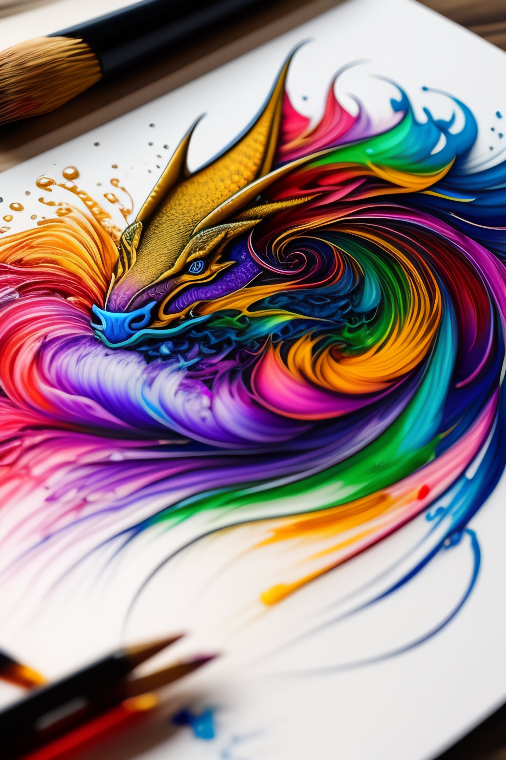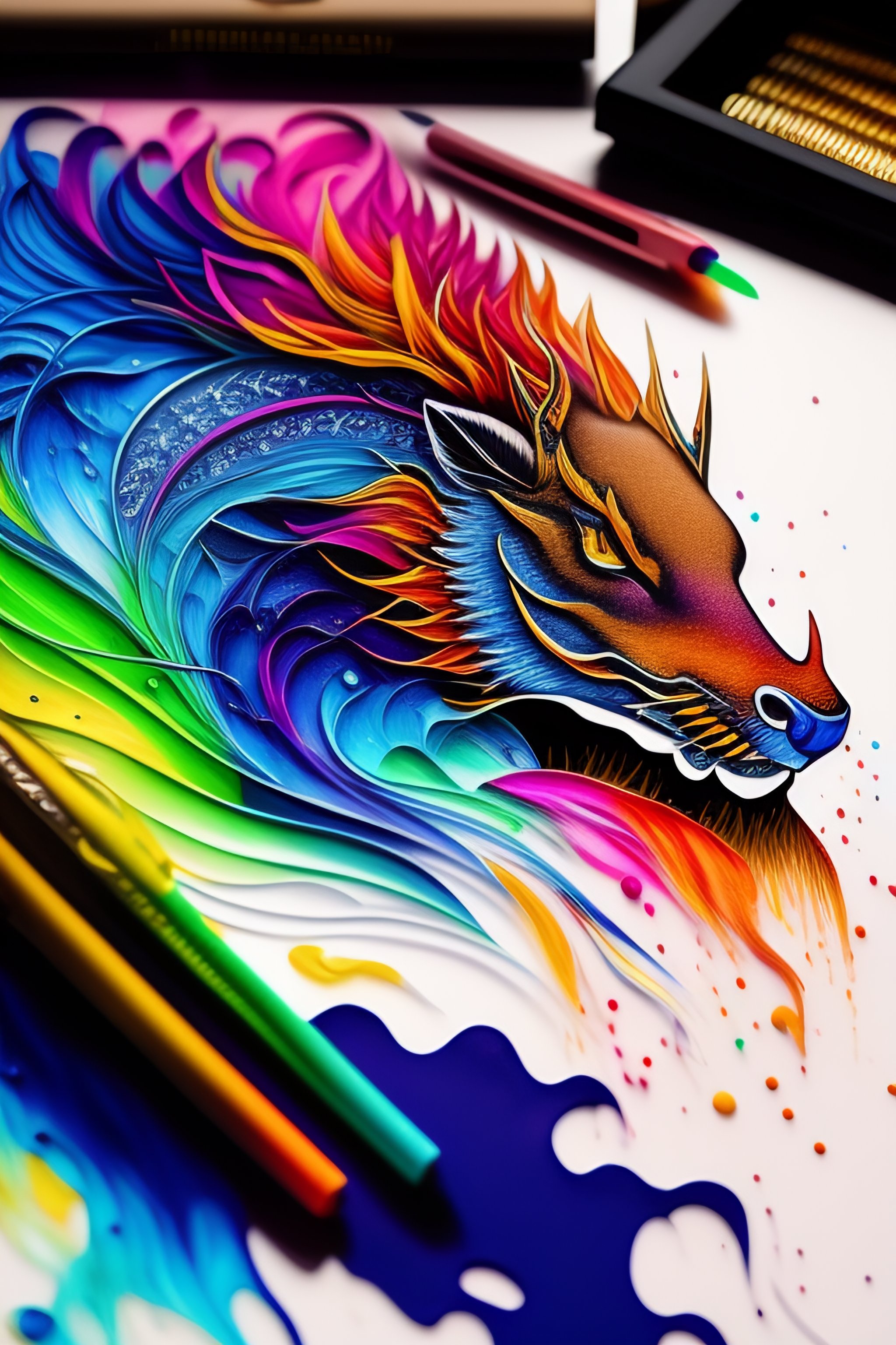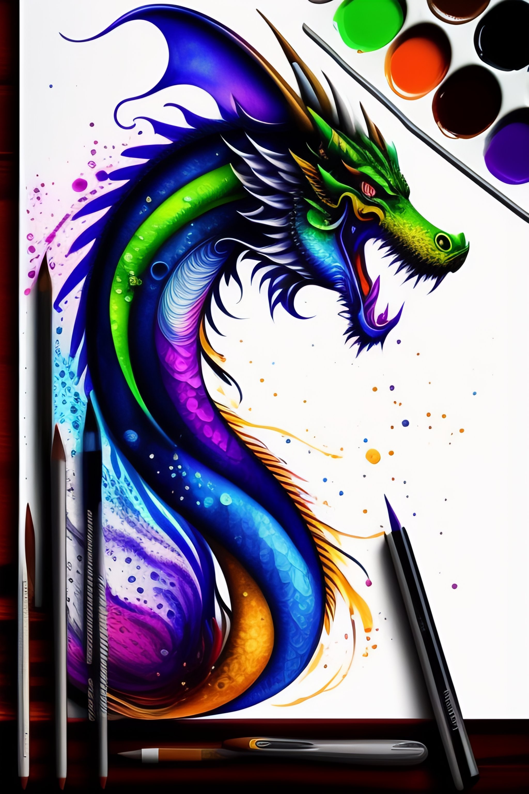 Scribble art with pens and pencils next to the paper and paints splashing on the paper dragon
