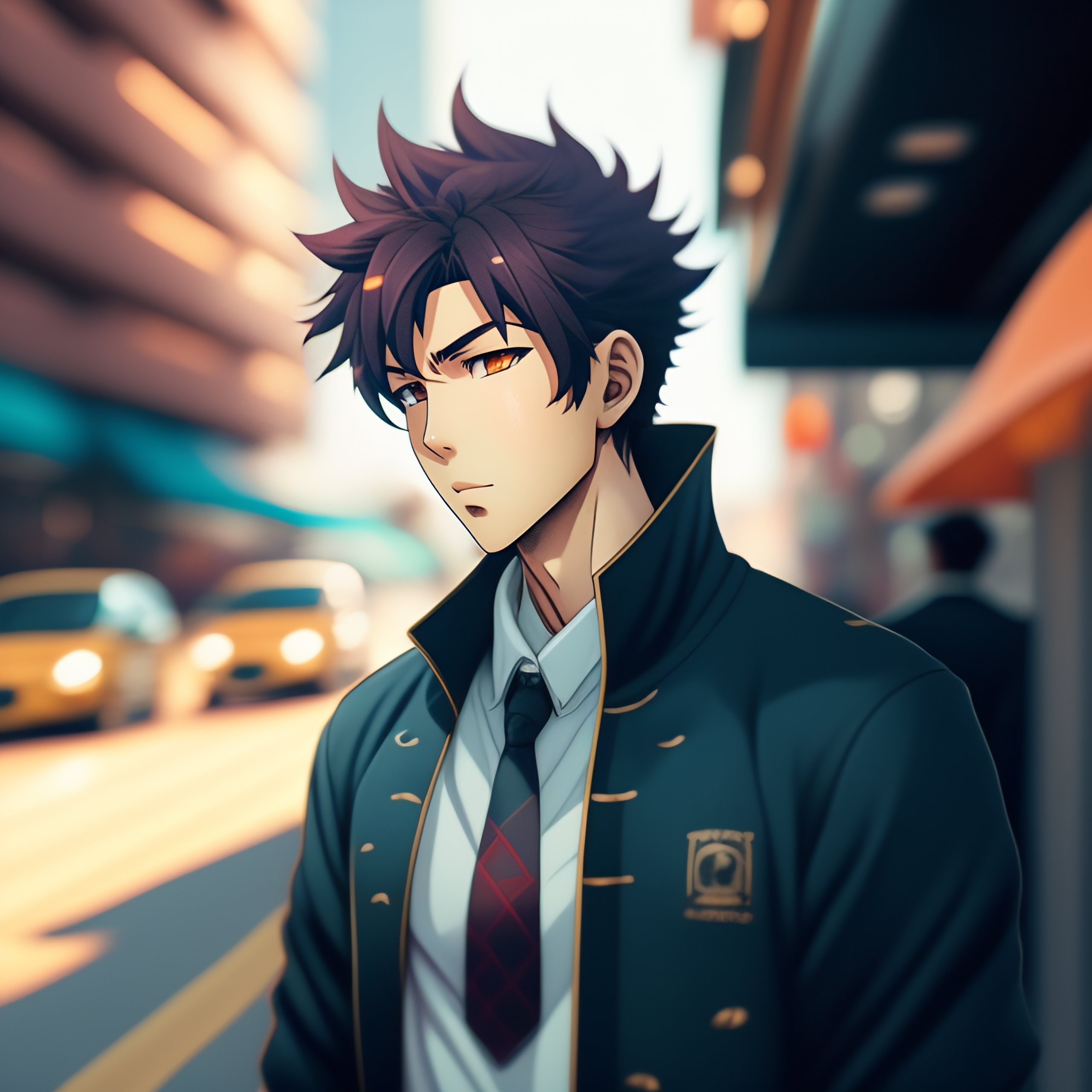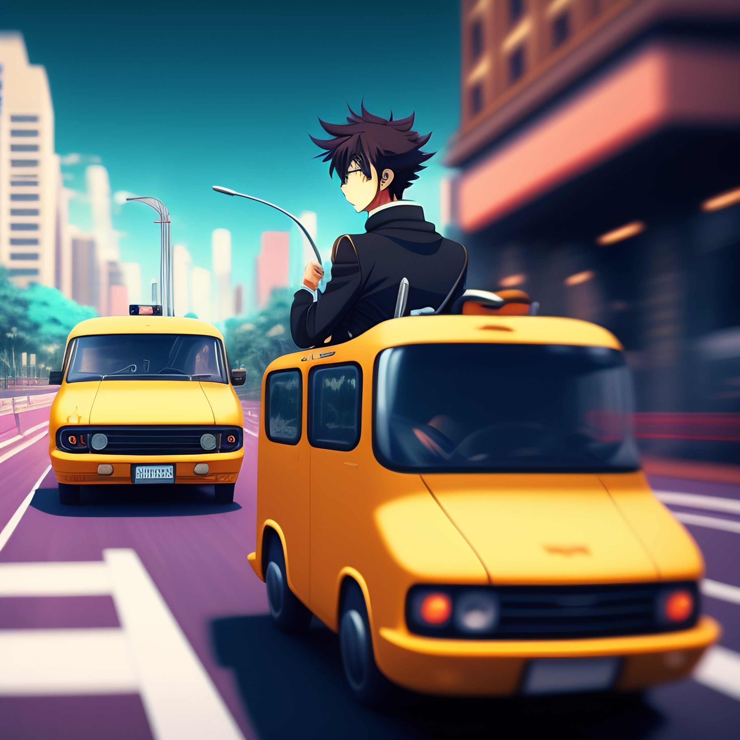 An anime style young man driving through the city