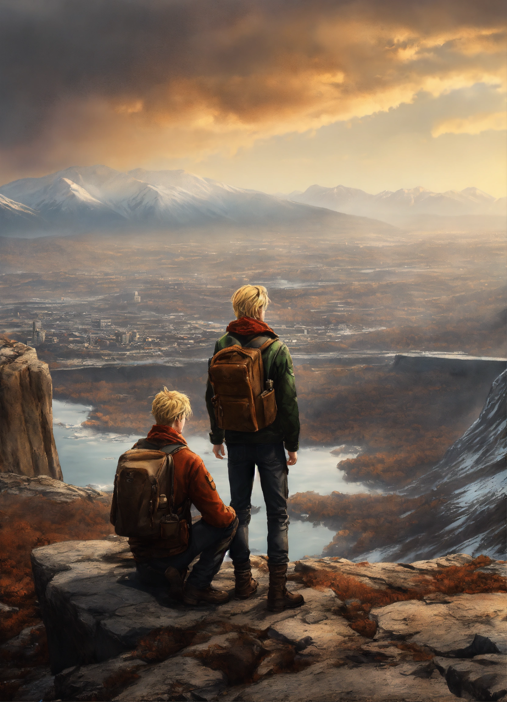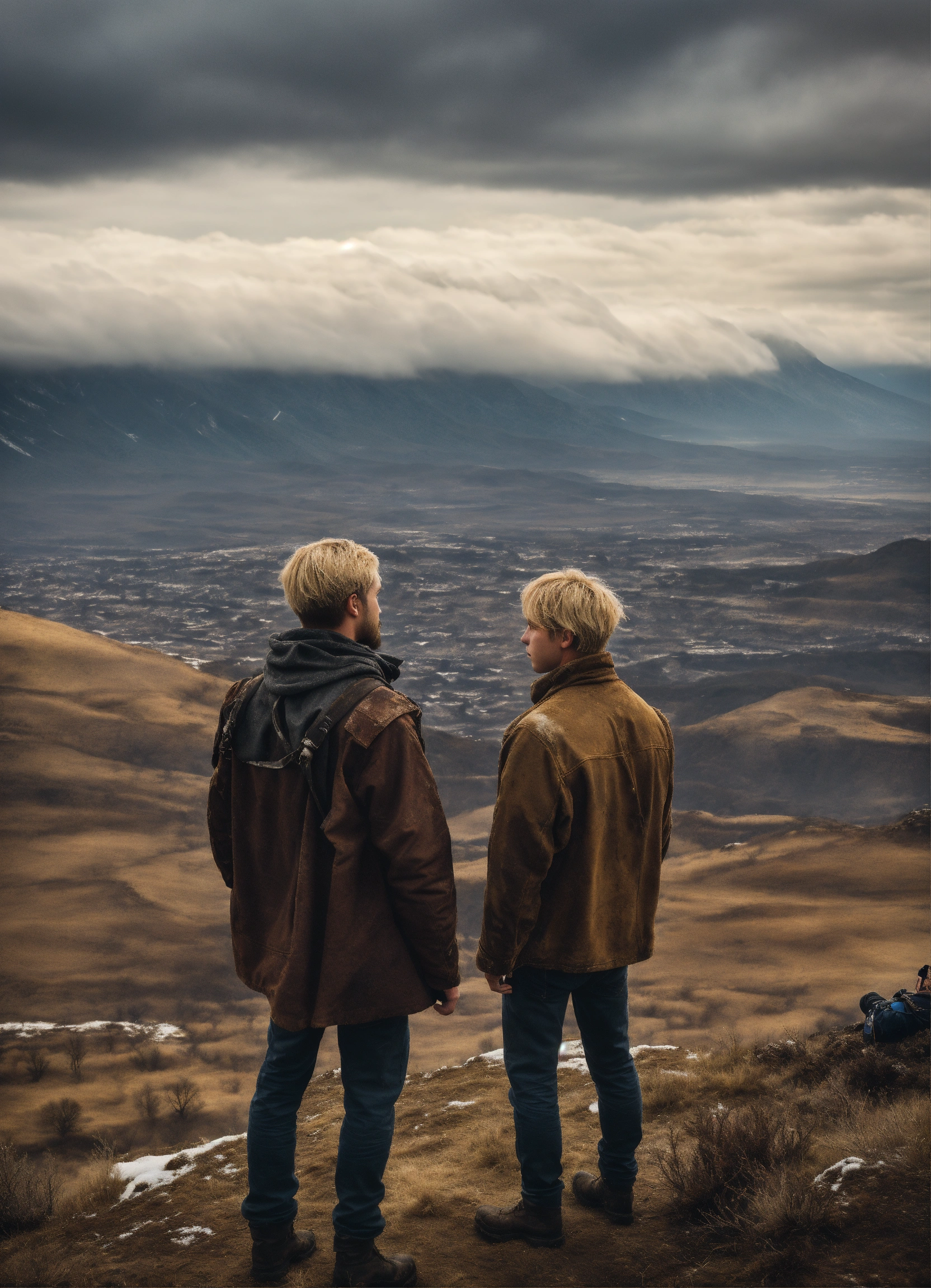 An ultrarealistic photo from the back, of a 35 years old man with blonde long hair and a 15 years old boy with short hair, from the back, on a cliff. in the background, a post-apocalyptic landscape, with no vegetation, rugged mountains, clouded skies, some snow.