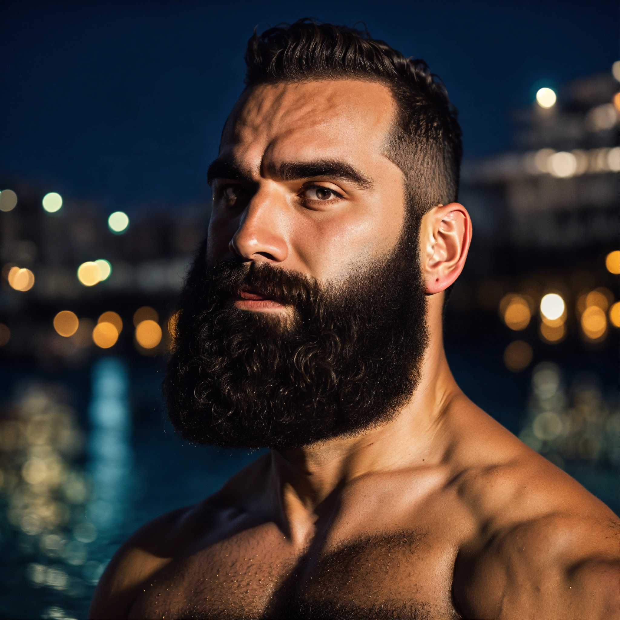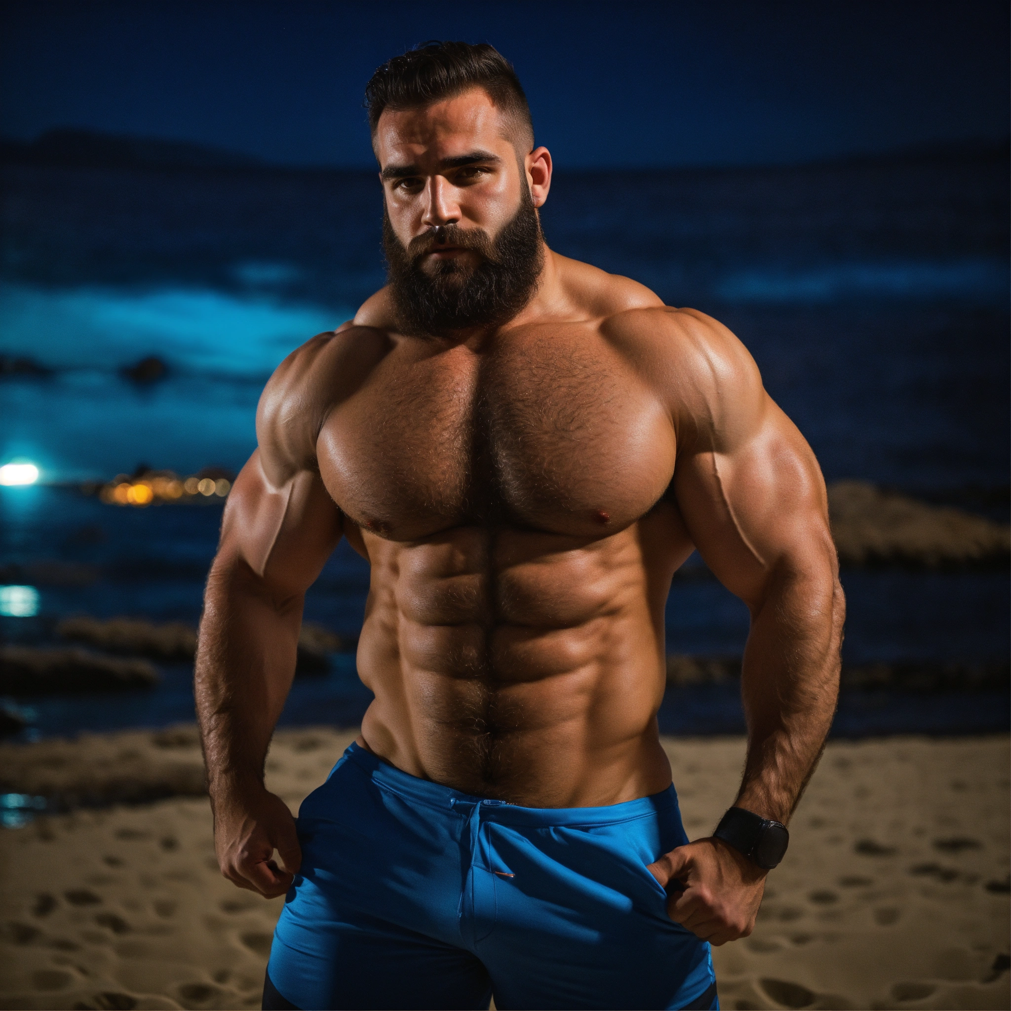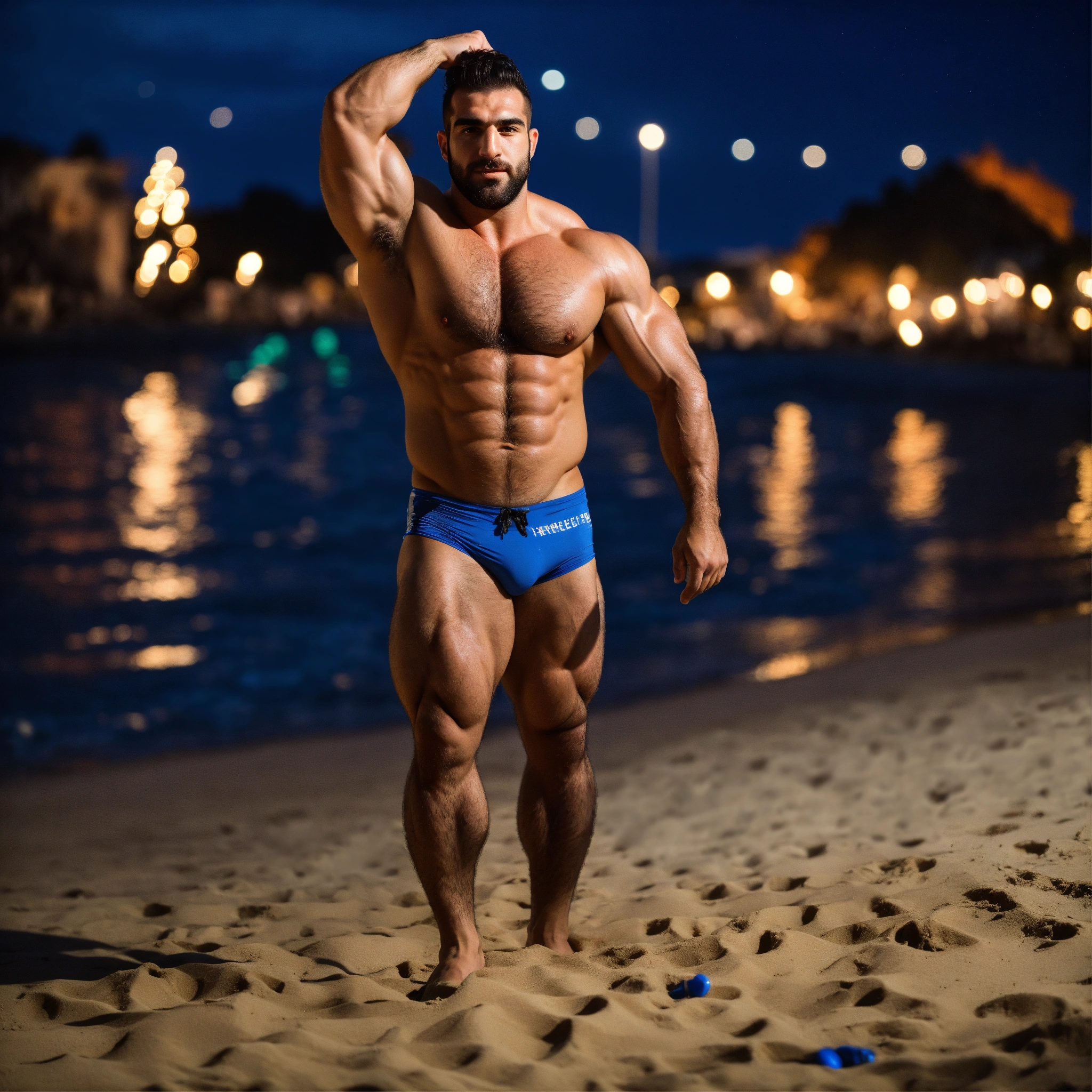 30-year-old hairy greek man with big muscles, big bodybuilder, body like a wrestler, at a party on the beach at night
