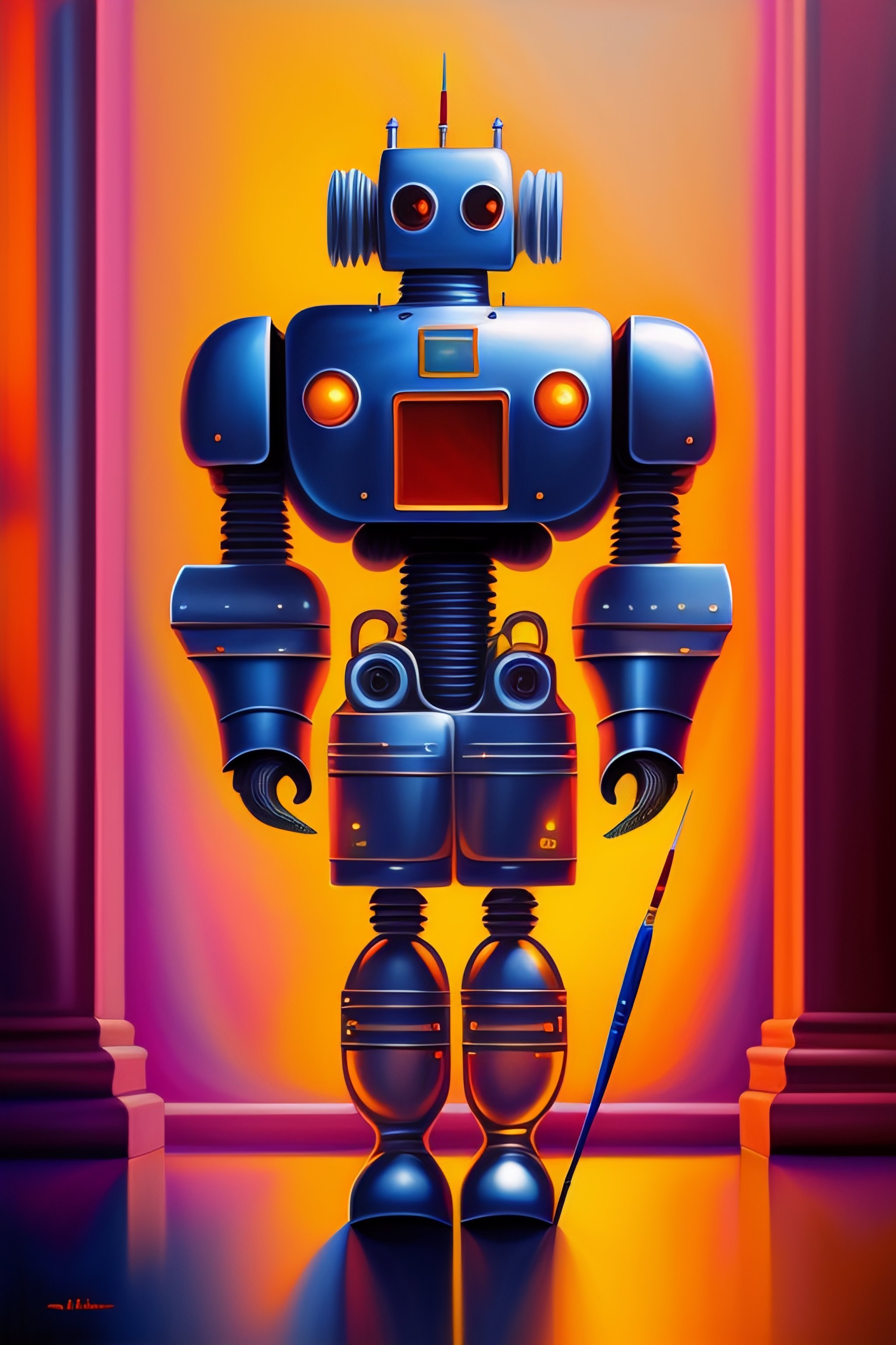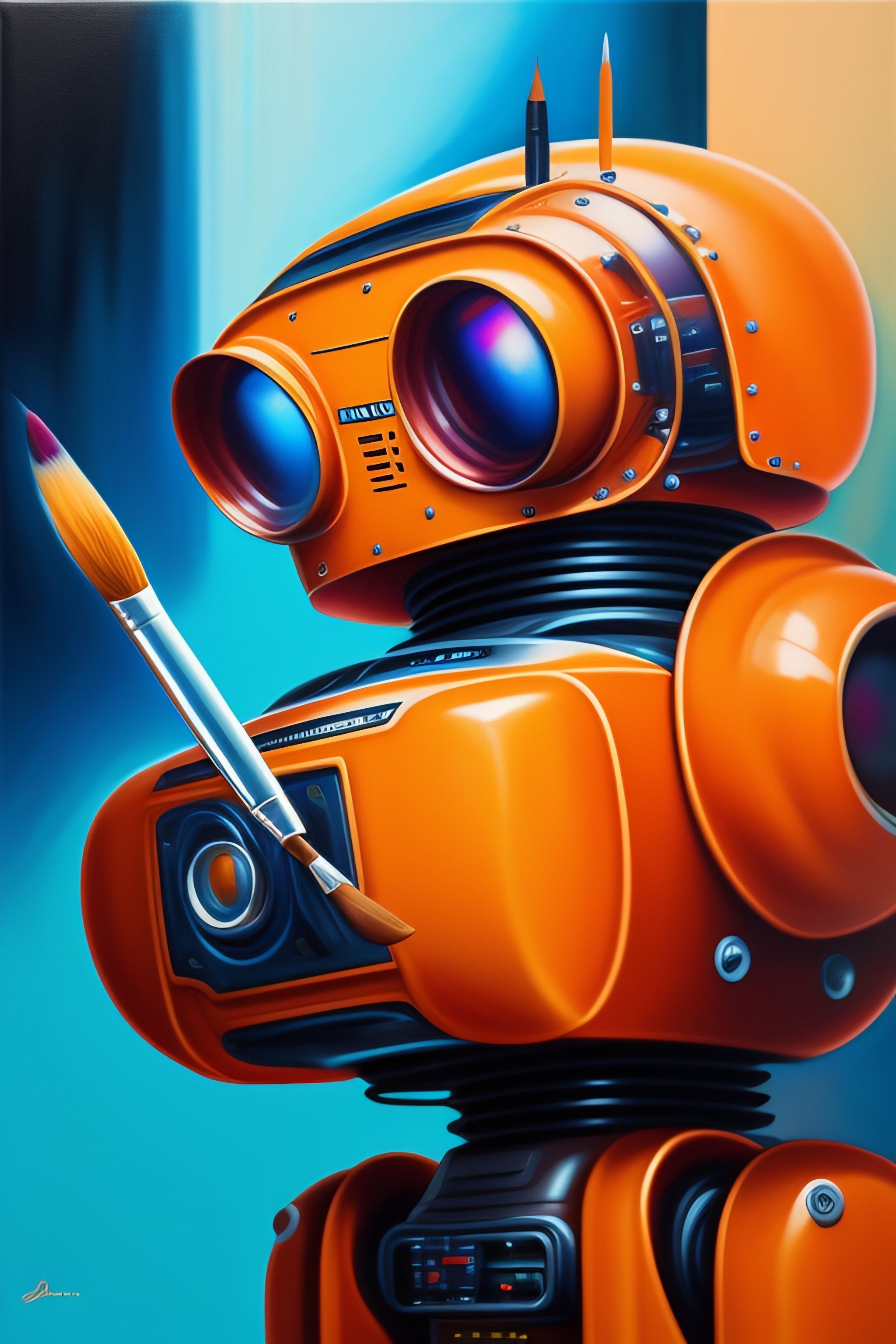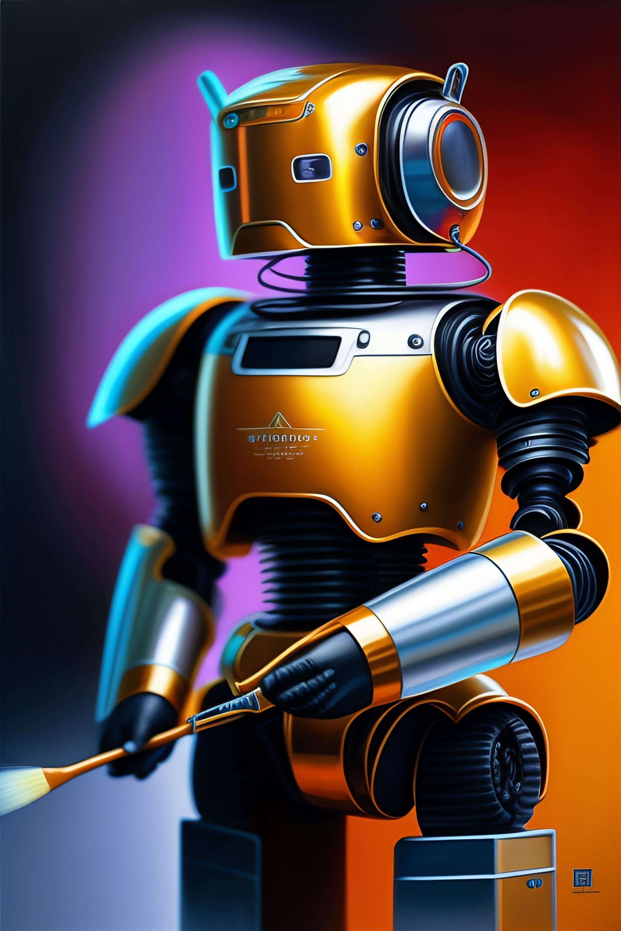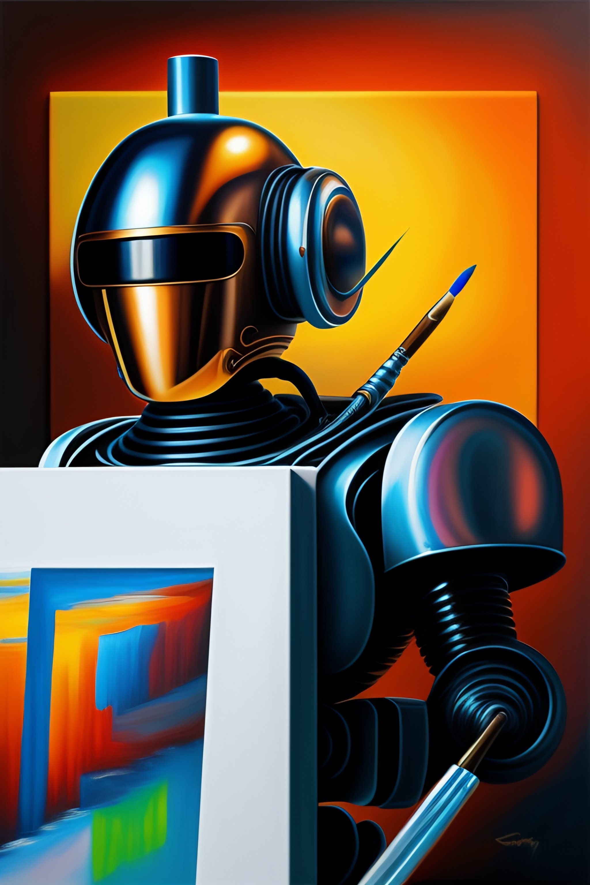 Hyperrealistic painting of a robot holding a paintbrush and painting on a canvas, background art studio