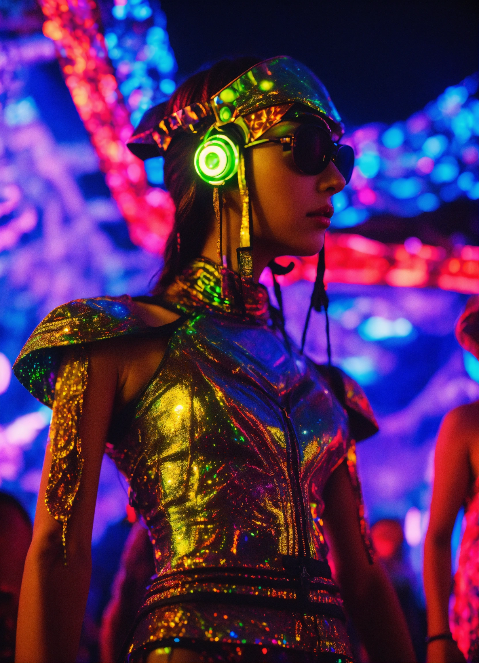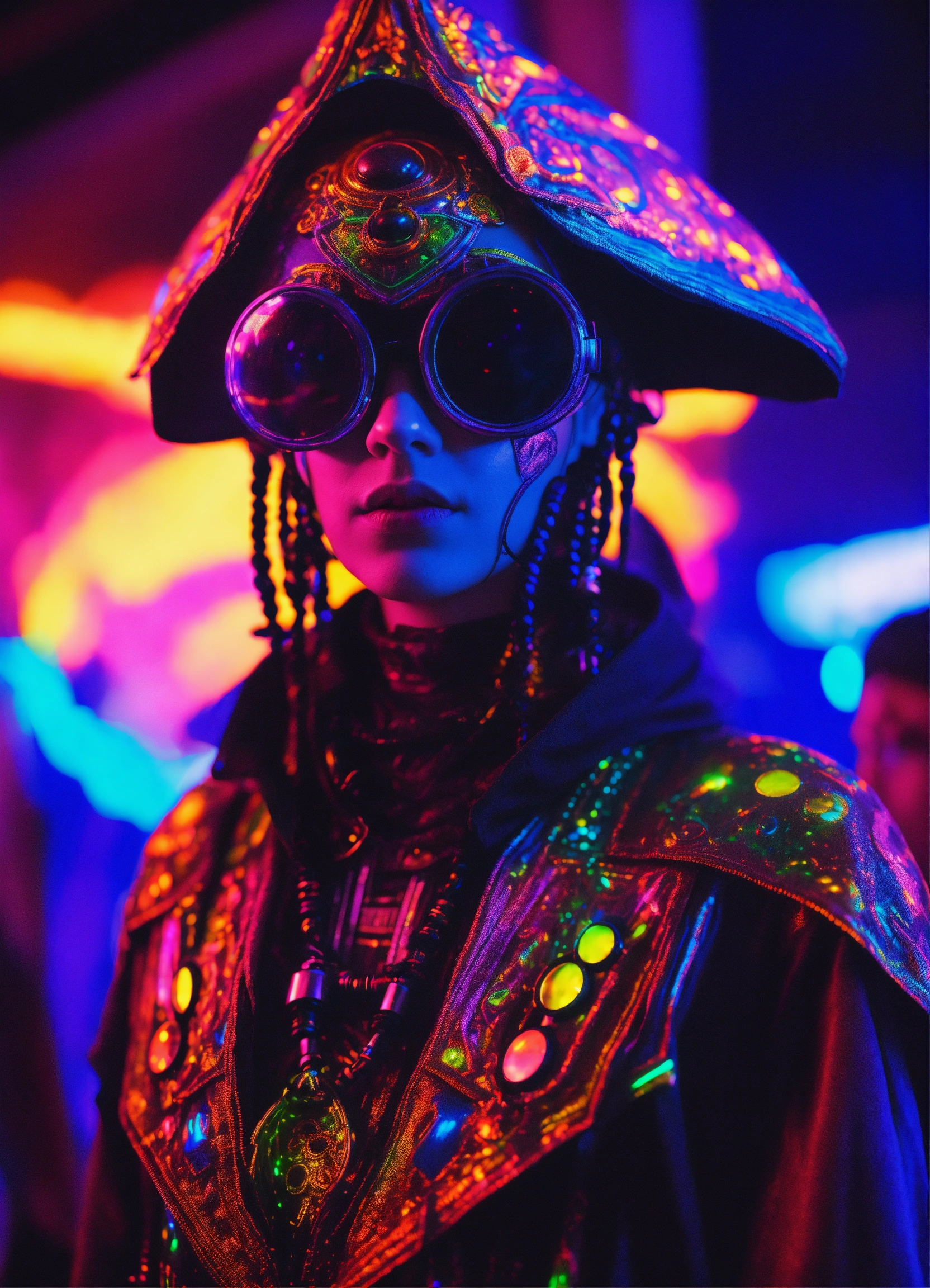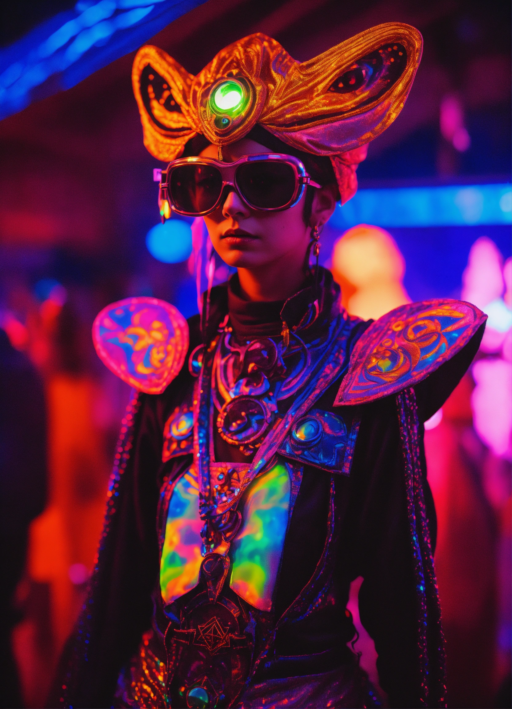 Photorealistic 3d portrait cosmic alien in colorado festival couture raver outfit in dmt black light holographic underground occult temple 35mm film, akira anime.