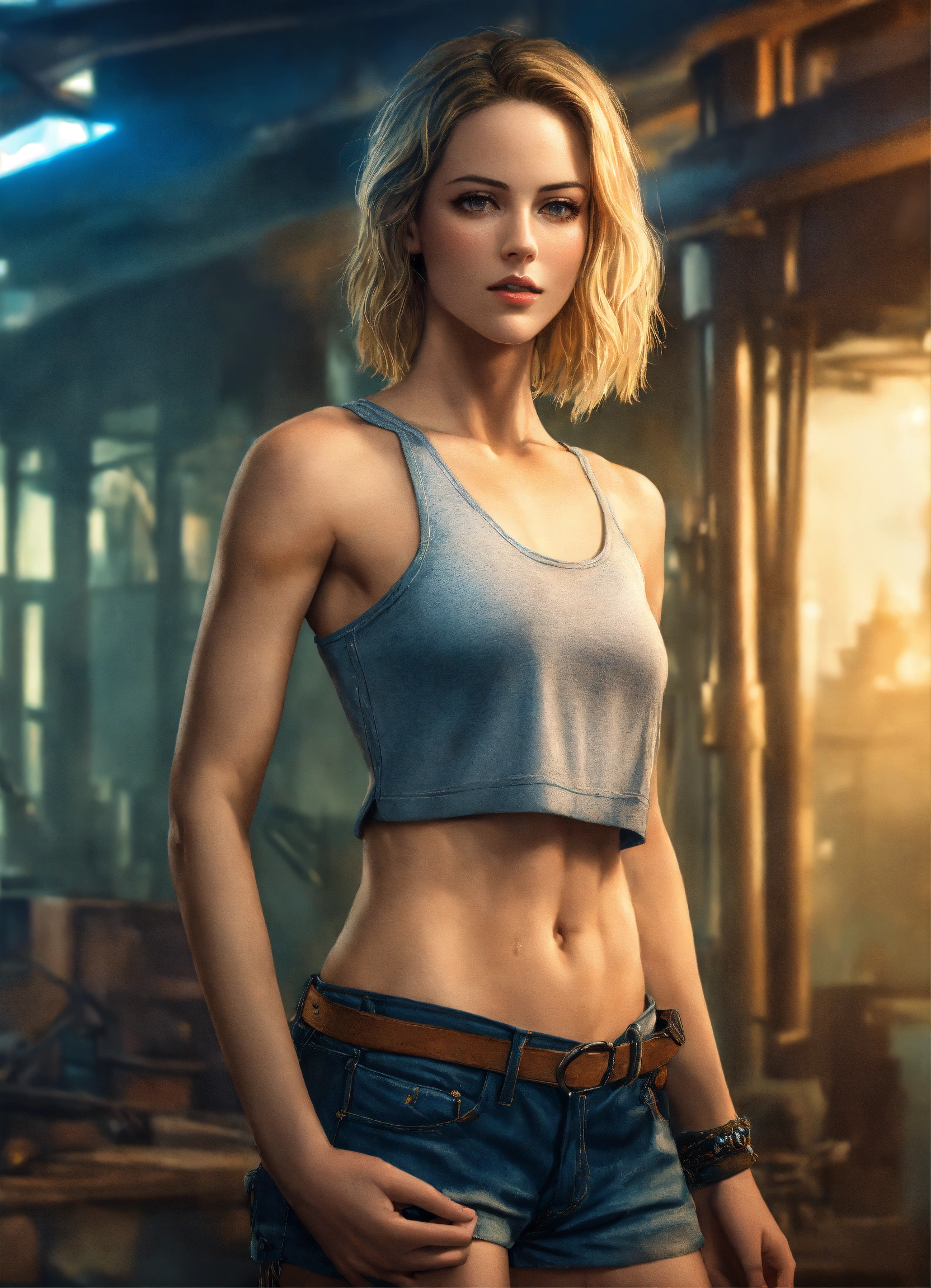 Full body potrait of a women transforming into a tall woman with high cheekbones, very pale skin, blonde hair, heavy chest, thin muscular midriff with confident face, tank top, hyper realistic, highly detailed, side glamor pose, 4k, hdr, smooth, sharp focus, high resolution. kaya scodelario