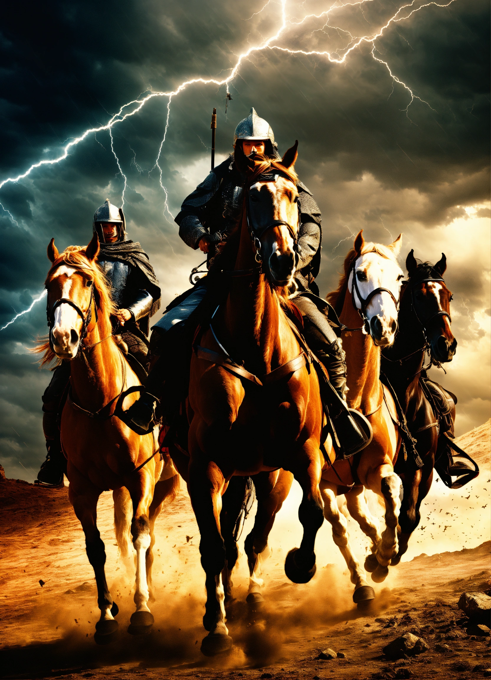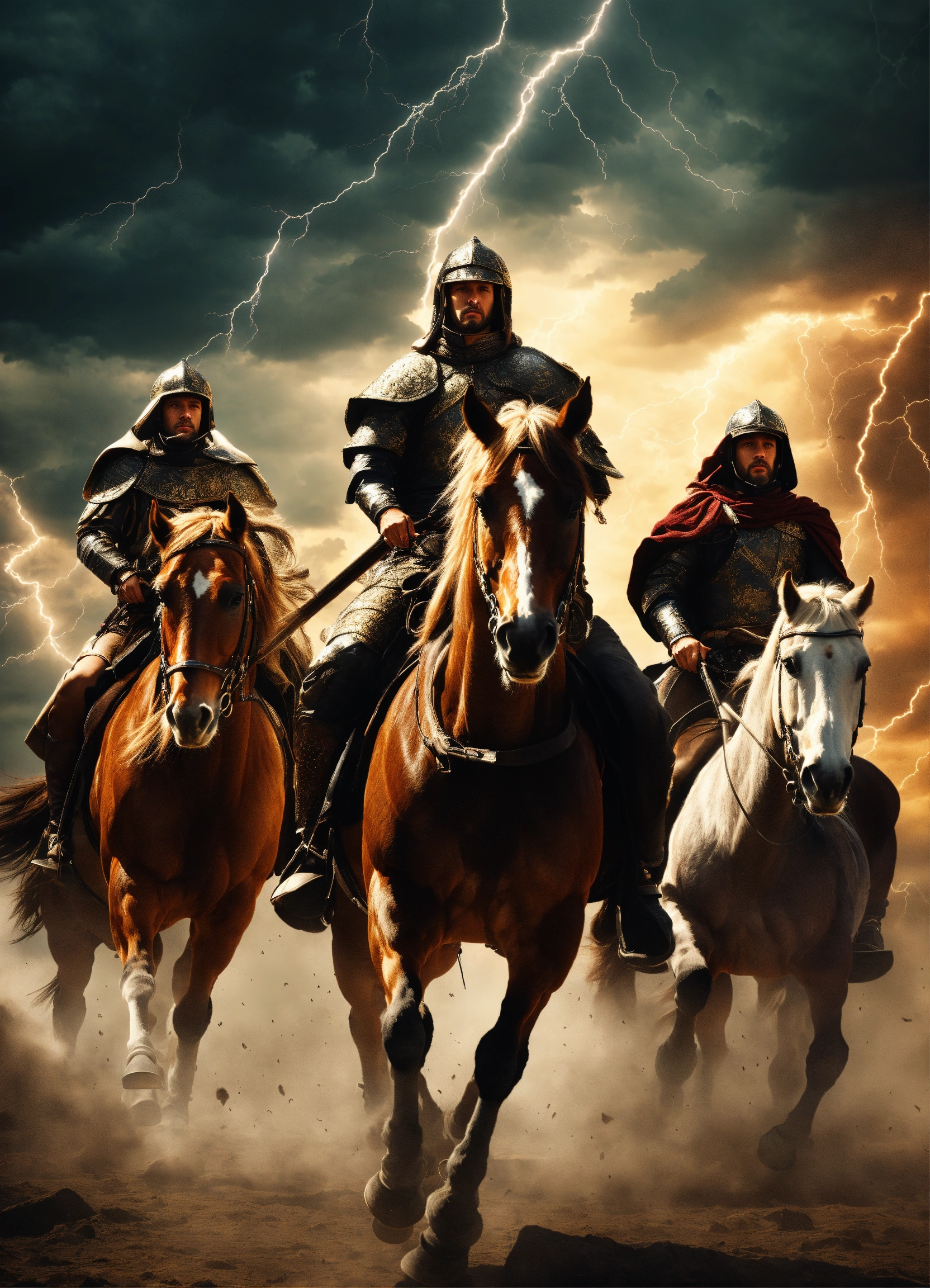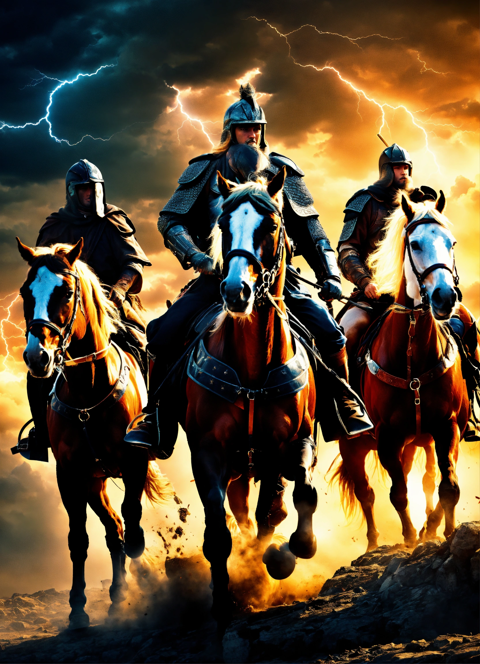 Biblical four horsemen of the apocalypse, riding on their horses, with thunder in the sky behind them, hyperrealistic, 4k render, grunge