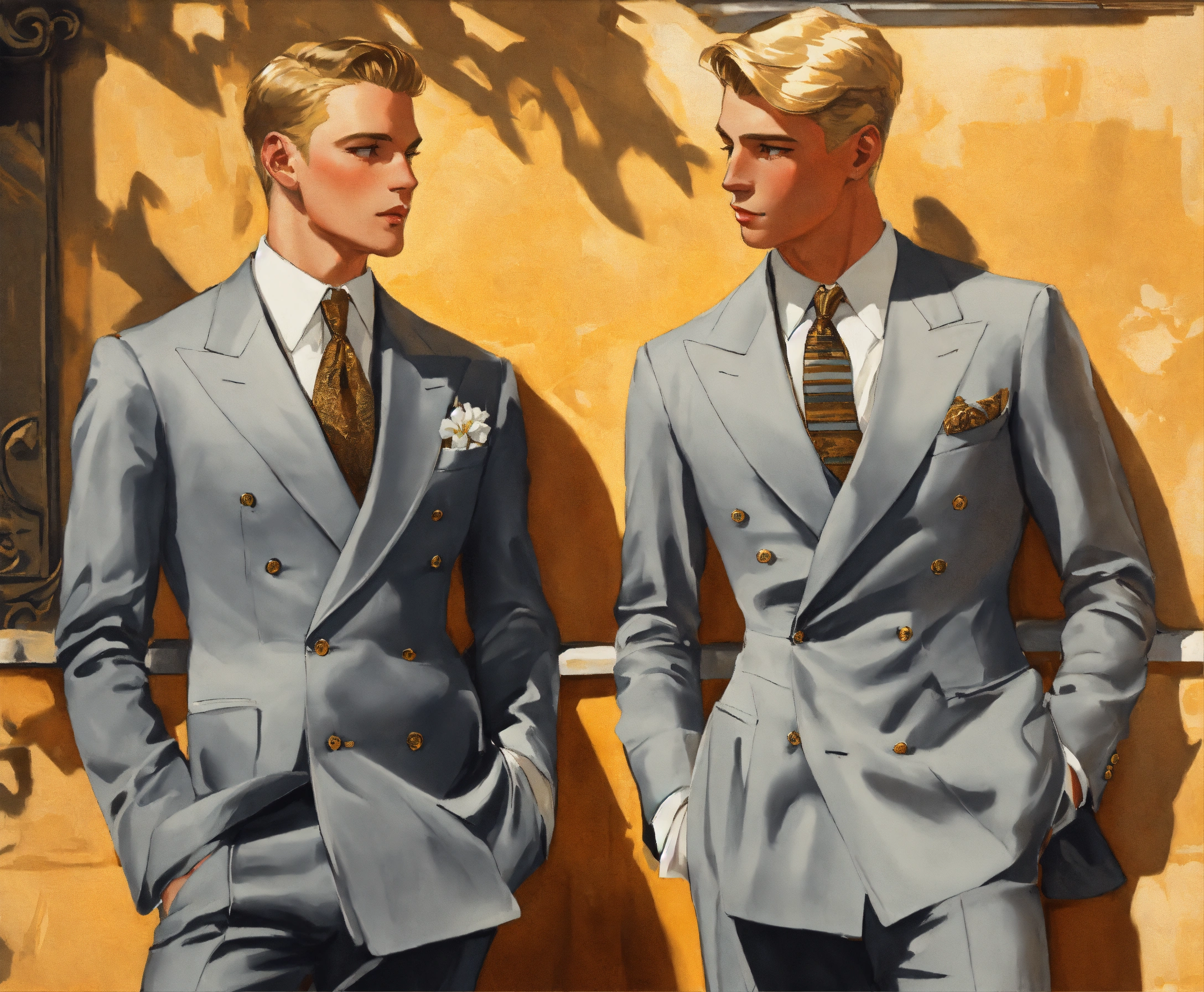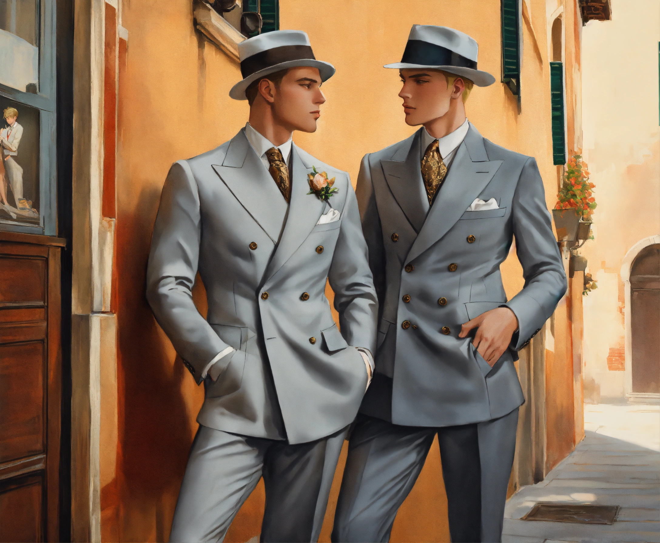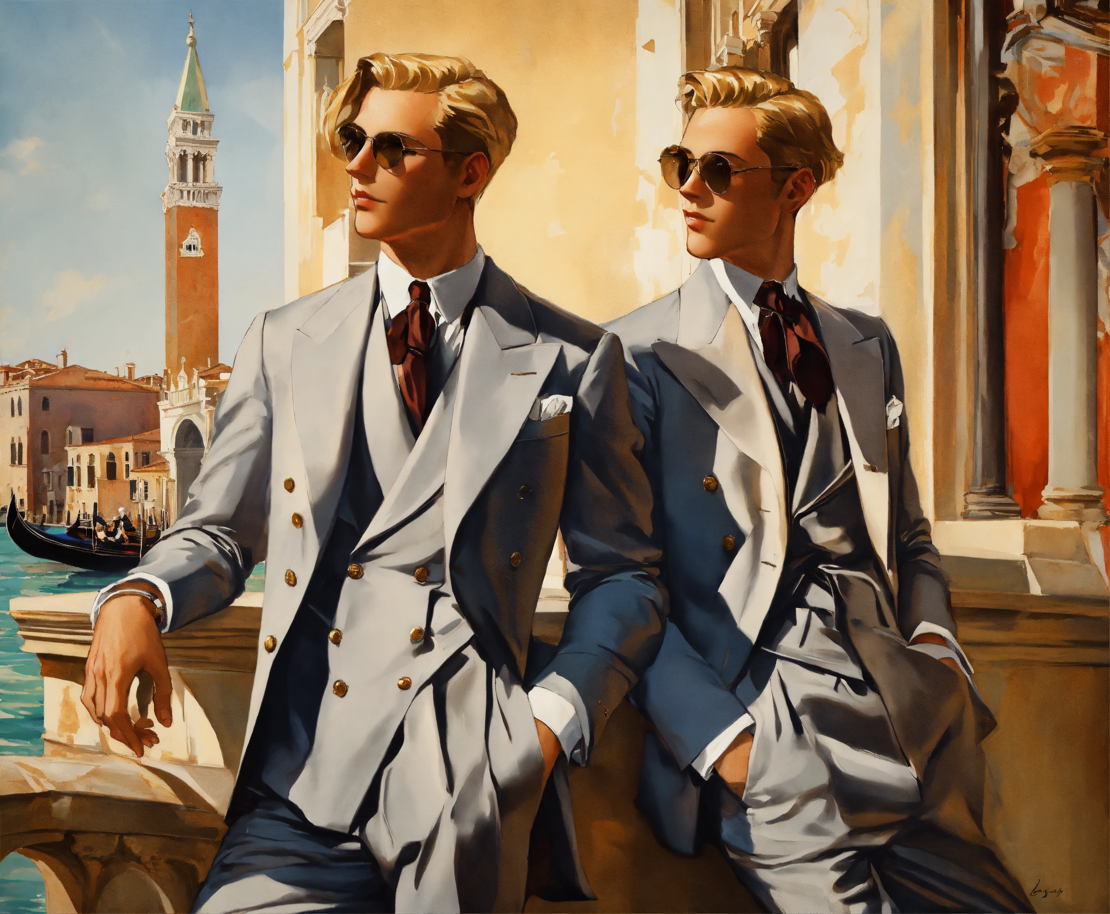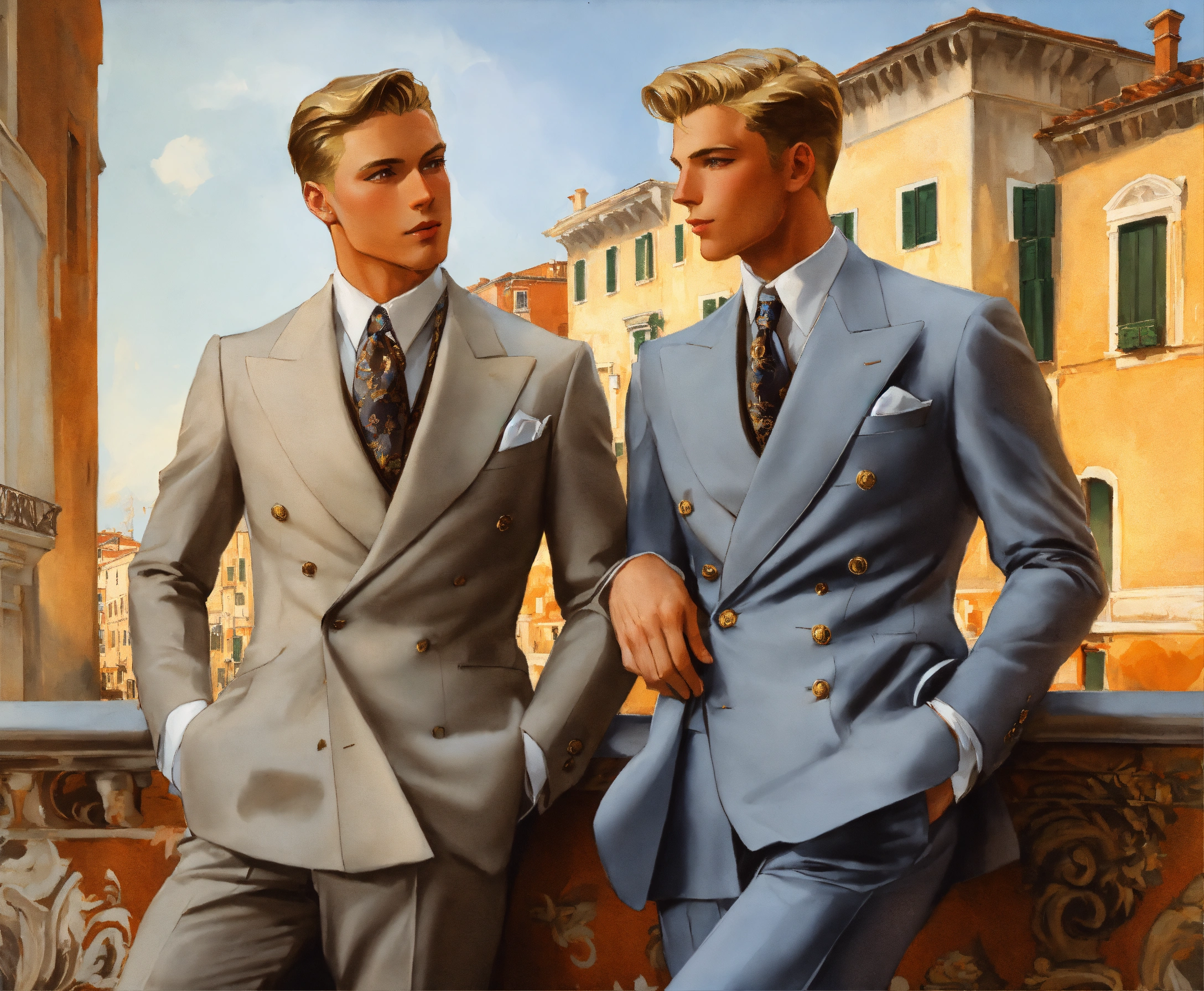 Two blonde gentlemen in grey double breasted suit leaning on a wall in venice