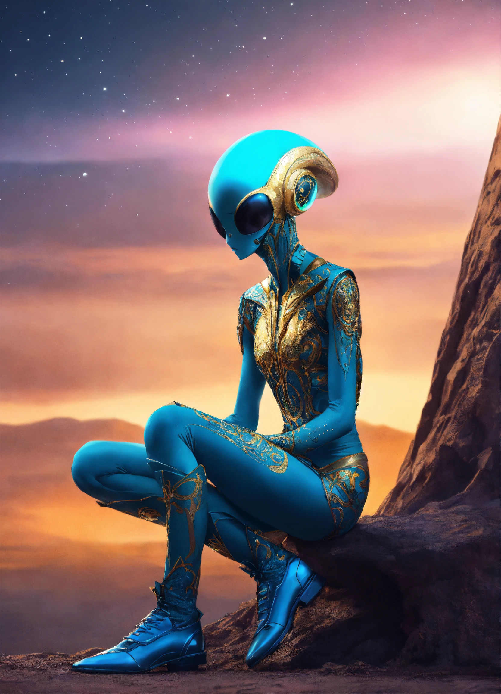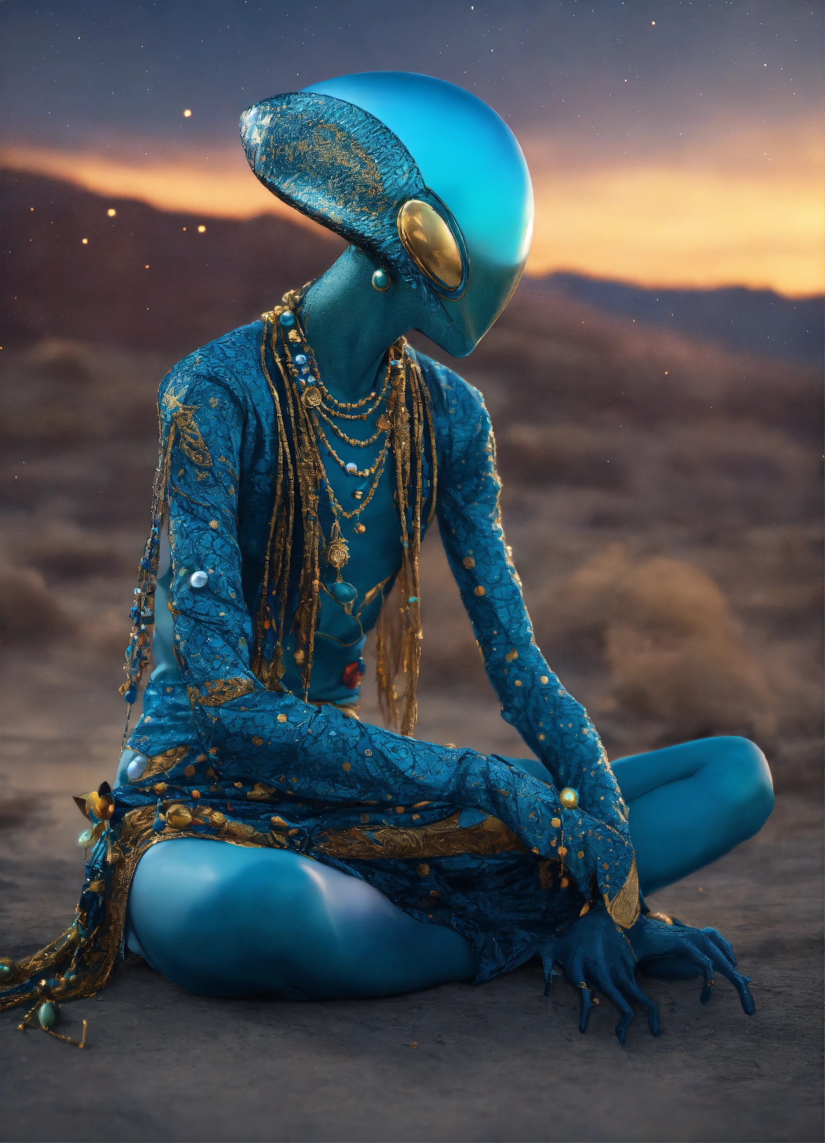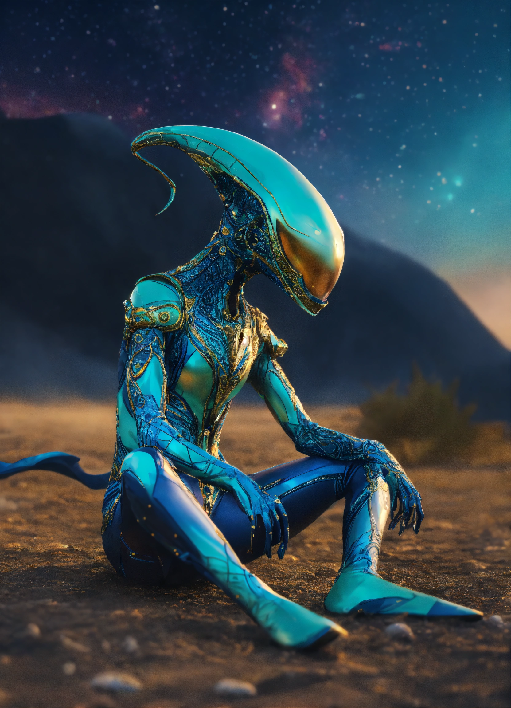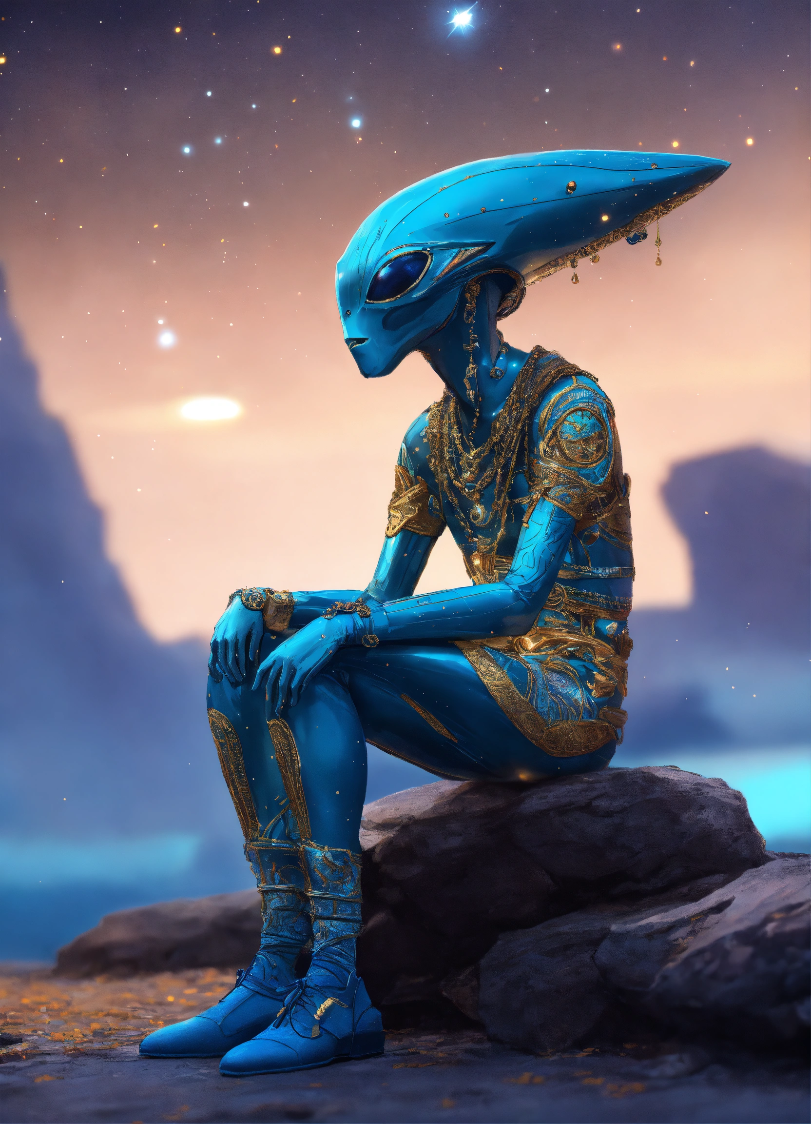 A alien, hippiestyle with rastahair, vibrand soft cyan and pearl white, dark navy blue gold decoreted clothings, full body wide shot, sitting on ground pose, side view, intricate, sharp_focus, concept_art, simple backroind cosmic sky