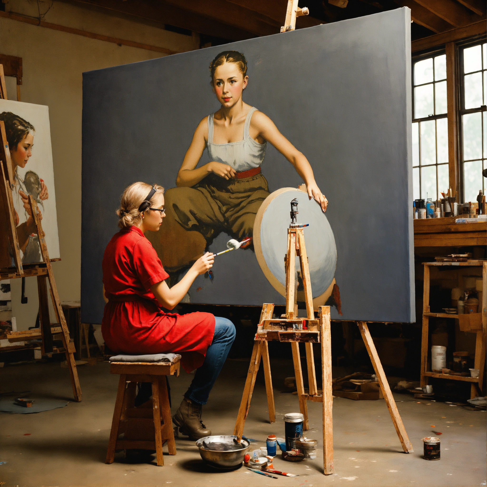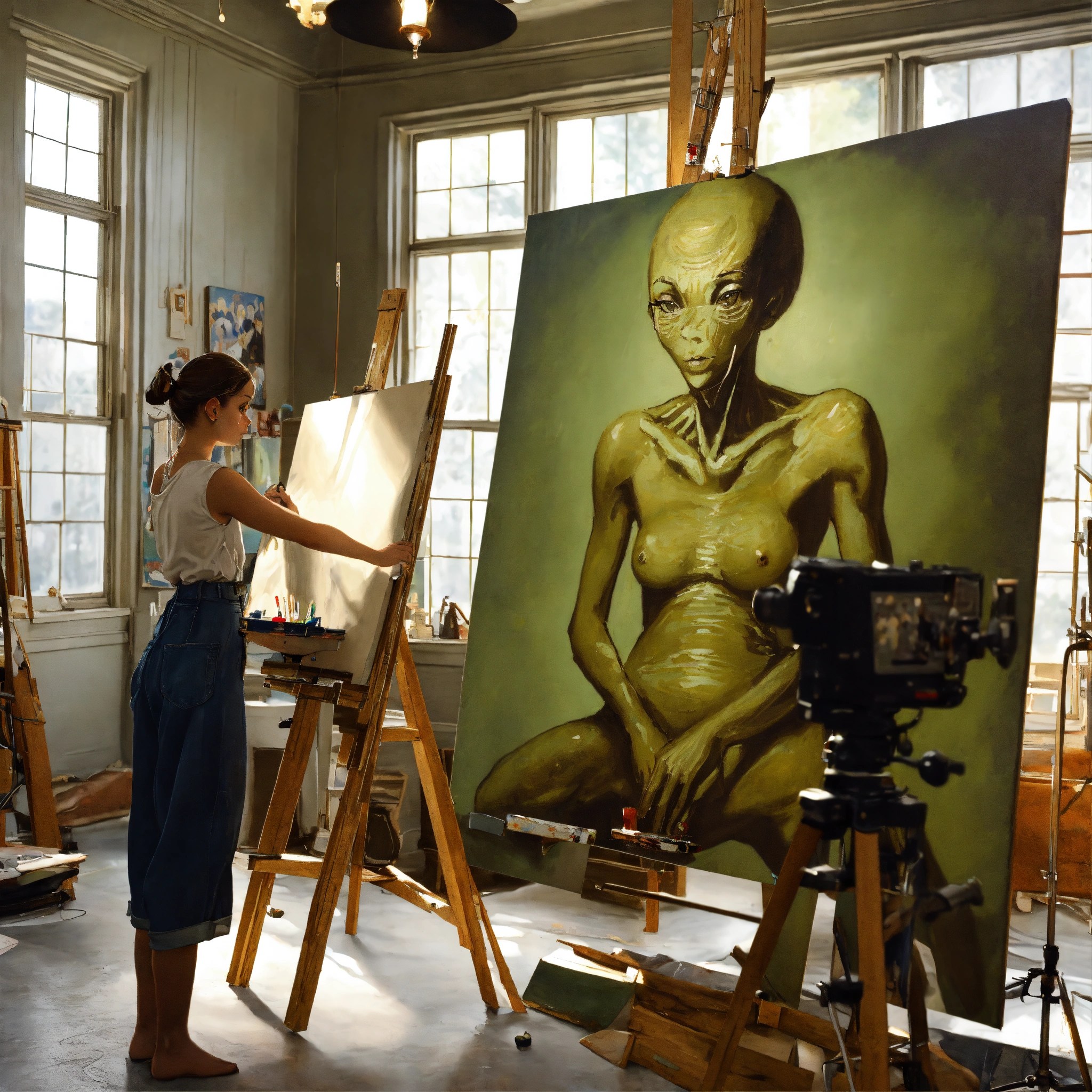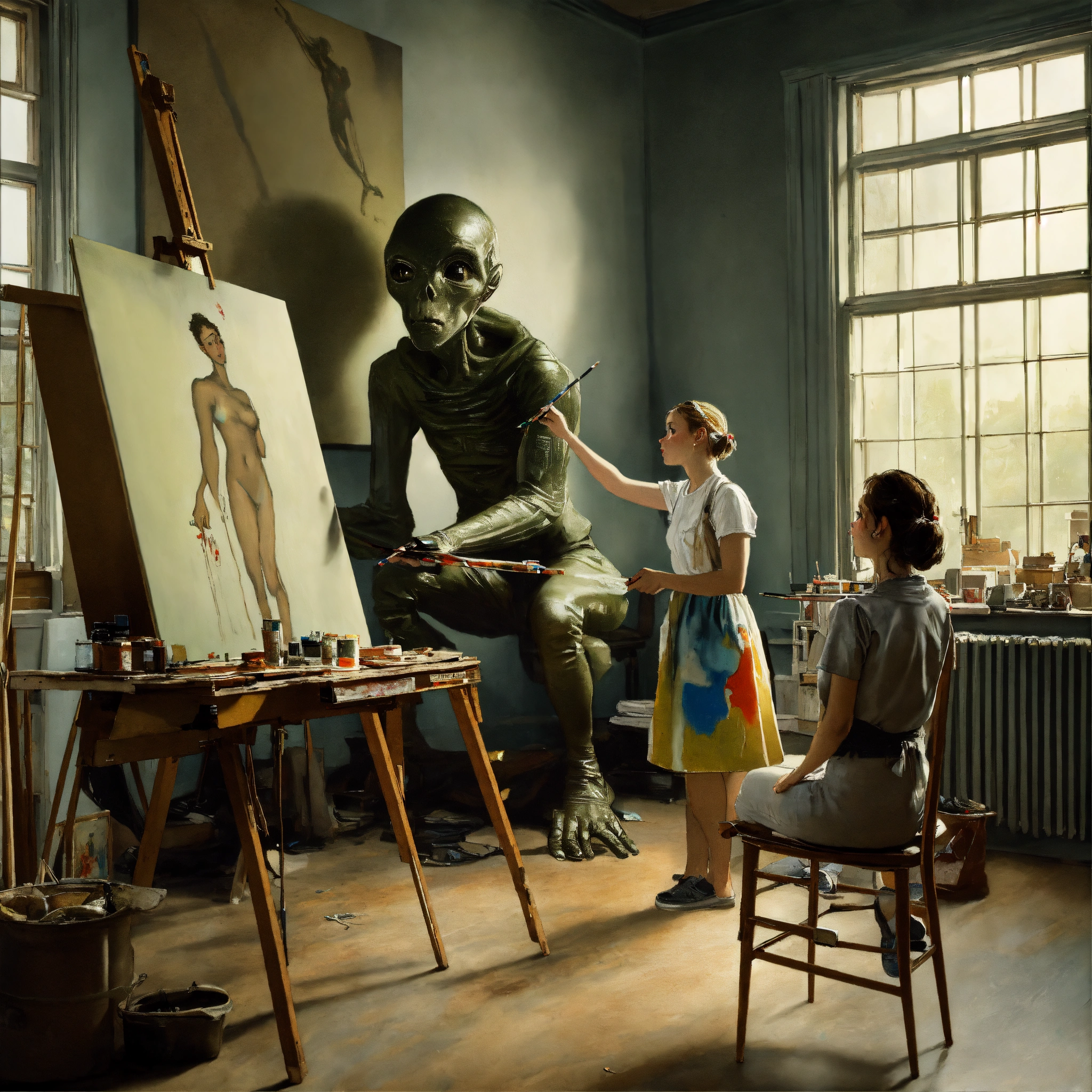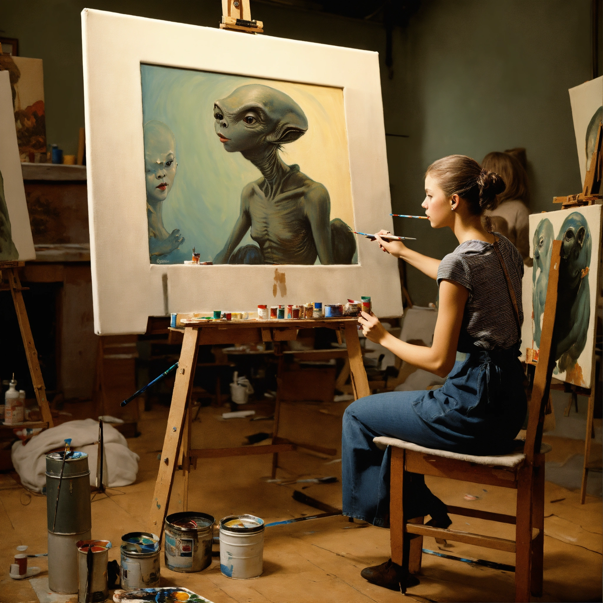 A realistic photograph of a norman rockwell painting, the girl is painting a large grey alien on a large canvas in a painting studio