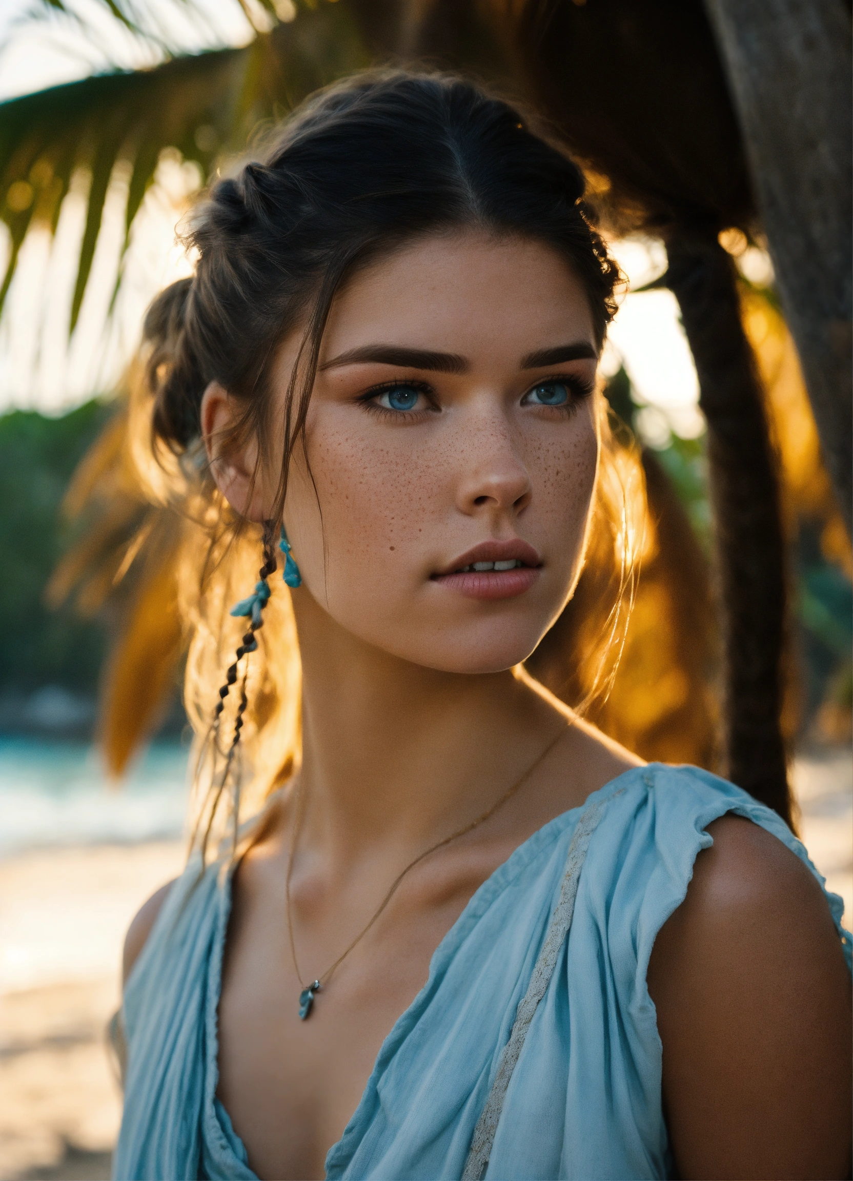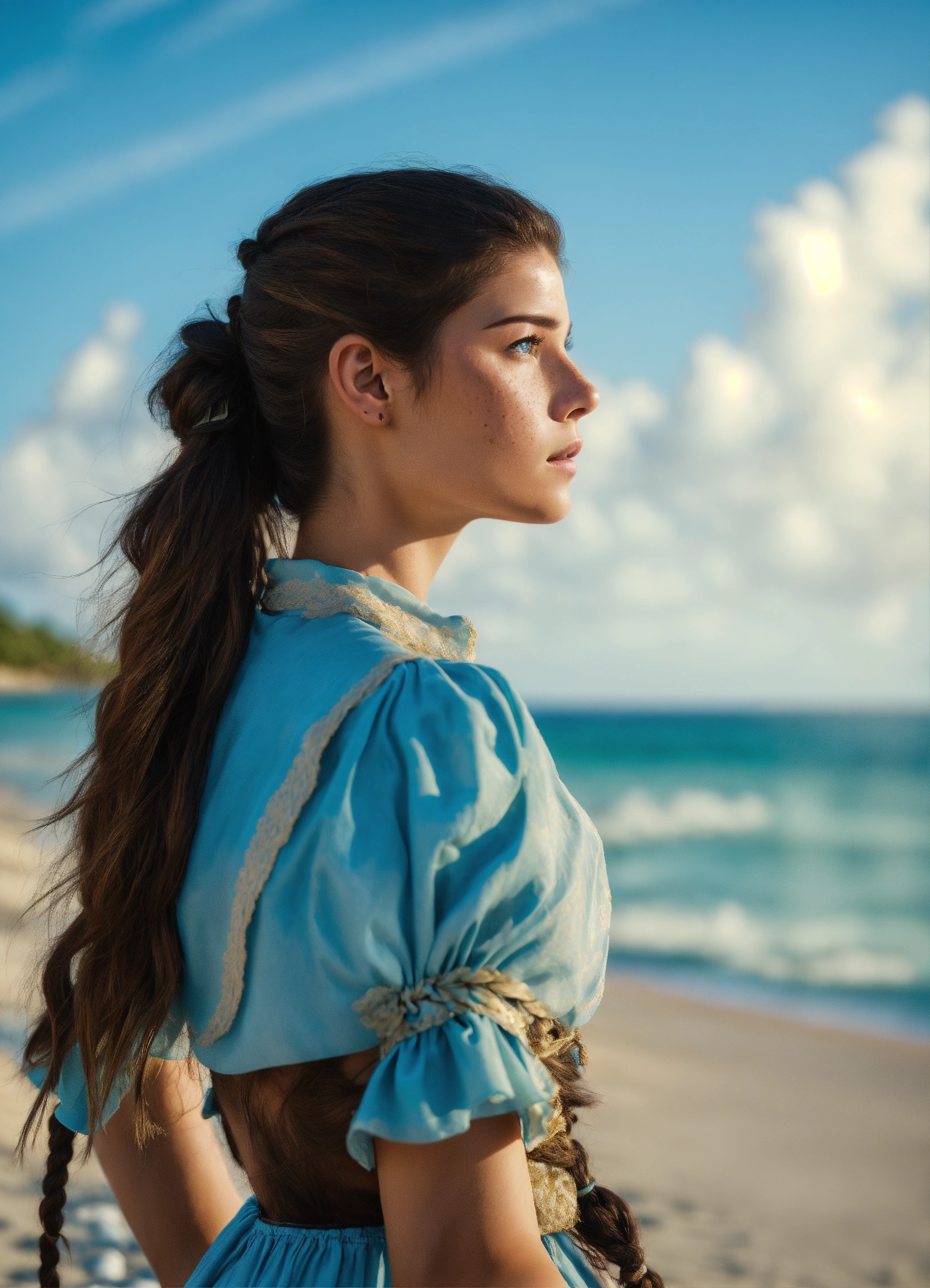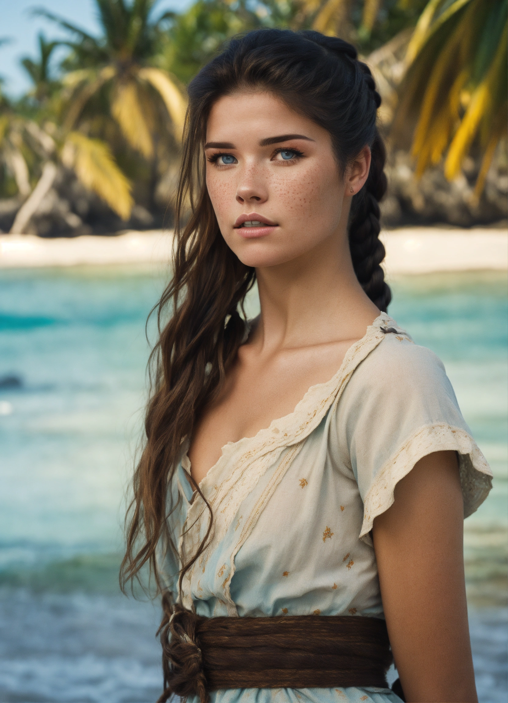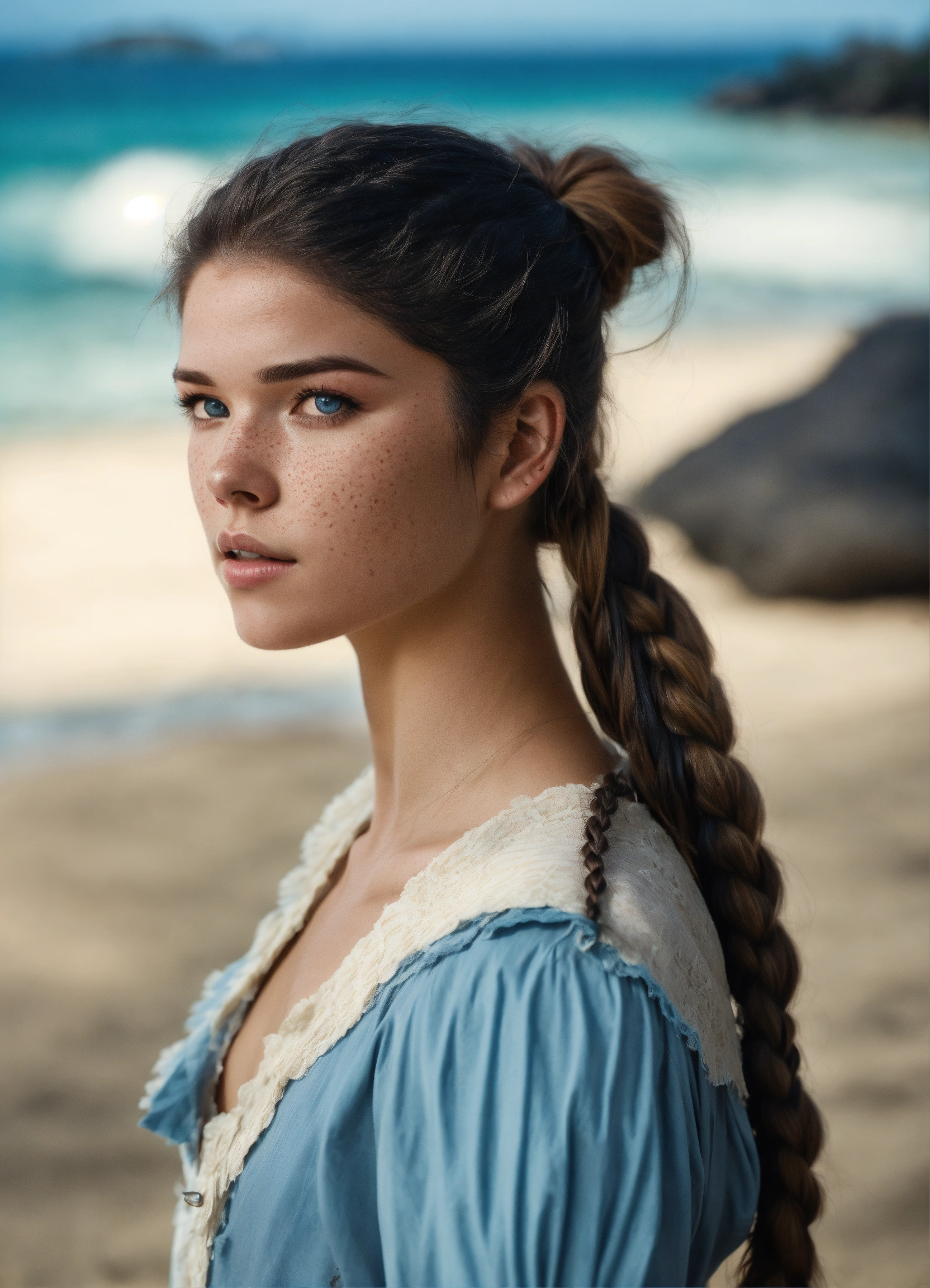 Side portrait of young marie avgeropoulos in a pirate antique shirt on a tropical island beach, freckles, ice blue eyes, 18th century, white, looks into distance, thoughtful, elsa braid, ponytail 3d, 4k