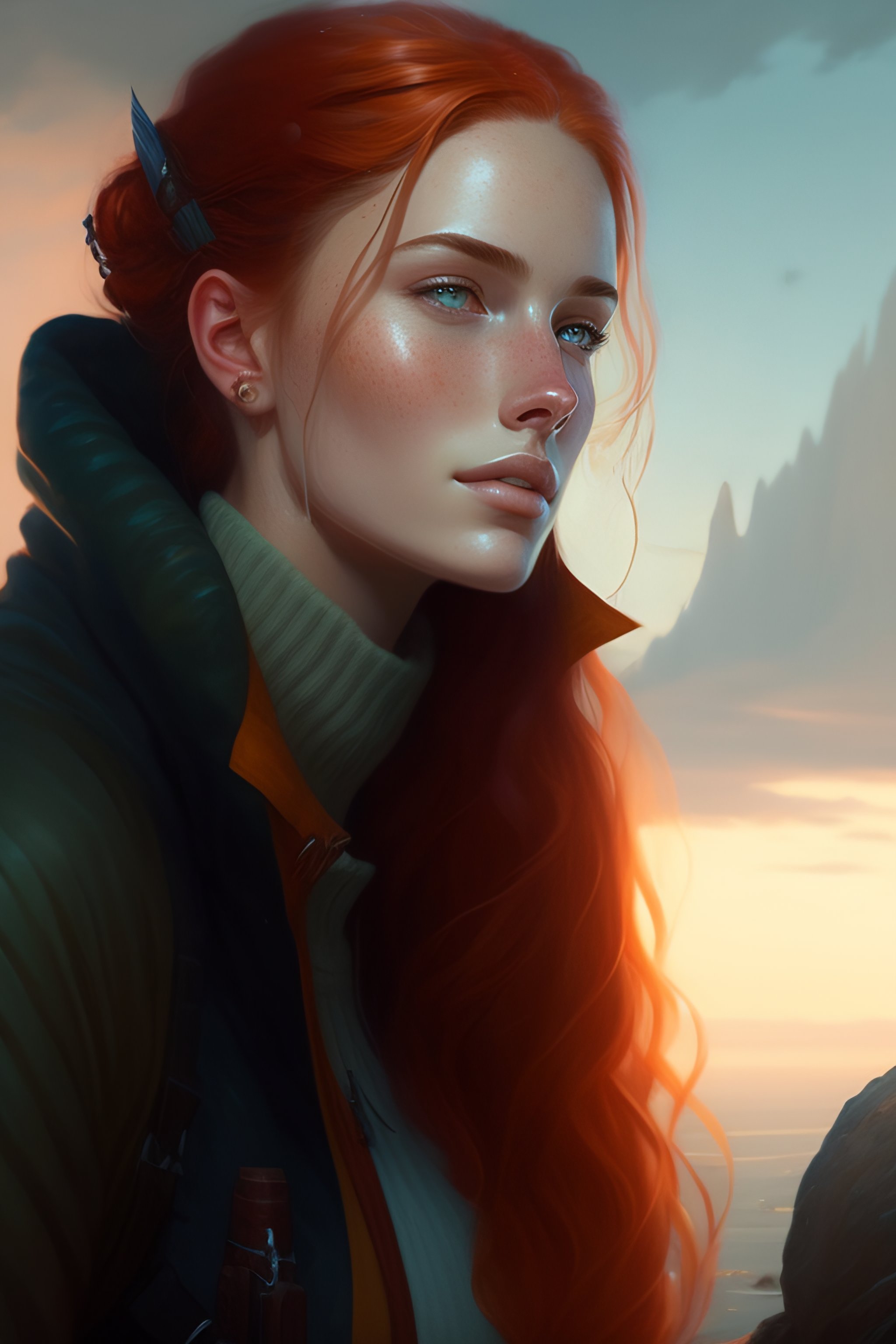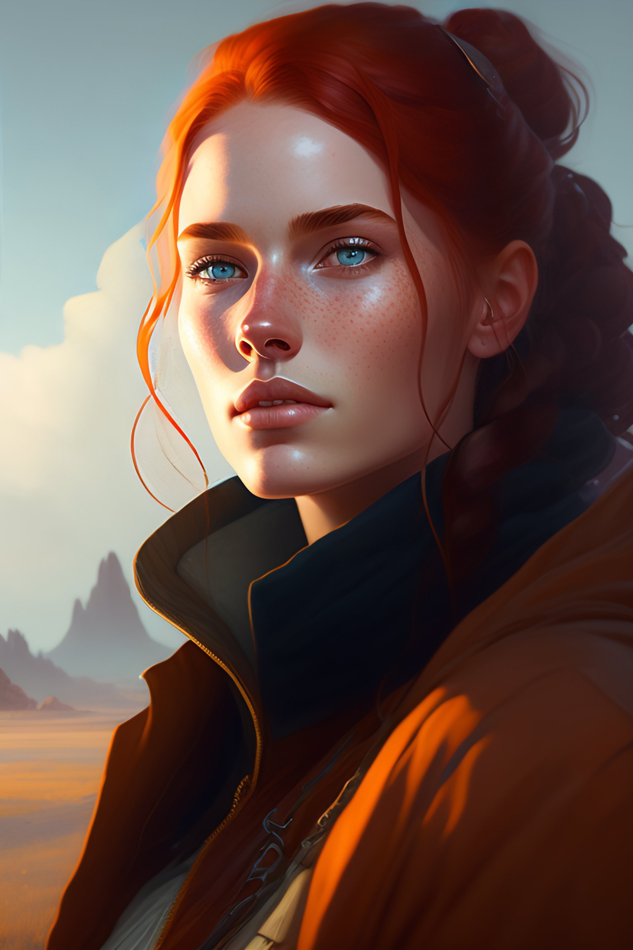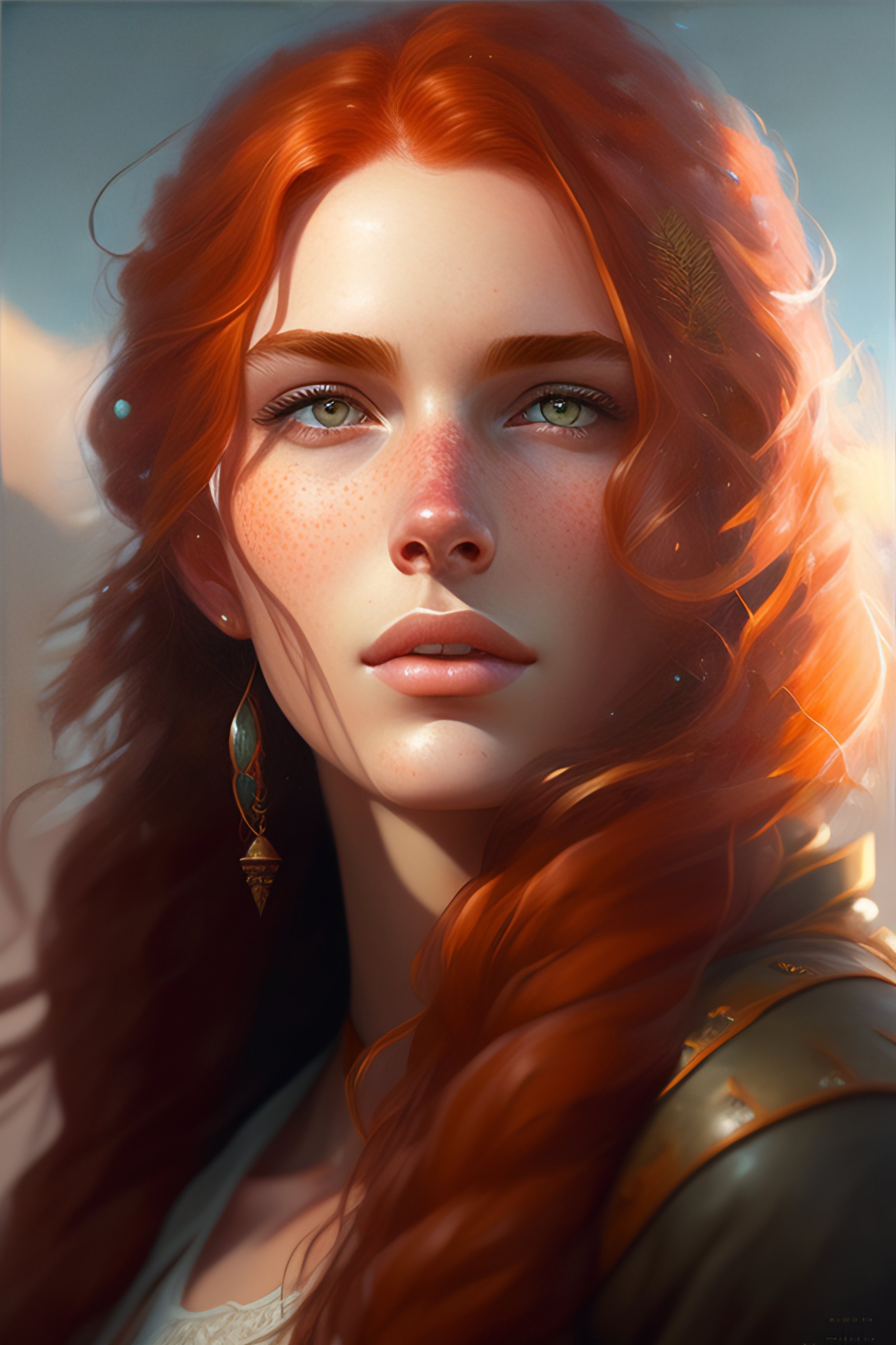 Highly detailed portrait of a young woman, straight reddish hair, freckles on her face, slim build, stephen bliss, unreal engine, fantasy art by greg rutkowski, loish, rhads, ferdinand knab, very shy person