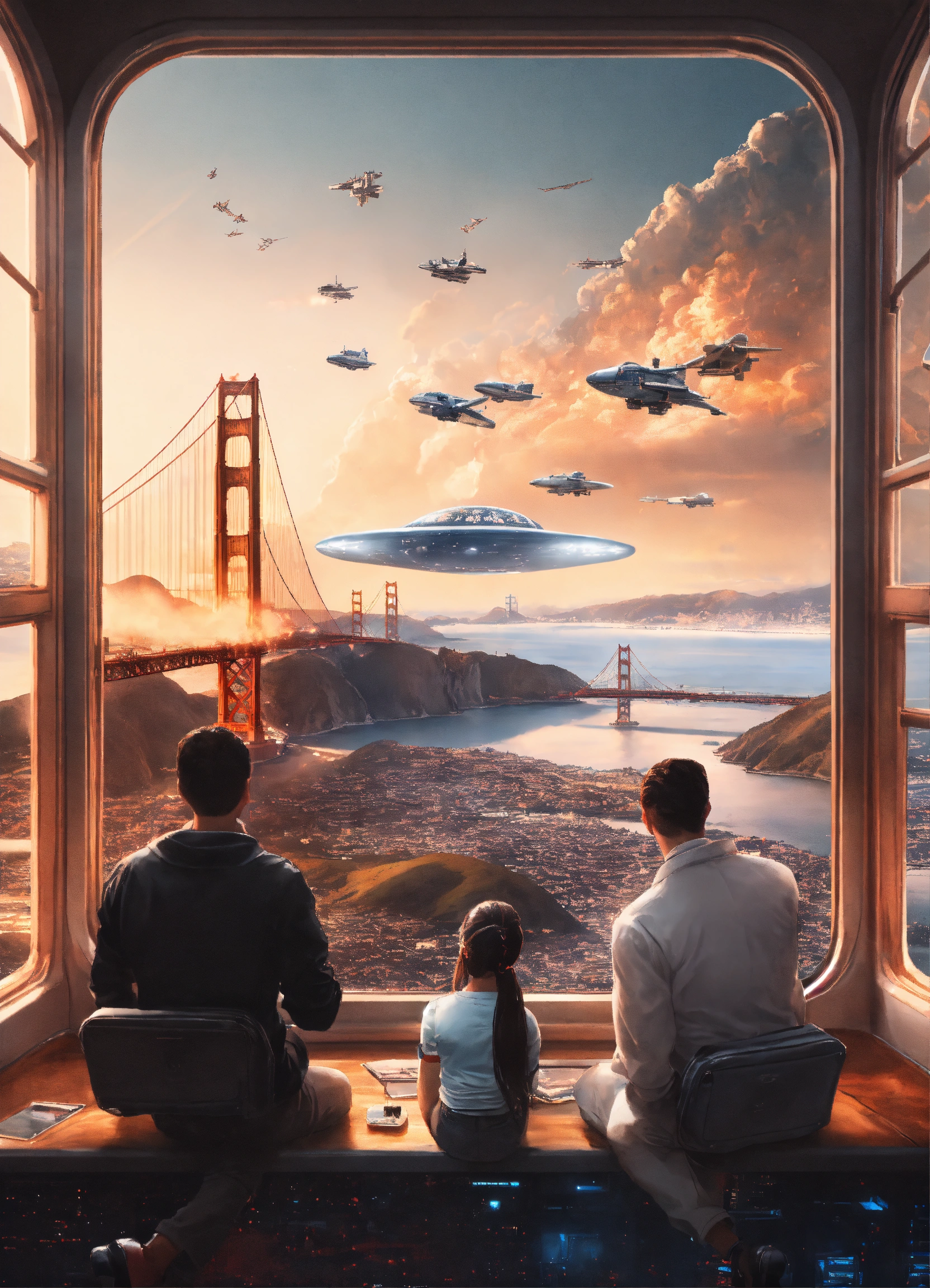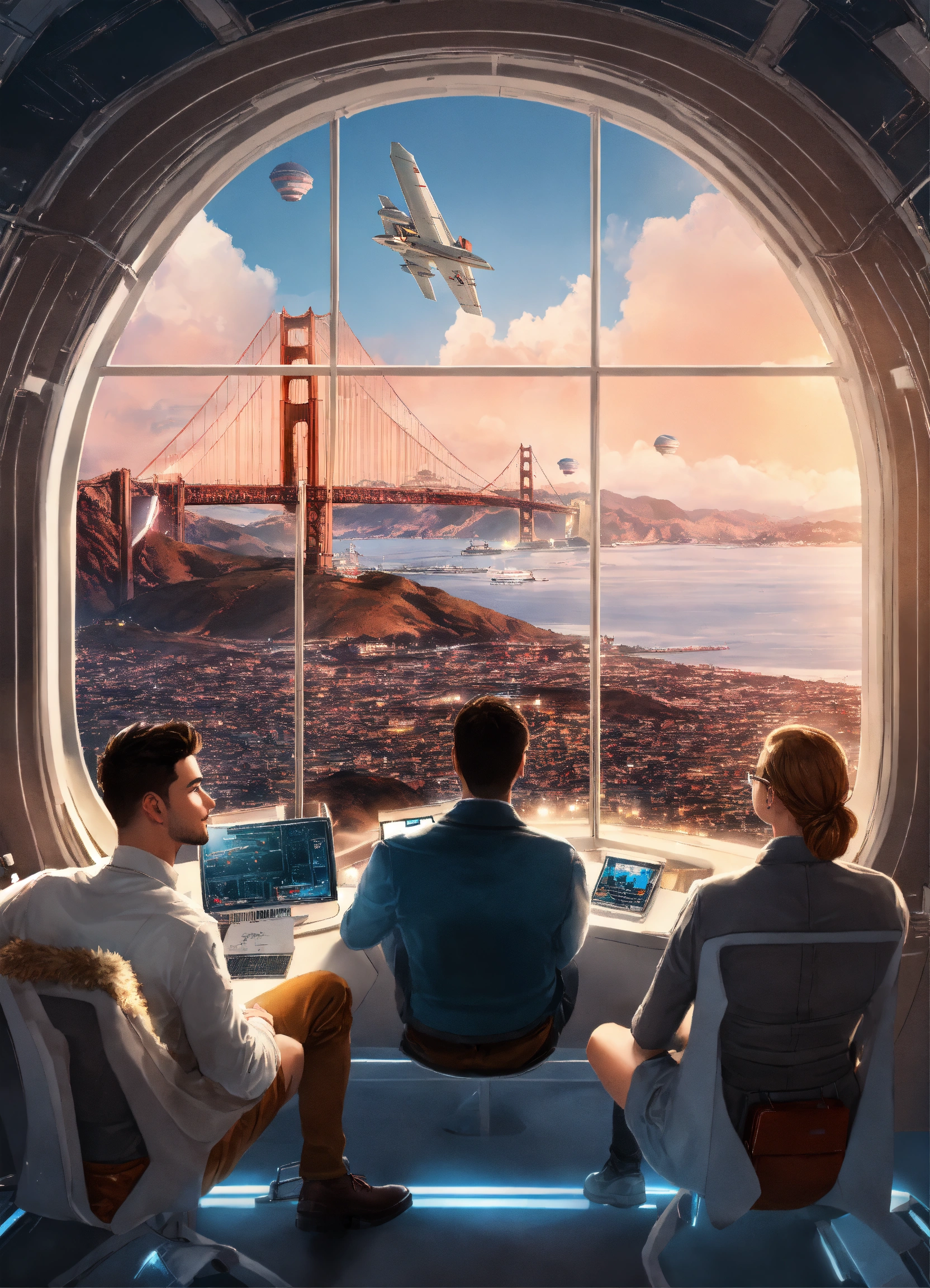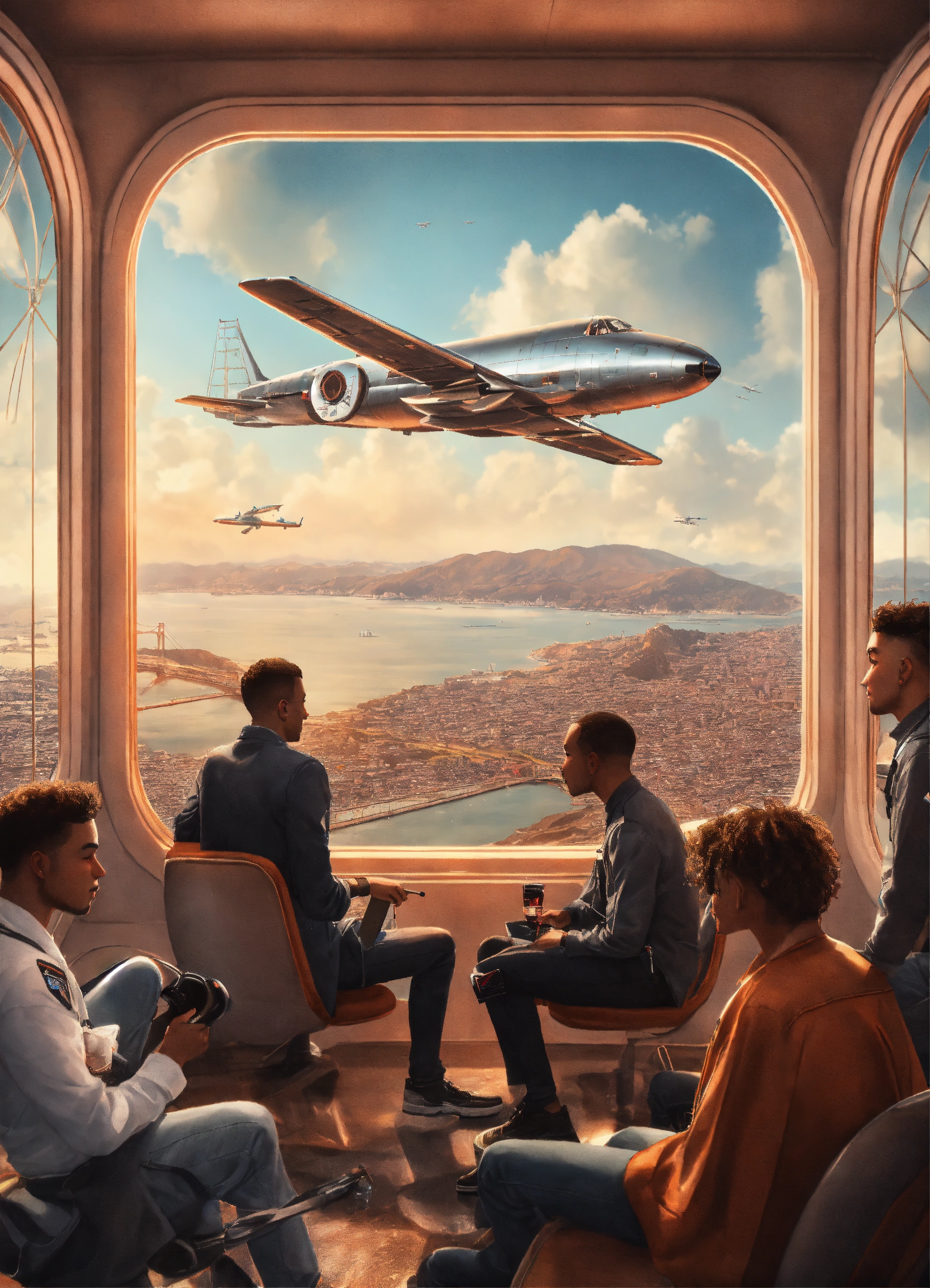 Group of friends, men and women, dressed in white or black or grey or neutral colored retro cyber clothes on a spaceship with a window overlooking surreal landscape set in san francisco, hyperrealistic photo, background of planes in the sky flying over the golden gate bridge