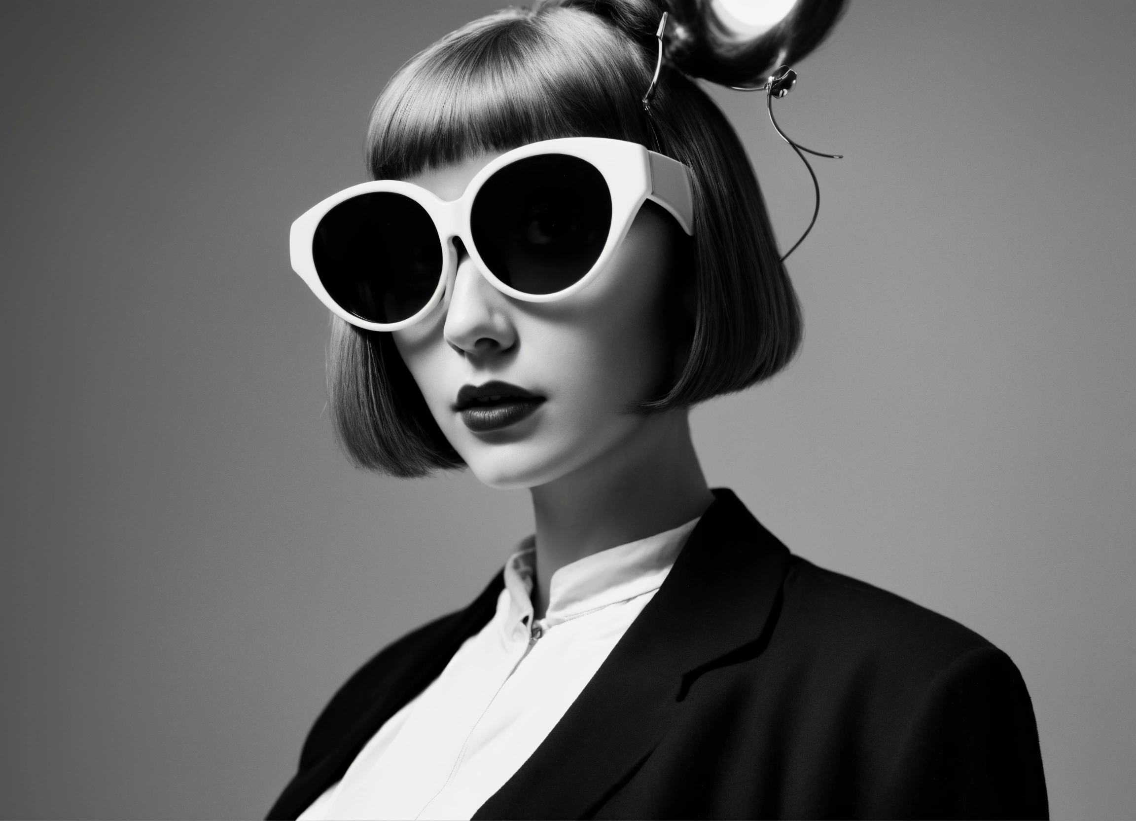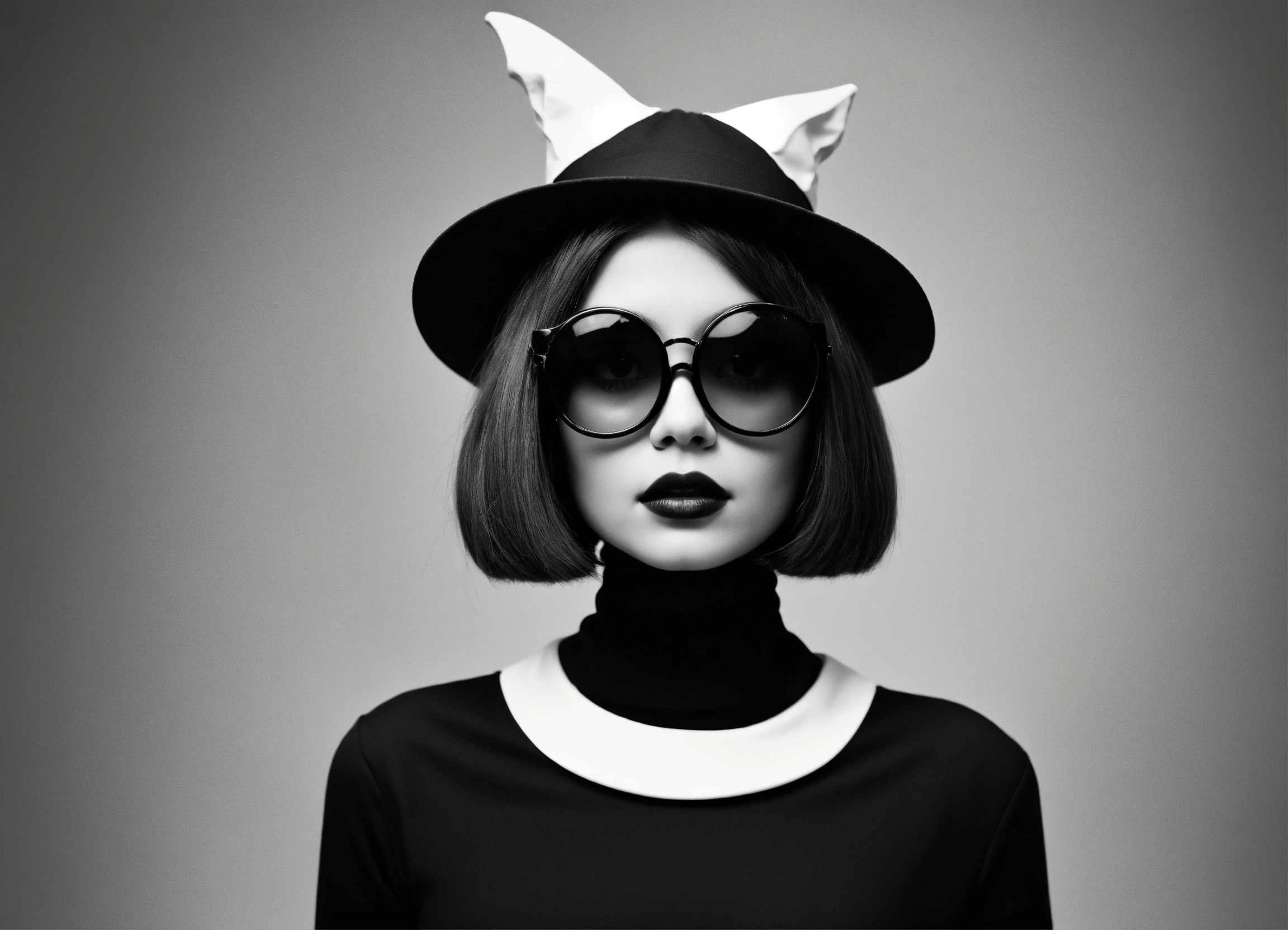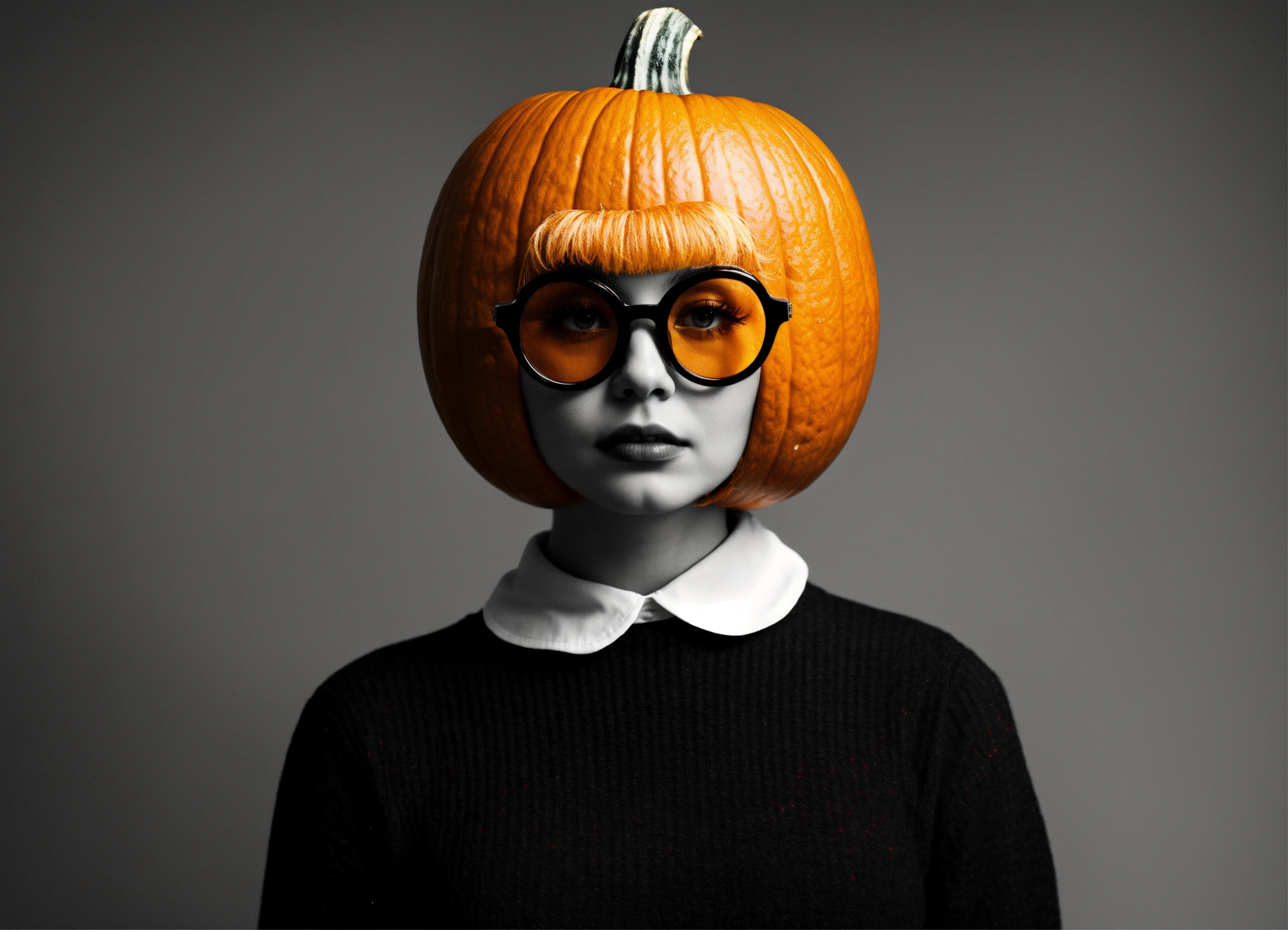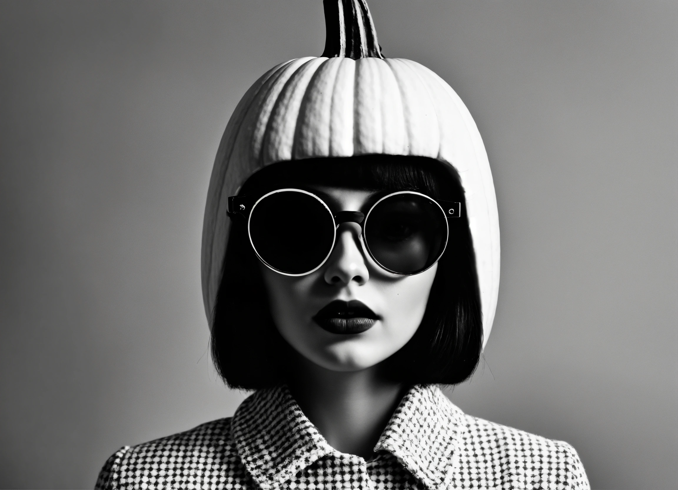 Retro style women, pumpkin head with big glasses, black white photo, white background, future minimalist style 8 k
