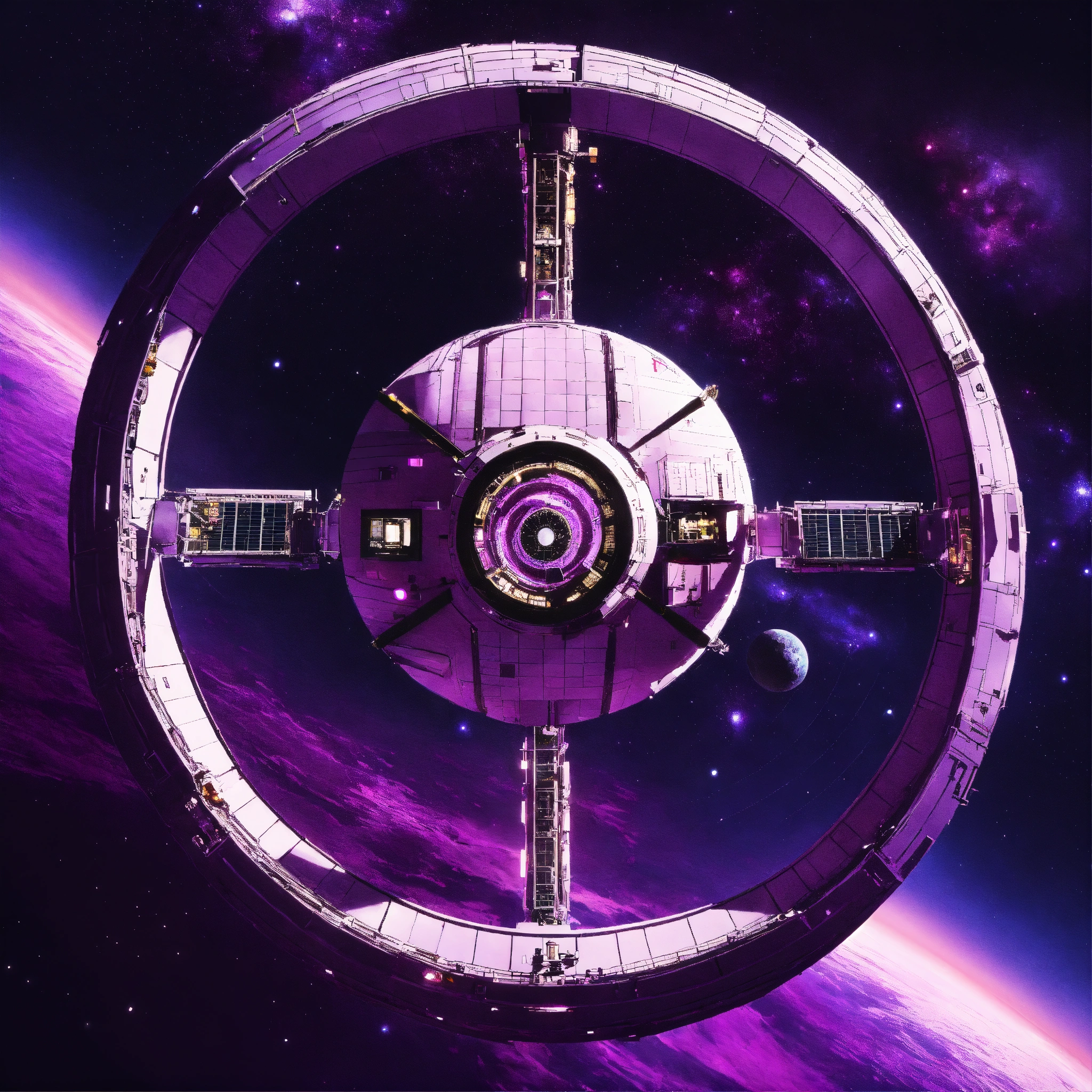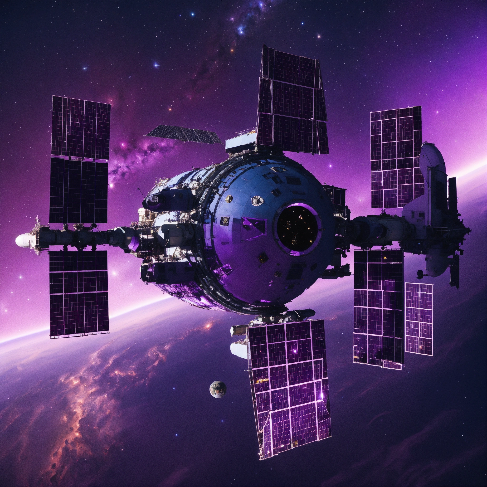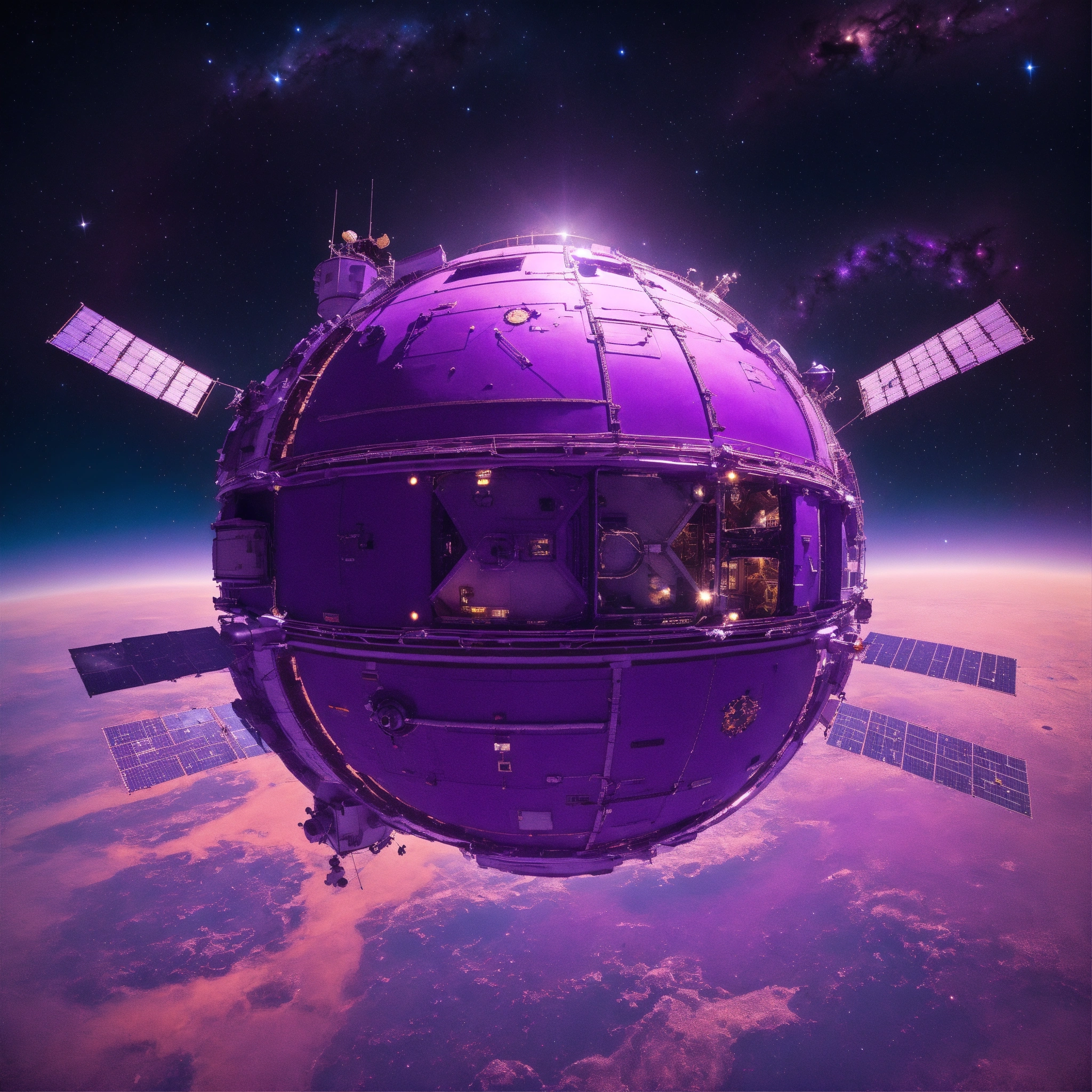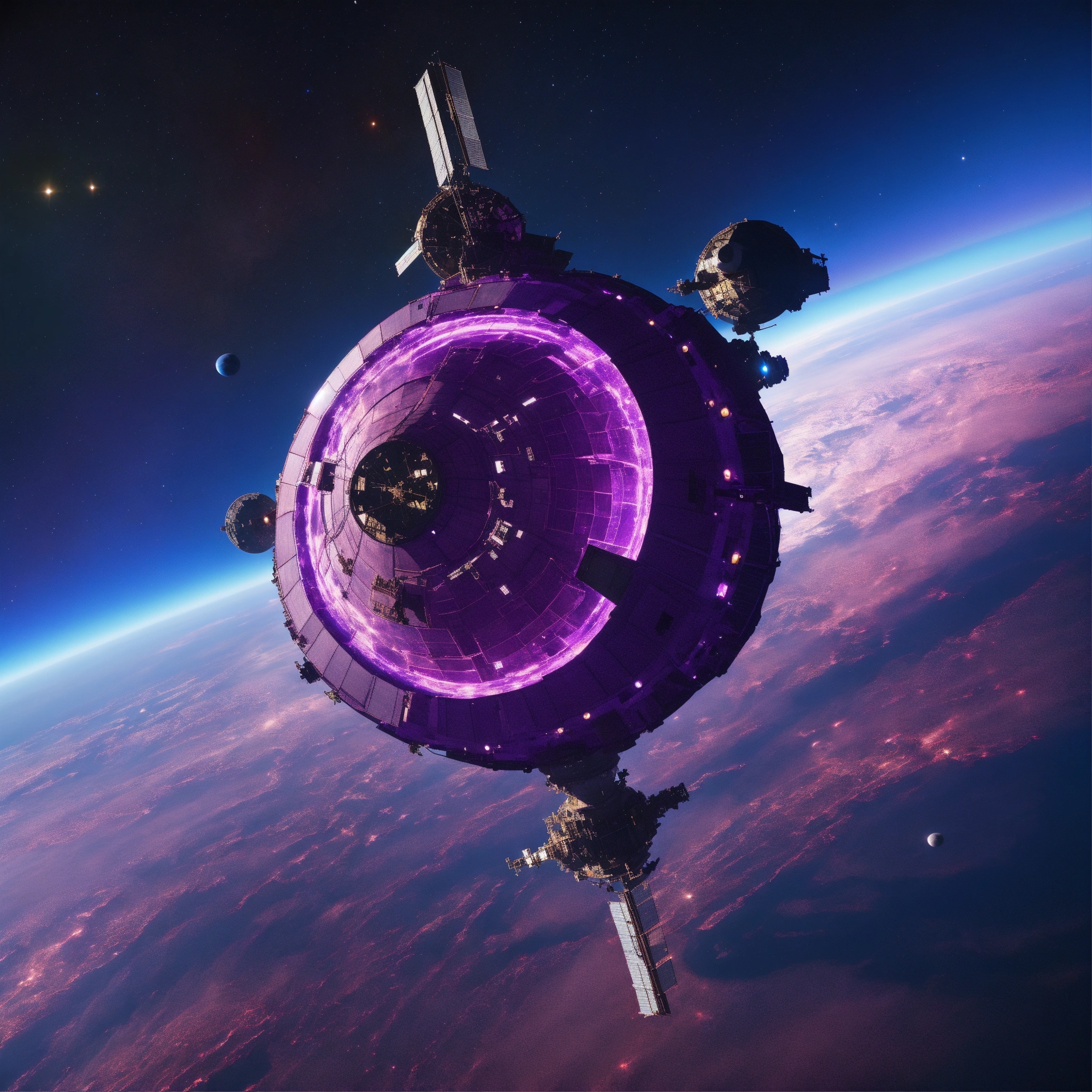 Purple space station in space from top