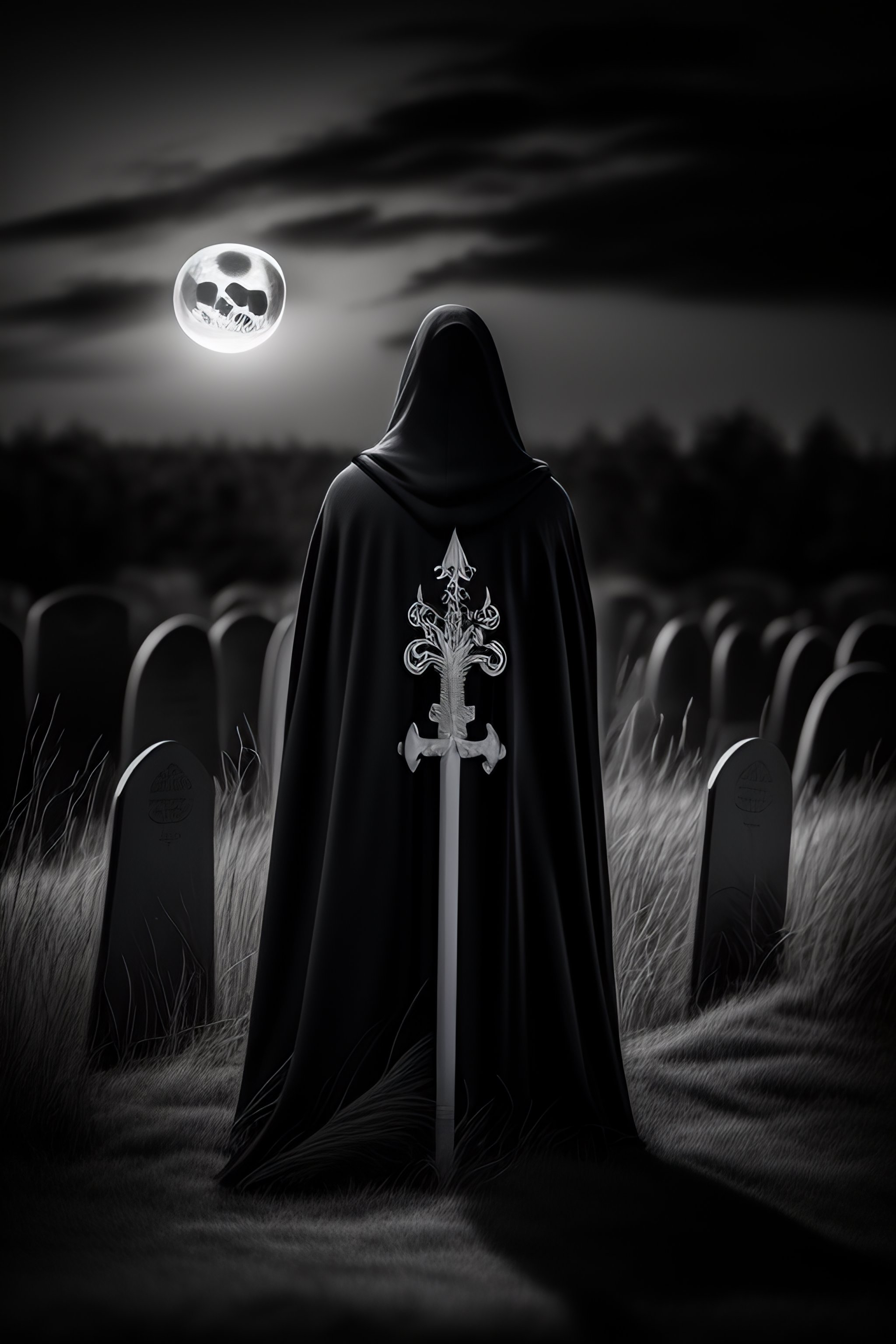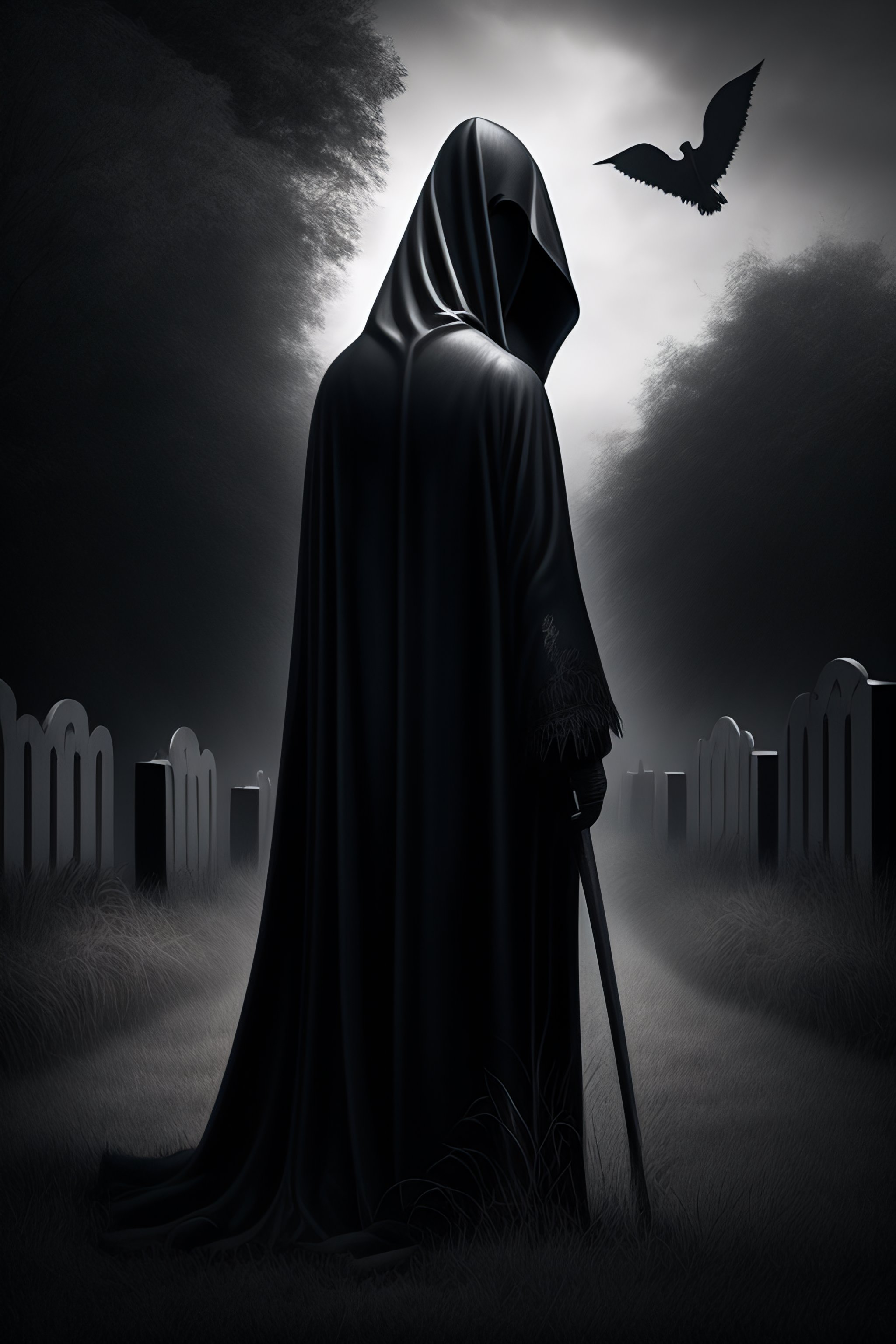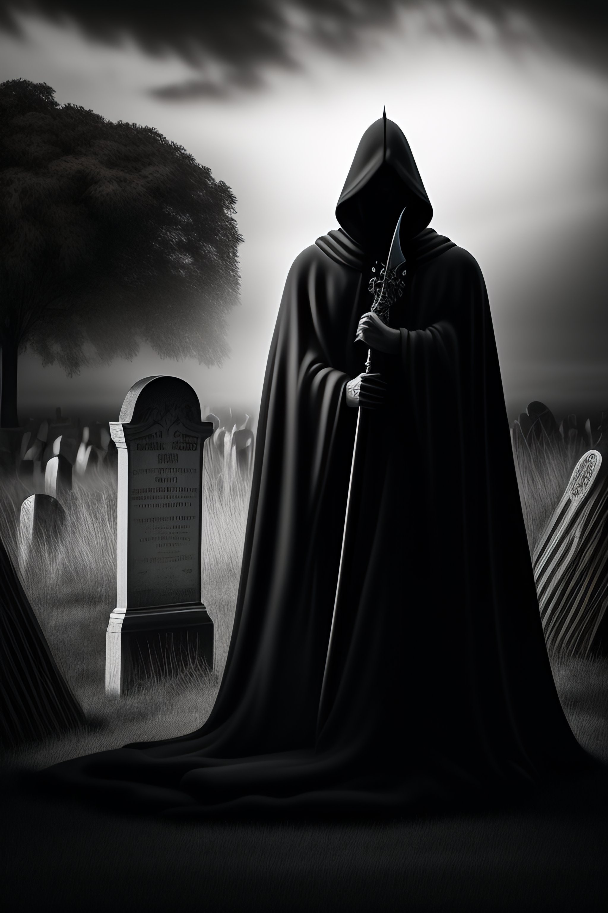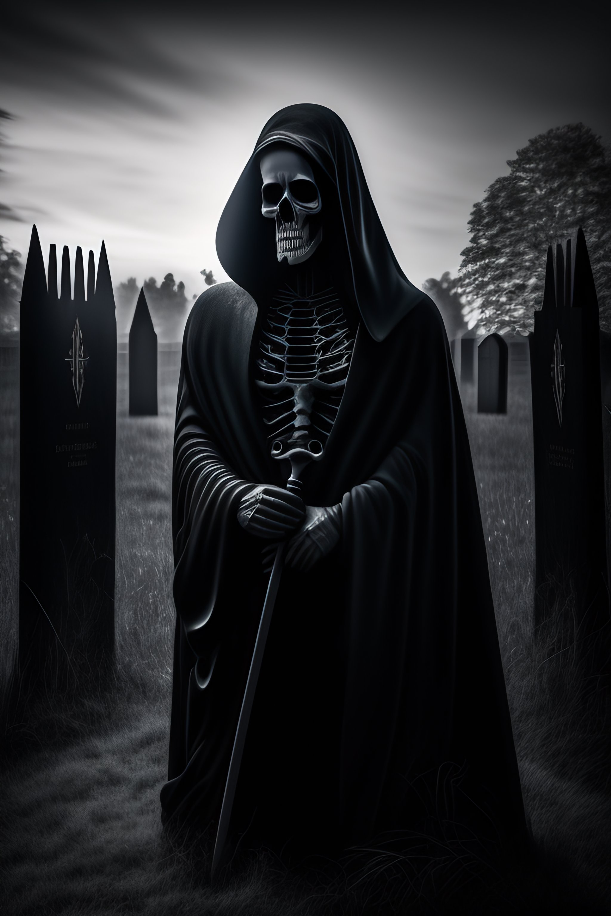 Black and white portrait of the grim reaper in a graveyard, dark and scary night, realistic, detailed, horror, spooky, terror
