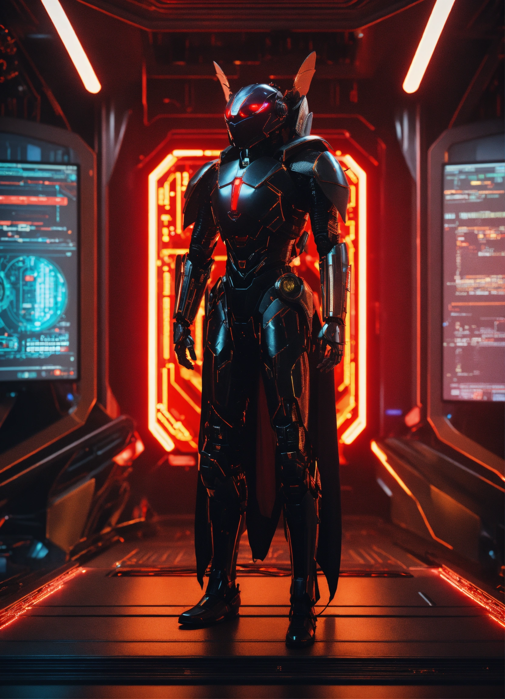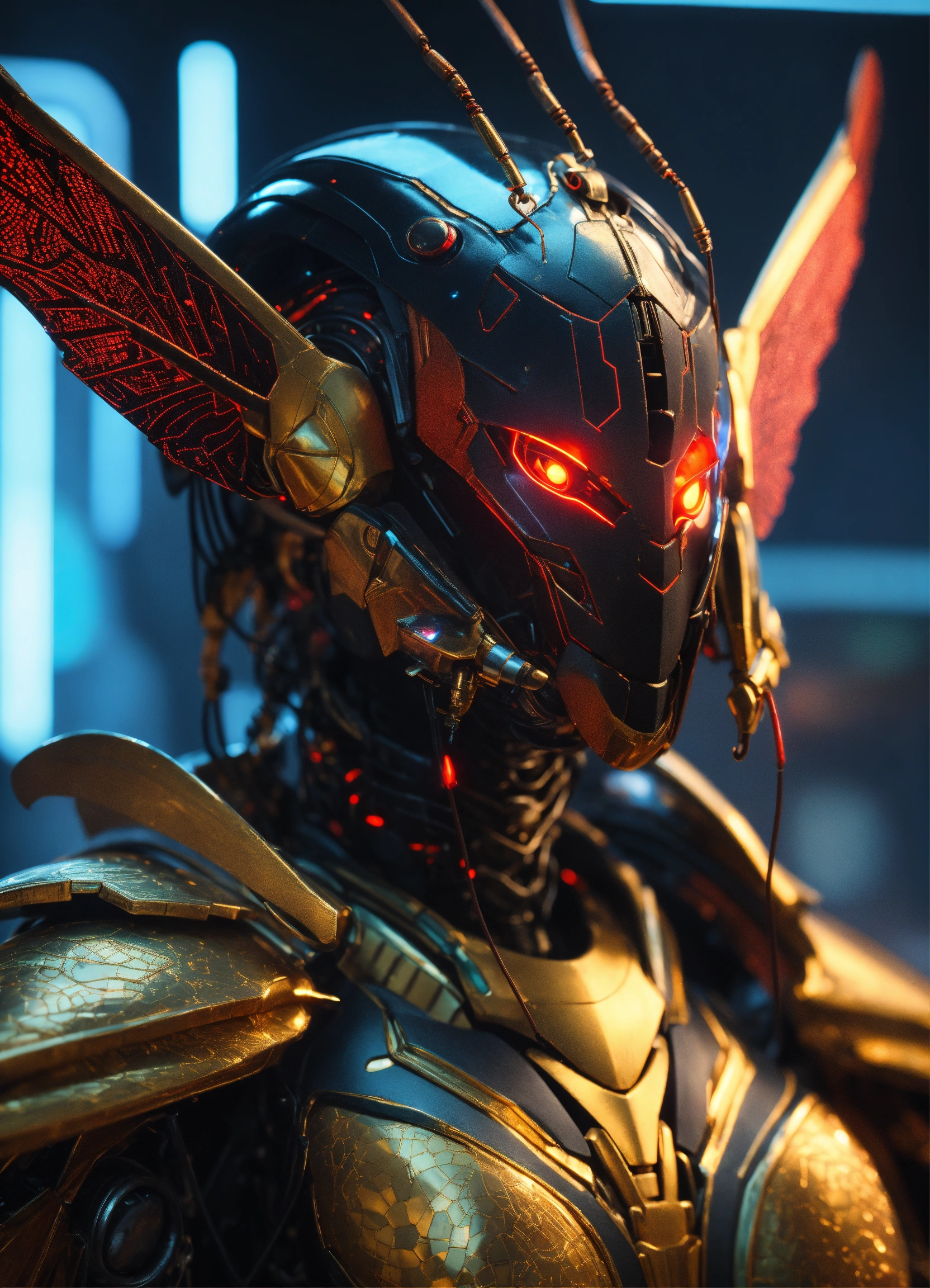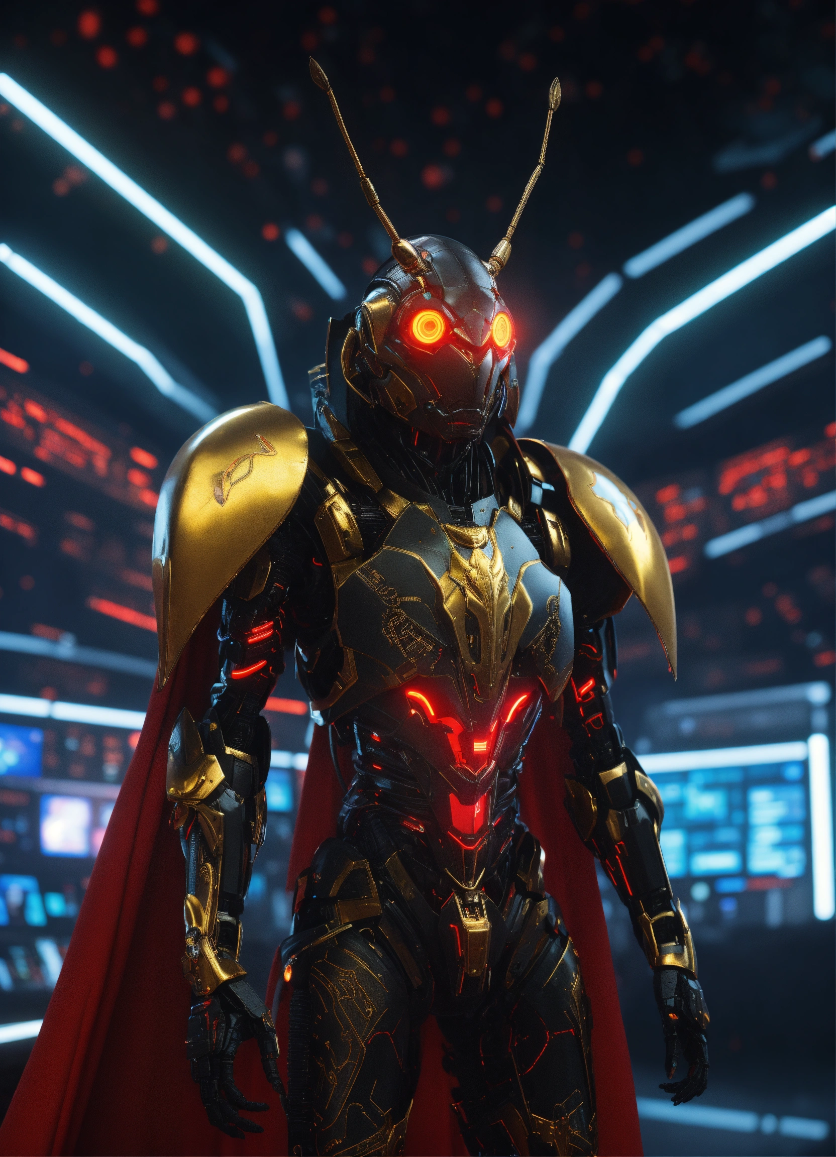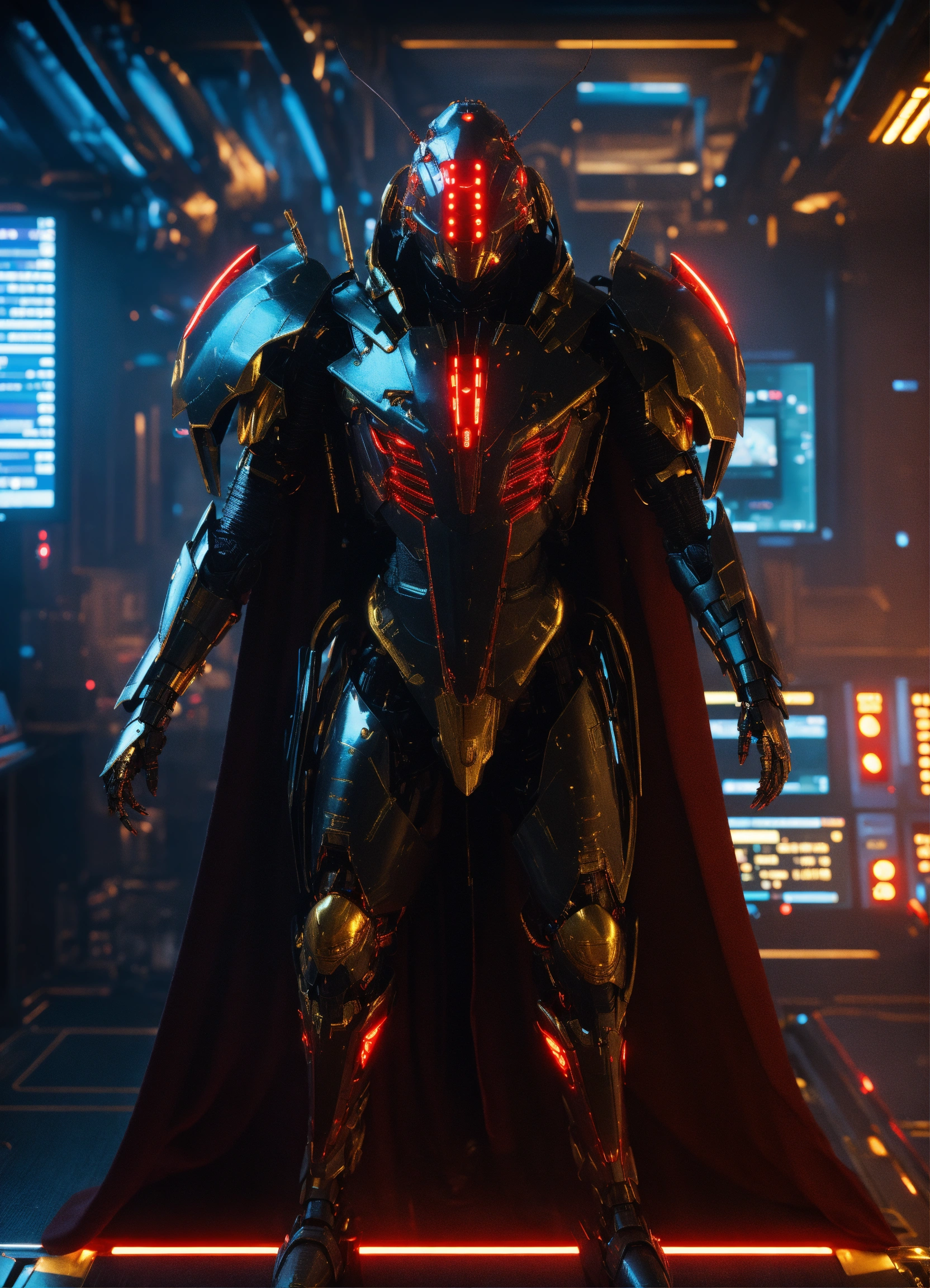 Close up of black cockroach faced humanoid with red glowing eyes, golden circuitry decor, and long draped down colorful cape like wings and hi-tech armored humanoid body, in a futuristic dark control room, realistic, 8k